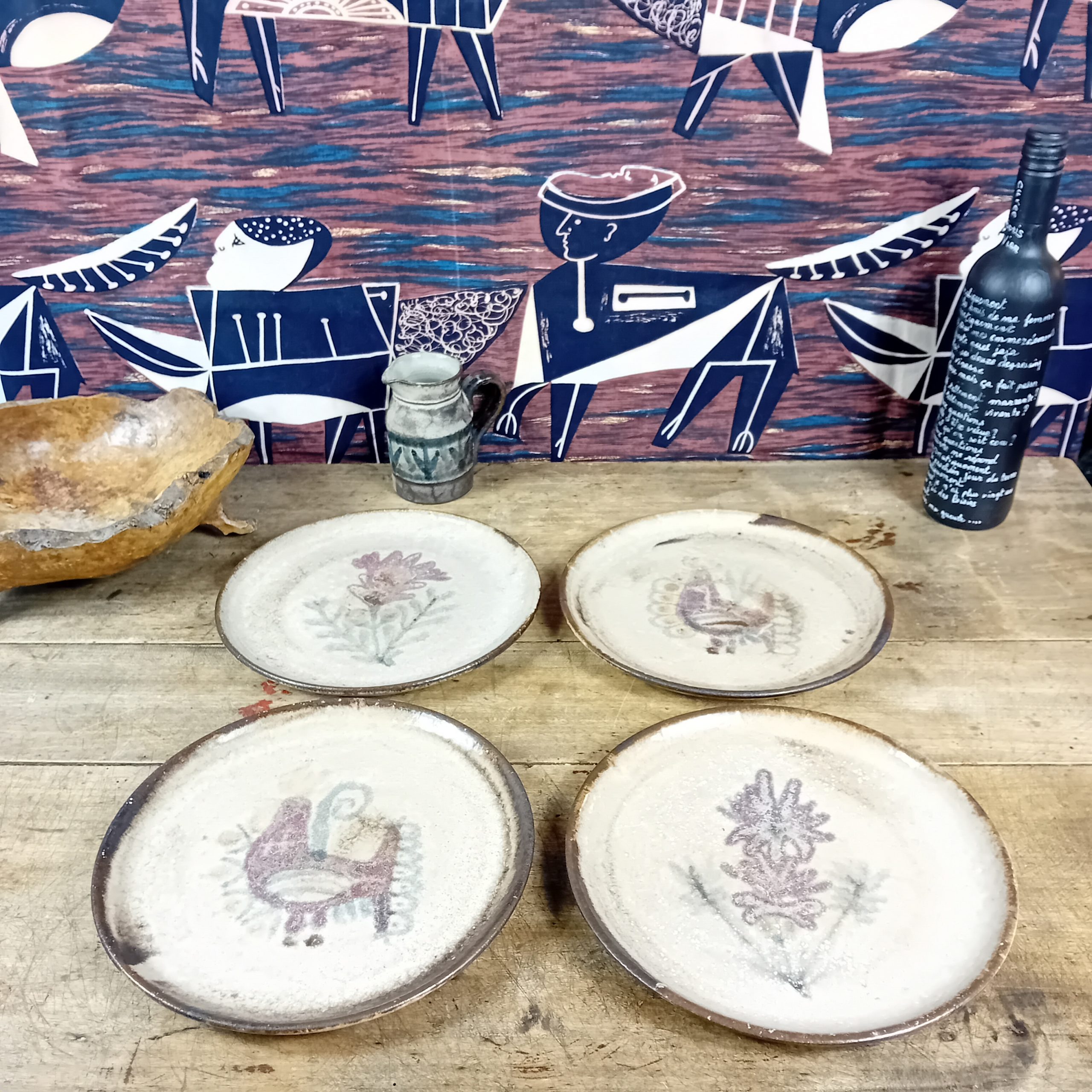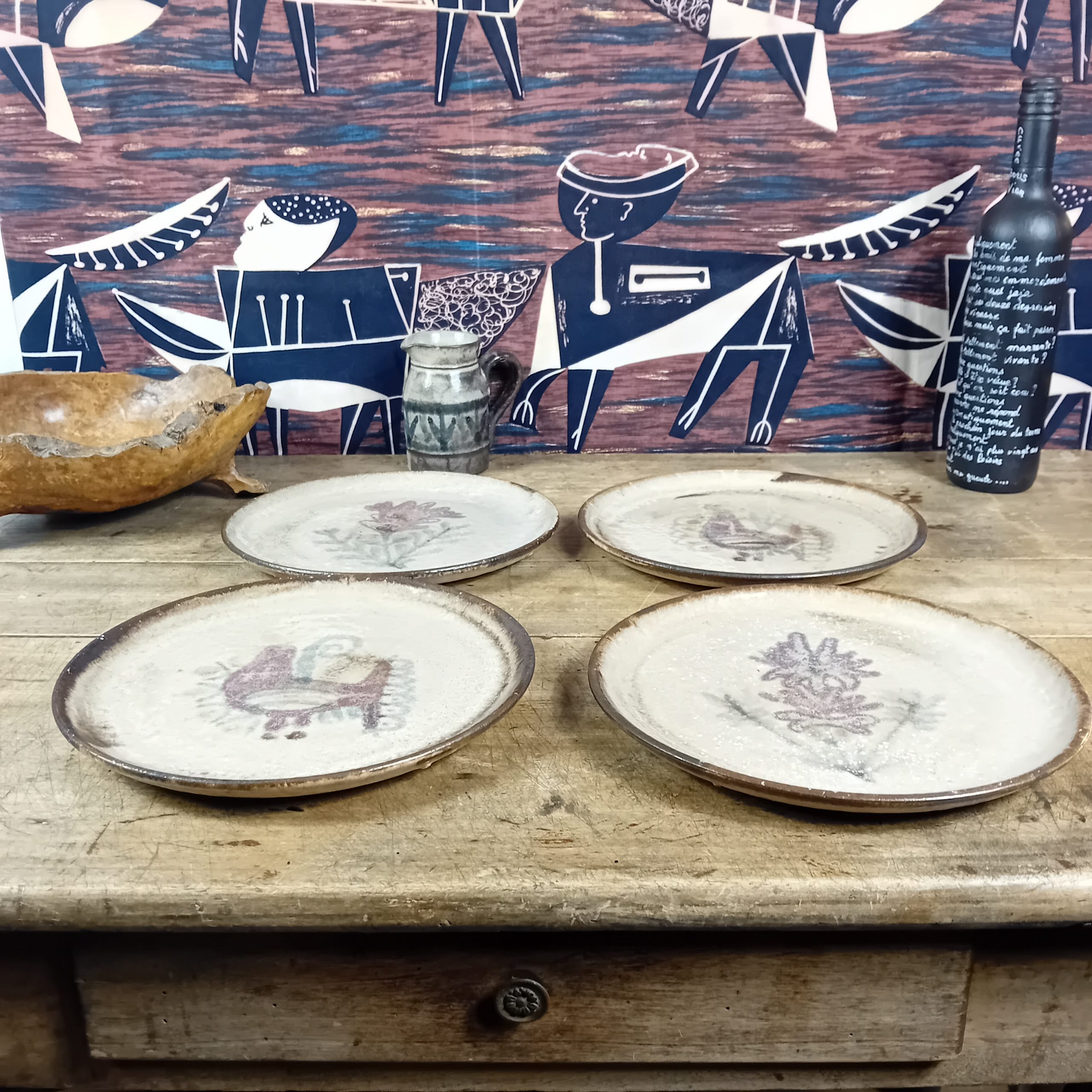 Un ensemble de 4 grandes assiettes de l’Atelier Le Murier Vallauris, fondée par Micheline et Gustave Raynaud en 1955.
