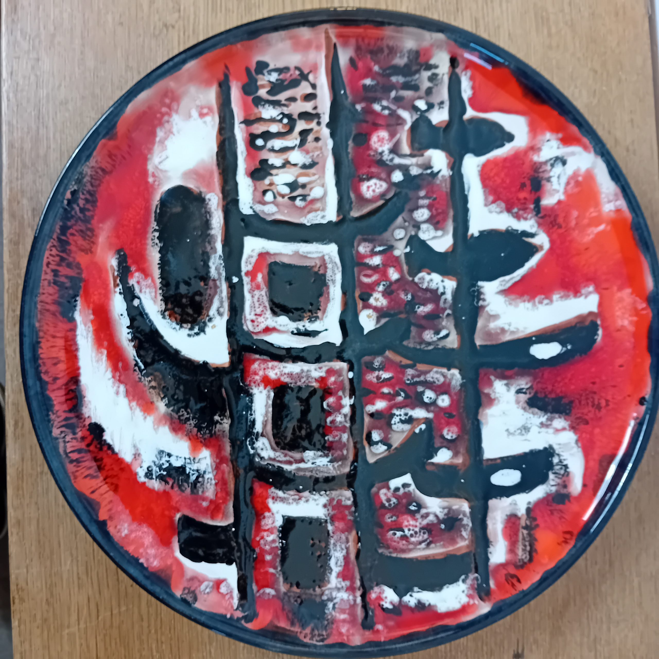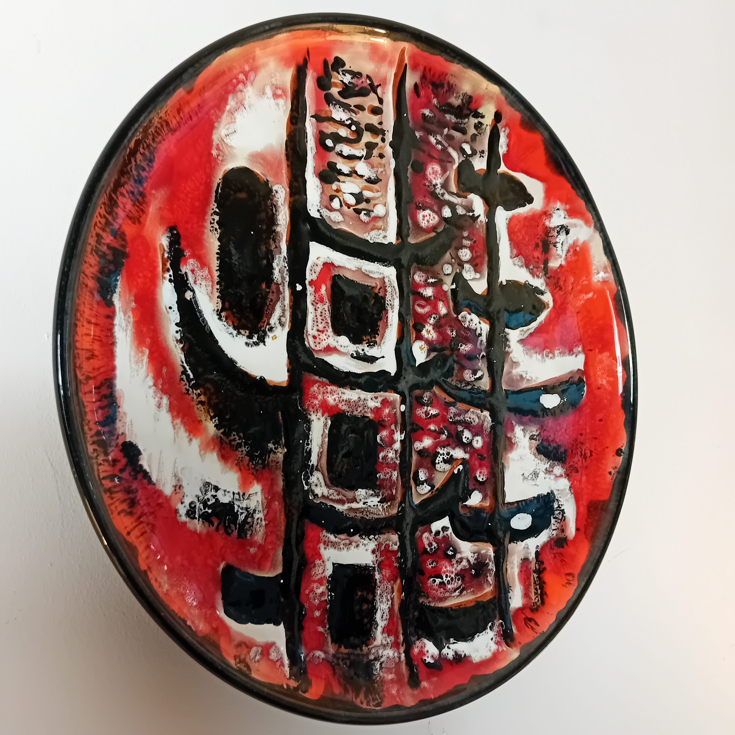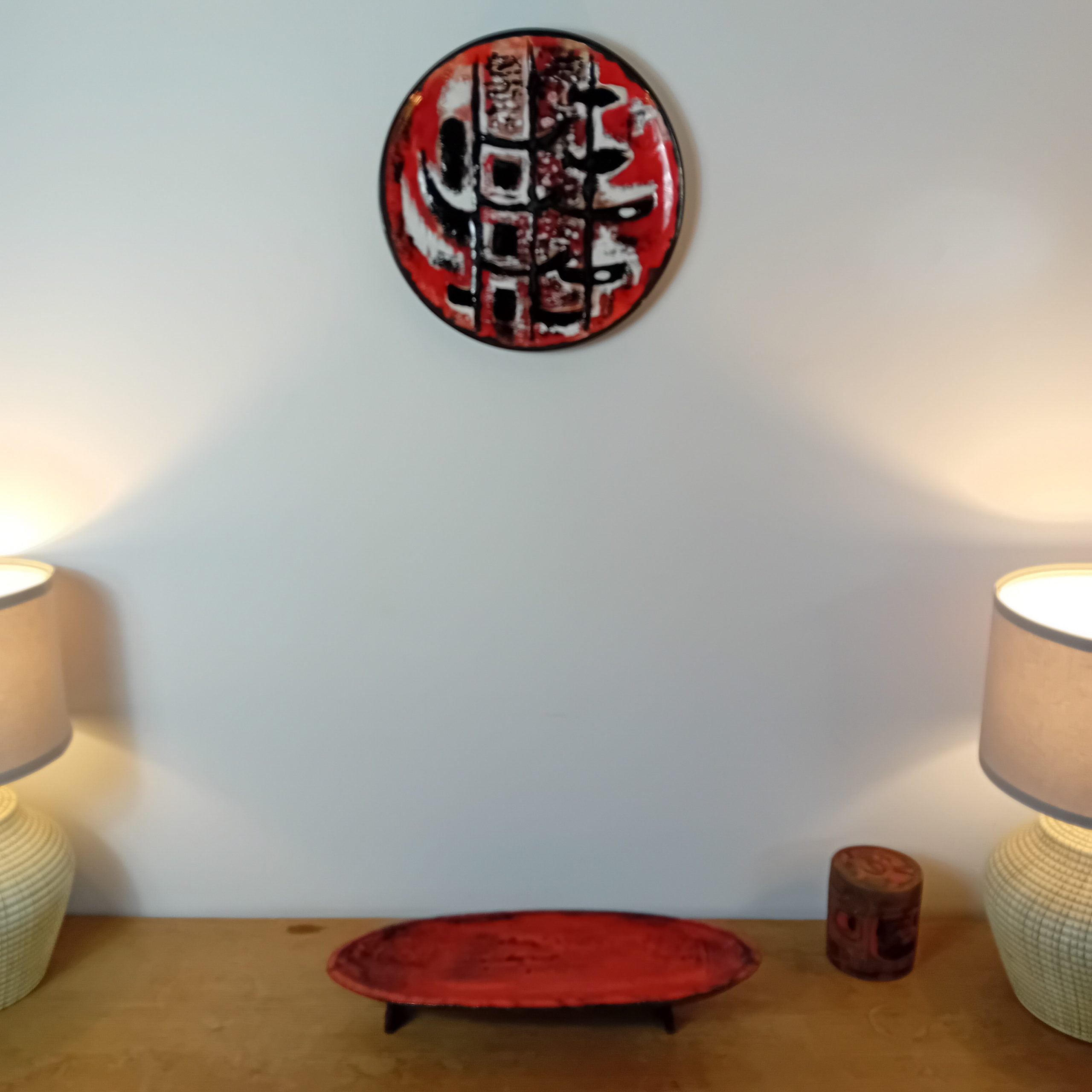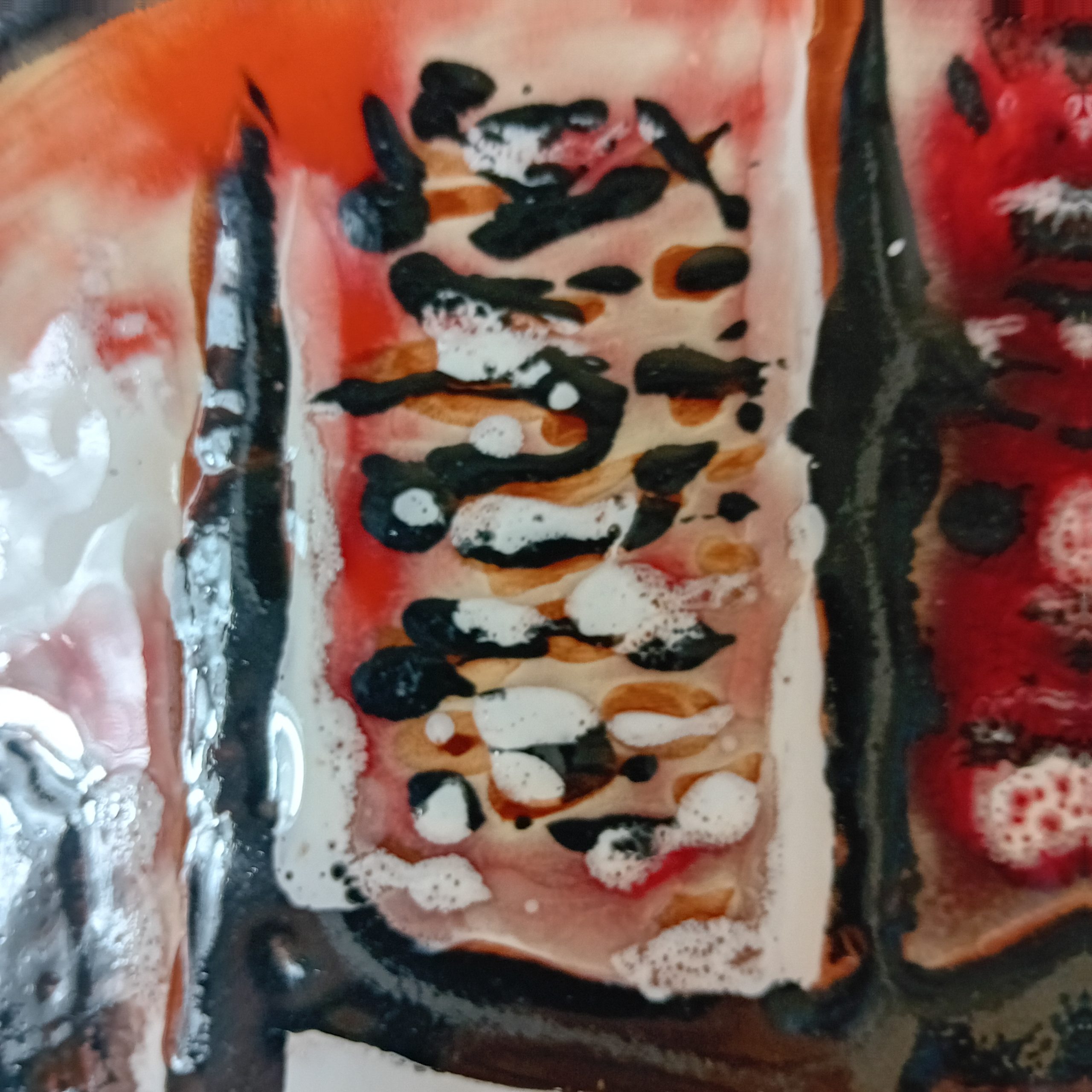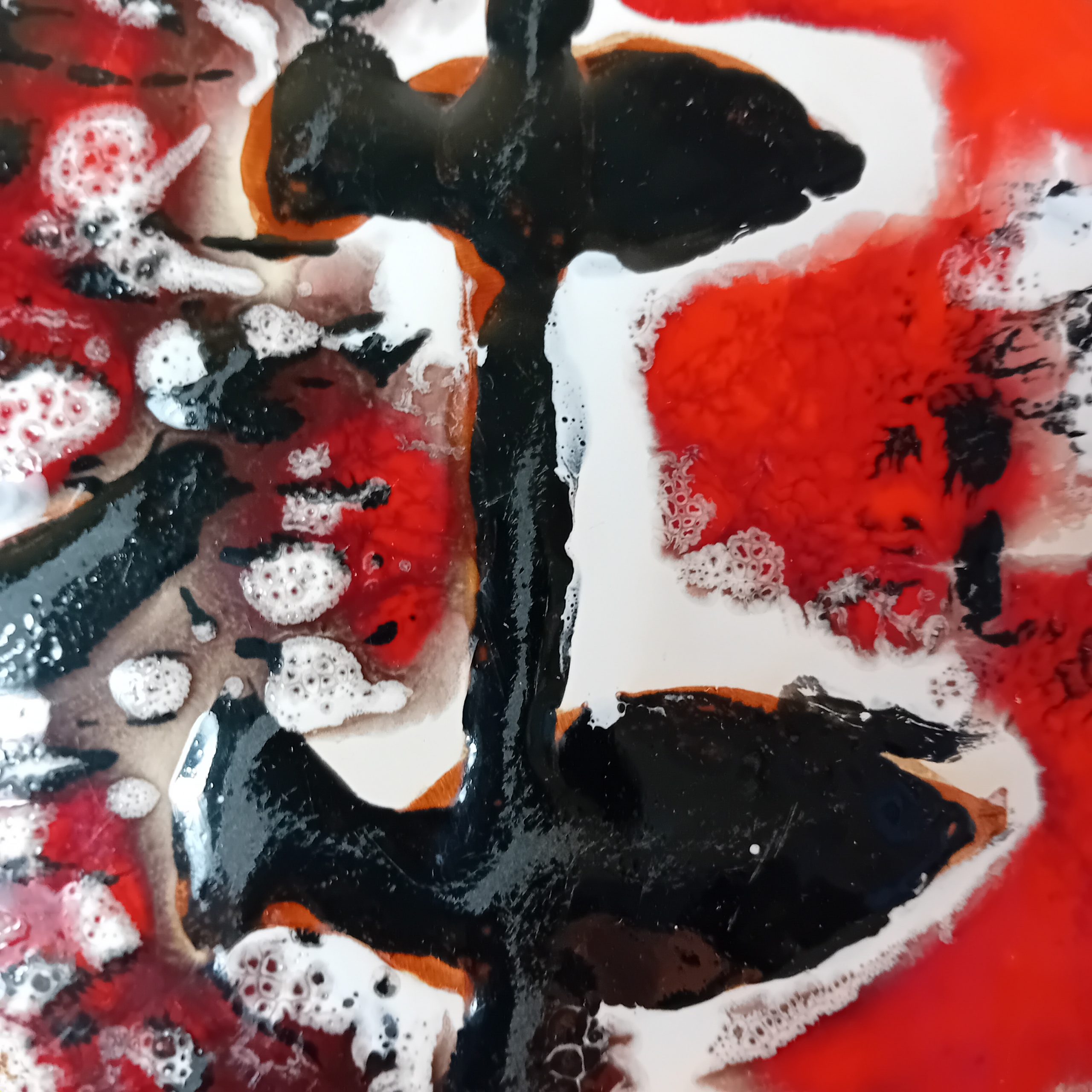 Emaillage rouge brillant, blanc et noir en relief par endroit.