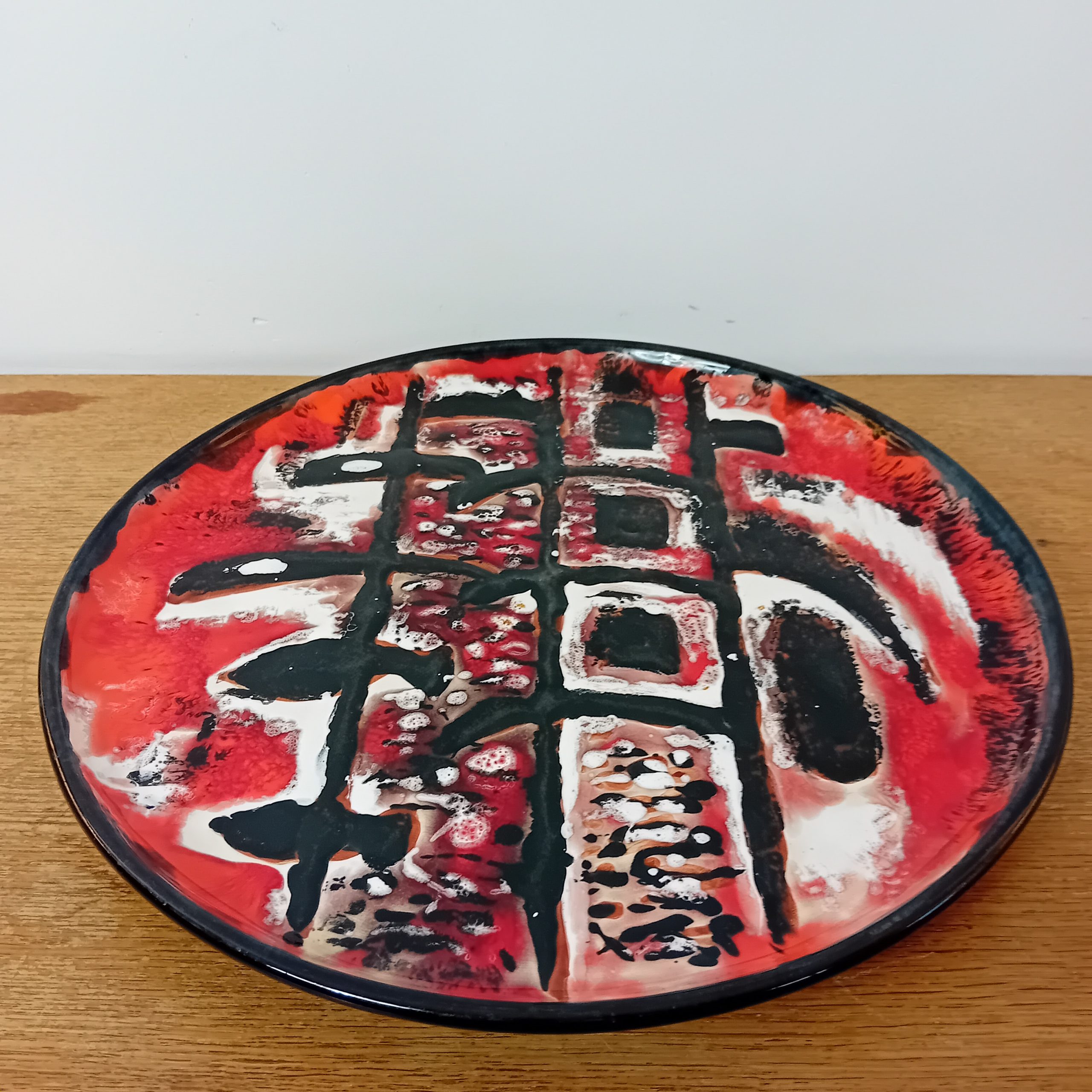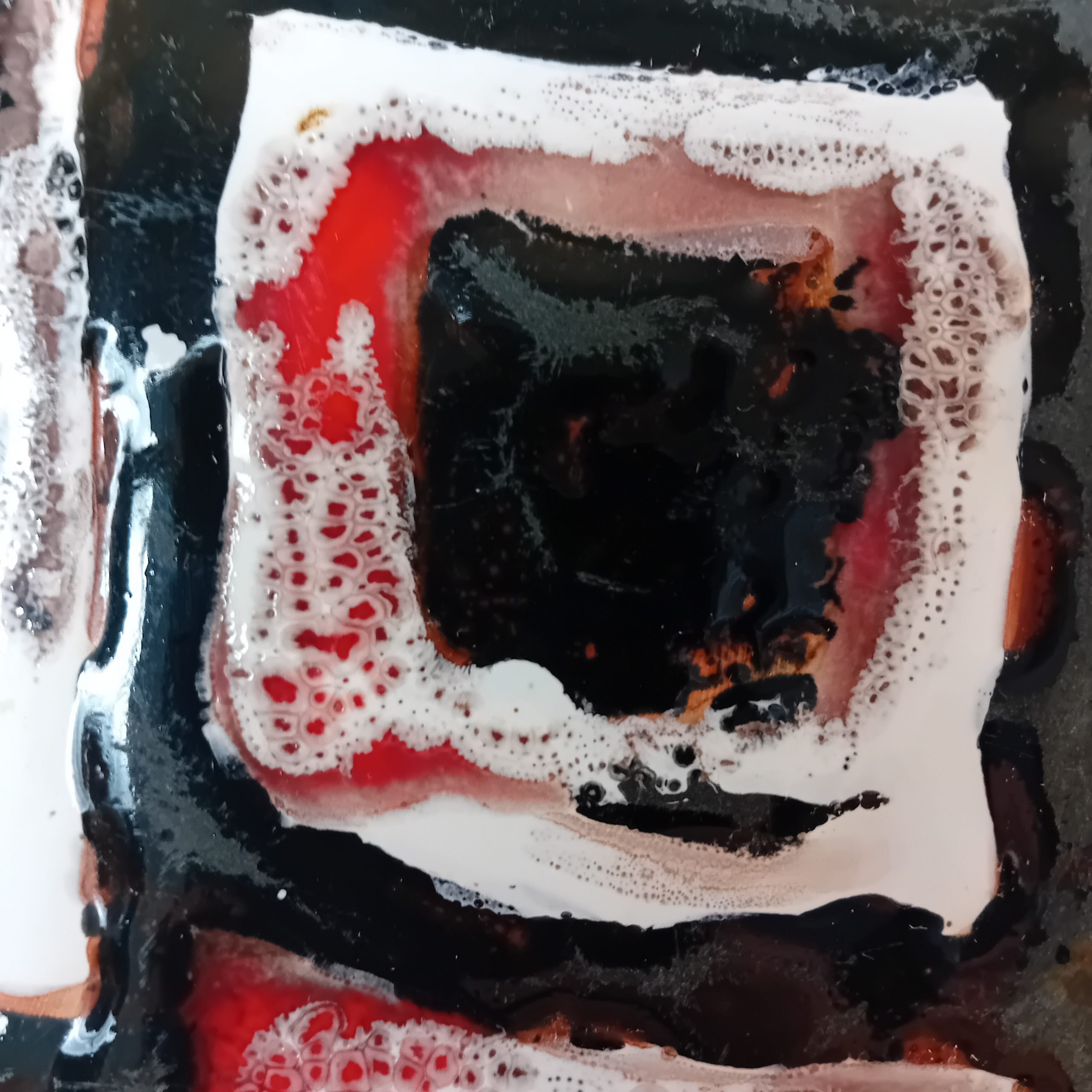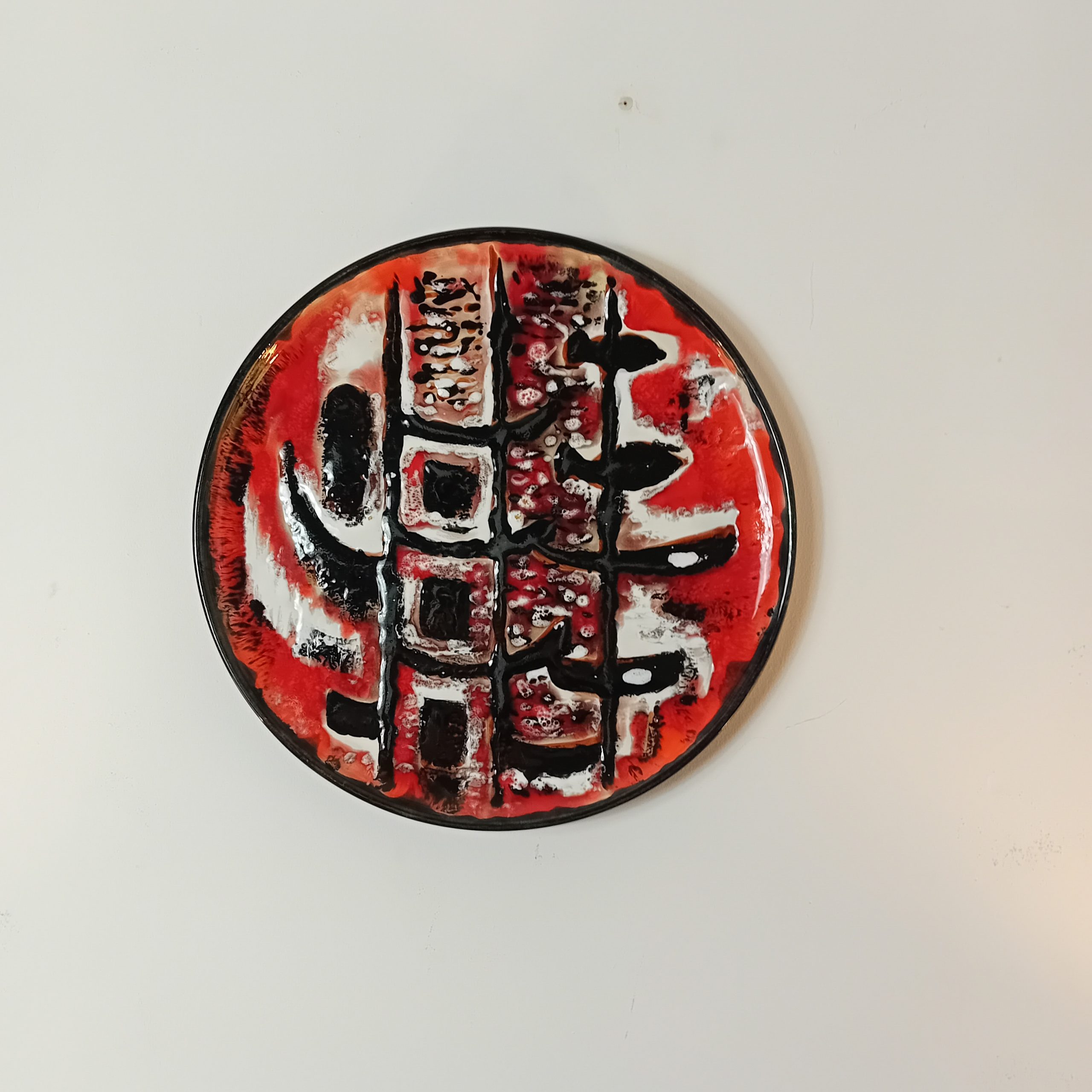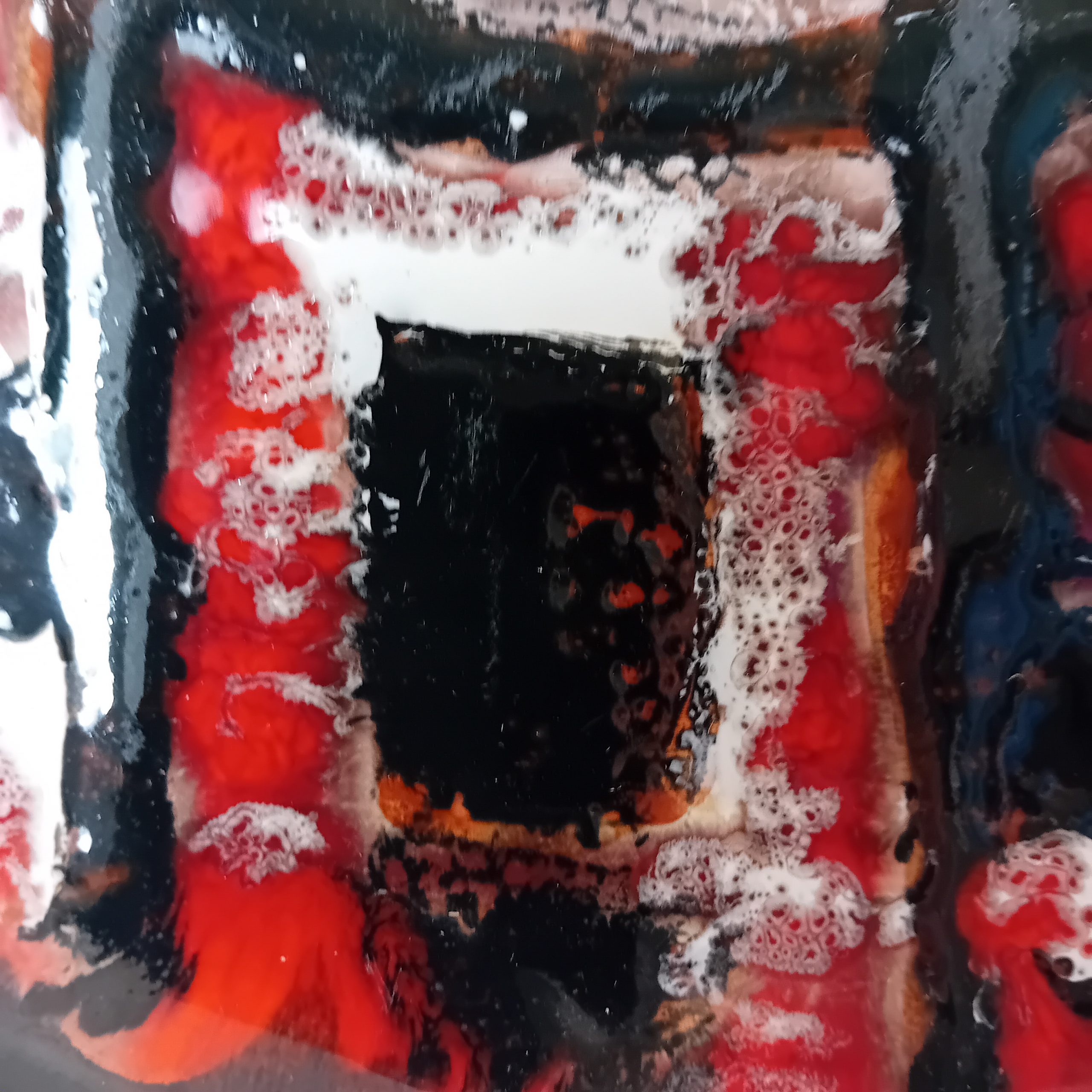 Emaillage rouge brillant, blanc et noir en relief par endroit.