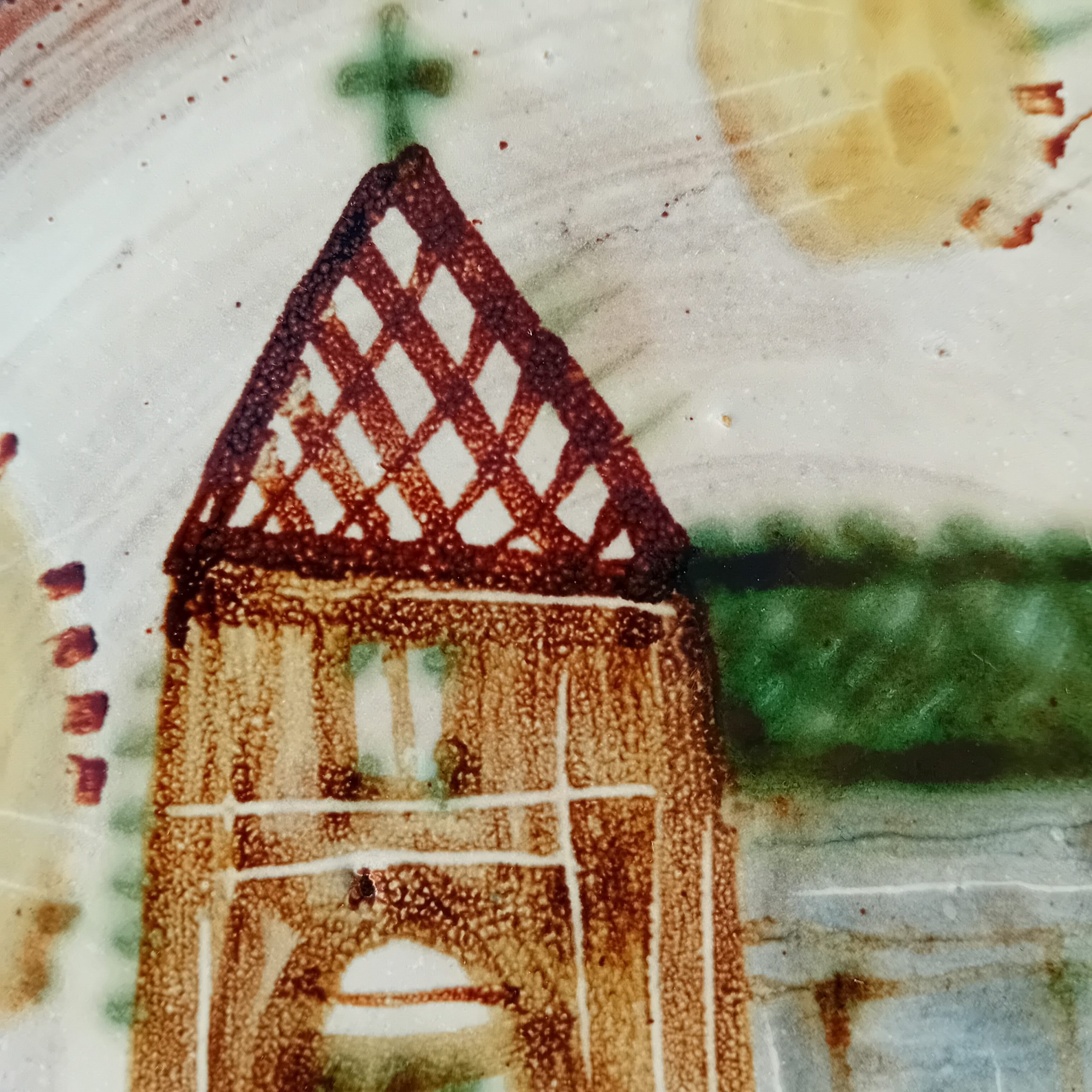 Le décor représente une architecture stylisée d’église entourée d’arbres, dans des tons de vert, brun et ocre.