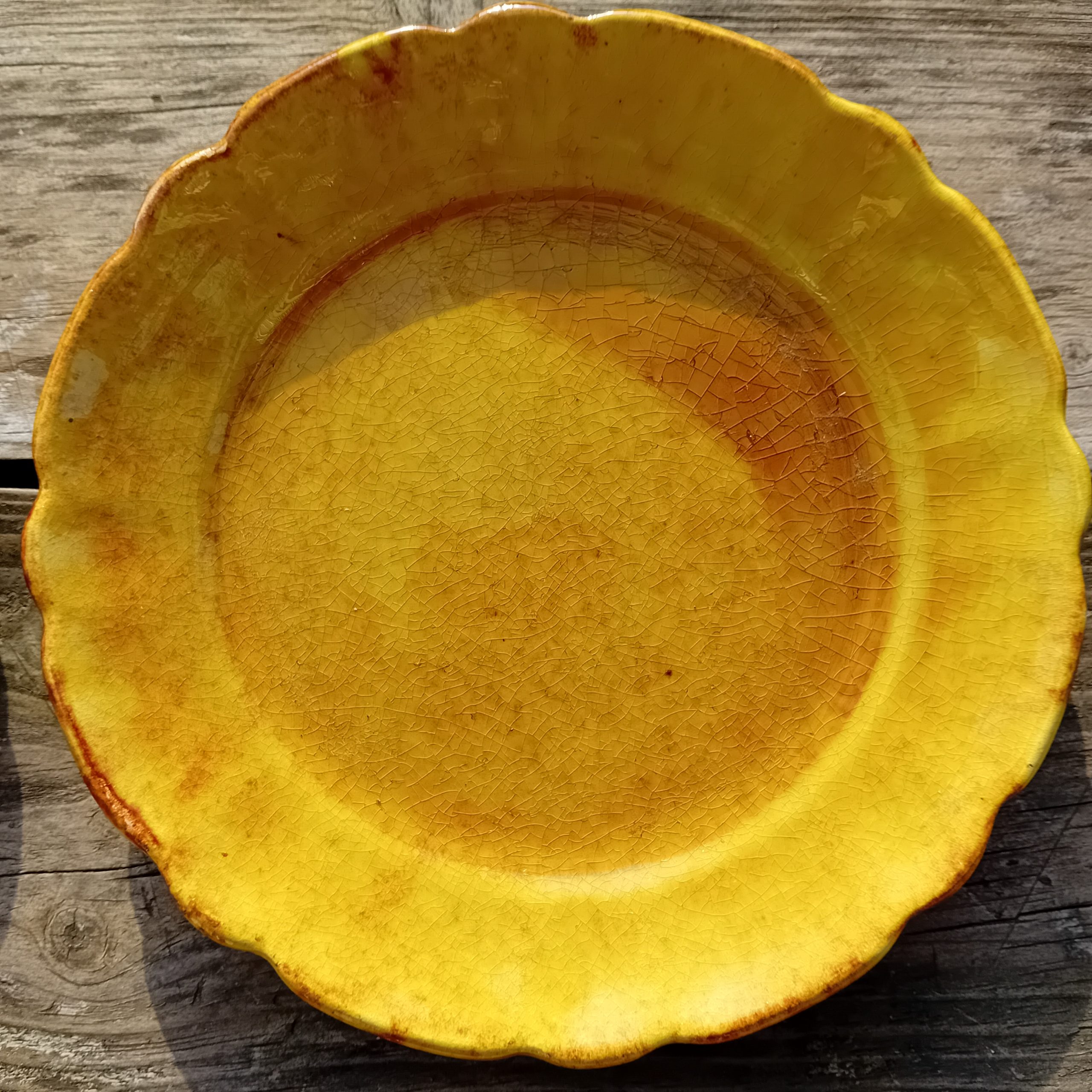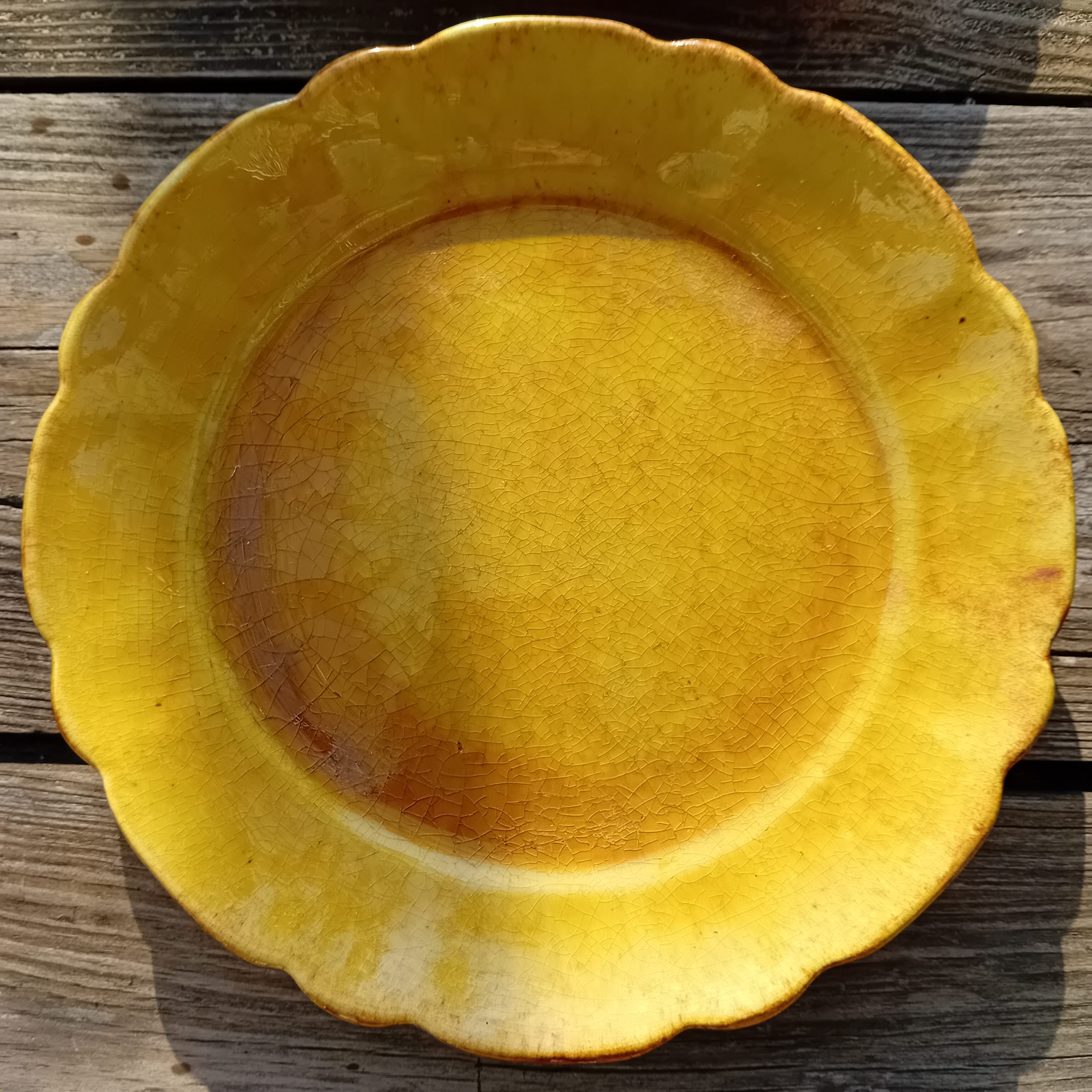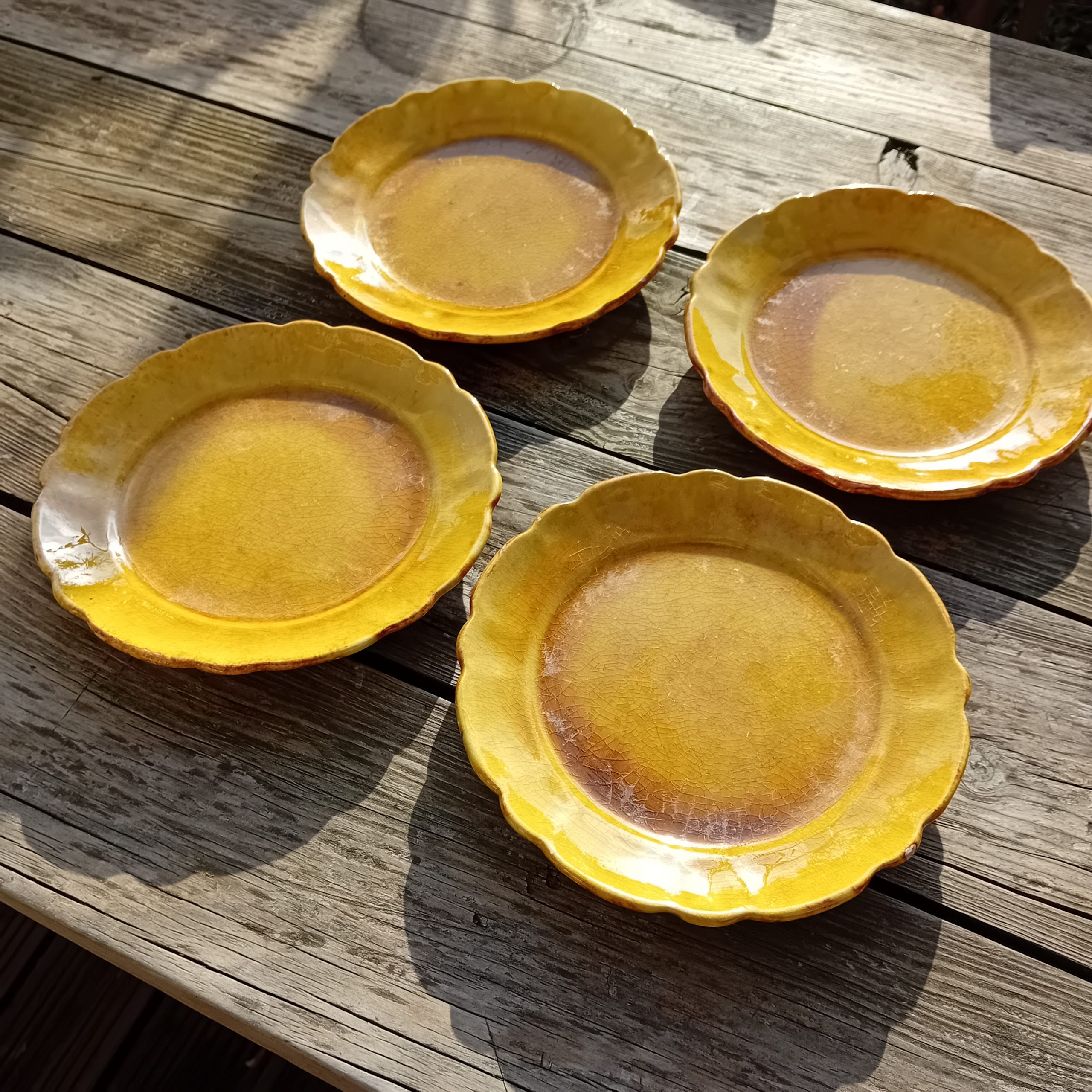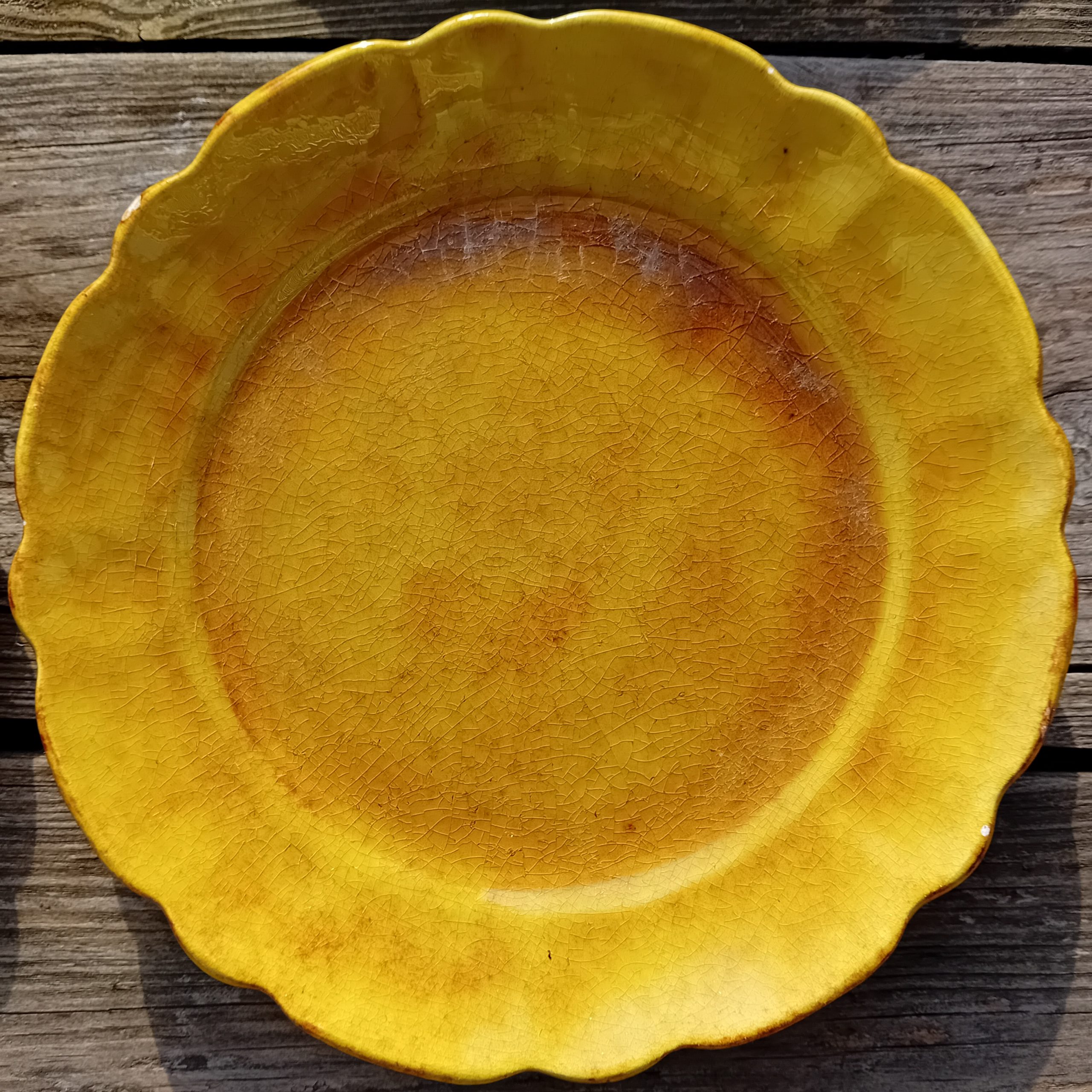 Ensuite, la glaçure couleur miel, typique des productions vallauriennes, présente une craquelure fine et régulière. Selon les pièces, l’émail révèle de légères variations de ton, allant du jaune doré à des nuances plus ambrées. Ces différences témoignent d’une cuisson artisanale et renforcent l’unicité de chaque assiette.