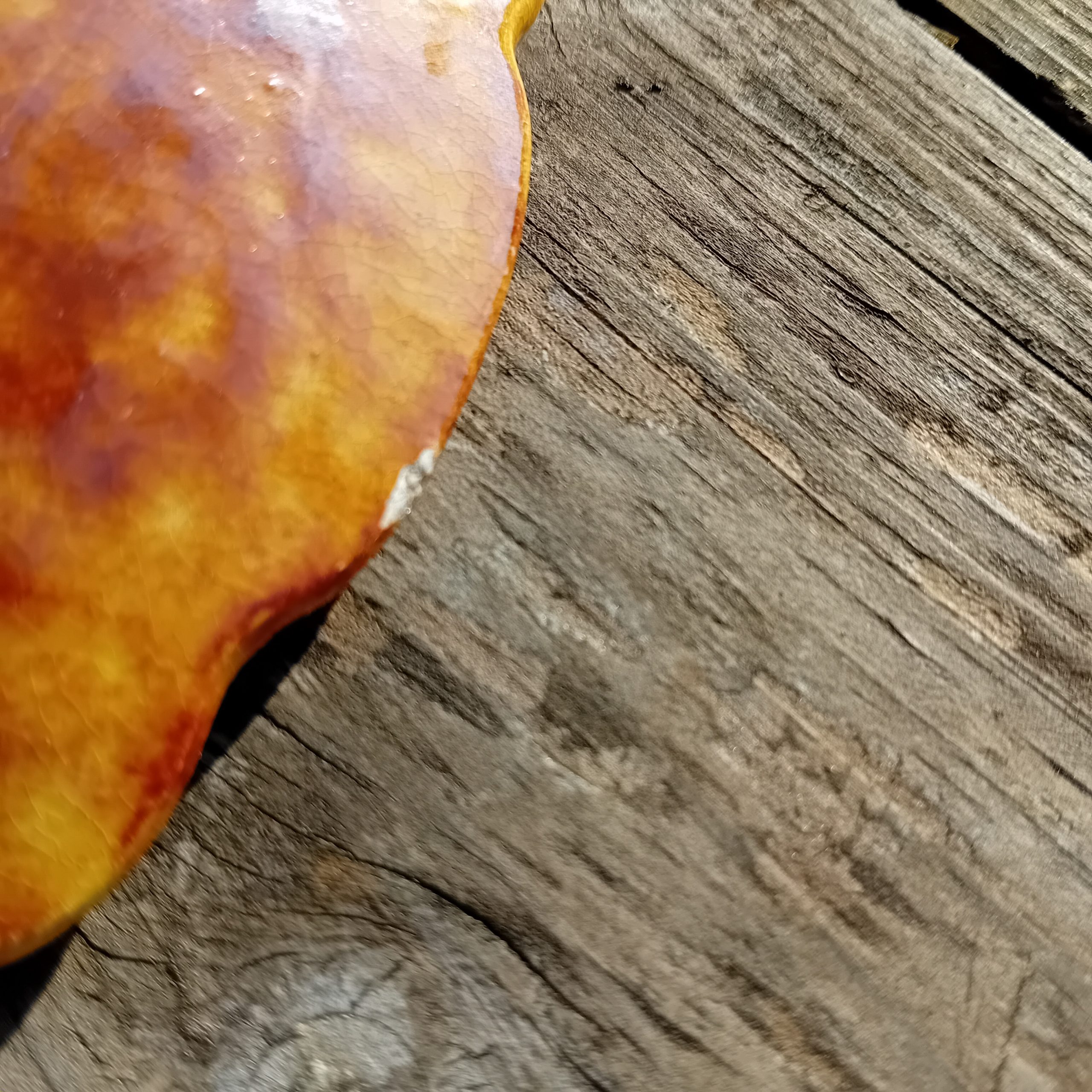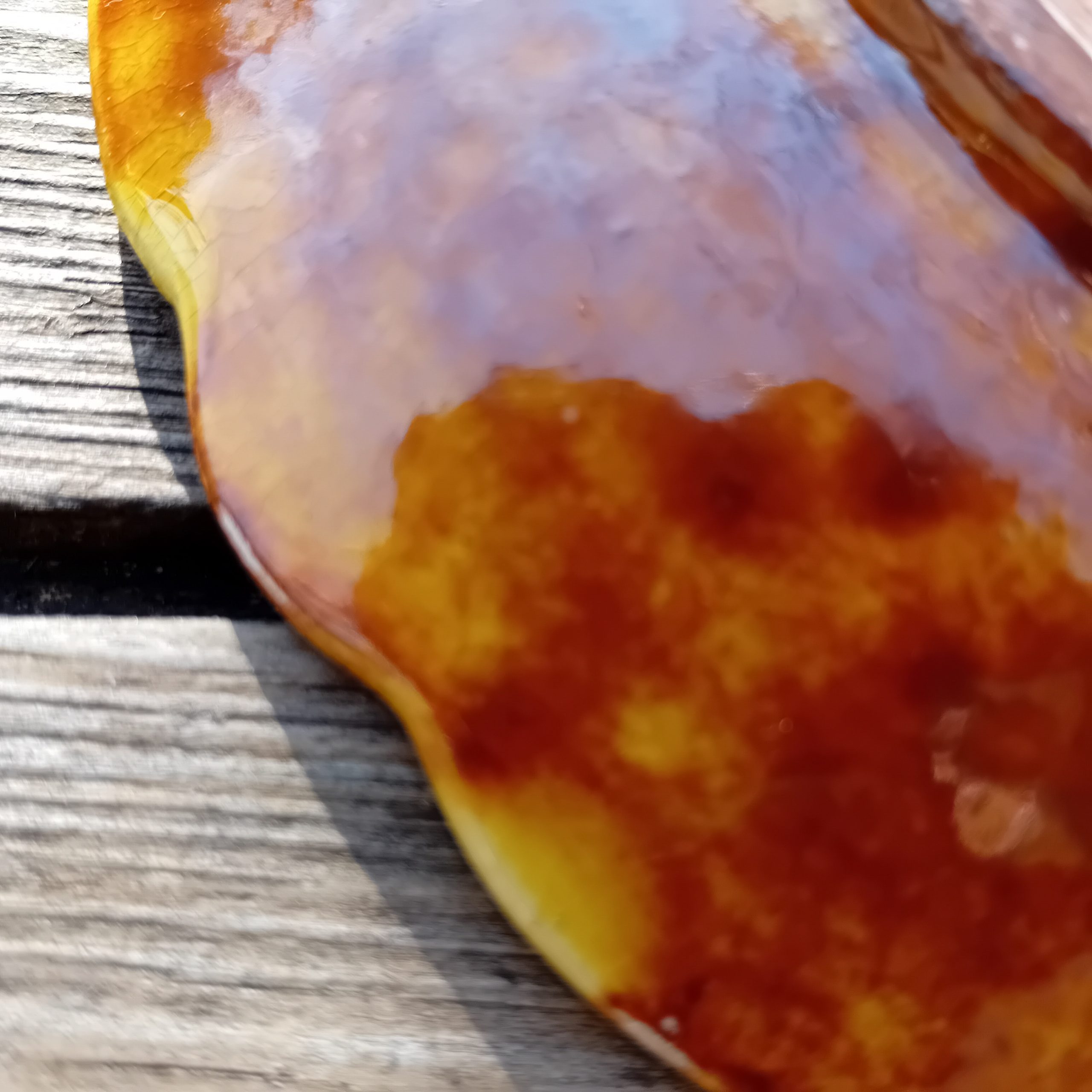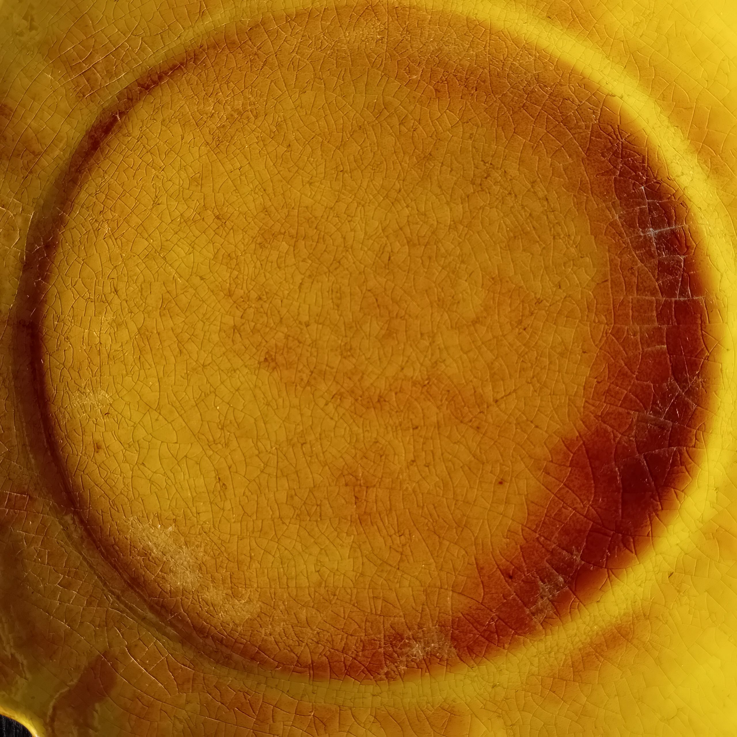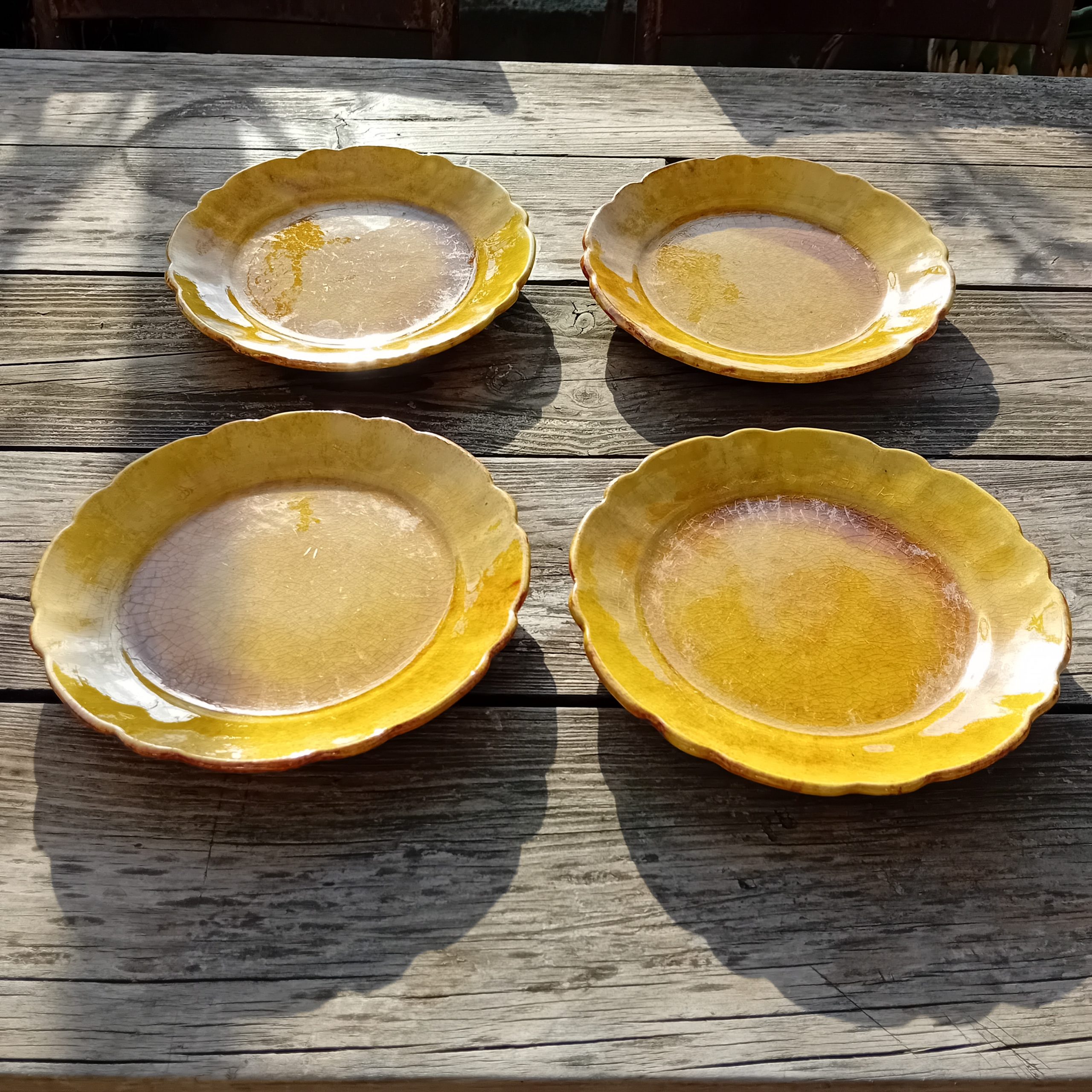 Ensuite, la glaçure couleur miel, typique des productions vallauriennes, présente une craquelure fine et régulière. Selon les pièces, l’émail révèle de légères variations de ton, allant du jaune doré à des nuances plus ambrées. Ces différences témoignent d’une cuisson artisanale et renforcent l’unicité de chaque assiette.