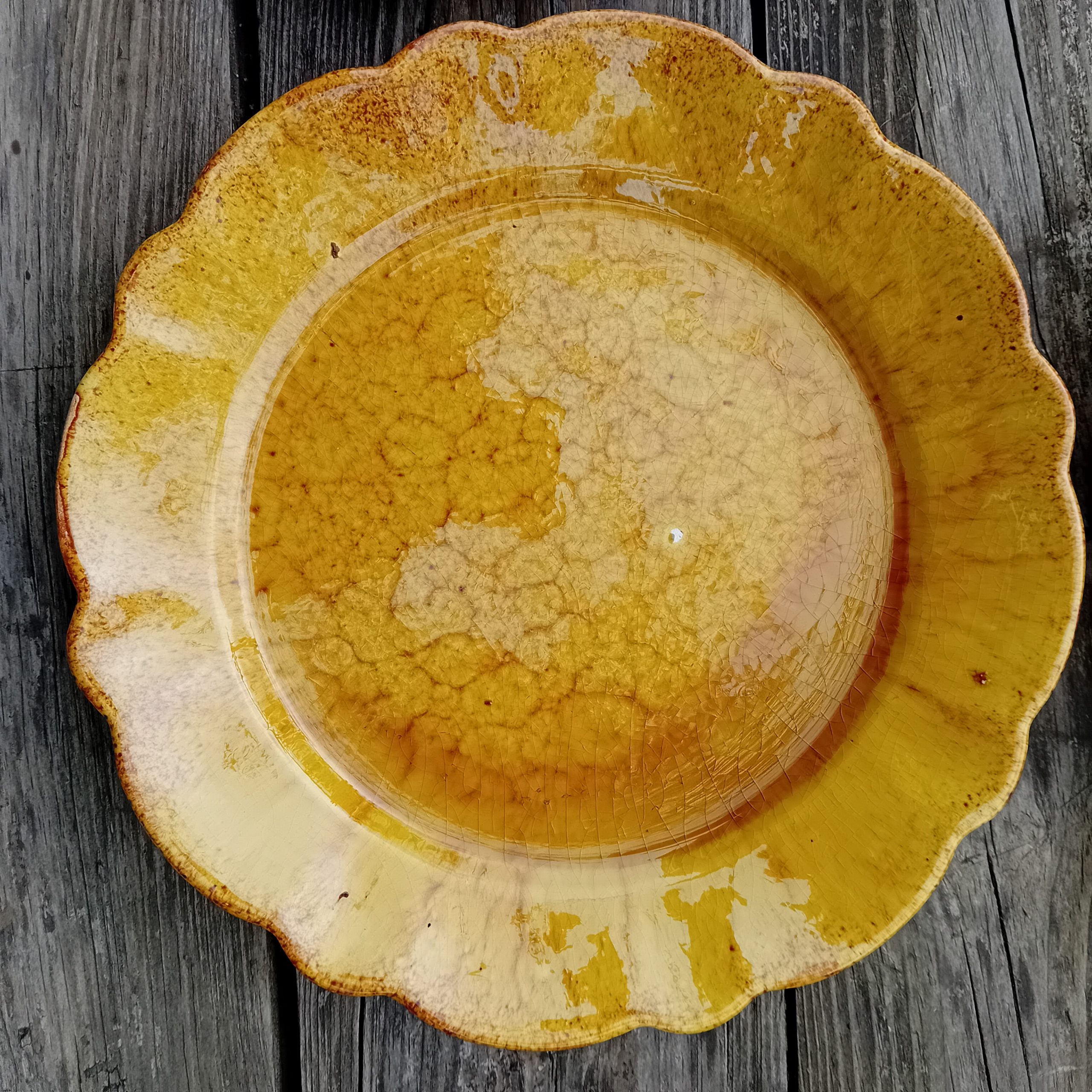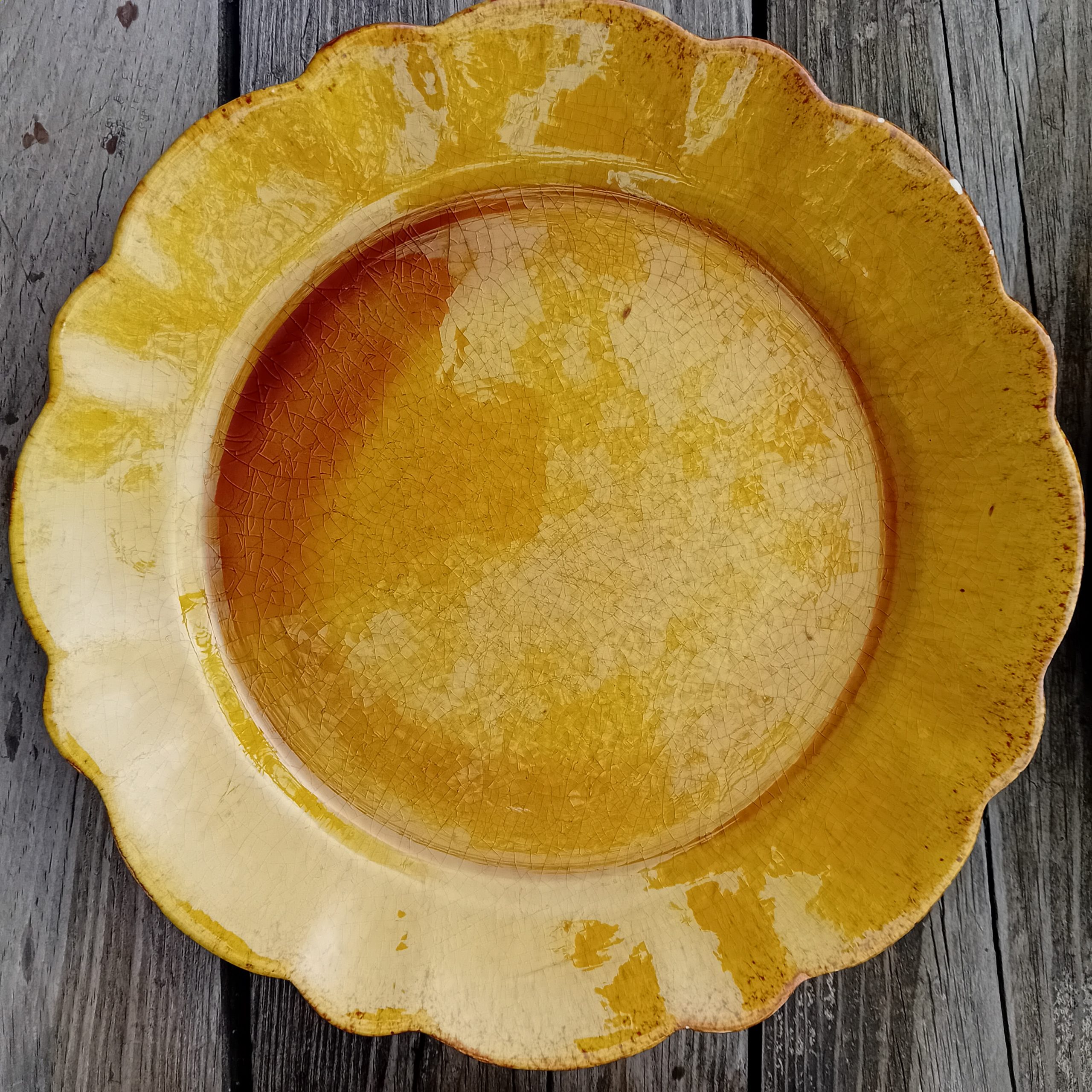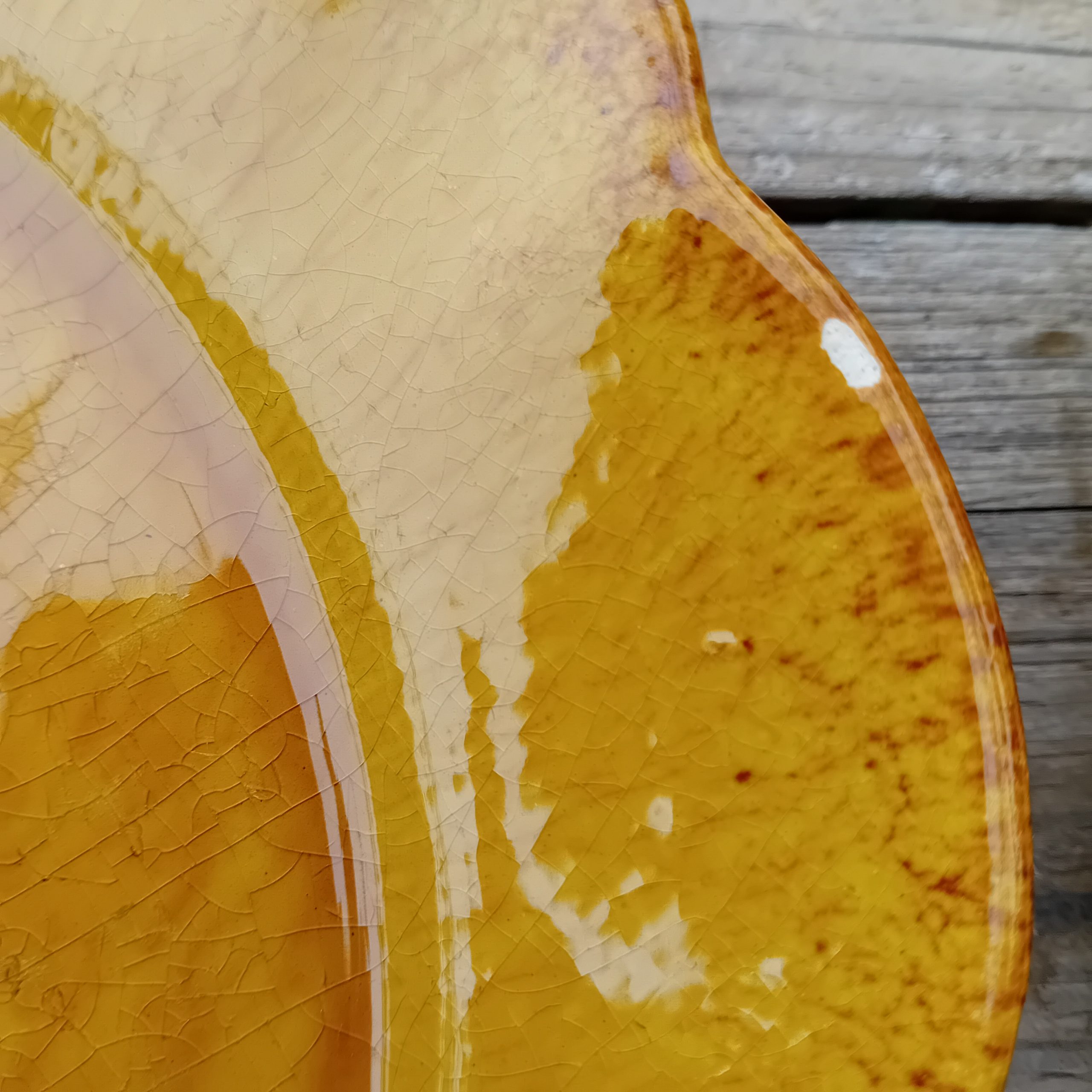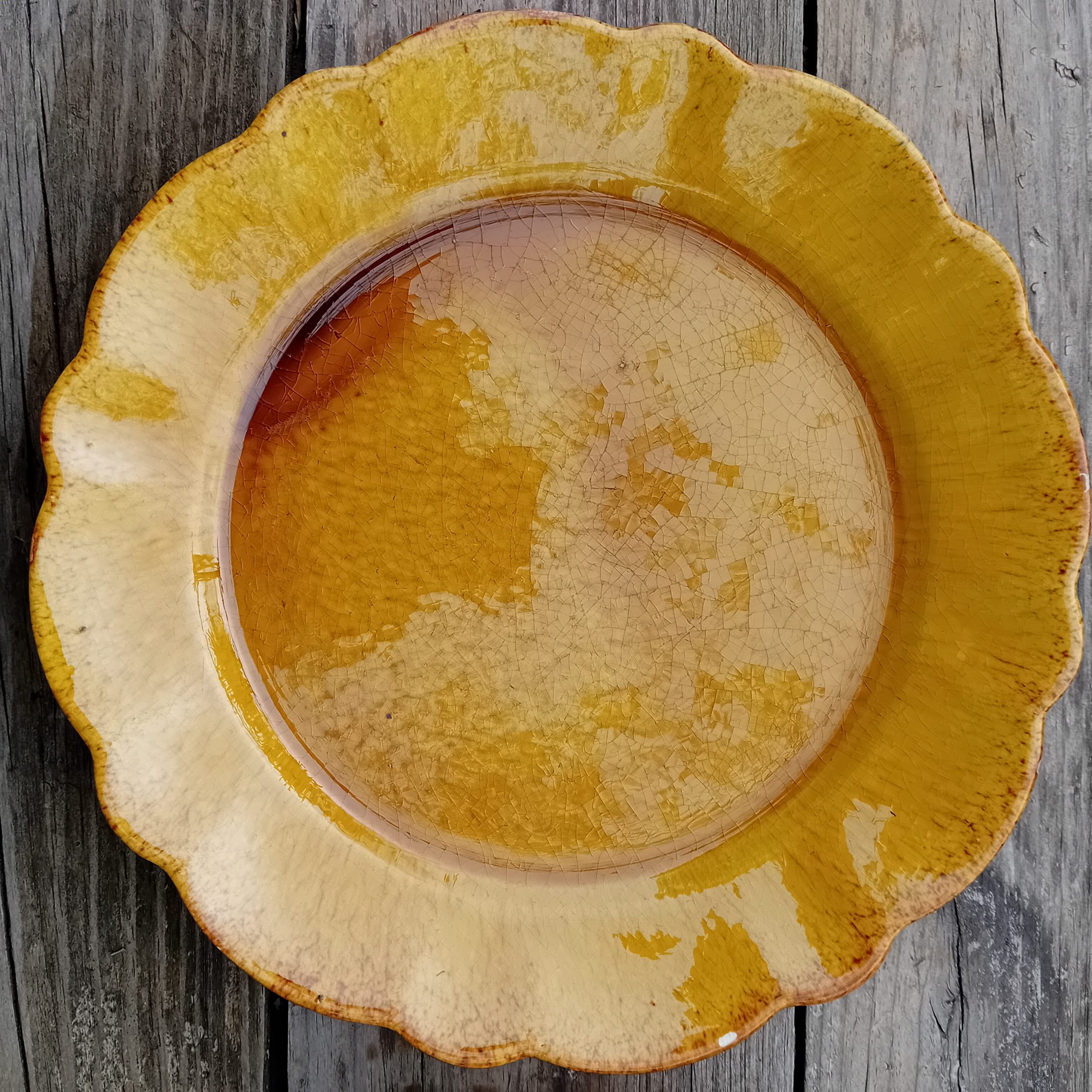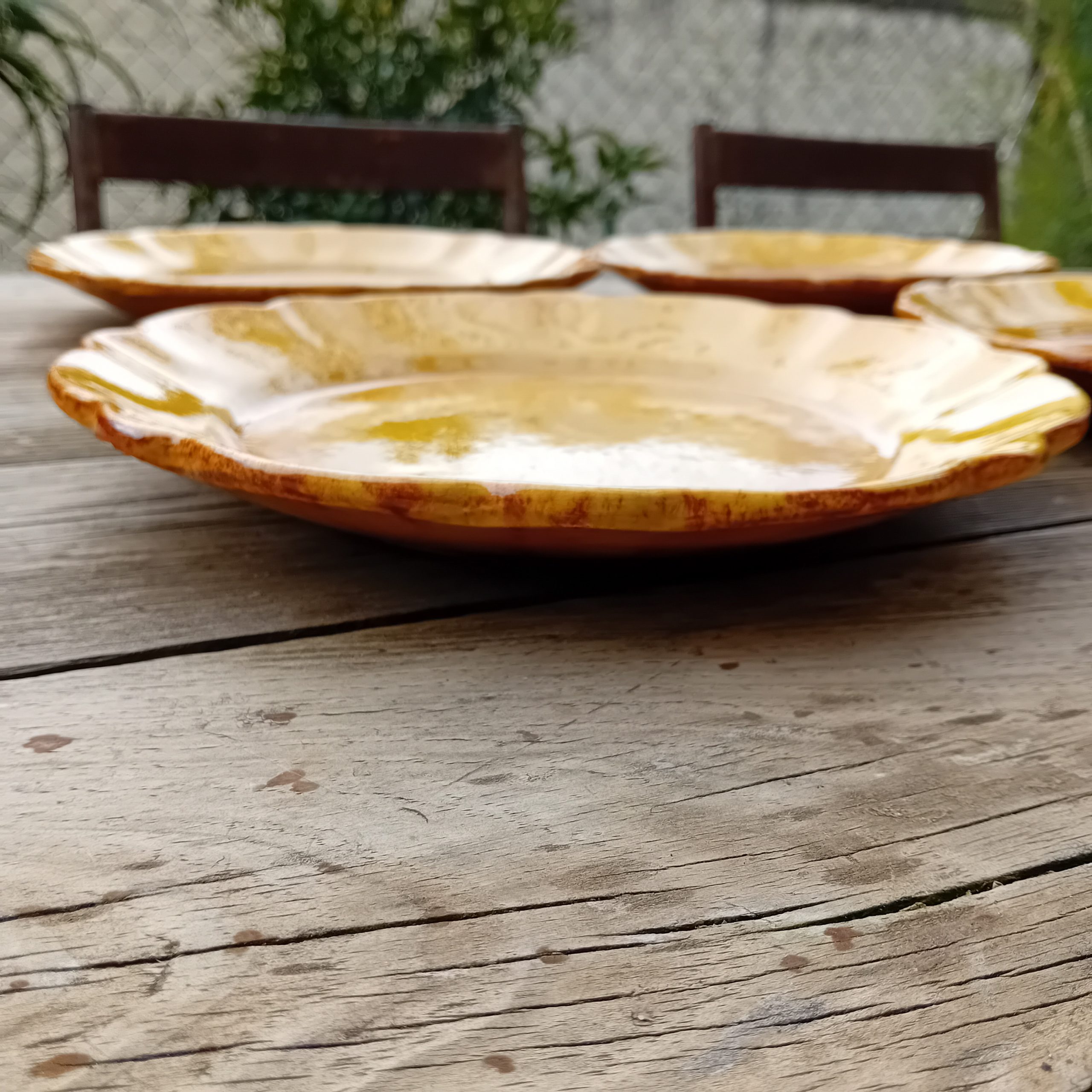 Ensuite, les assiettes présentent une glaçure couleur miel, parfois appelée “pain brûlé”, animée par une craquelure fine et régulière. Selon la cuisson, l’émail révèle de subtiles variations de teinte. Ainsi, chaque pièce possède sa propre nuance, renforçant l’authenticité de l’ensemble.
