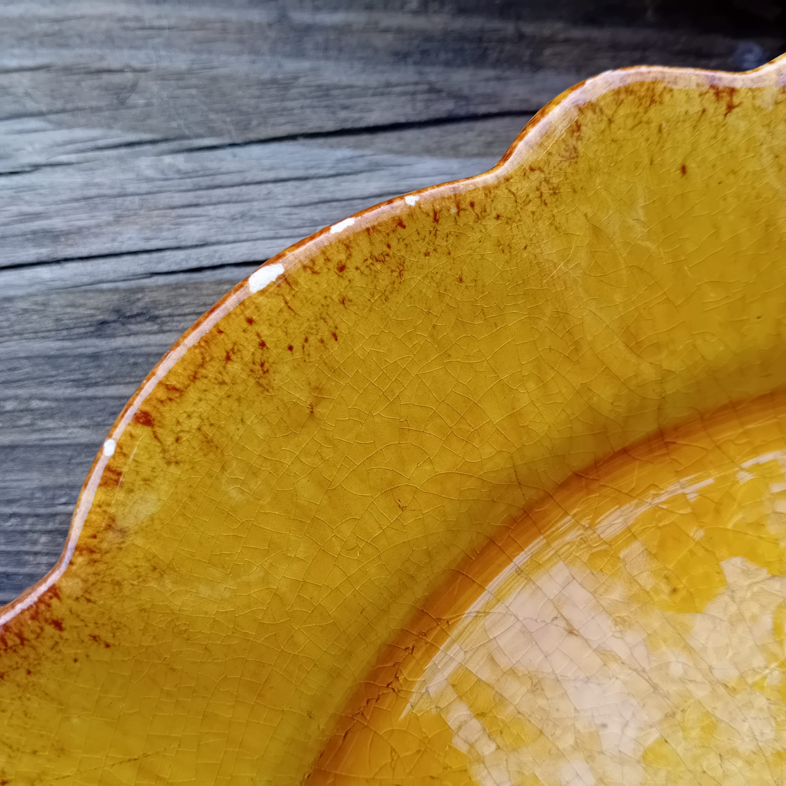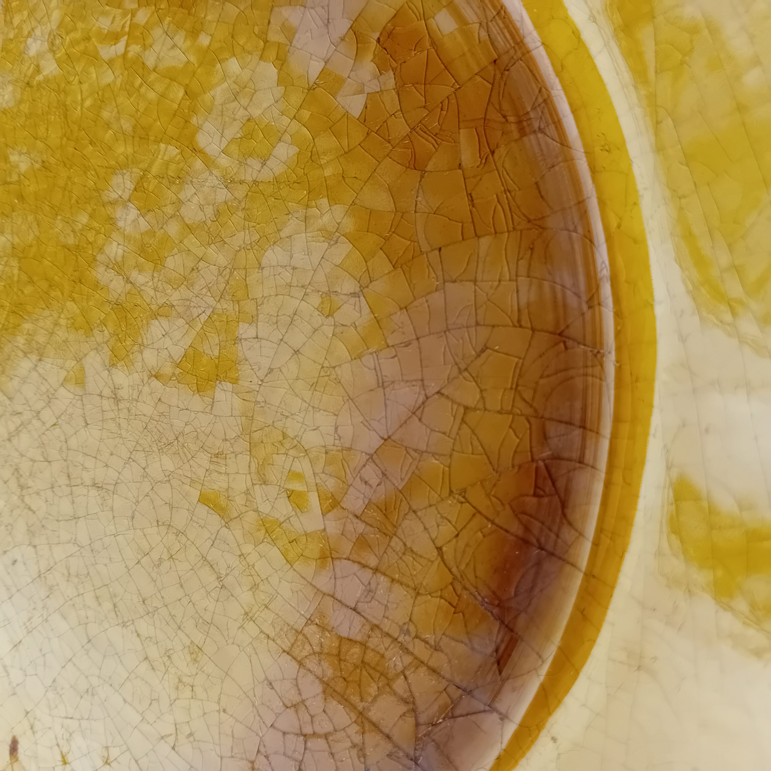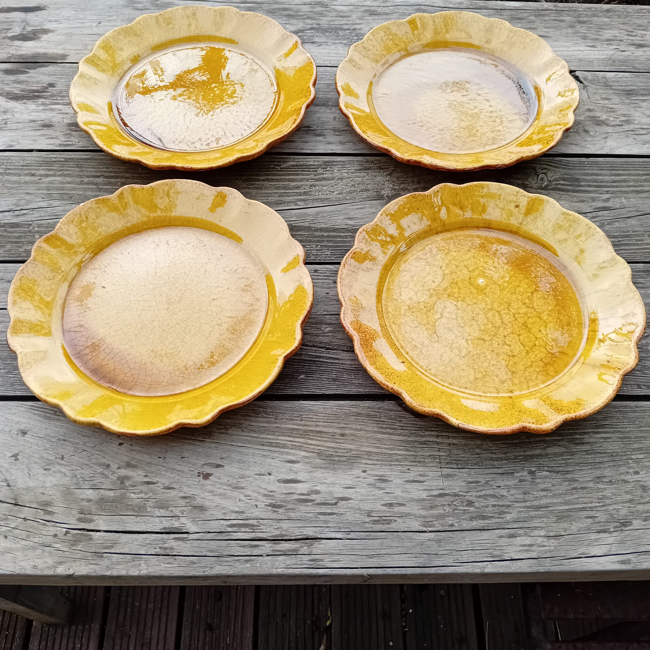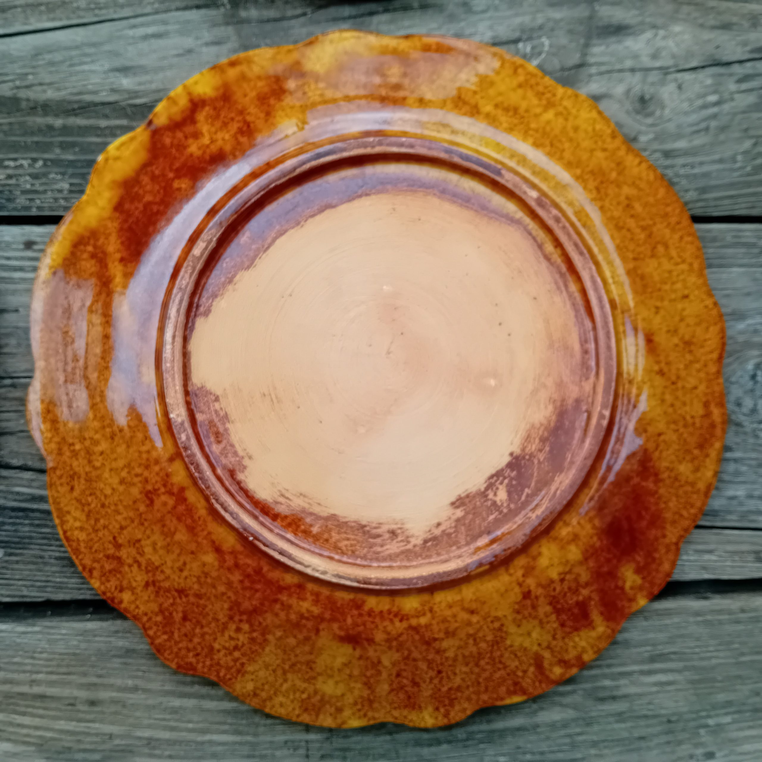 Ensuite, les assiettes présentent une glaçure couleur miel, parfois appelée “pain brûlé”, animée par une craquelure fine et régulière. Selon la cuisson, l’émail révèle de subtiles variations de teinte. Ainsi, chaque pièce possède sa propre nuance, renforçant l’authenticité de l’ensemble.