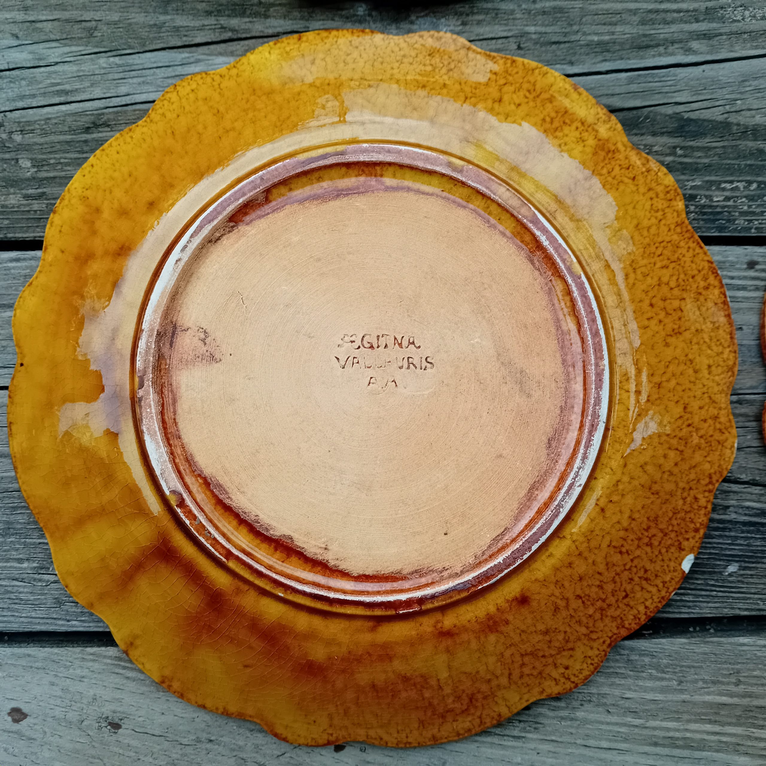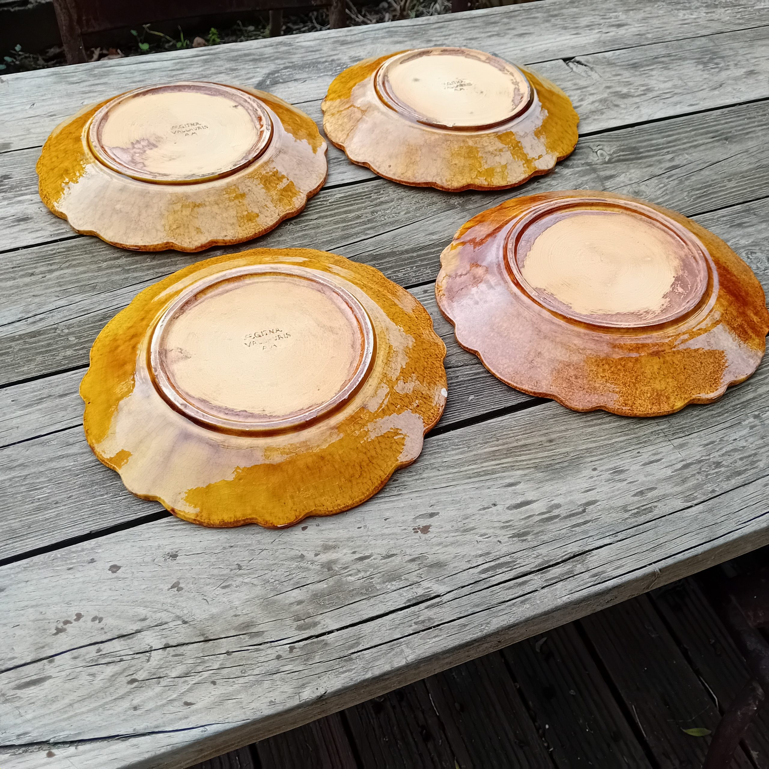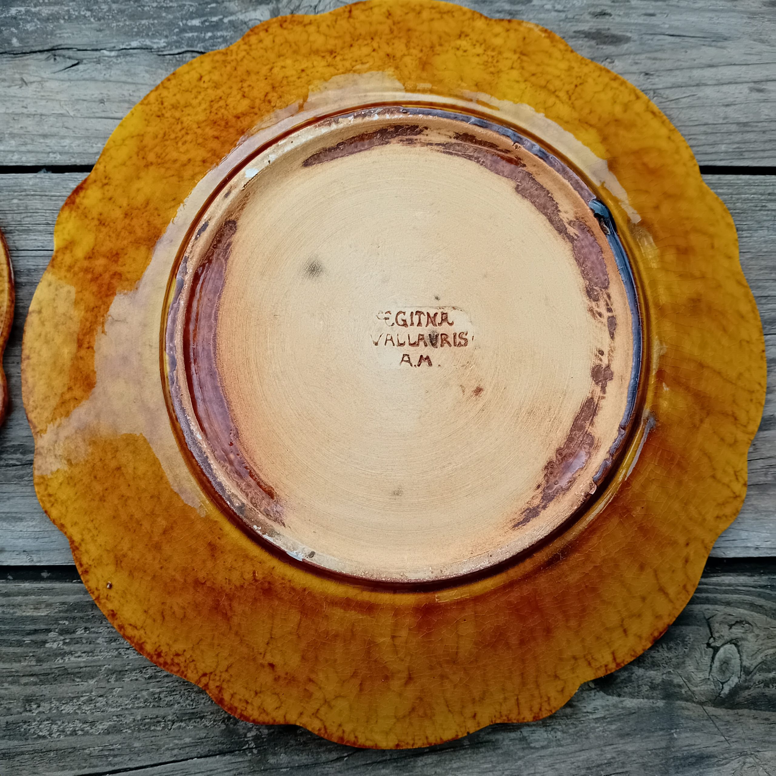 Tout d’abord, ces assiettes se distinguent par leur forme chantournée, reconnaissable à leur bord délicatement ondulé. Cette ligne souple apporte du mouvement et confère immédiatement une présence élégante à la table. De plus, cette silhouette reste typique des productions vallauriennes de l’après-guerre. Grâce à elle, chaque assiette conserve un caractère décoratif fort, même utilisée seule.