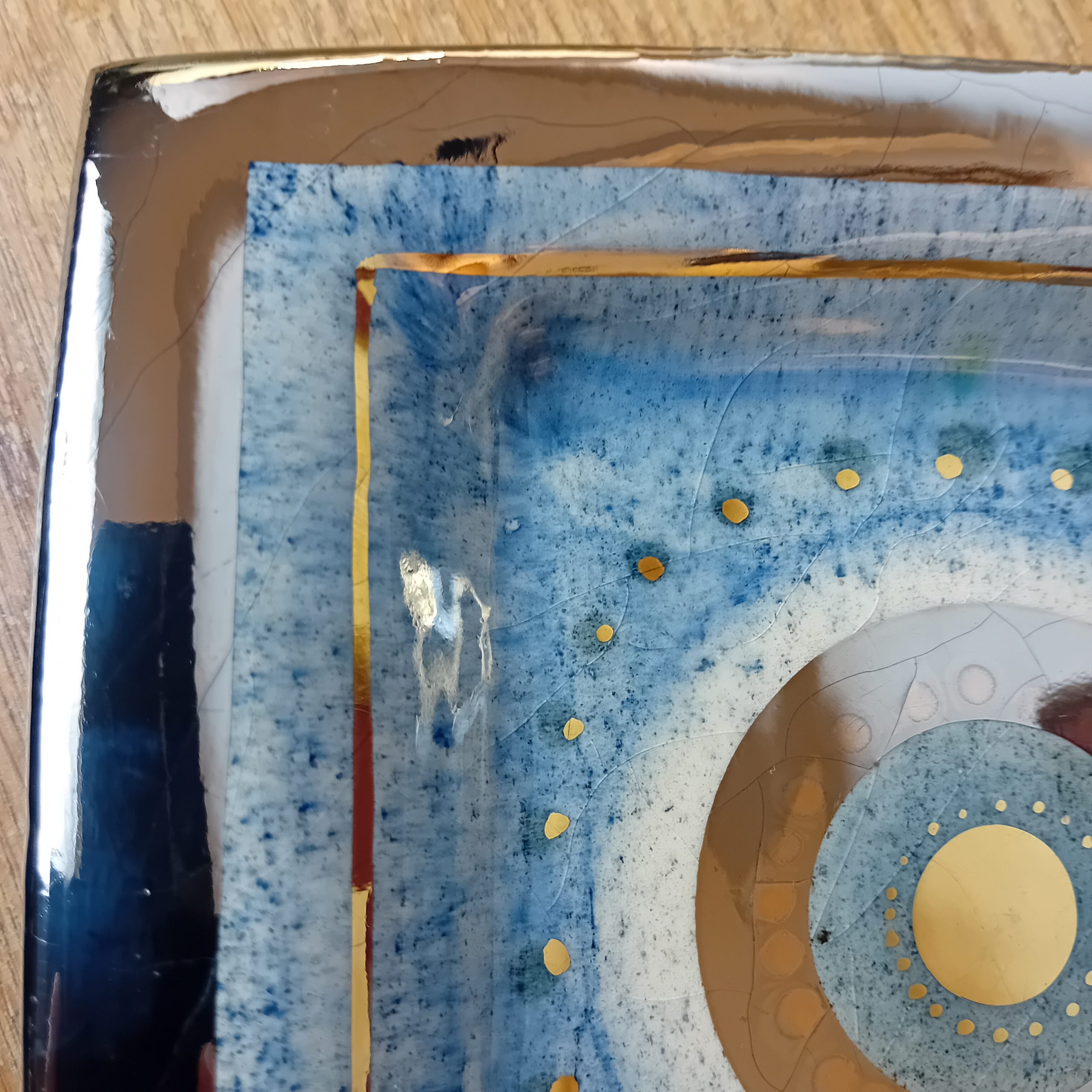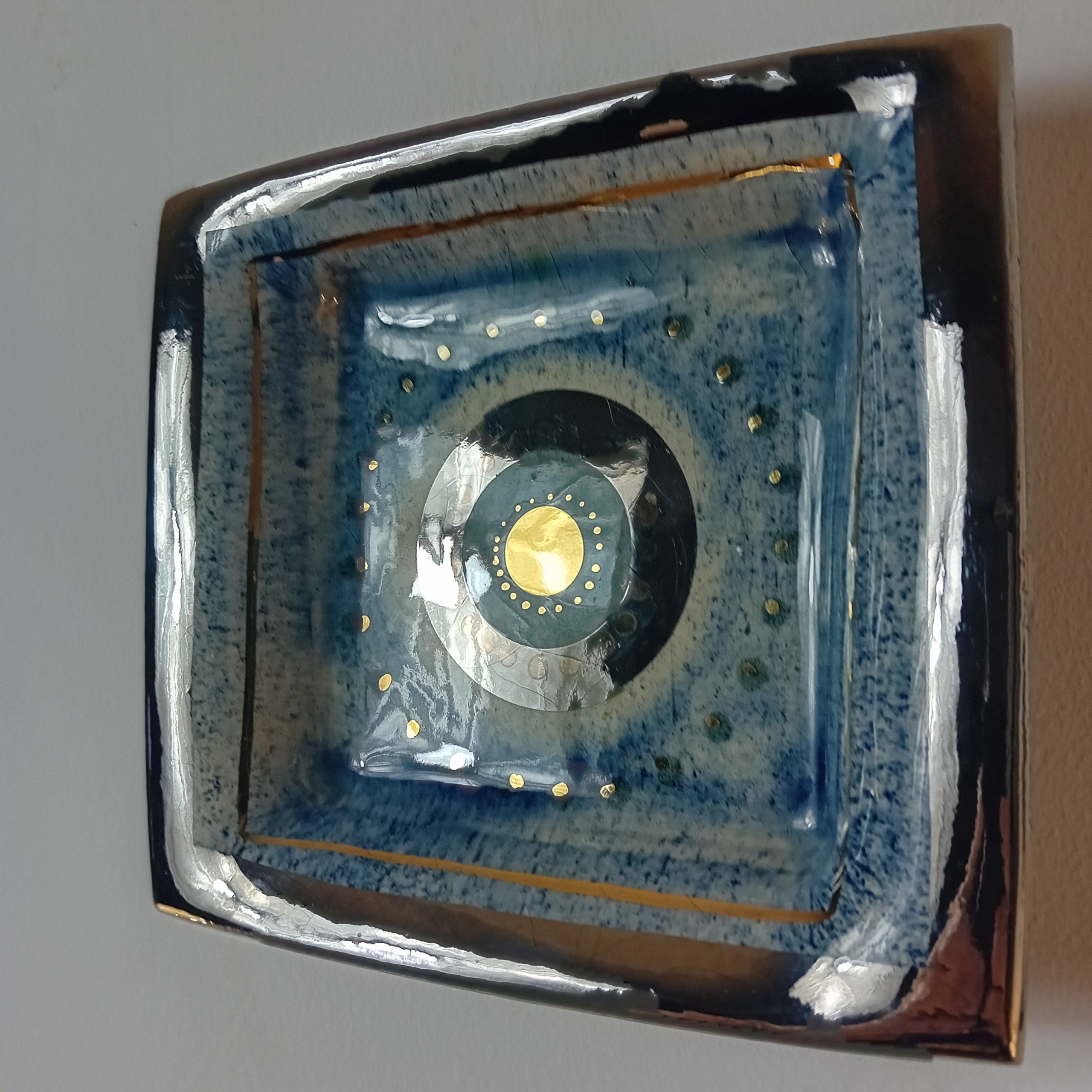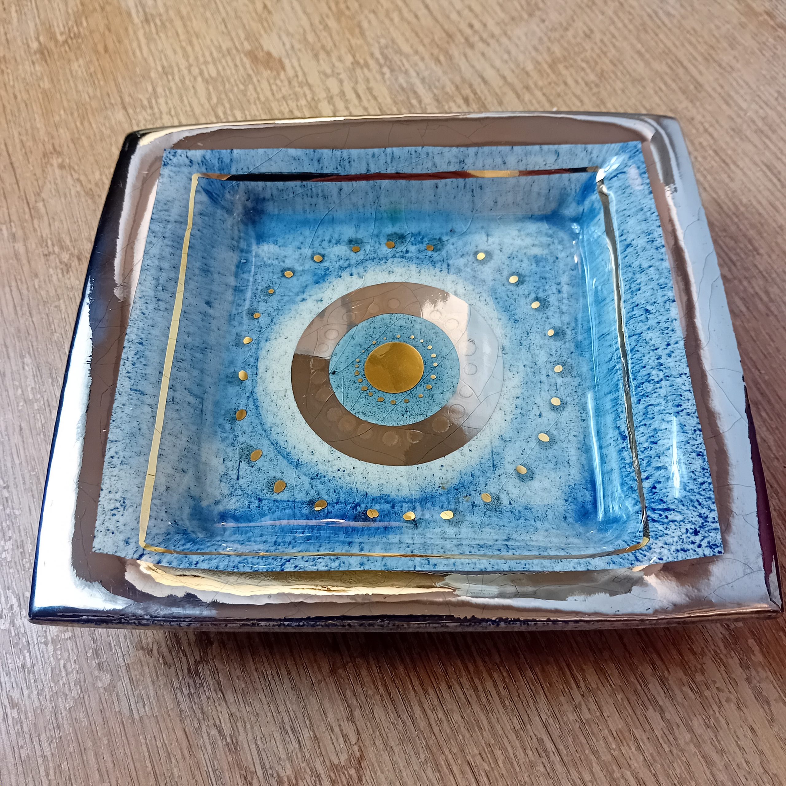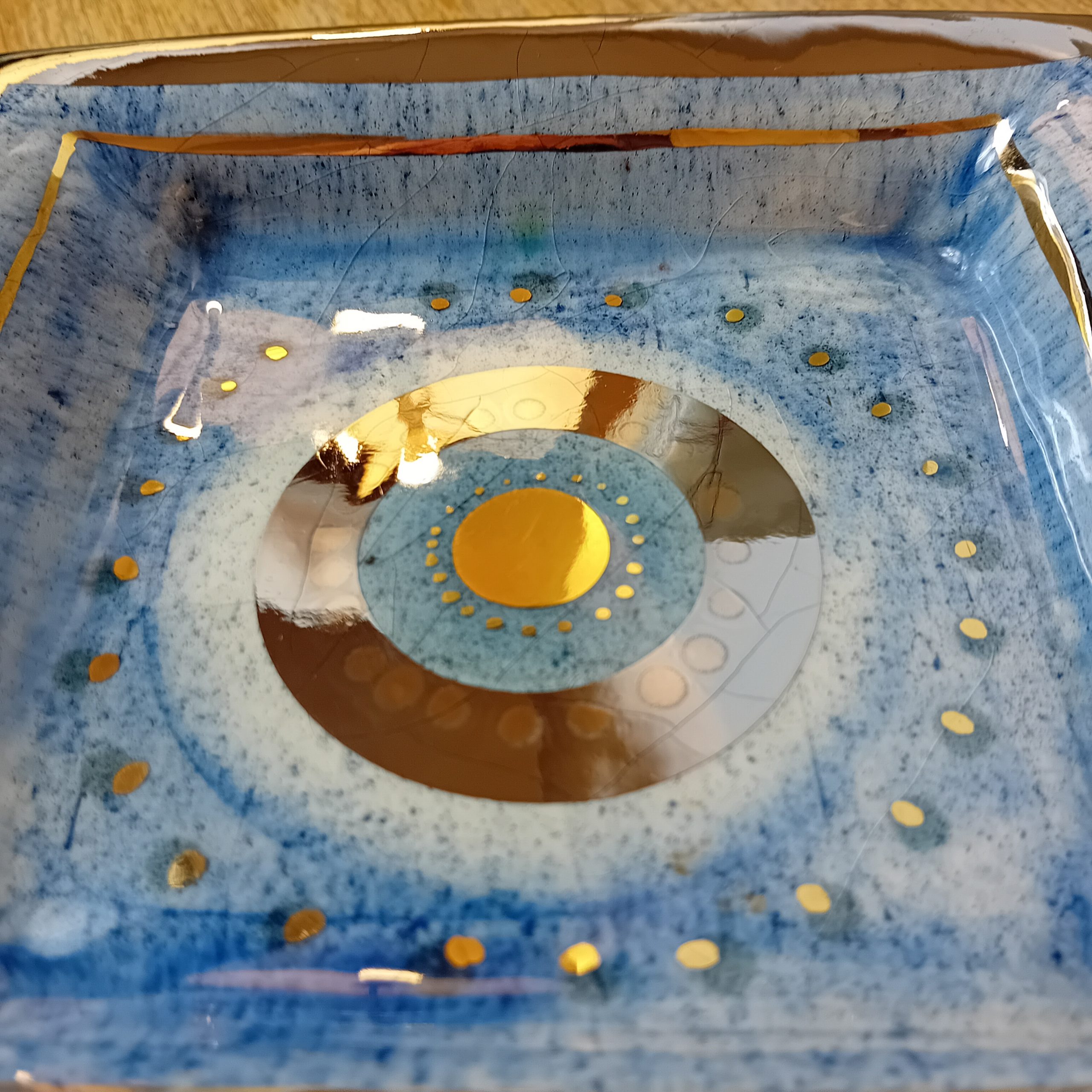 Belles couleurs bleues et décor argent et or, peu fréquent.