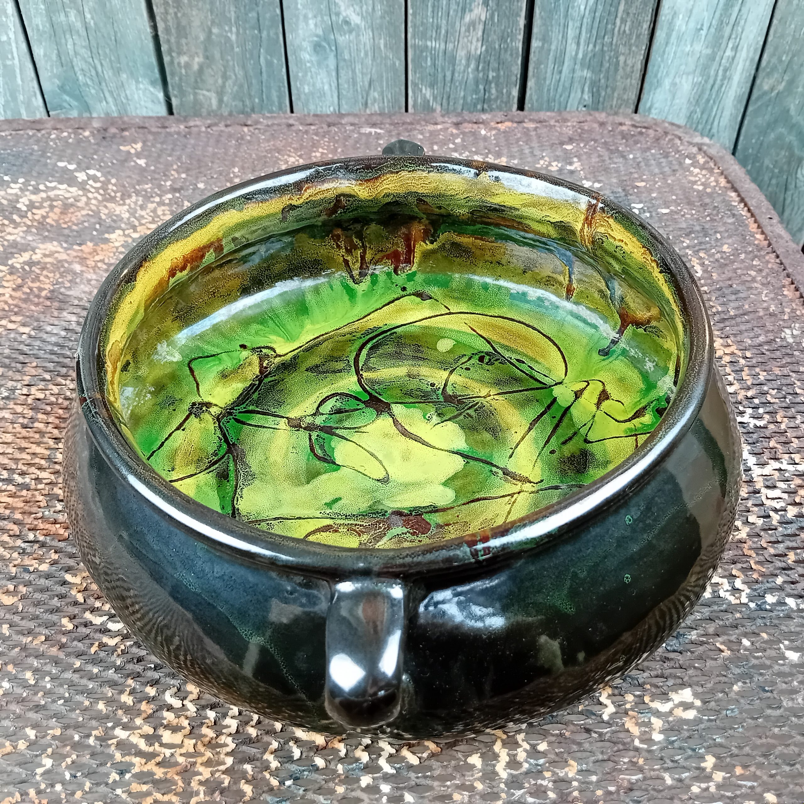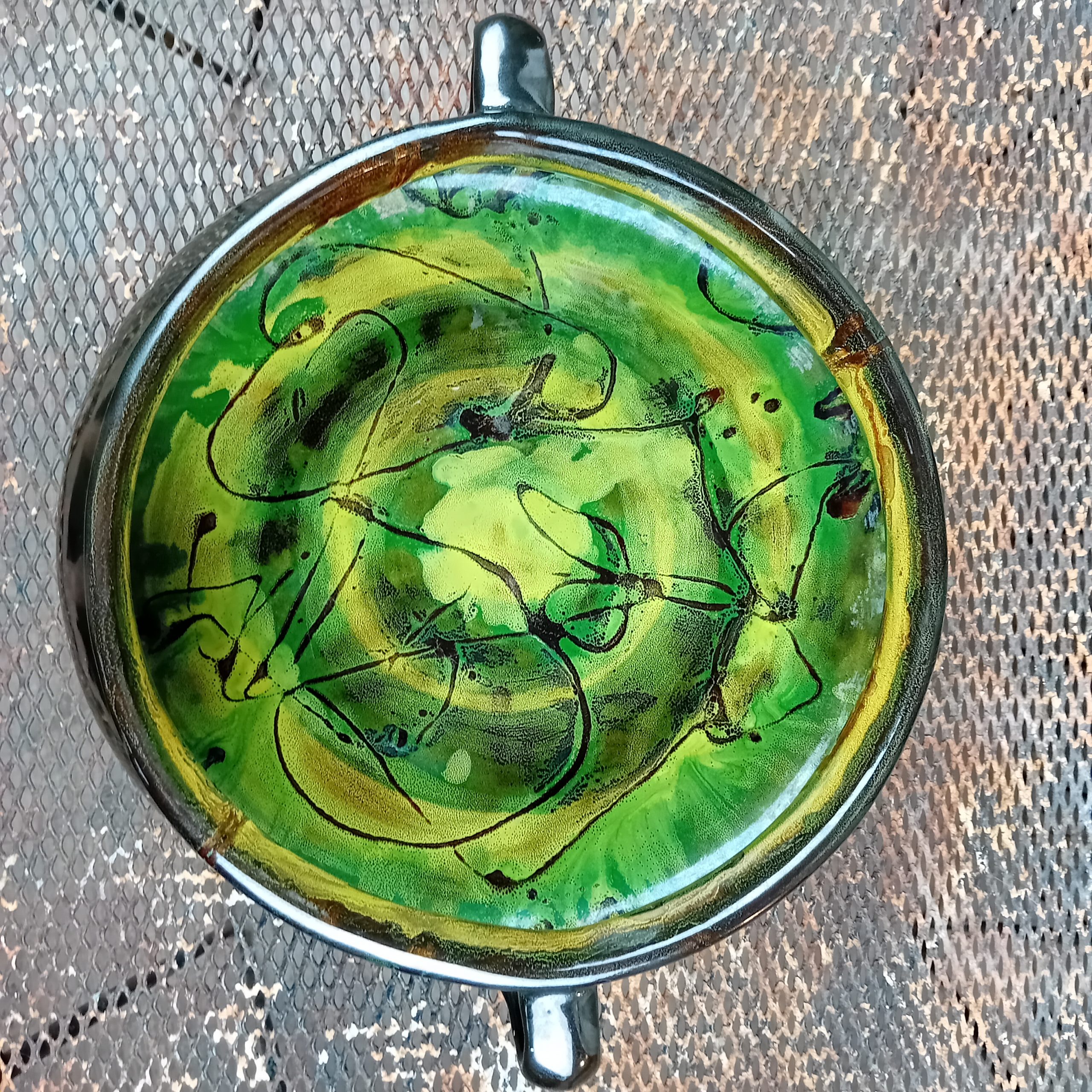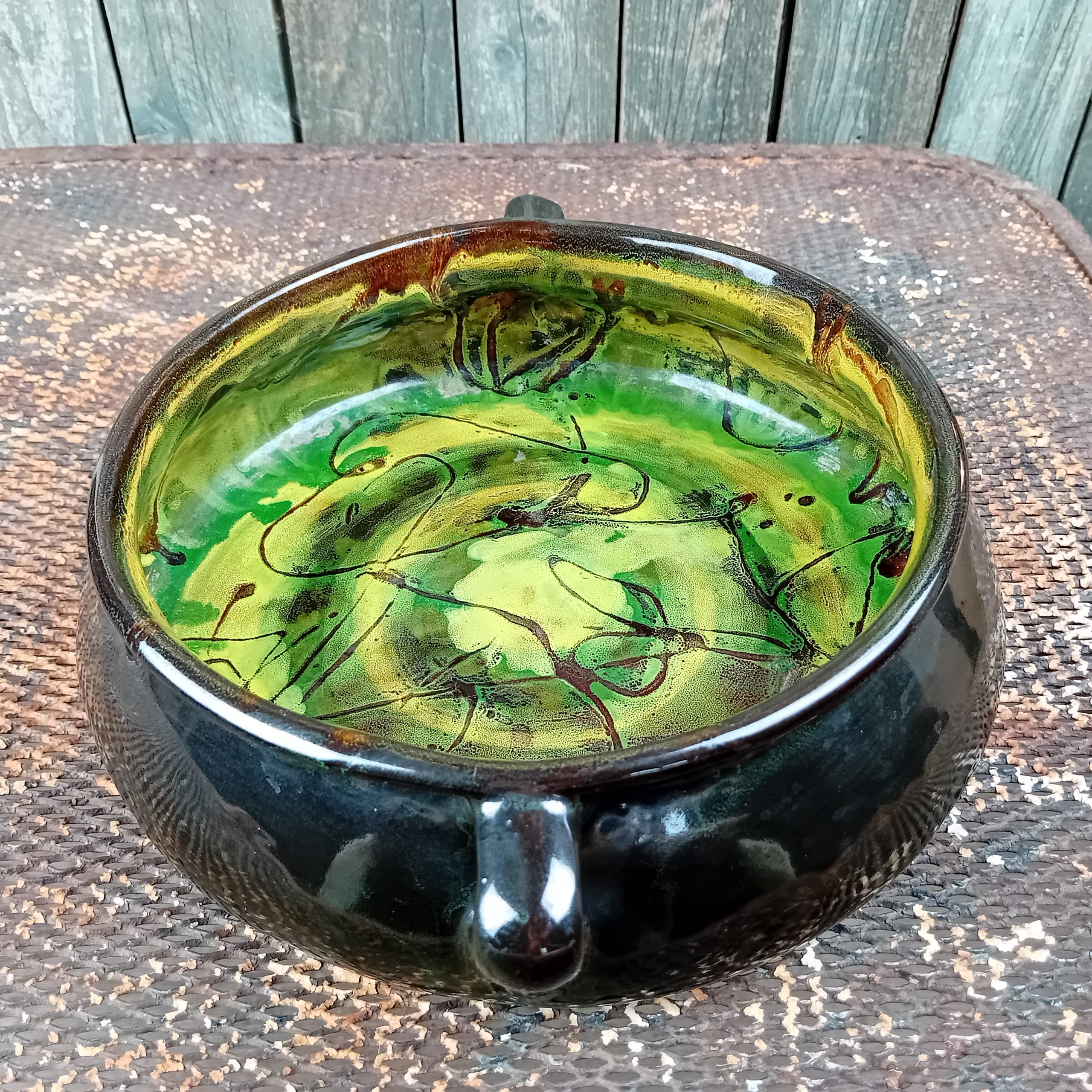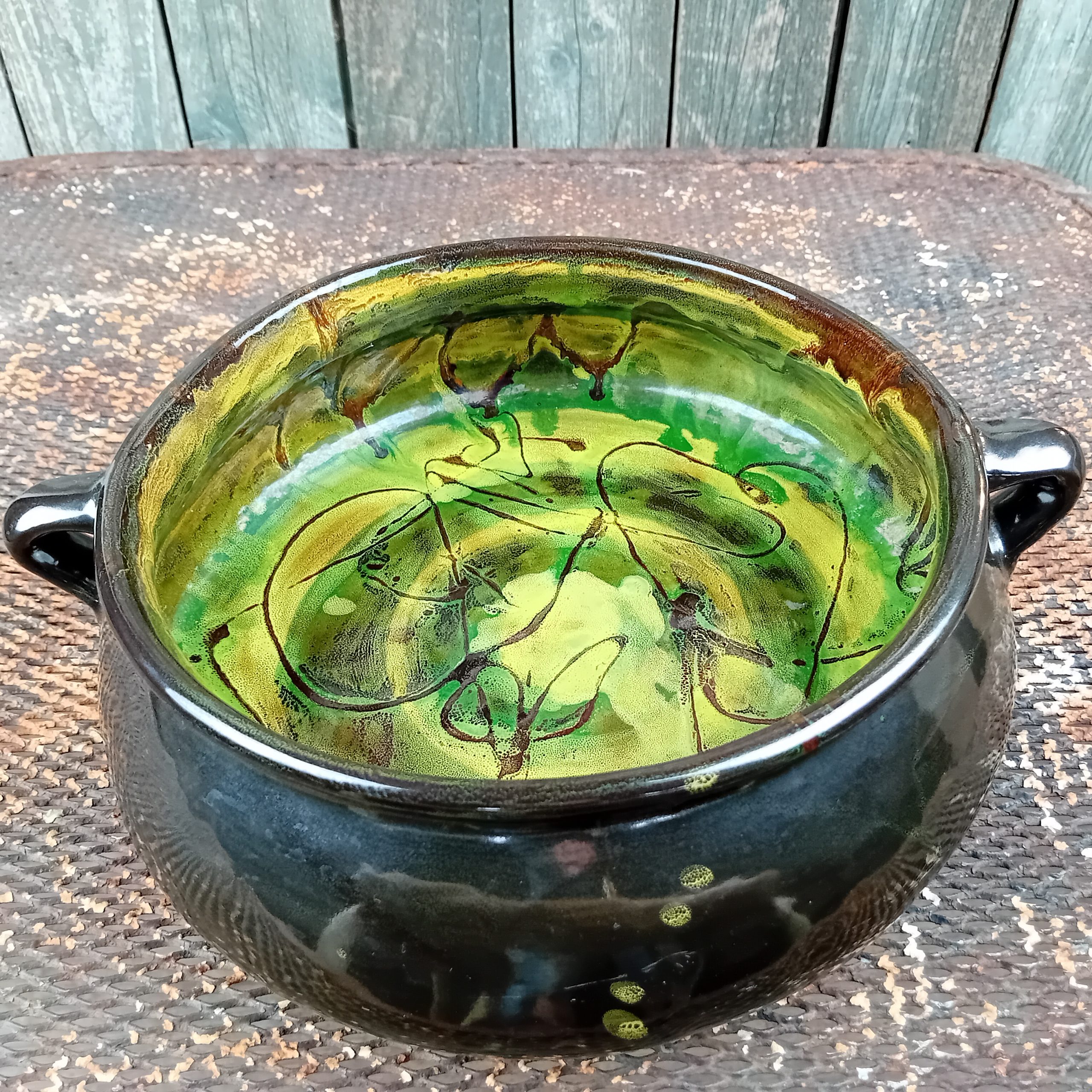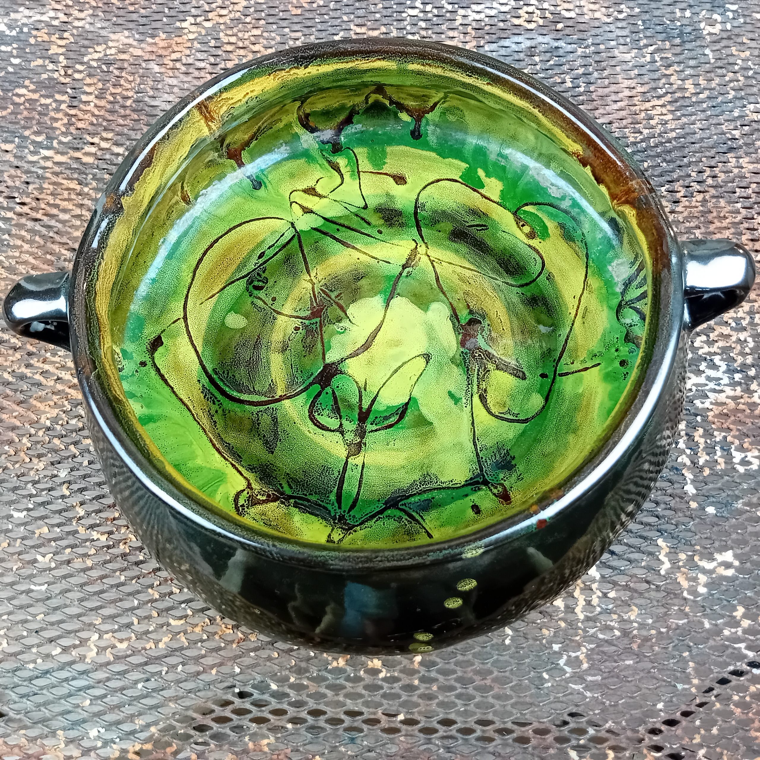 Belle forme et superbes couleurs vertes et jaunes à l’intérieur. Motif floral stylisé.