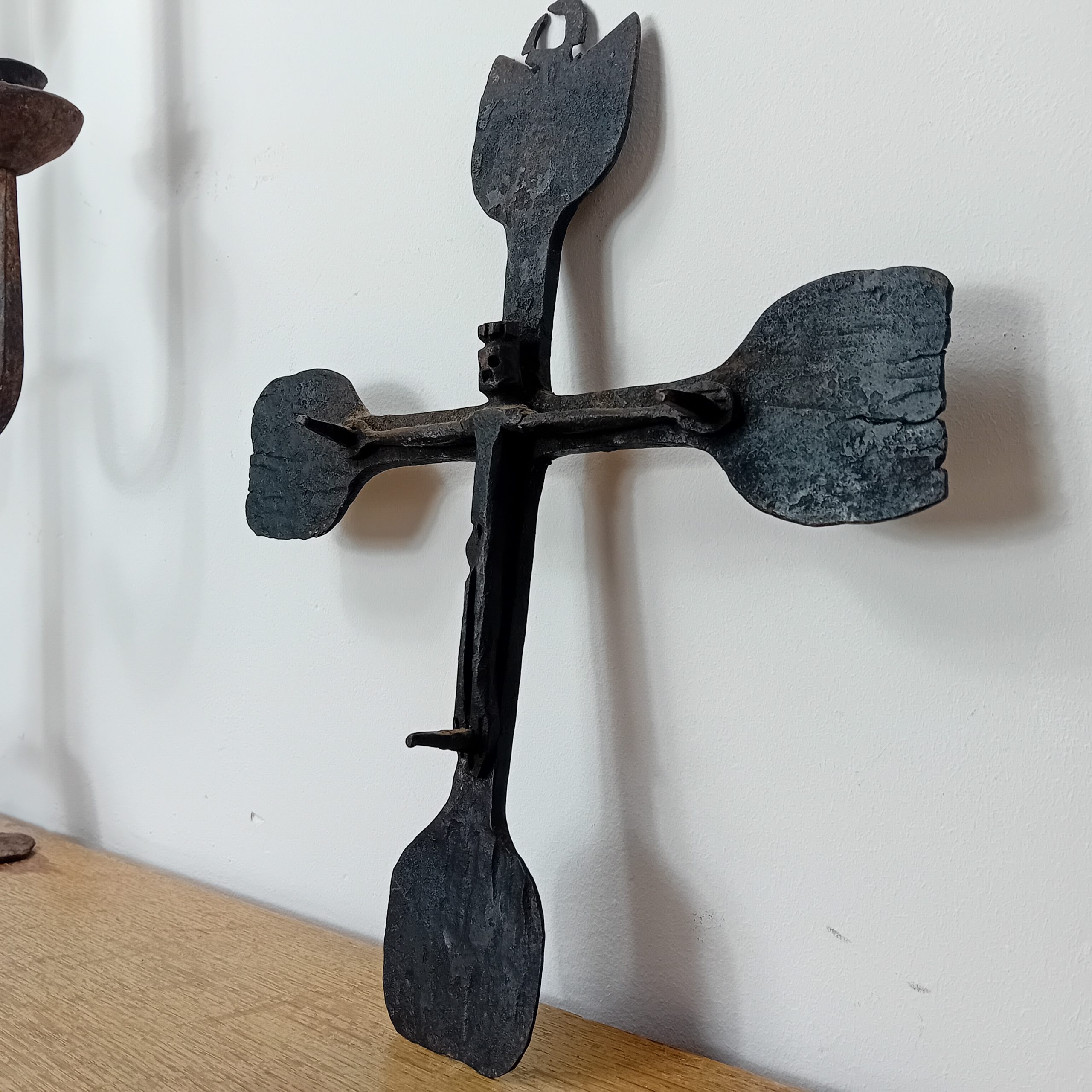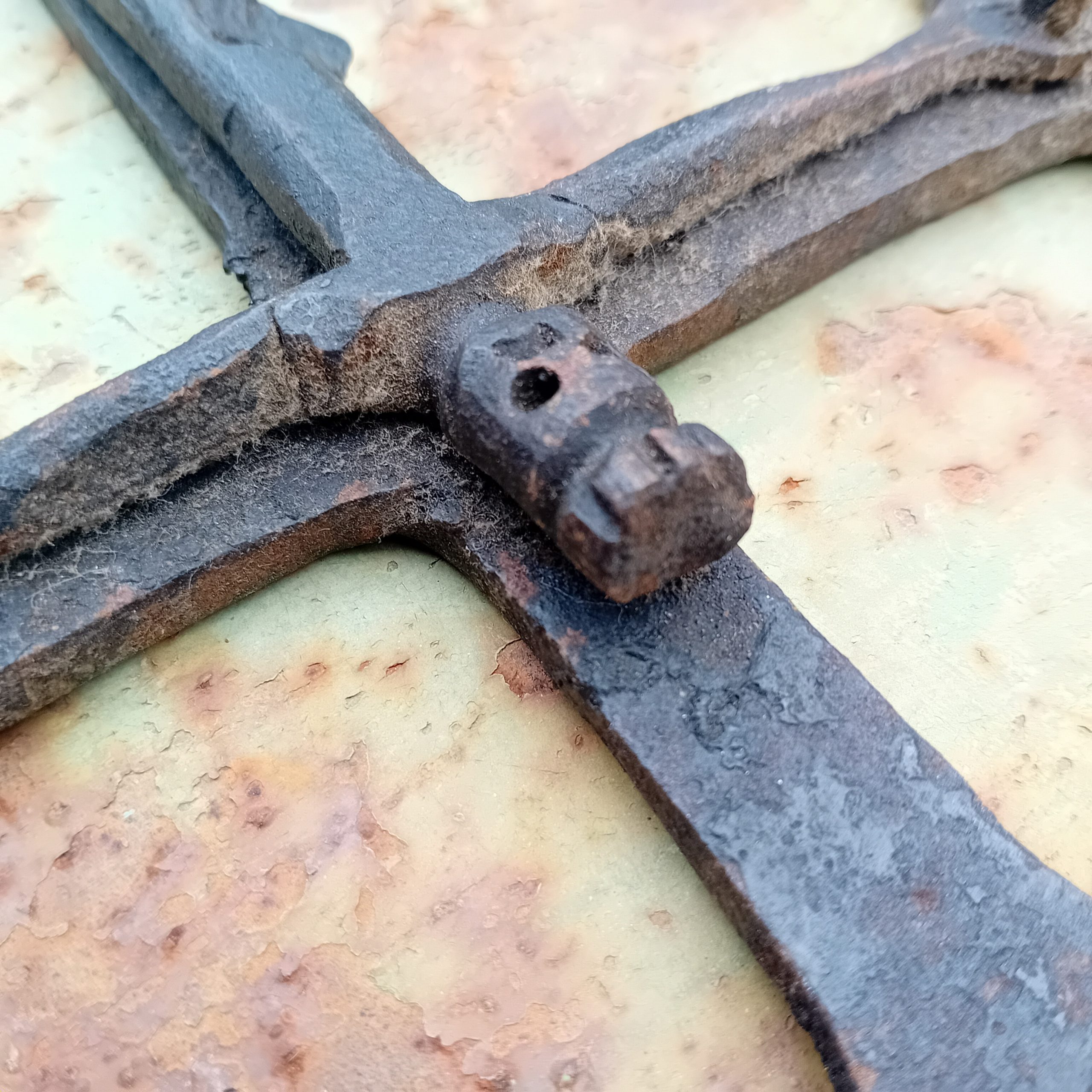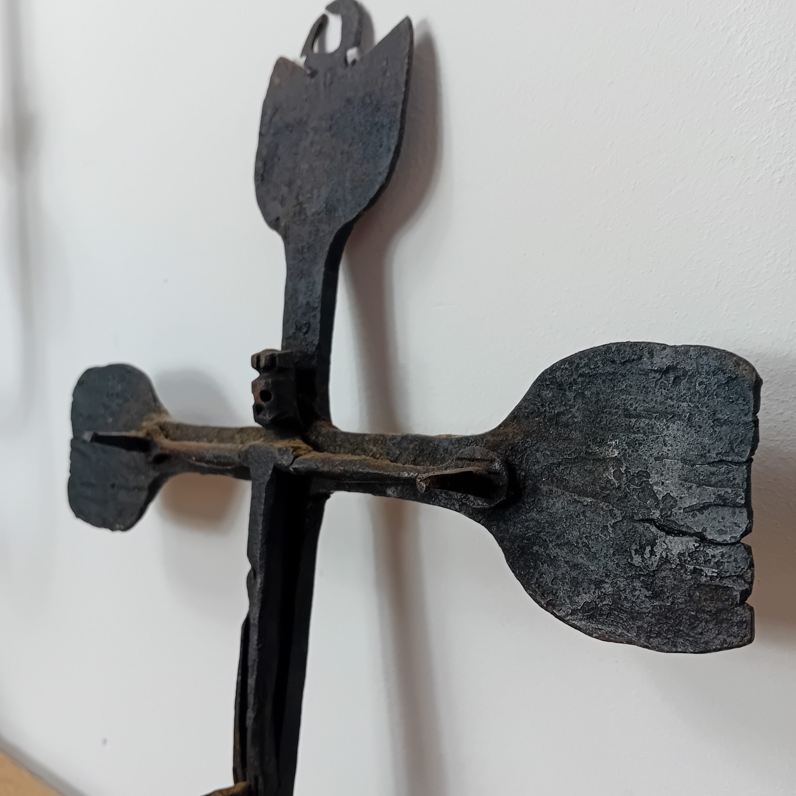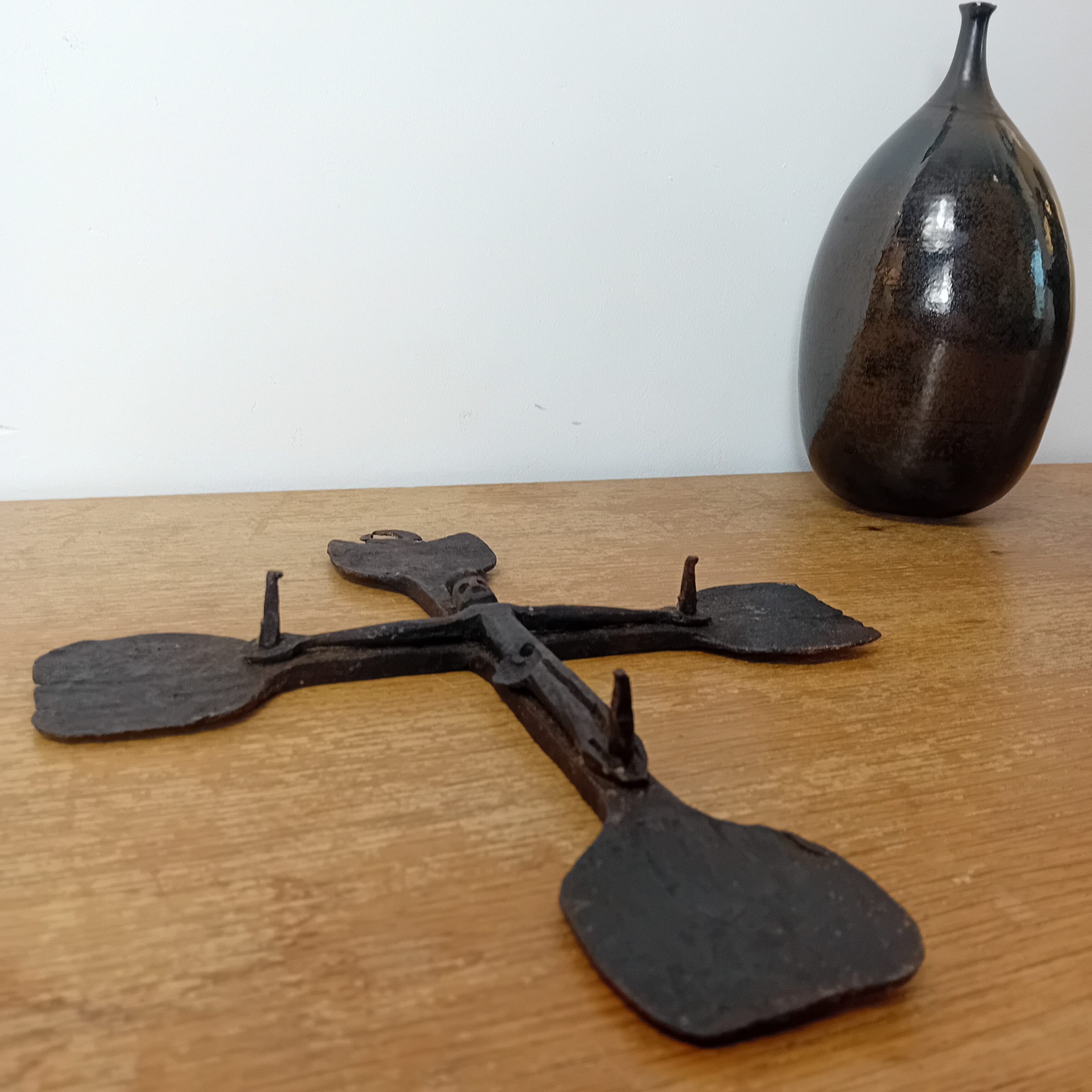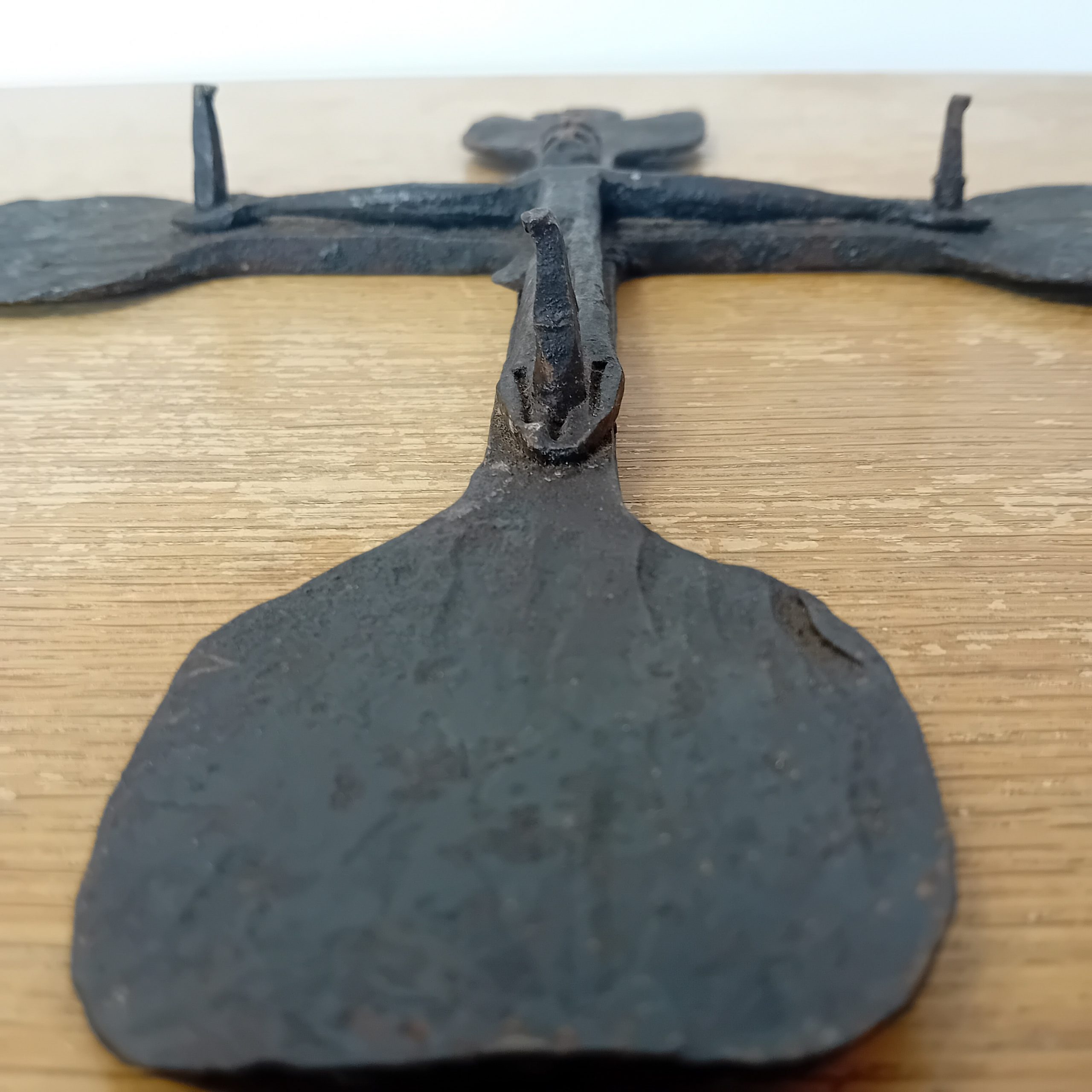 Un beau crucifix en fer forgé, martelé et travaillé dans l’esprit de Jean Touret et des Ateliers de Marolles.