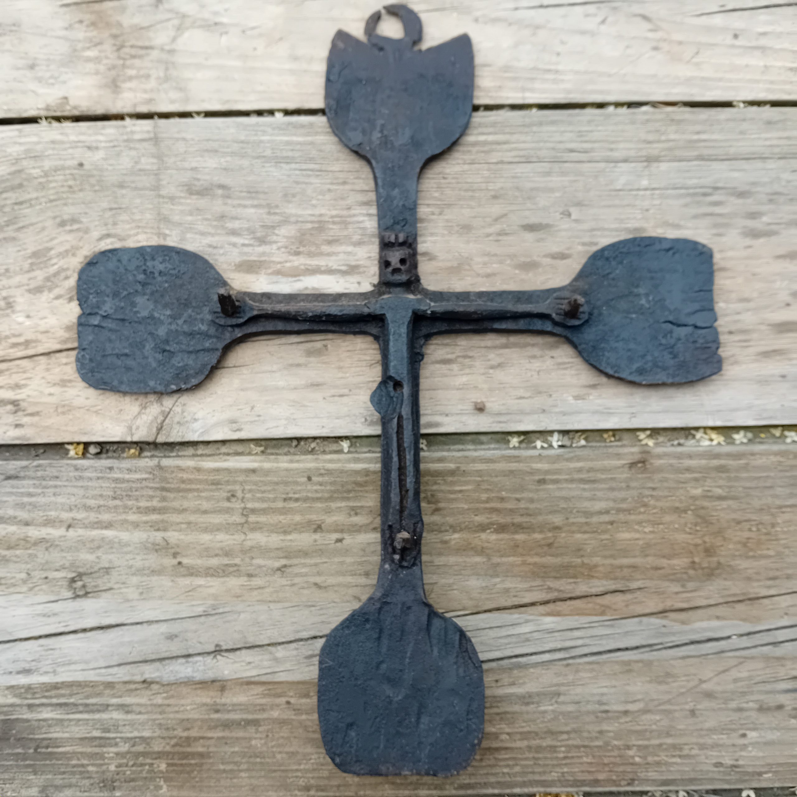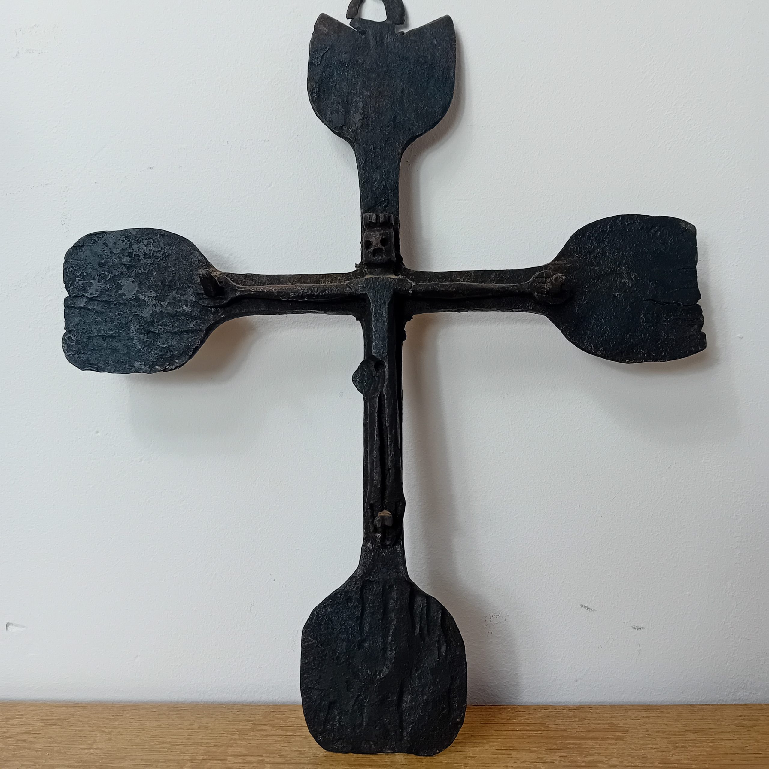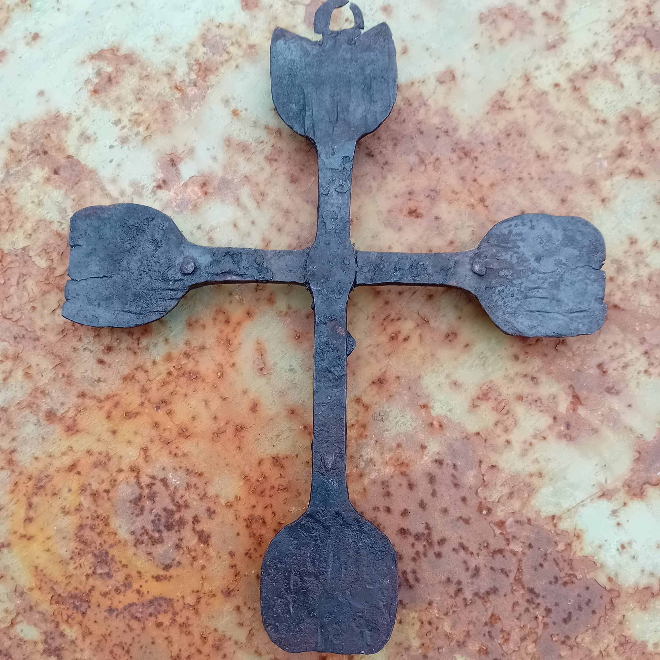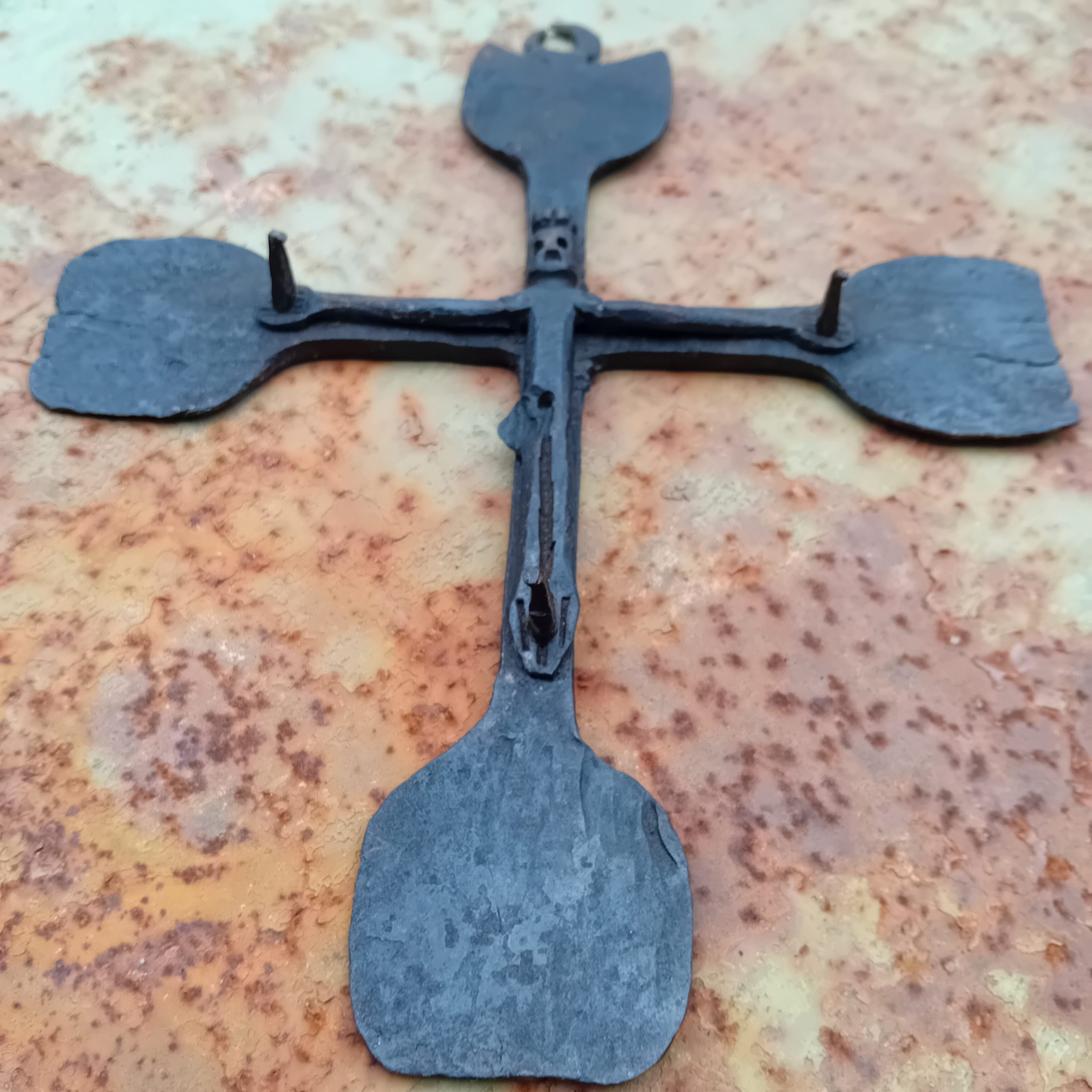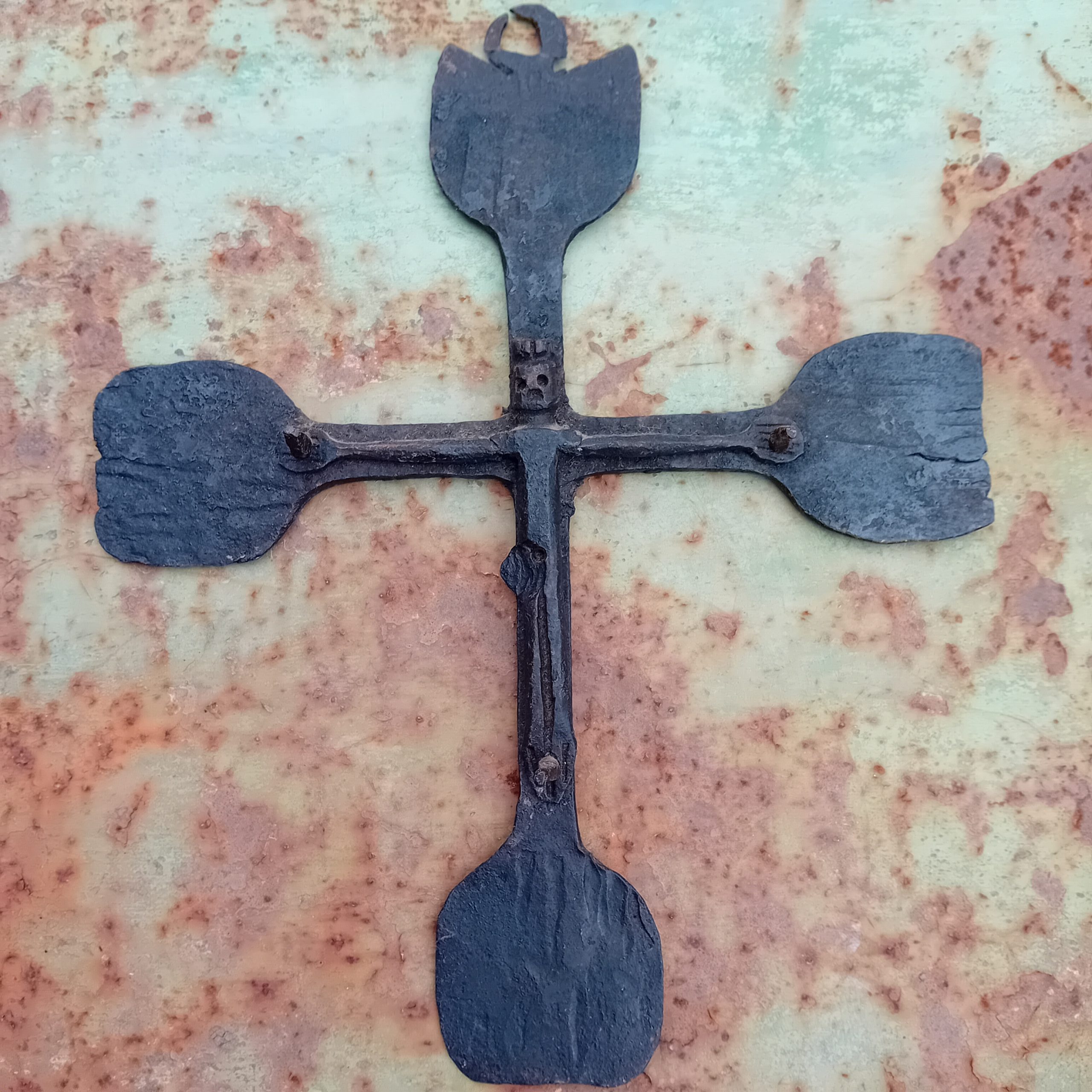 Un beau crucifix en fer forgé, martelé et travaillé dans l’esprit de Jean Touret et des Ateliers de Marolles.