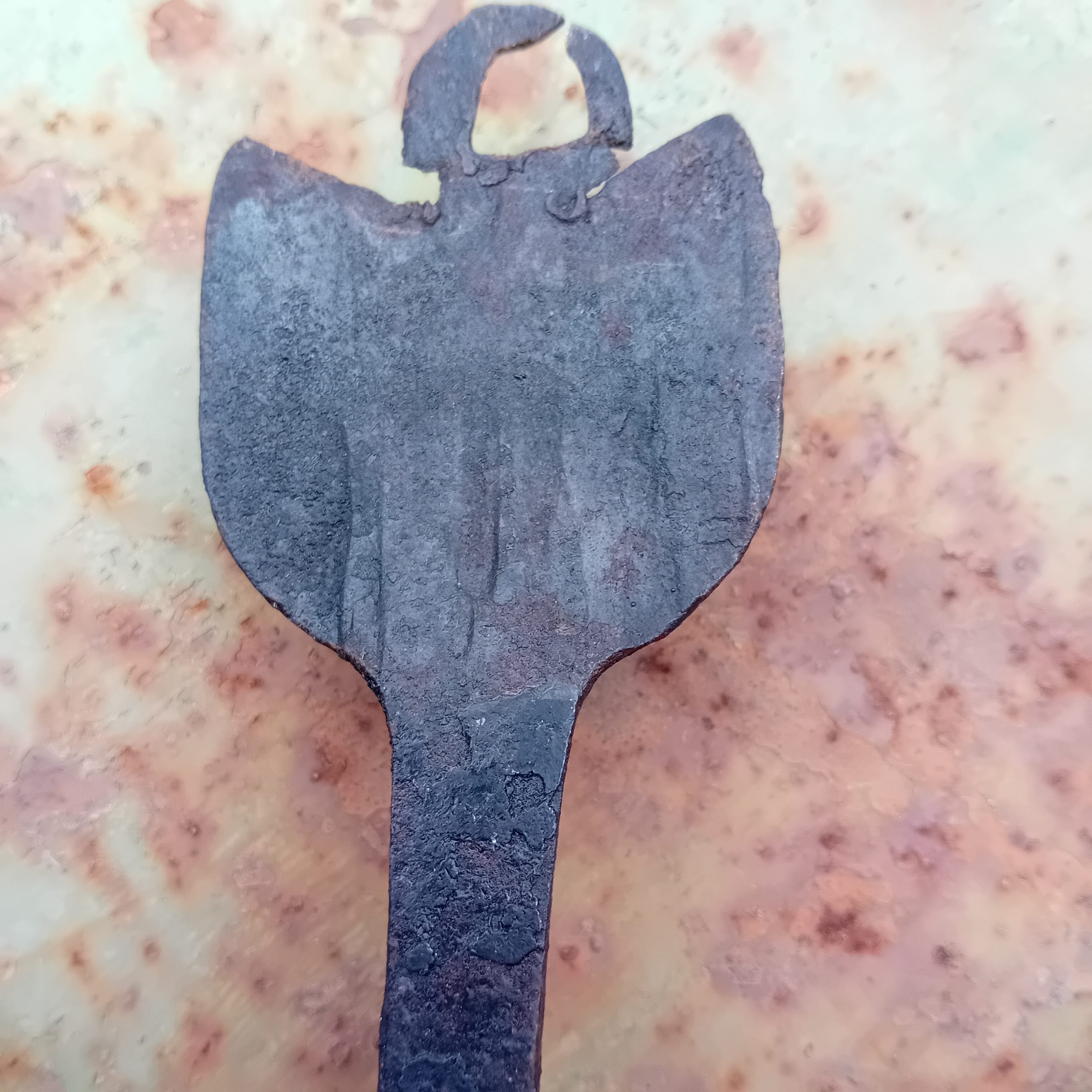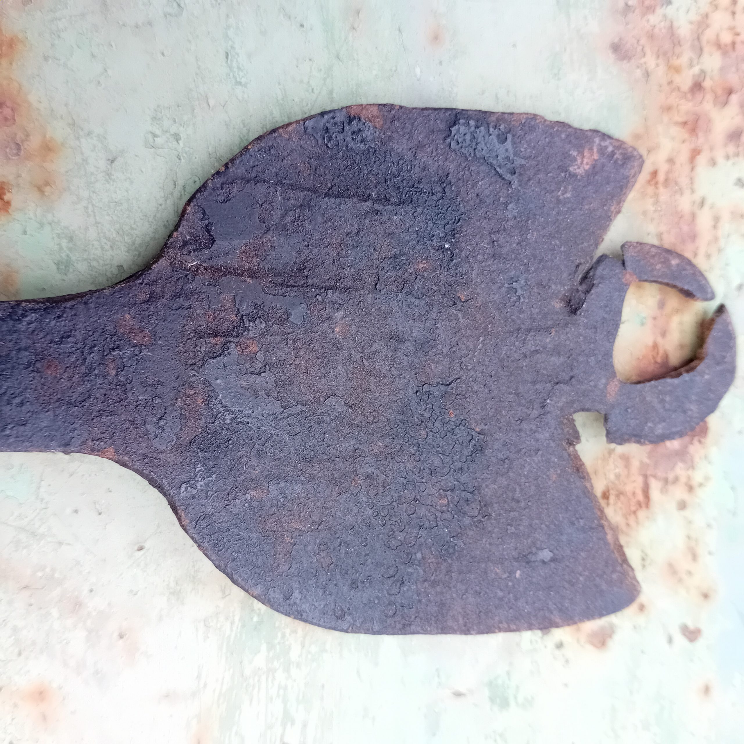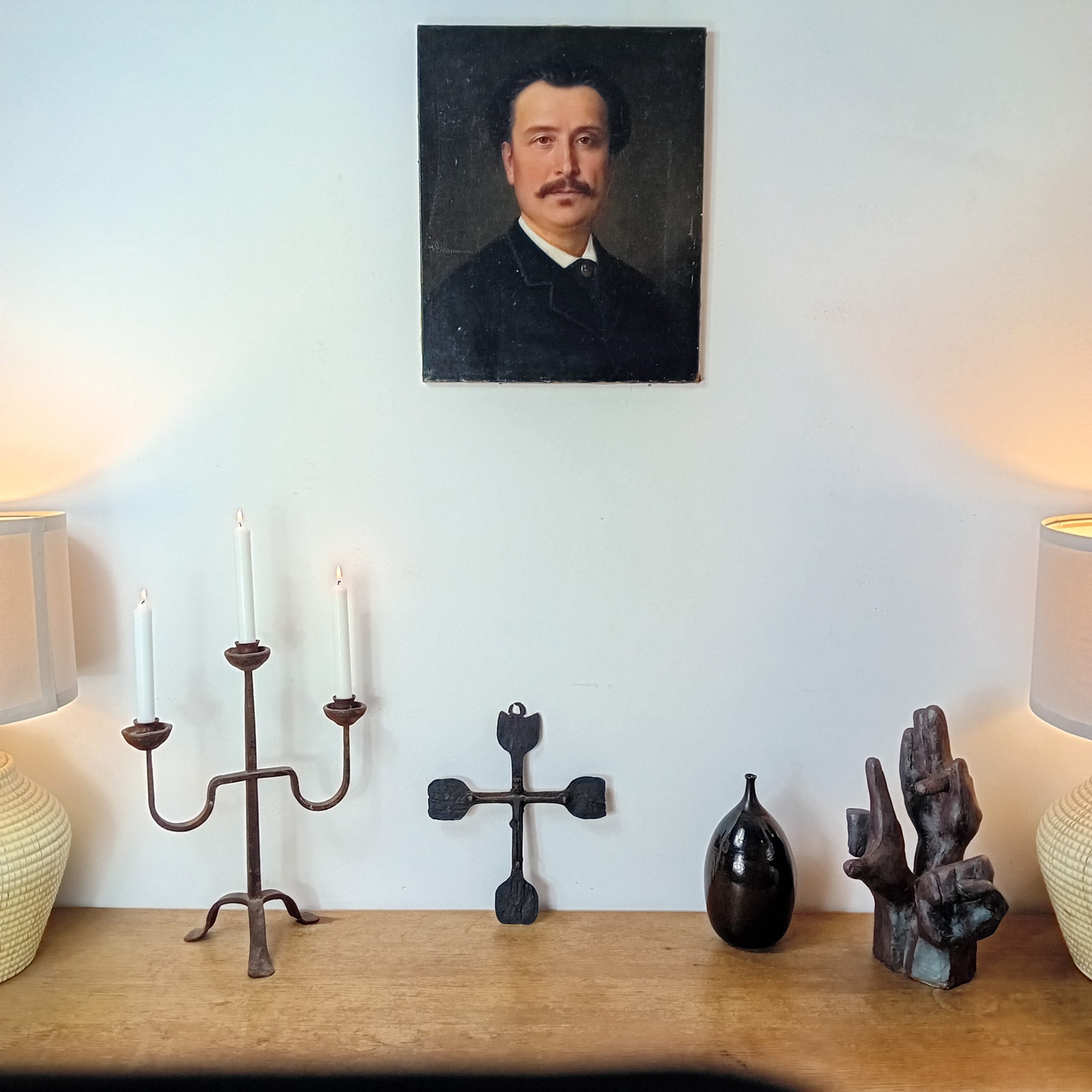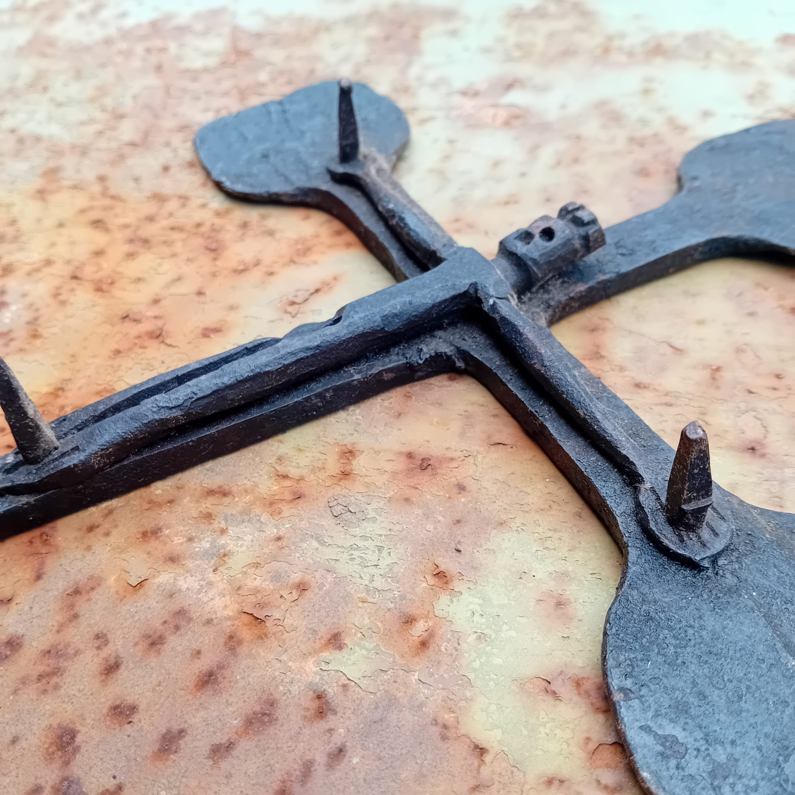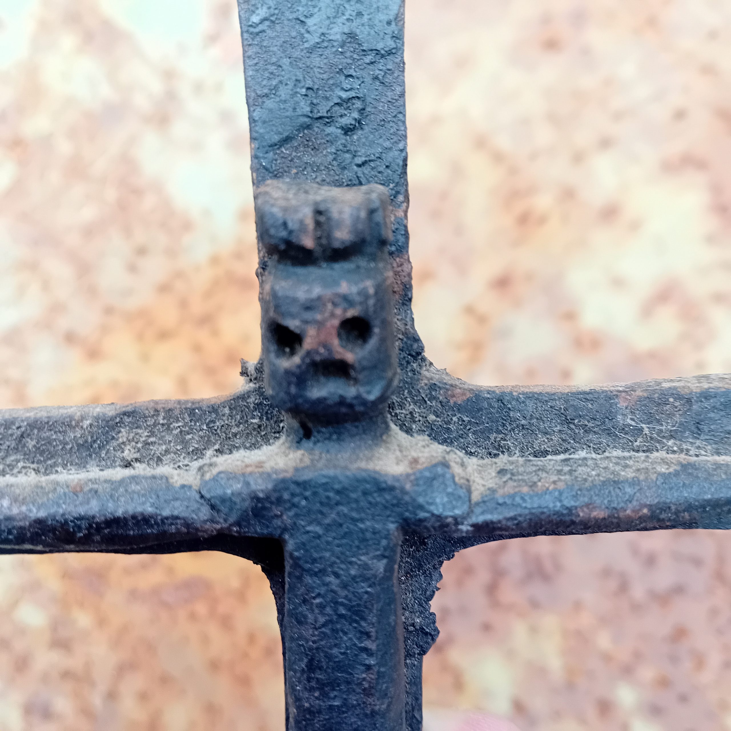 Un beau crucifix en fer forgé, martelé et travaillé dans l’esprit de Jean Touret et des Ateliers de Marolles.