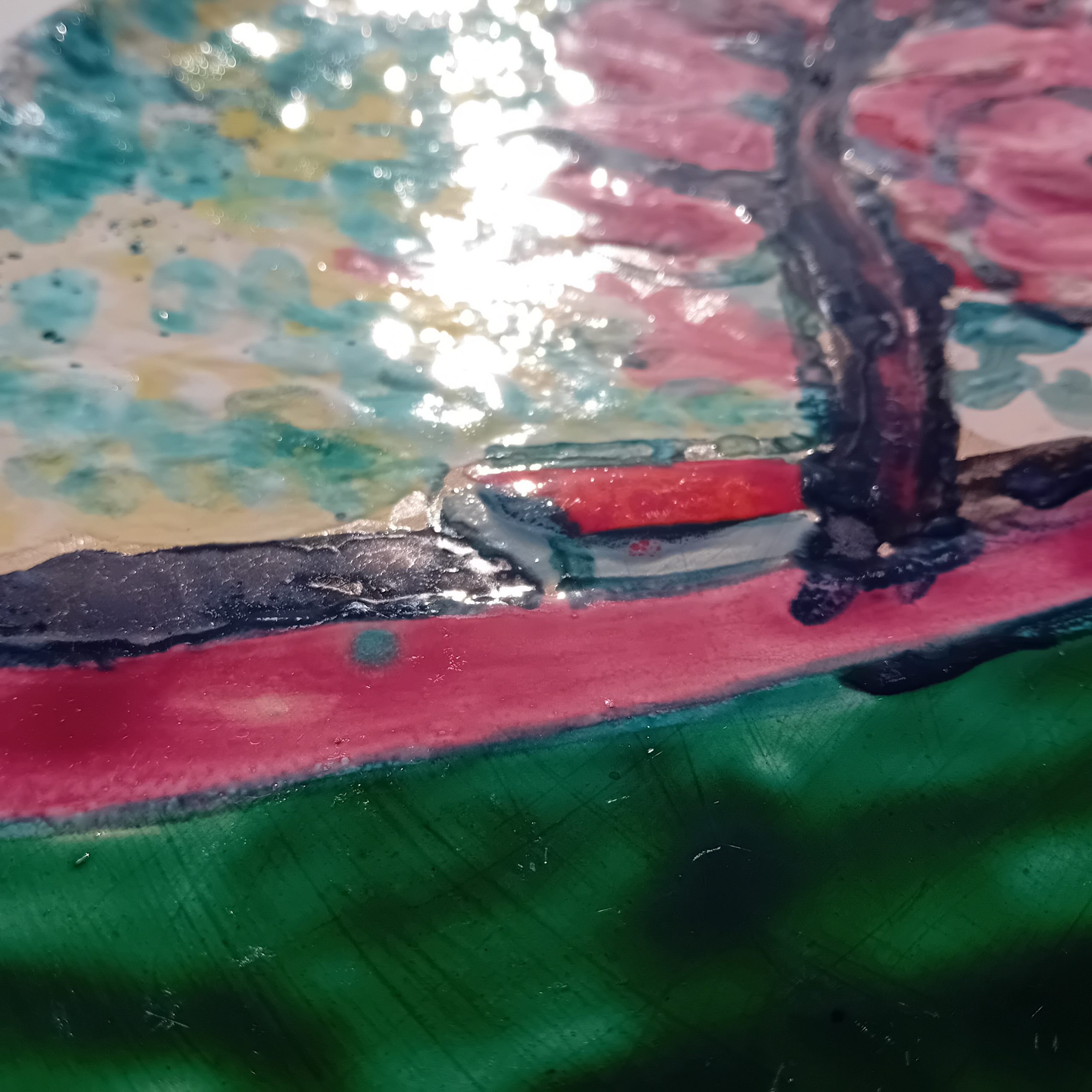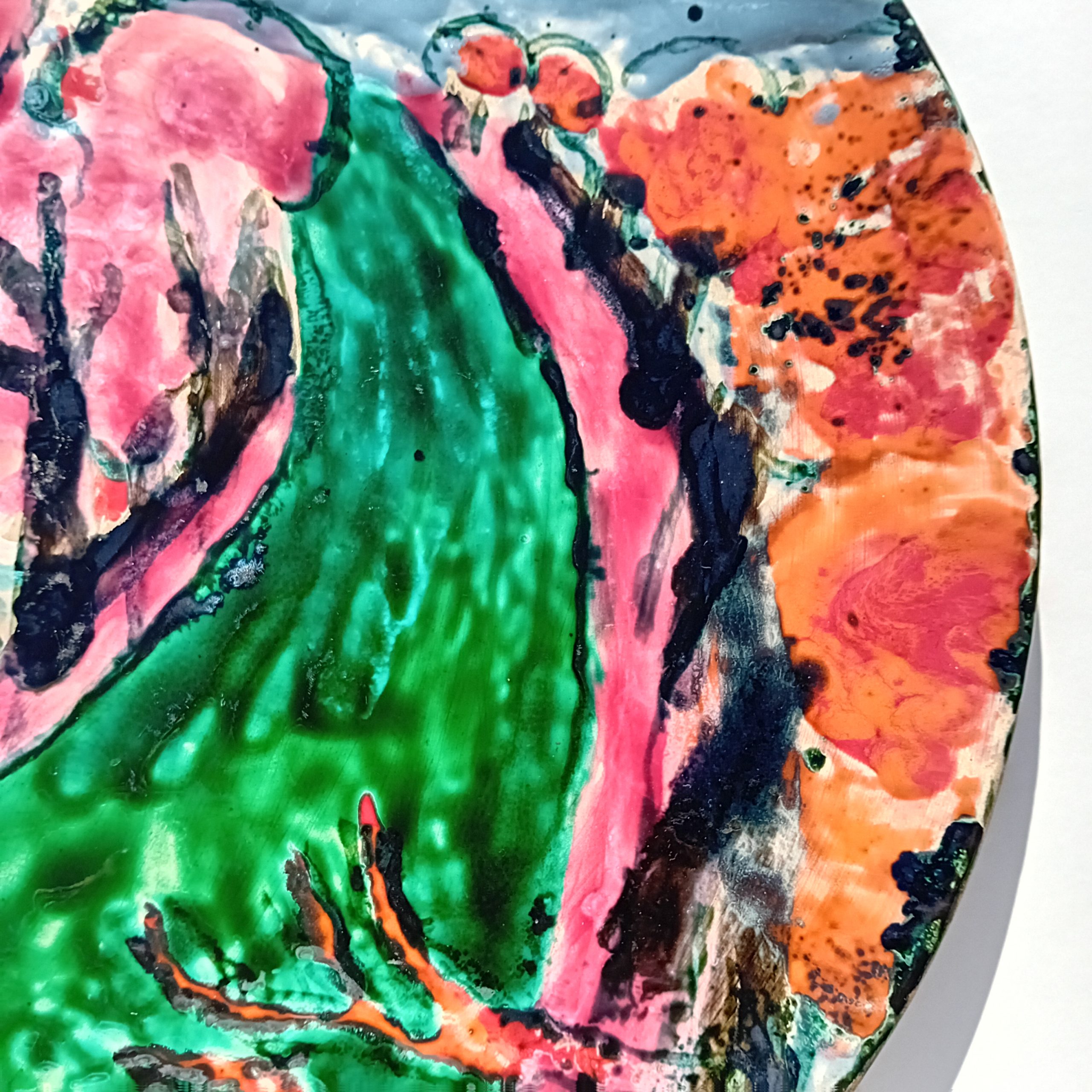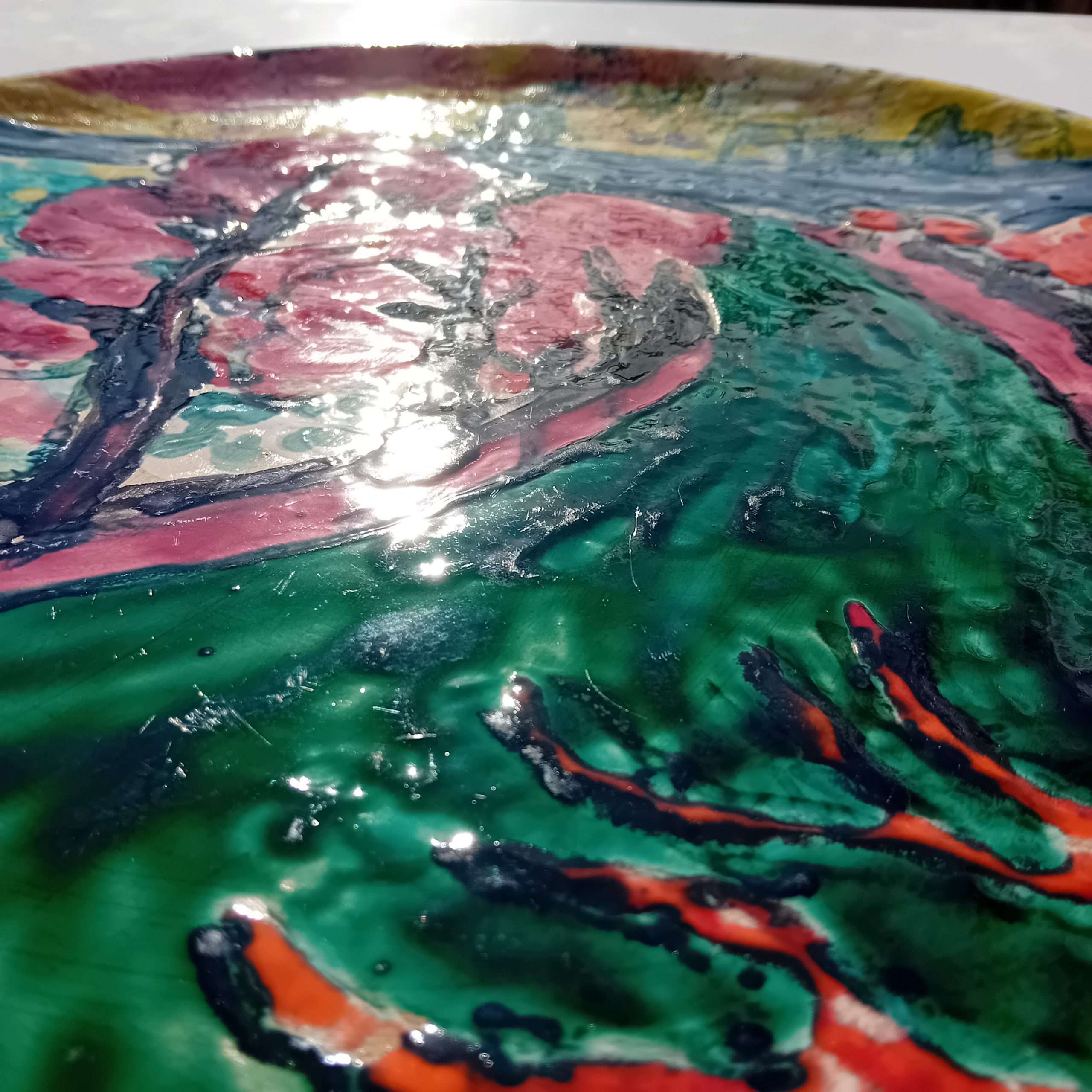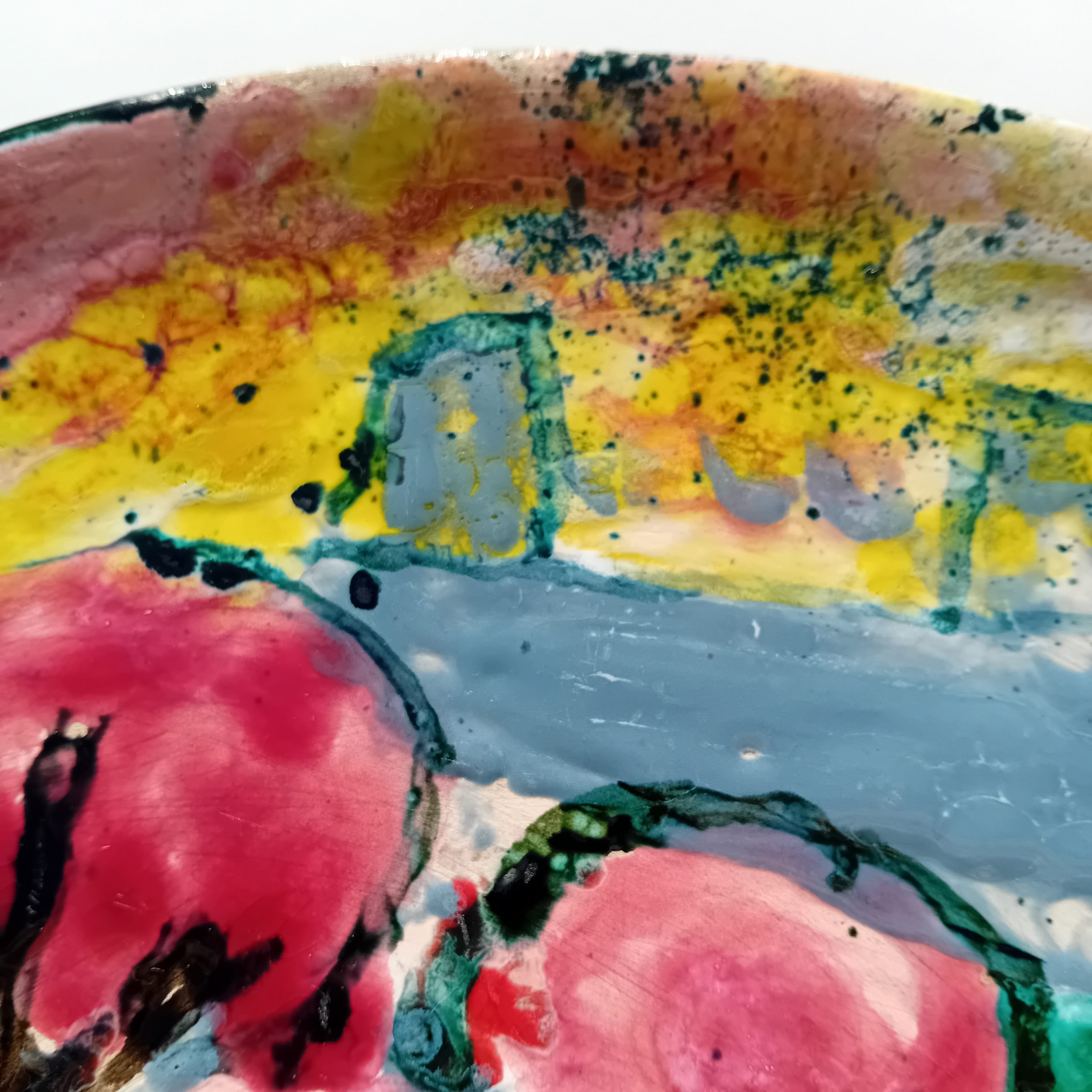 Ce plat illustre parfaitement la transposition des codes picturaux sur un support céramique. L’émail joue ici le rôle de la matière picturale, avec des effets de transparence, d’épaisseur et de fusion des couleurs.