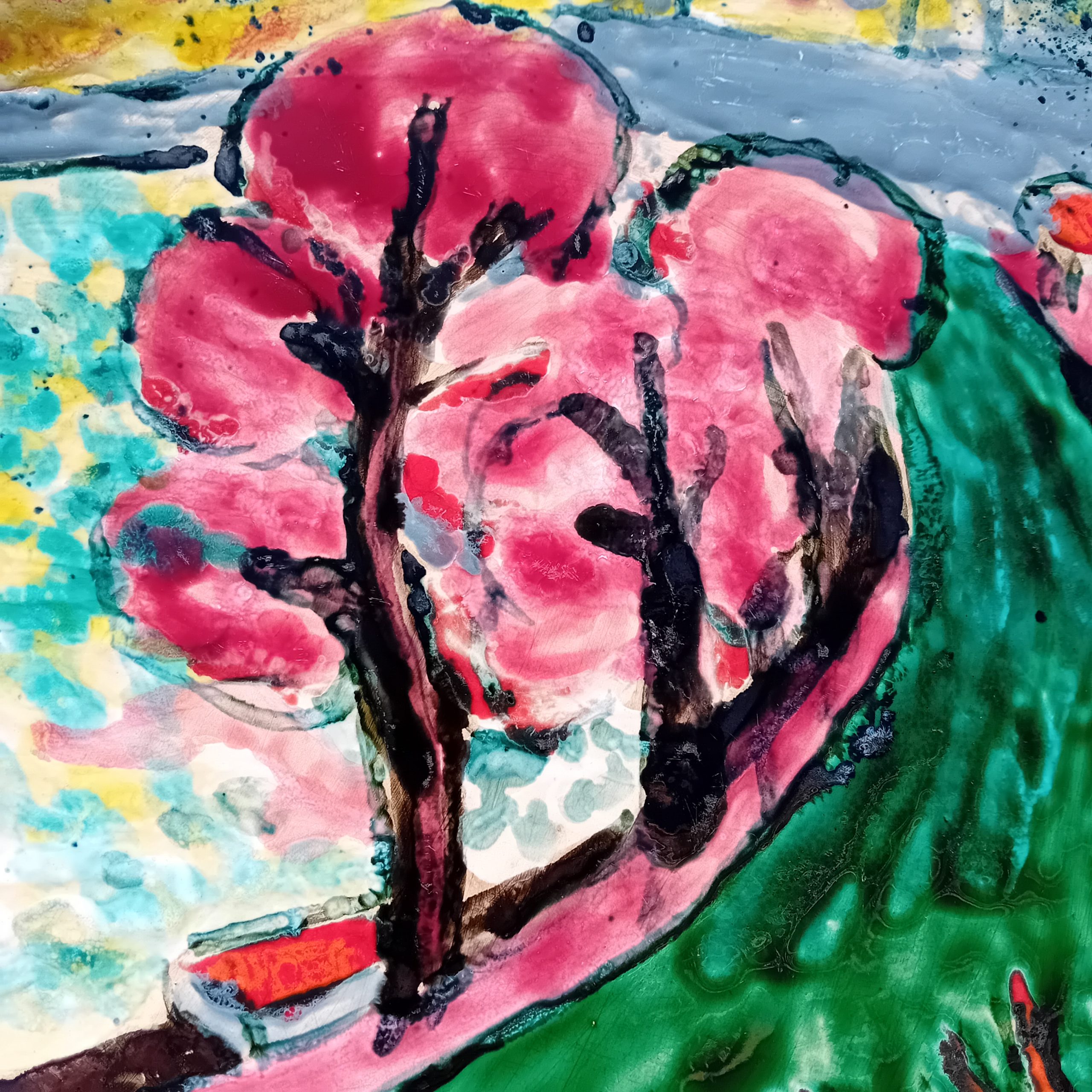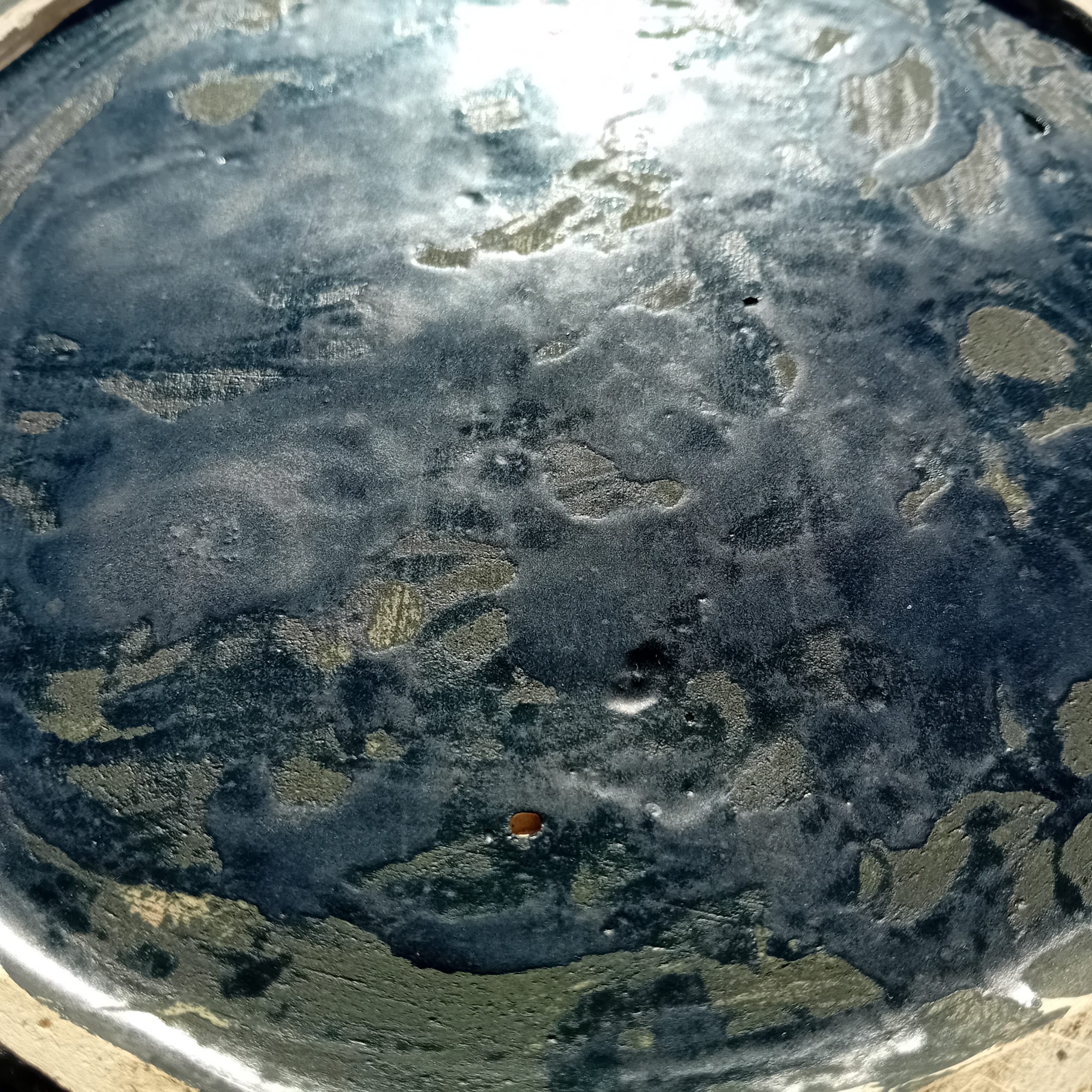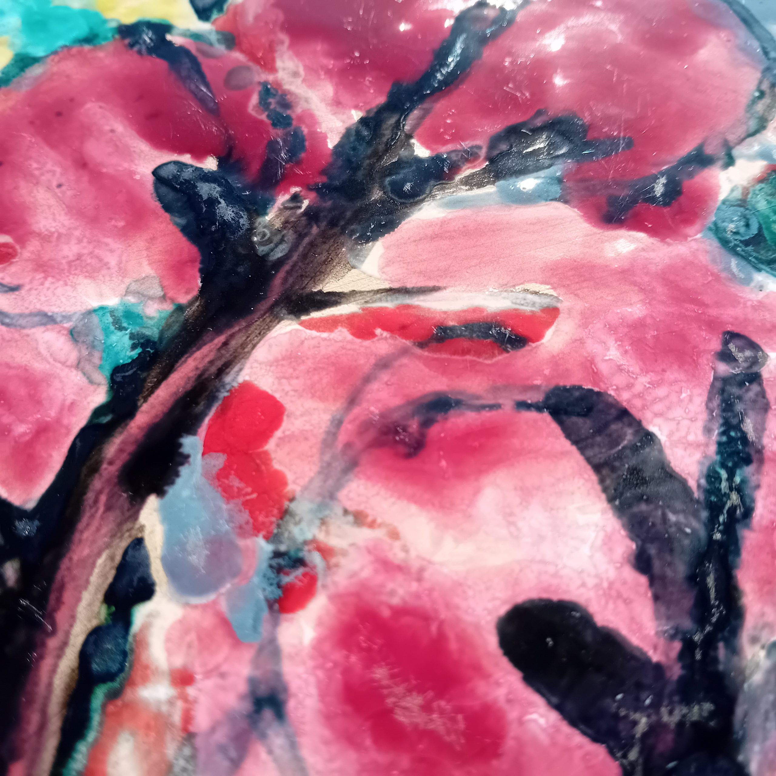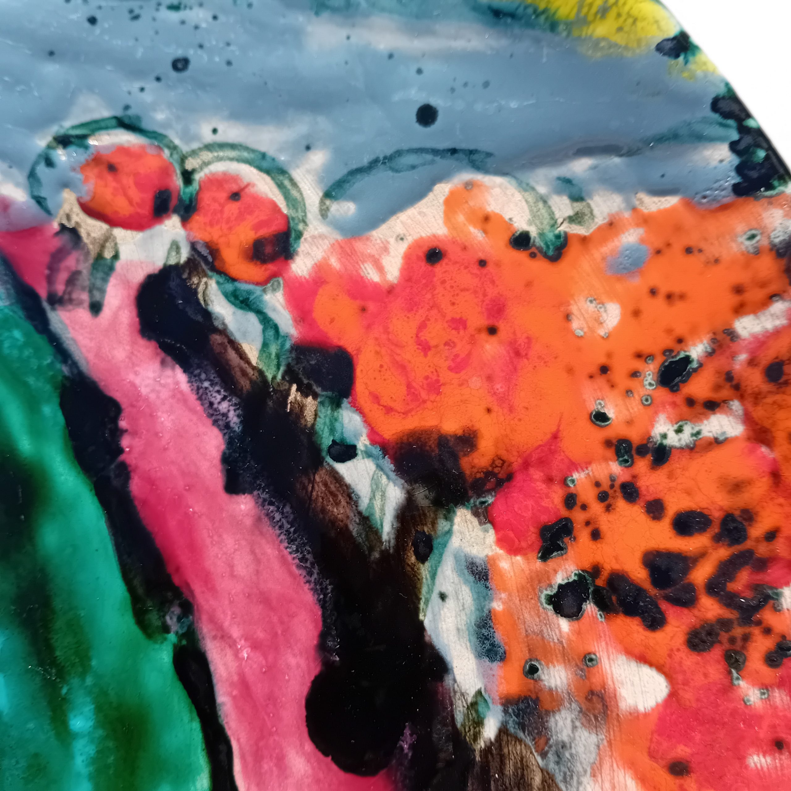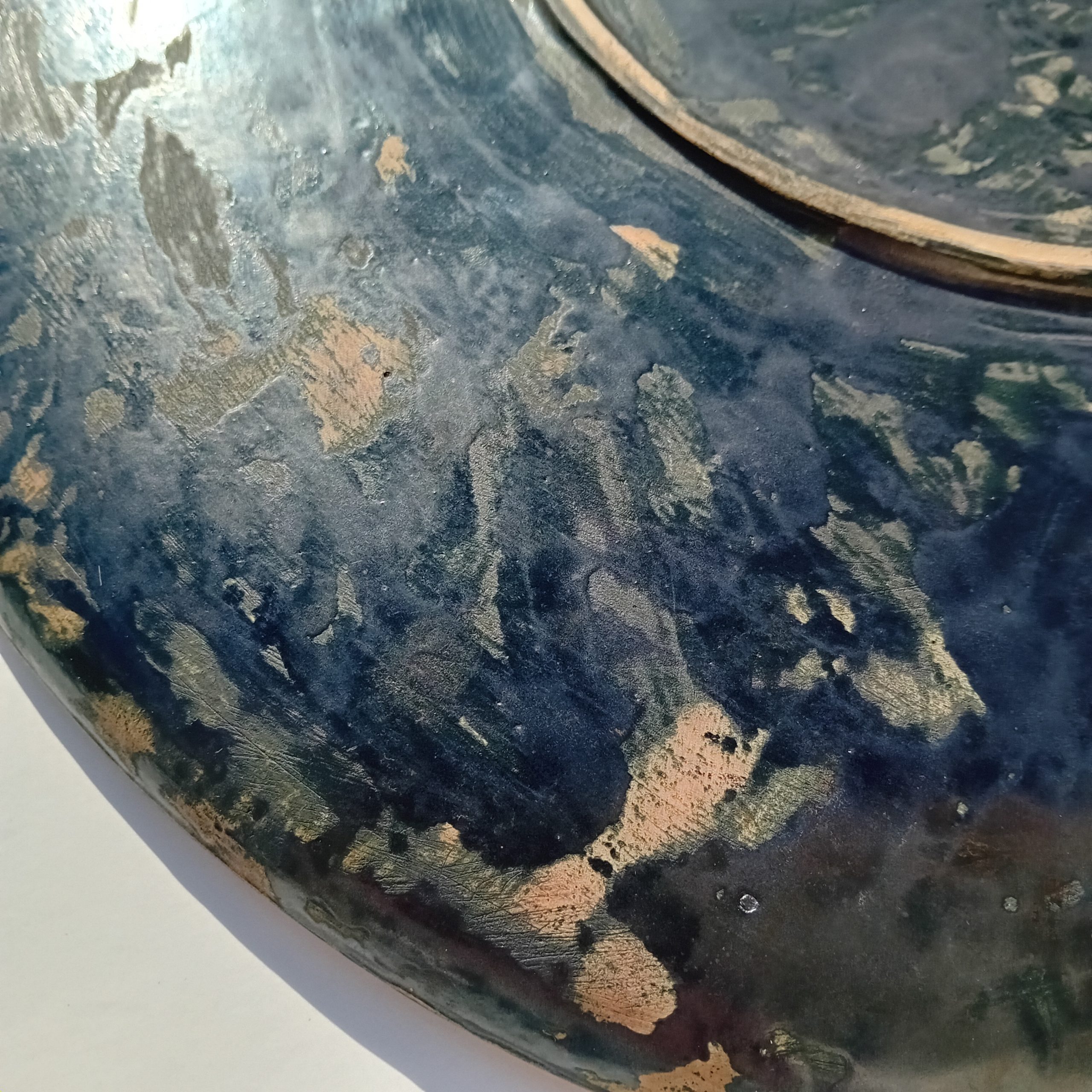 Ce plat illustre parfaitement la transposition des codes picturaux sur un support céramique. L’émail joue ici le rôle de la matière picturale, avec des effets de transparence, d’épaisseur et de fusion des couleurs.