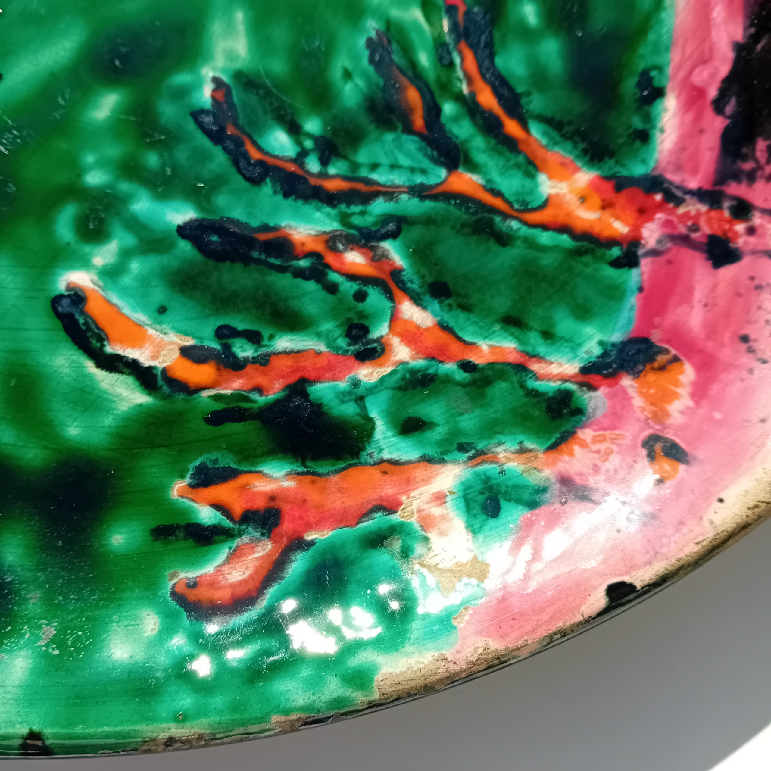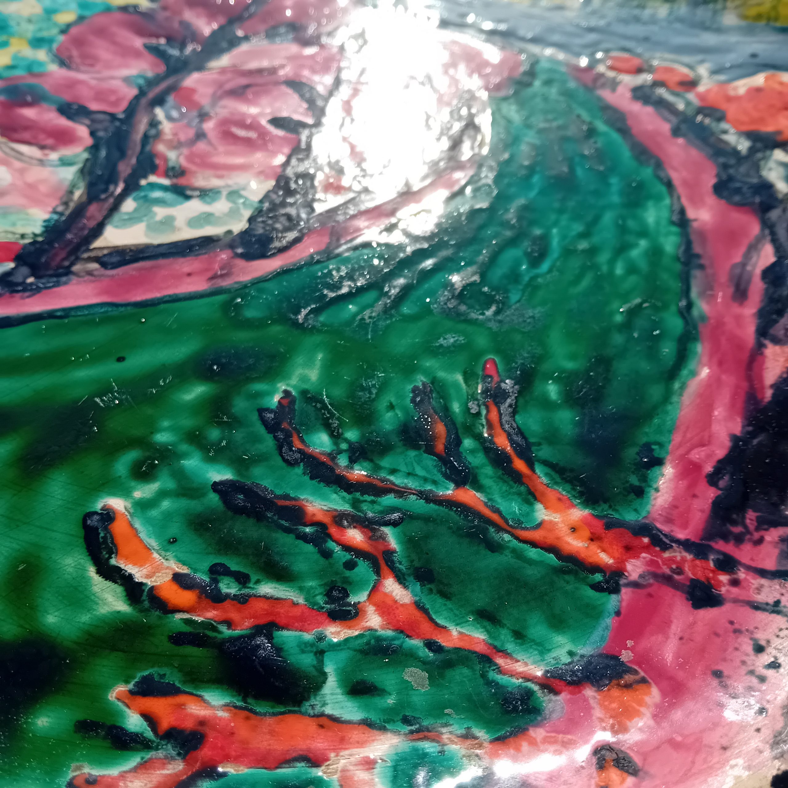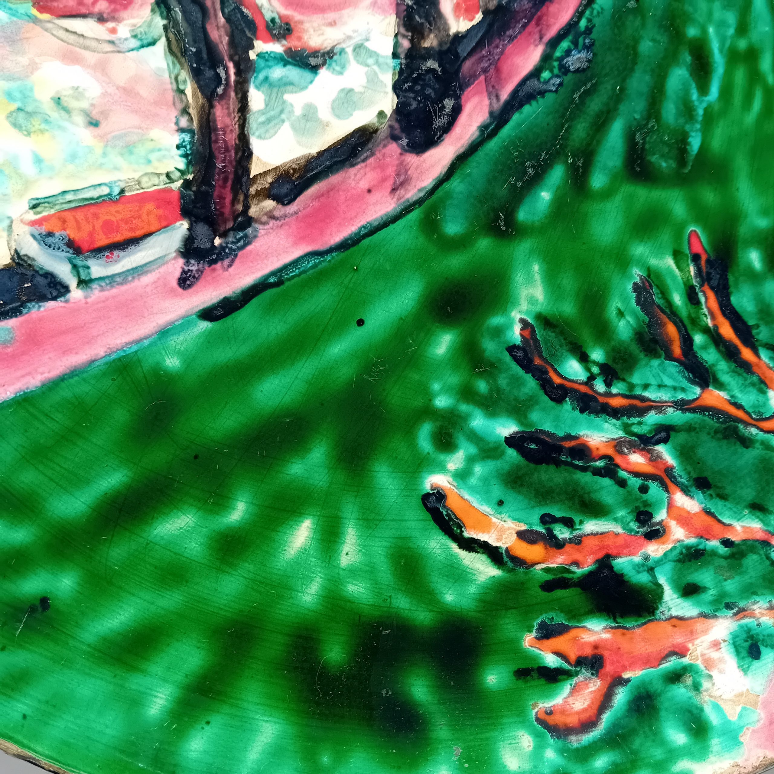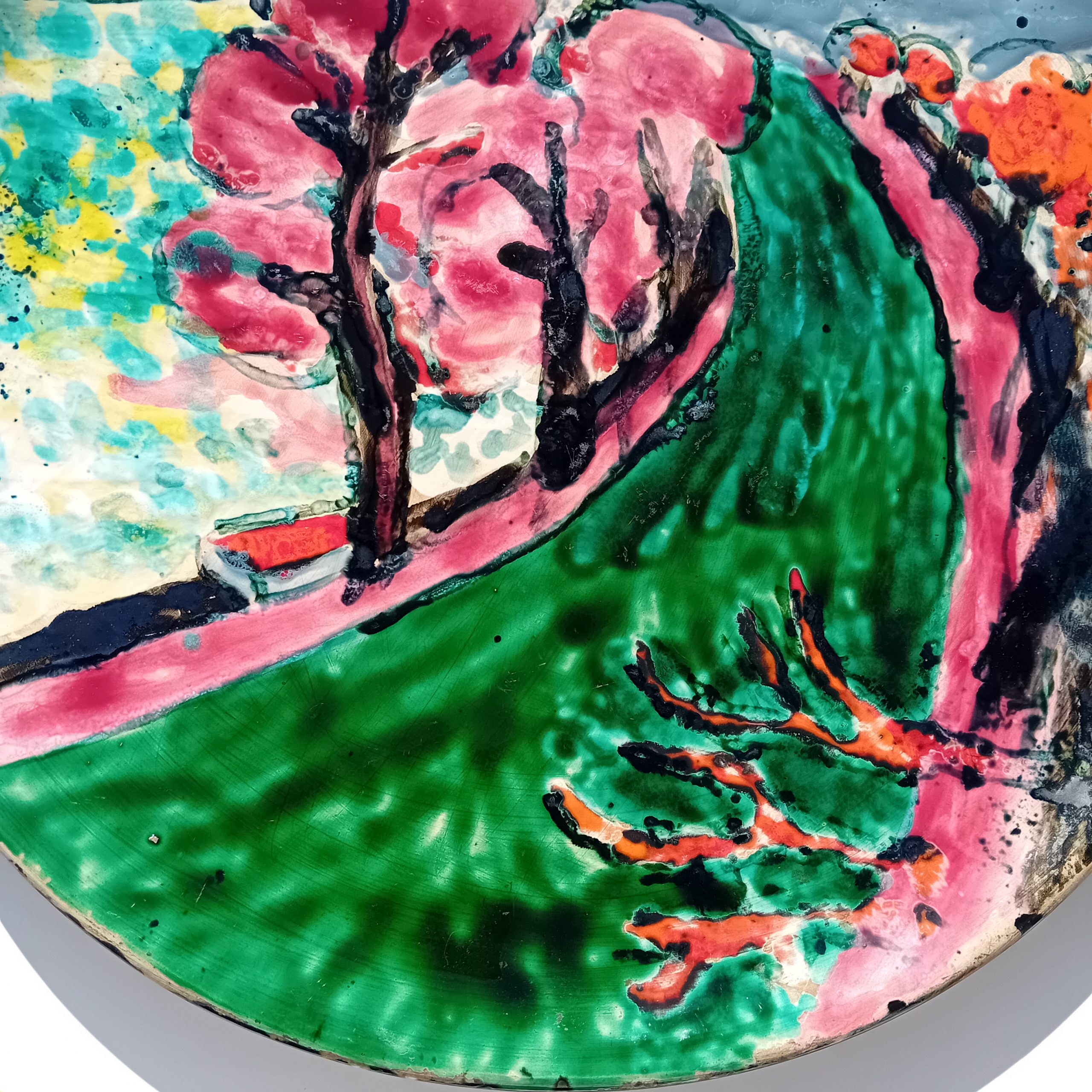 Grand plat en céramique d’inspiration fauve, décor paysage, années 1950–60