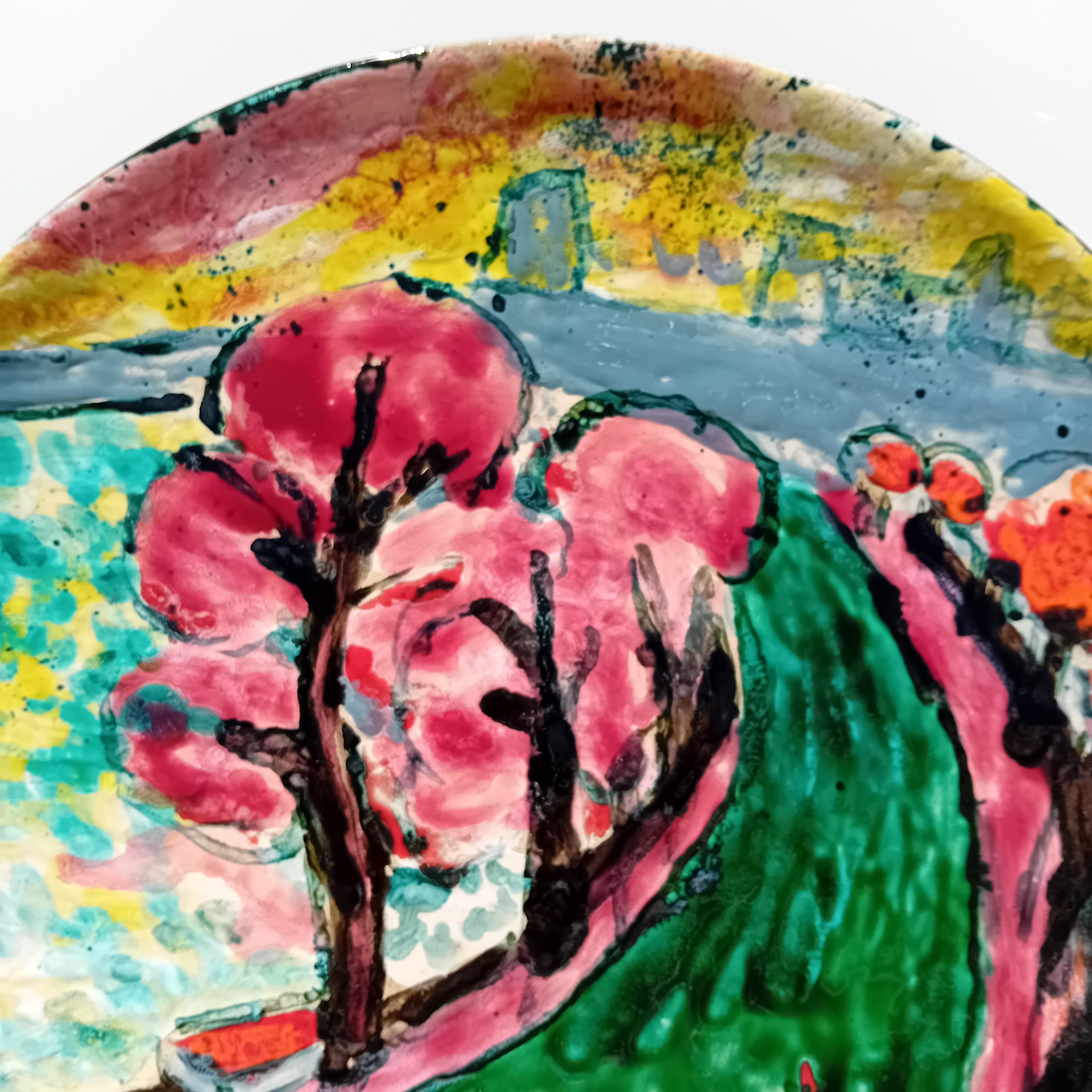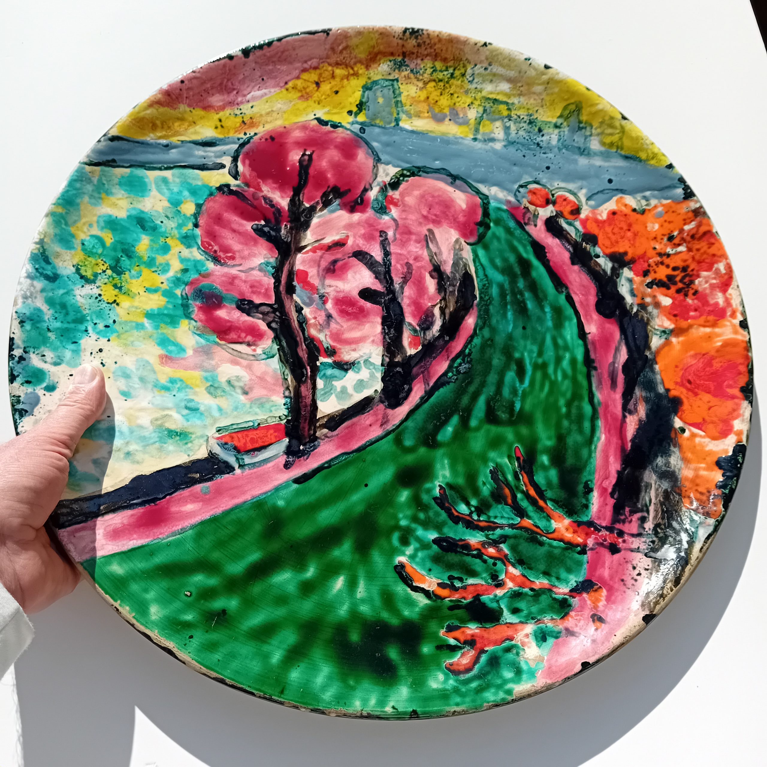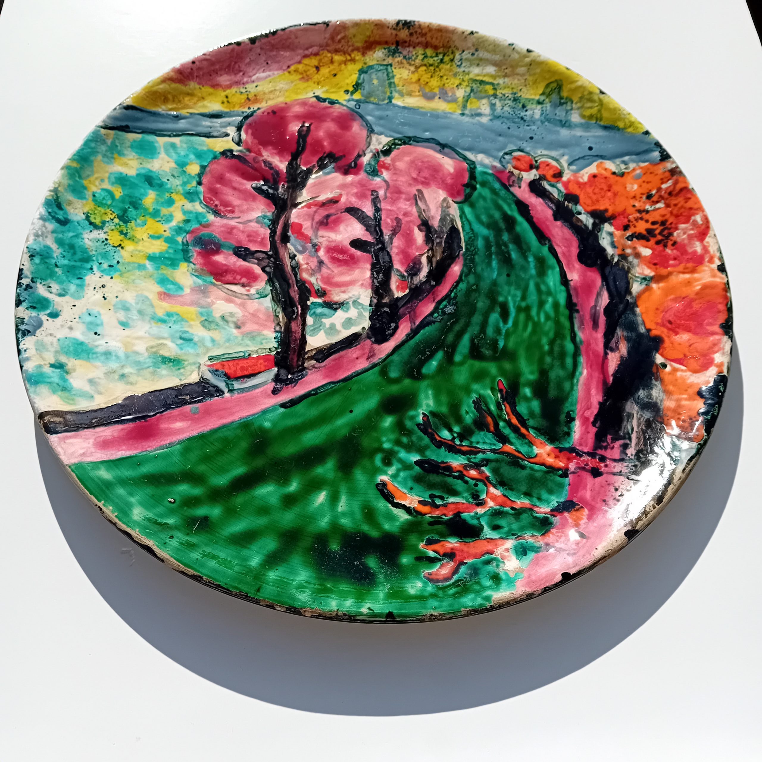 Ce grand plat céramique fauve de 43,8 cm de diamètre s’inscrit dans la tradition des productions décoratives inspirées de la peinture moderne du XXᵉ siècle. Par son style pictural et sa liberté chromatique, il évoque directement les recherches des peintres fauves, notamment André Derain dans sa période londonienne autour du pont de Charing Cross.