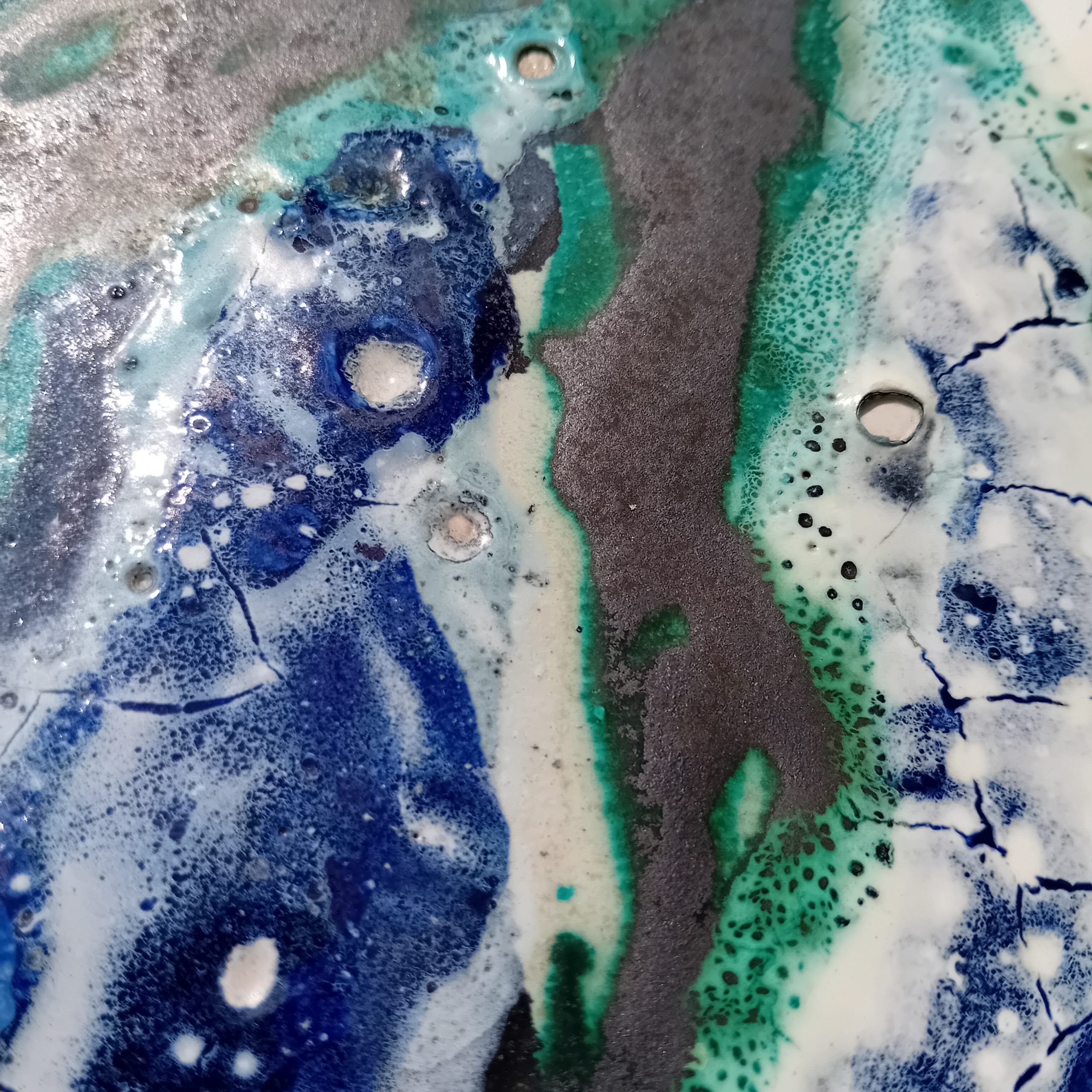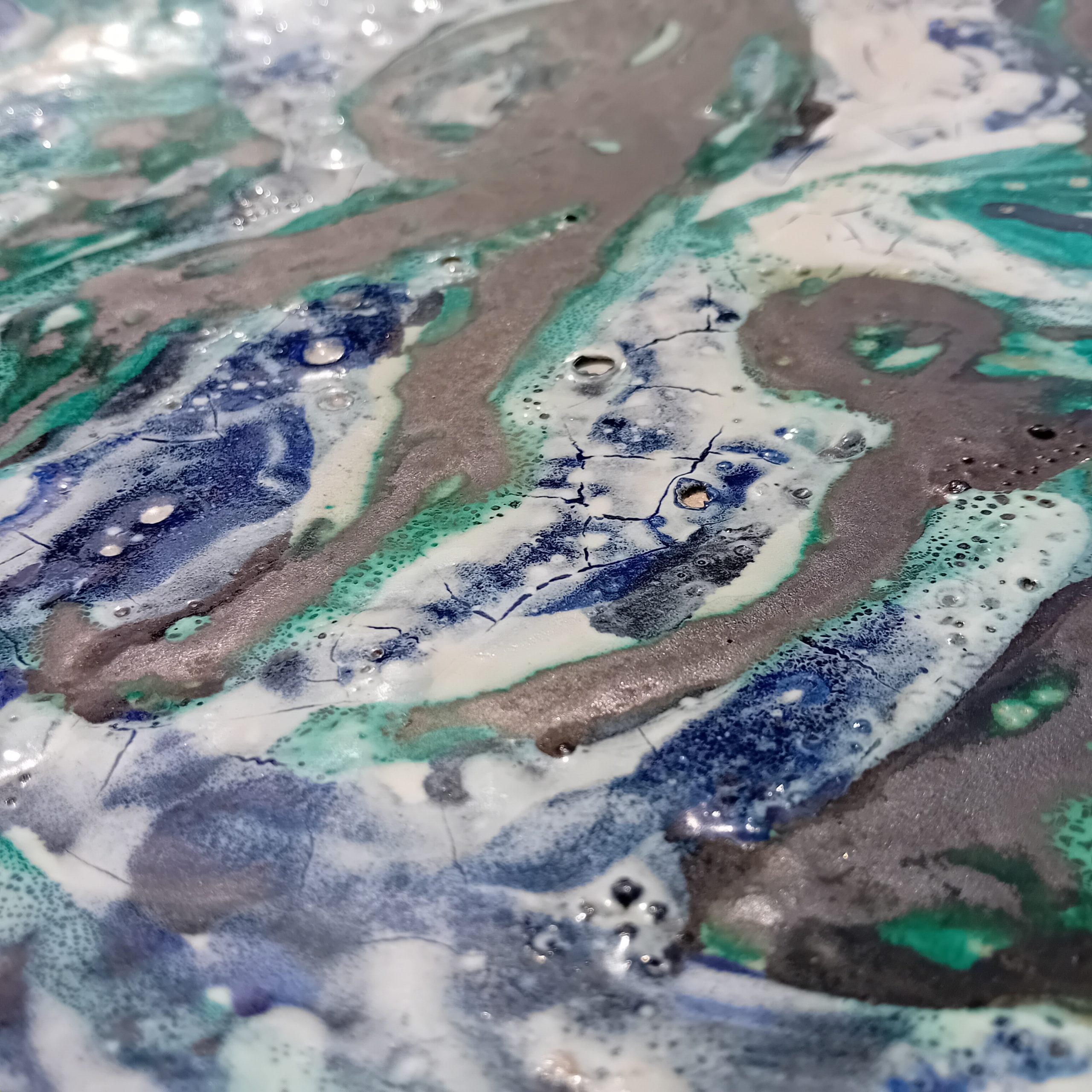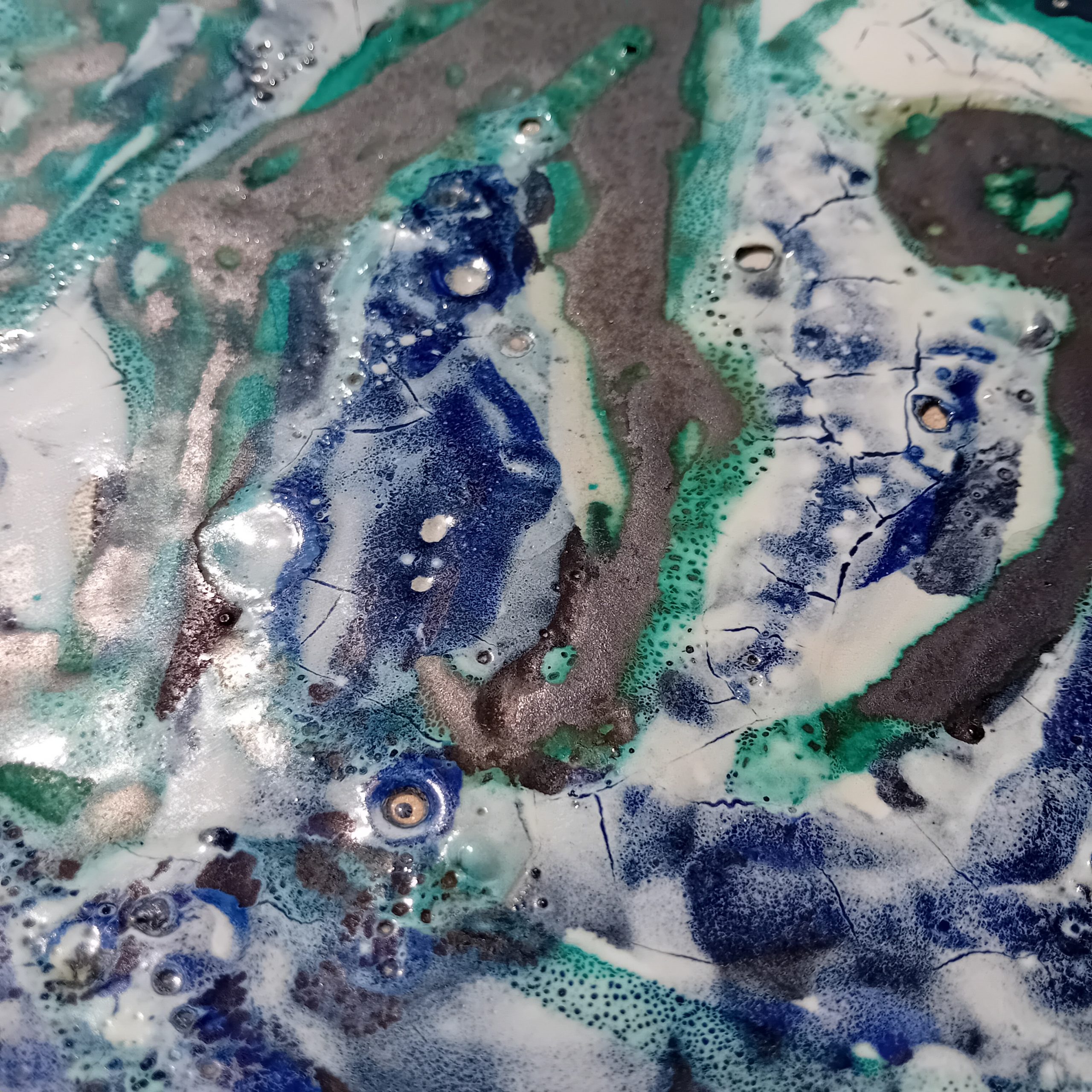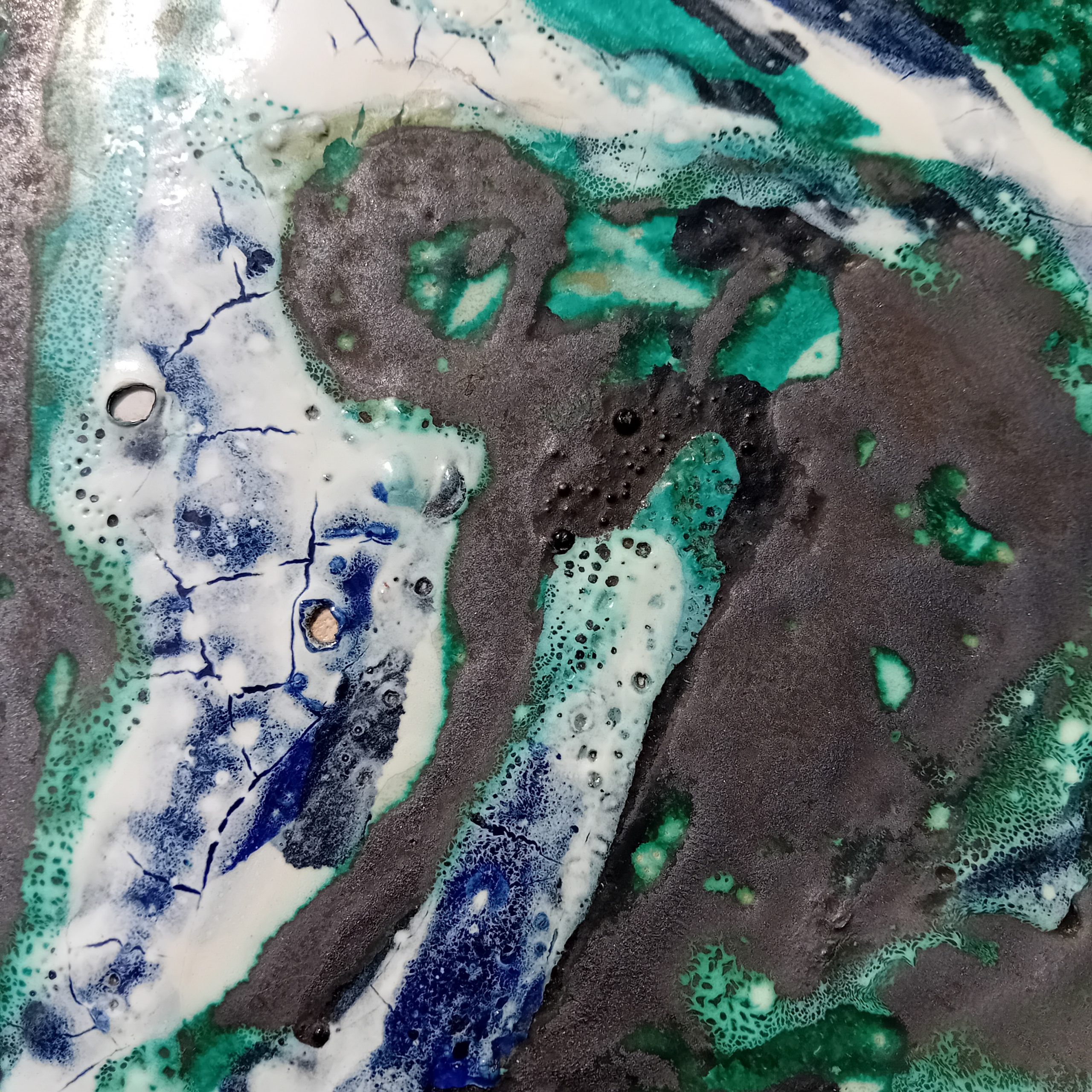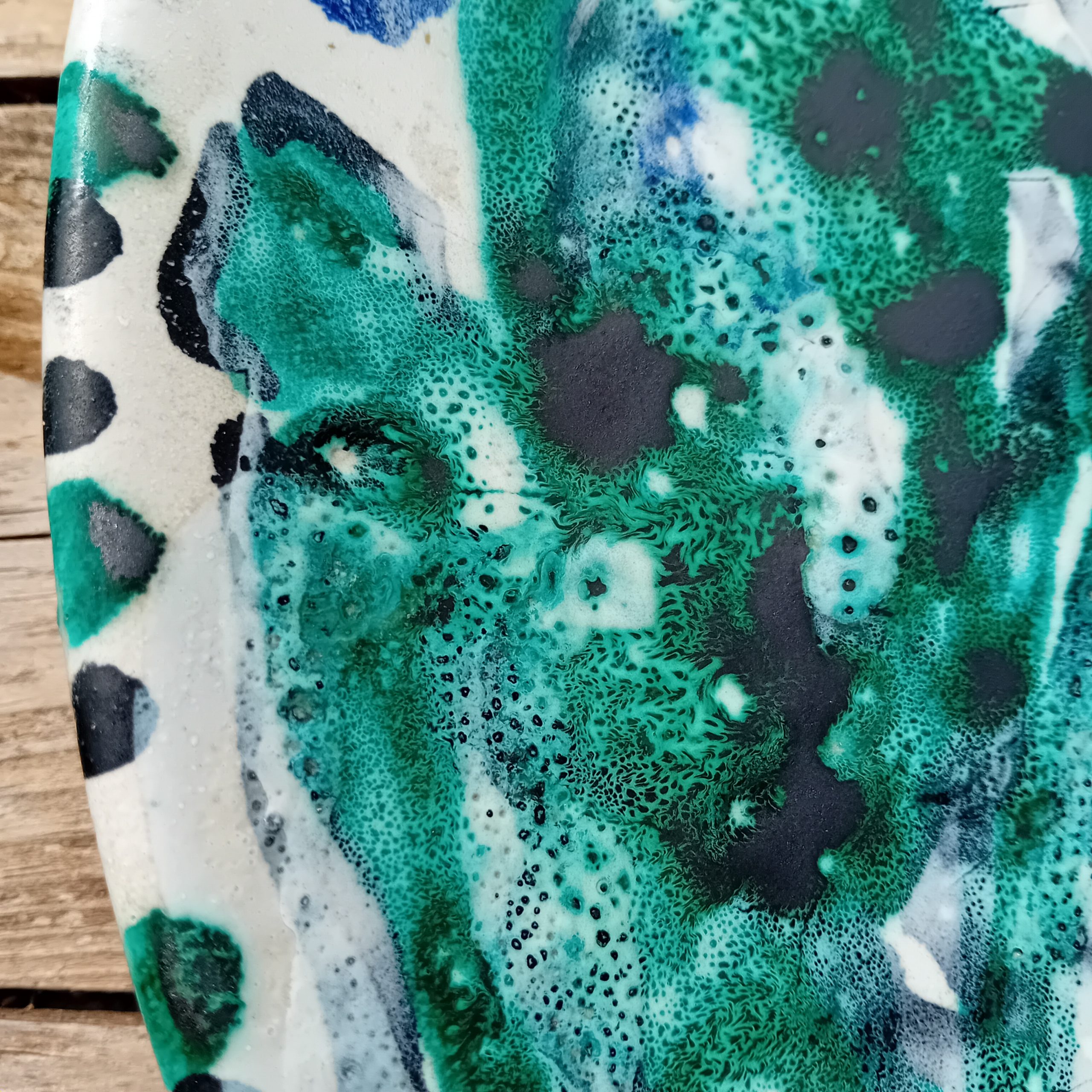 • Céramique émaillée polychrome (vert, bleu, noir, blanc)