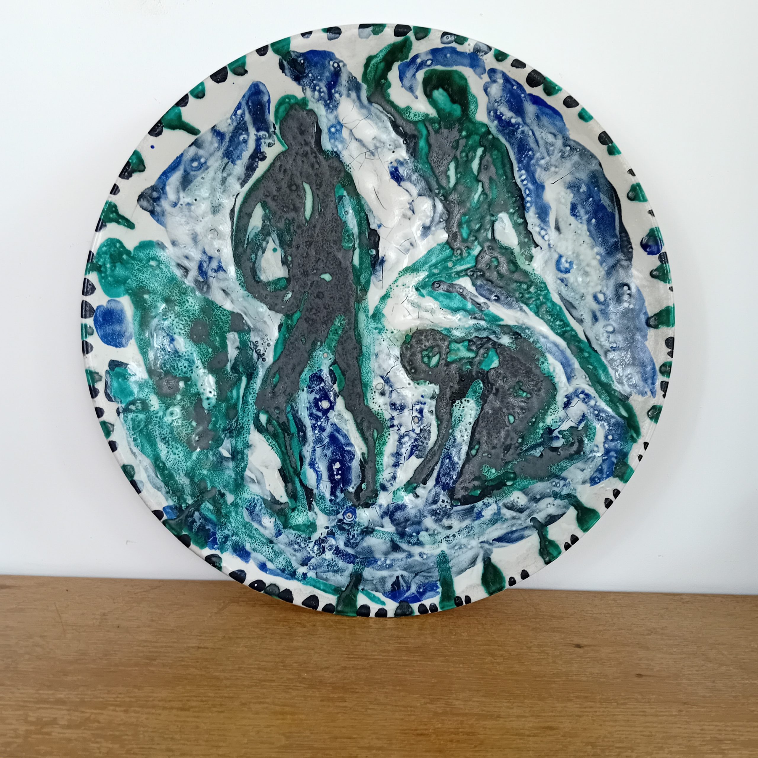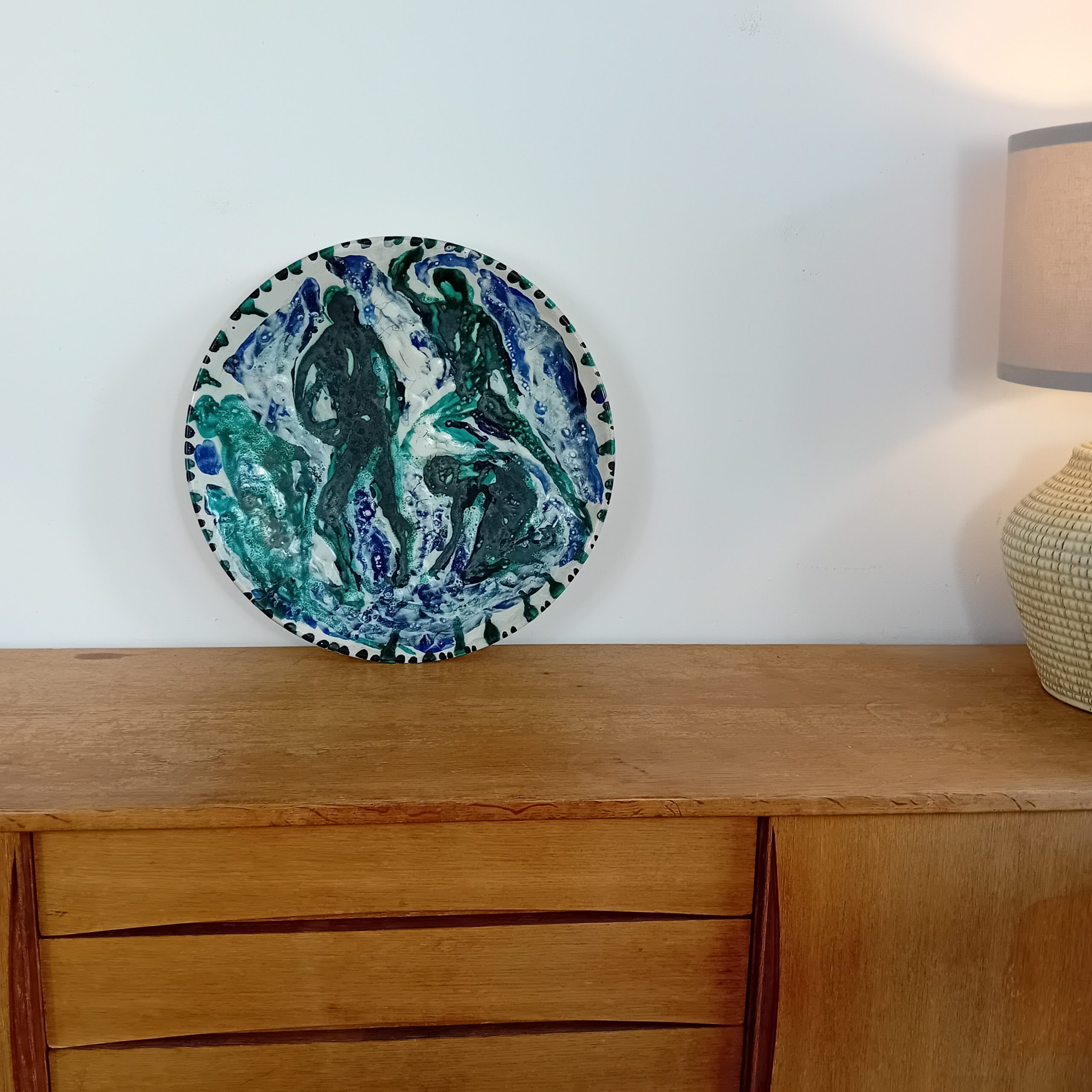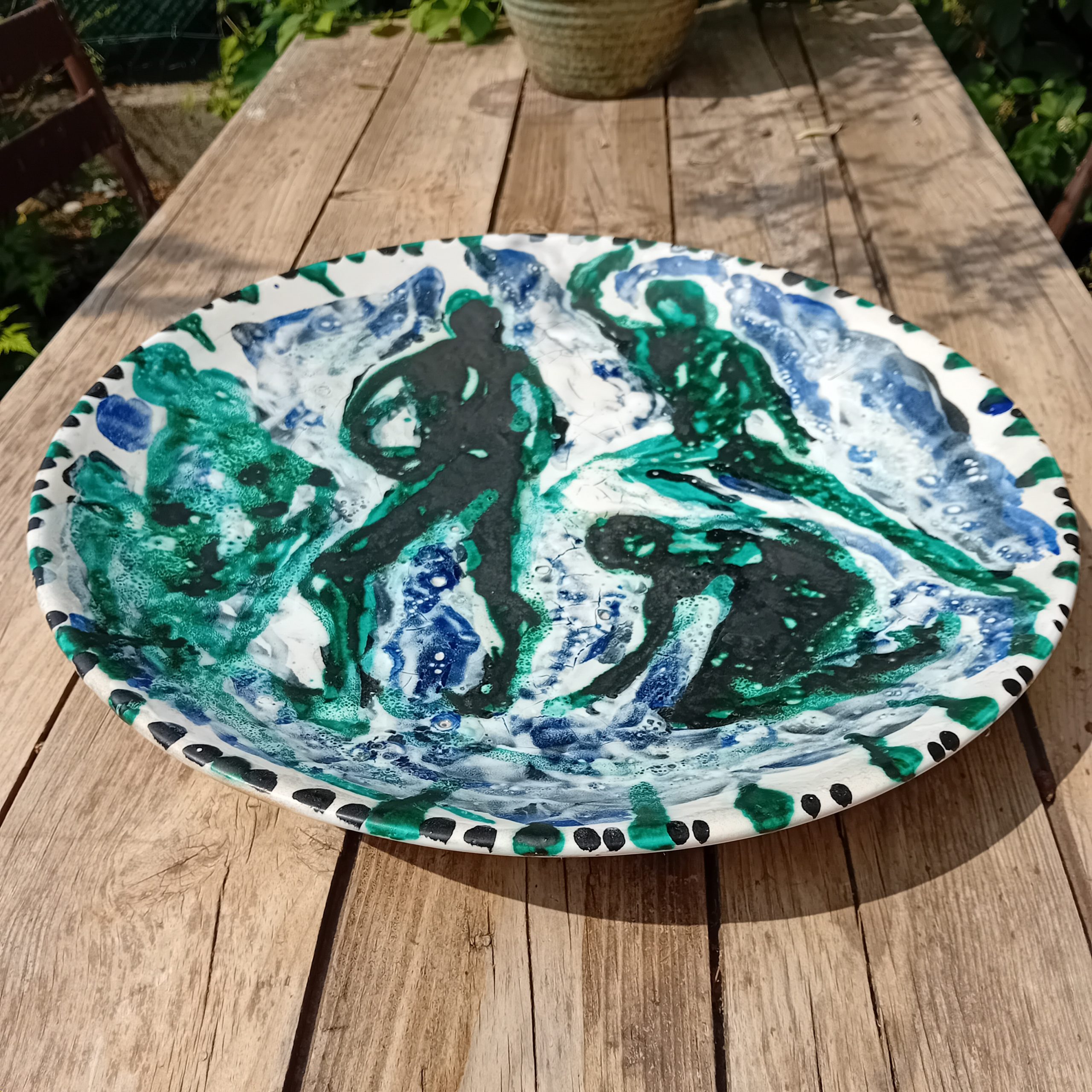 Spectaculaire plat décoratif en céramique émaillée, décoré de silhouettes de danseurs stylisés dans un tourbillon de verts, bleus et noirs. La glaçure riche, ponctuée de bulles et de craquelures naturelles, donne à la scène une énergie vibrante, presque en mouvement.