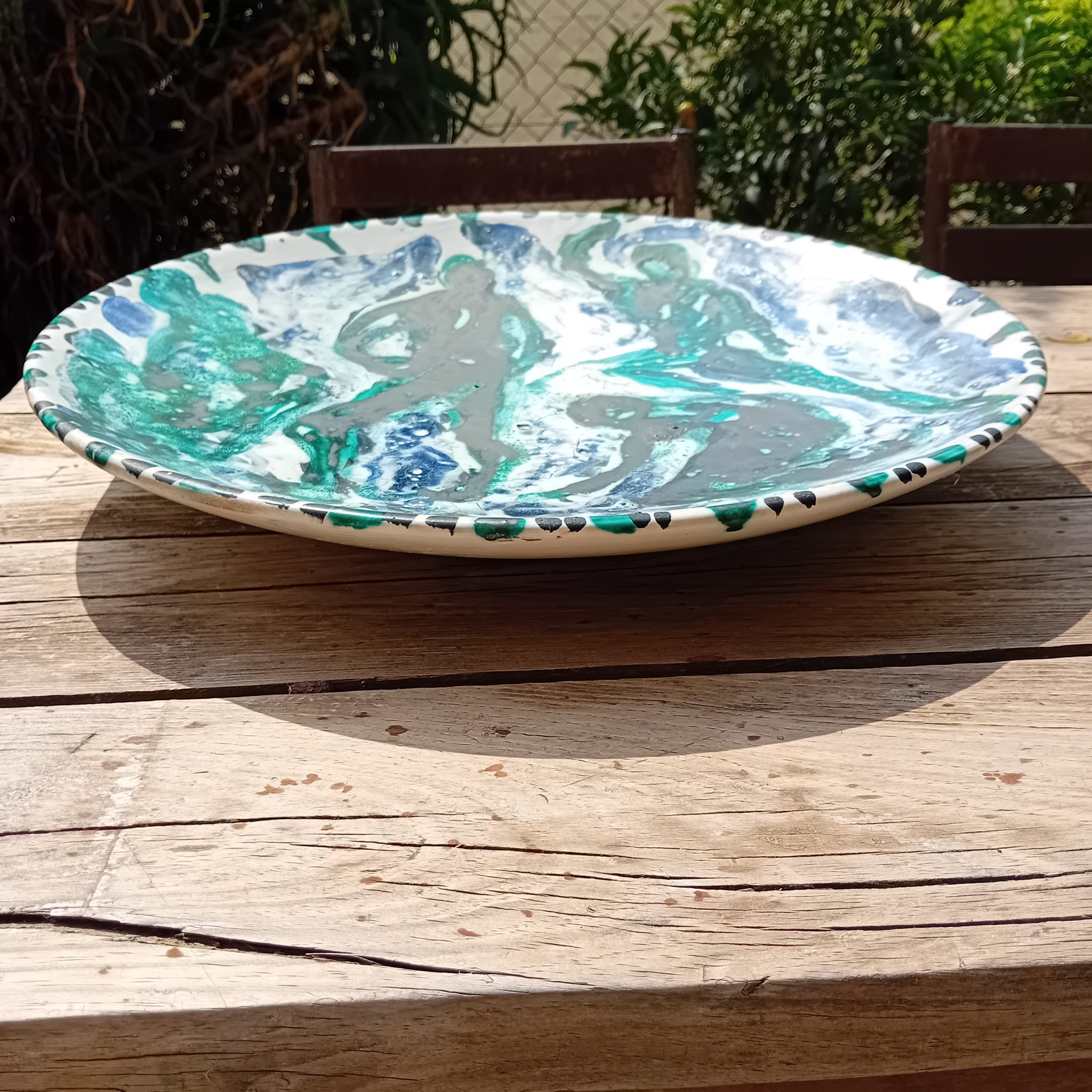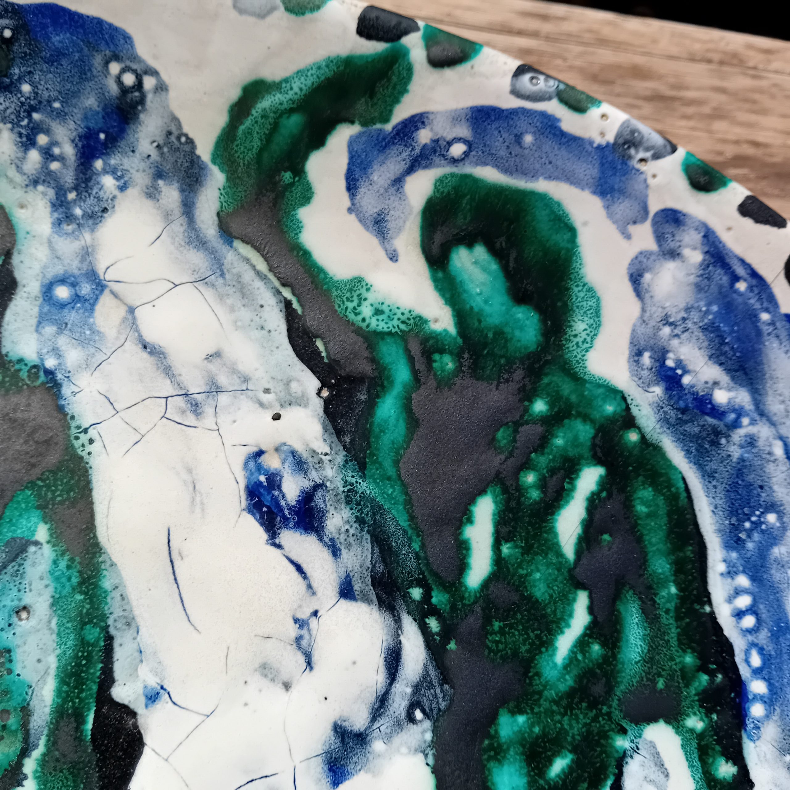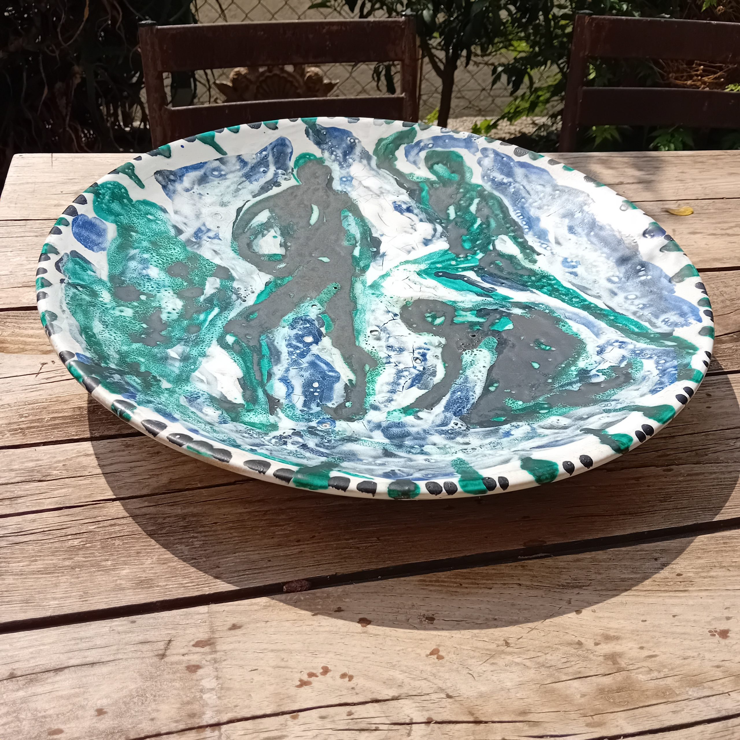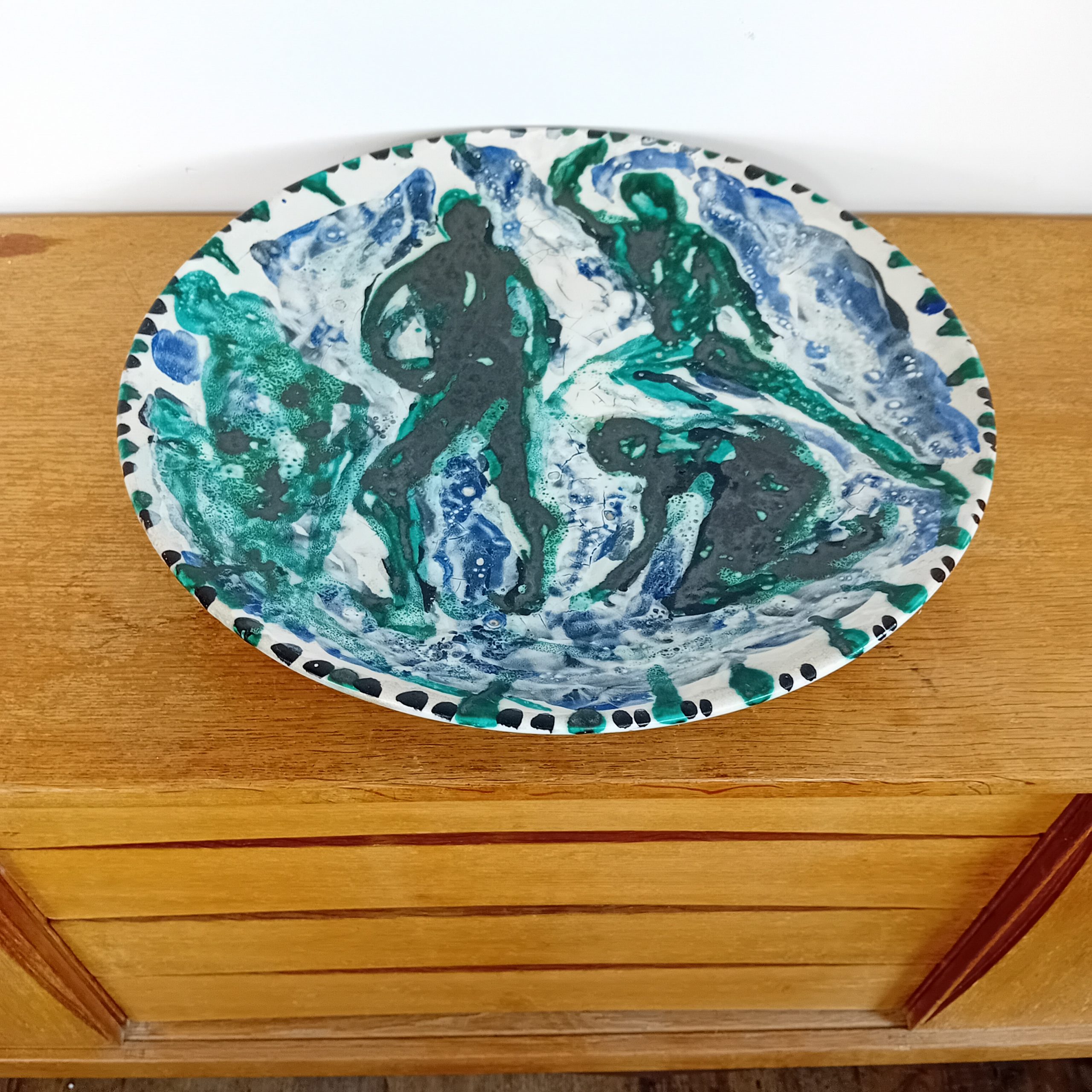 Spectaculaire plat décoratif en céramique émaillée, décoré de silhouettes de danseurs stylisés dans un tourbillon de verts, bleus et noirs. La glaçure riche, ponctuée de bulles et de craquelures naturelles, donne à la scène une énergie vibrante, presque en mouvement.