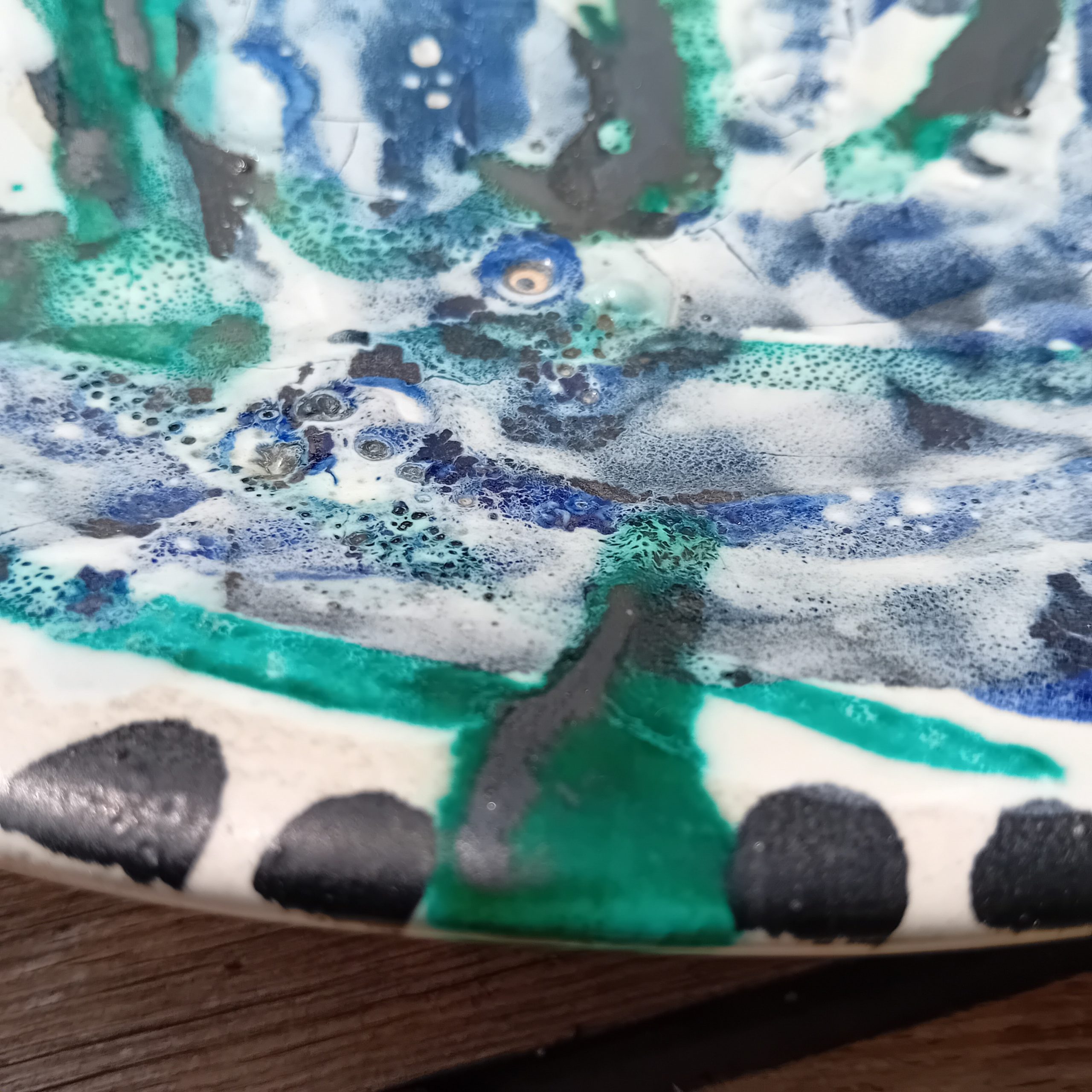 Cette pièce de grand format (46,4 cm) est impressionnante par sa présence décorative. Le style rappelle les ateliers du sud de la France (Vallauris, Biot) dans les années 1950/60, où abstraction et figuration se mêlaient dans des décors modernistes.