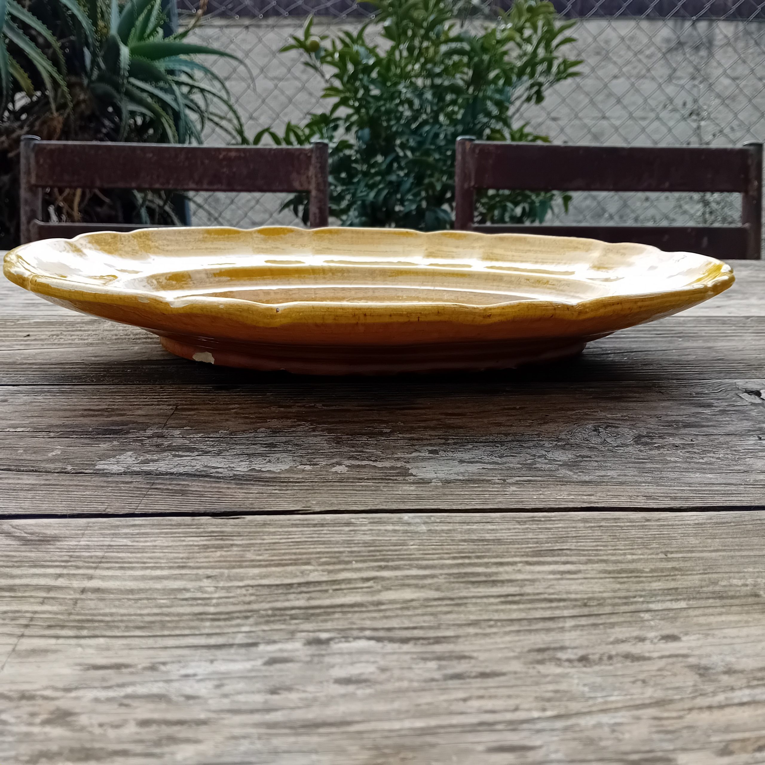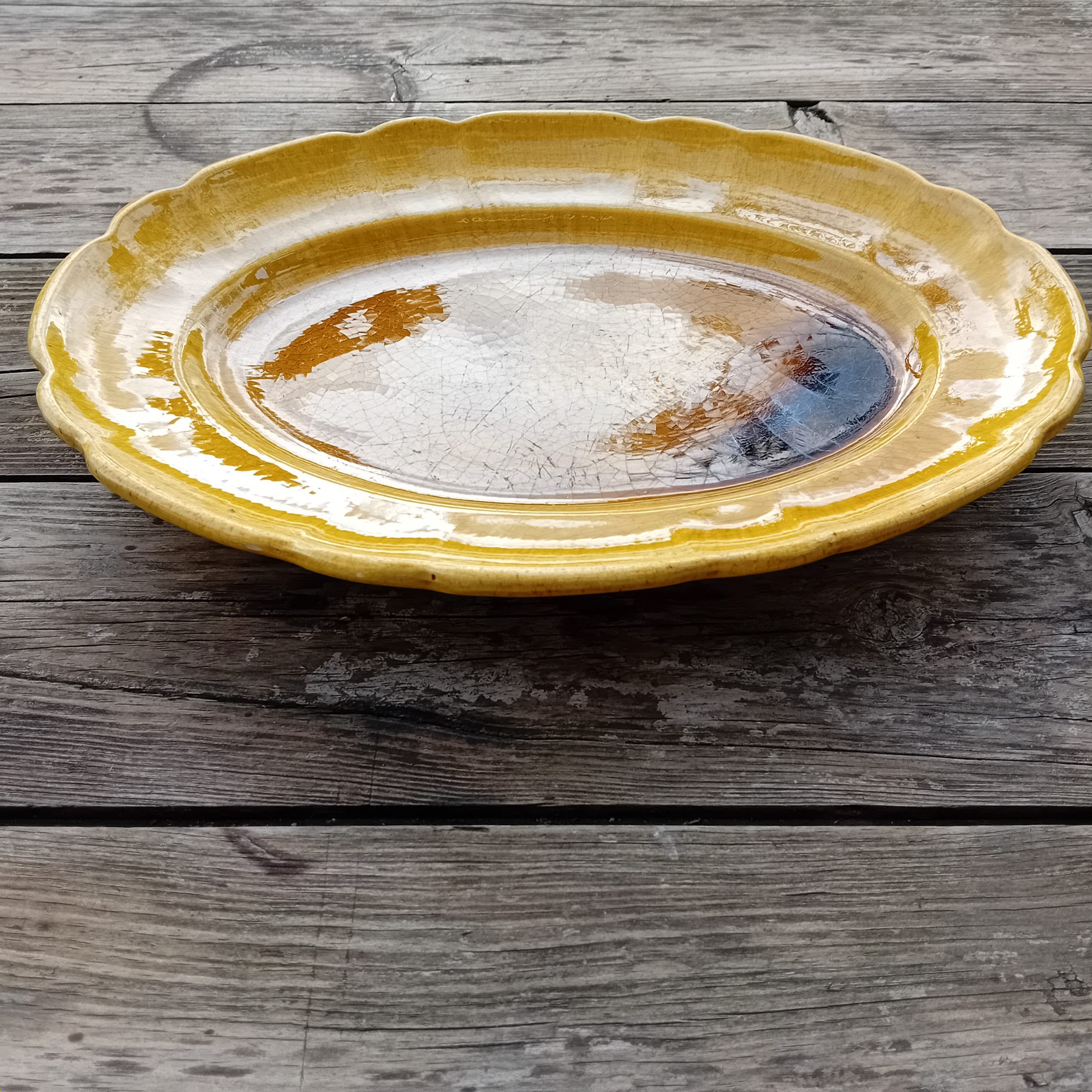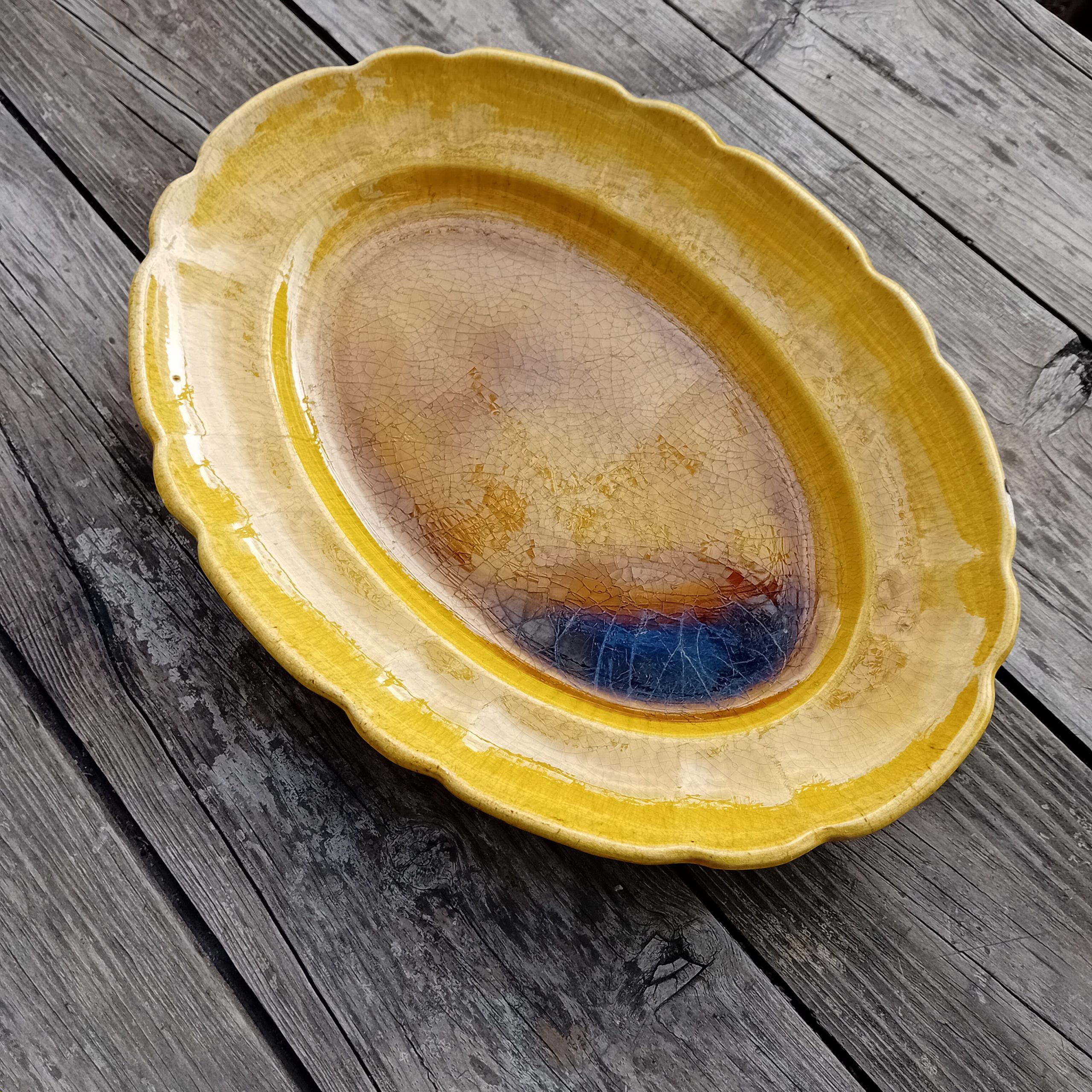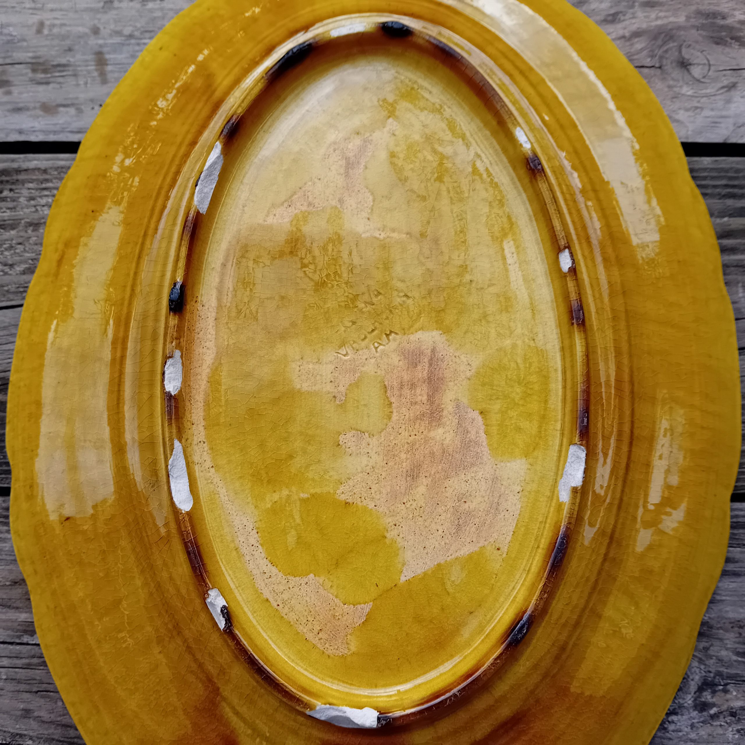 Le plat présente une glaçure couleur miel / pain brûlé, caractéristique des ateliers de Vallauris. La craquelure, fine et régulière, apporte une profondeur visuelle très décorative. Les nuances de cuisson varient subtilement, rendant chaque pièce unique. De plus, le bord chantourné souligne élégamment la forme ovale et renforce son équilibre visuel.