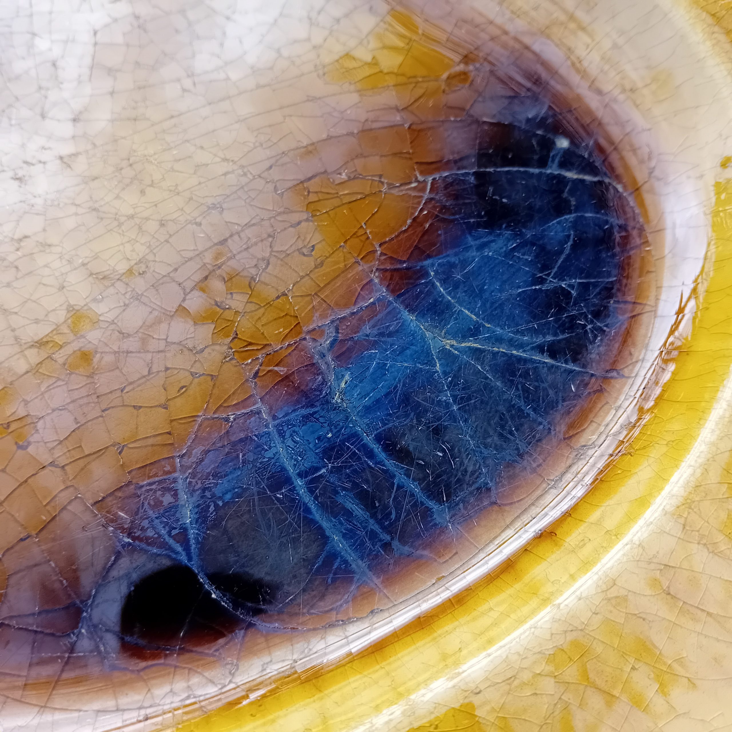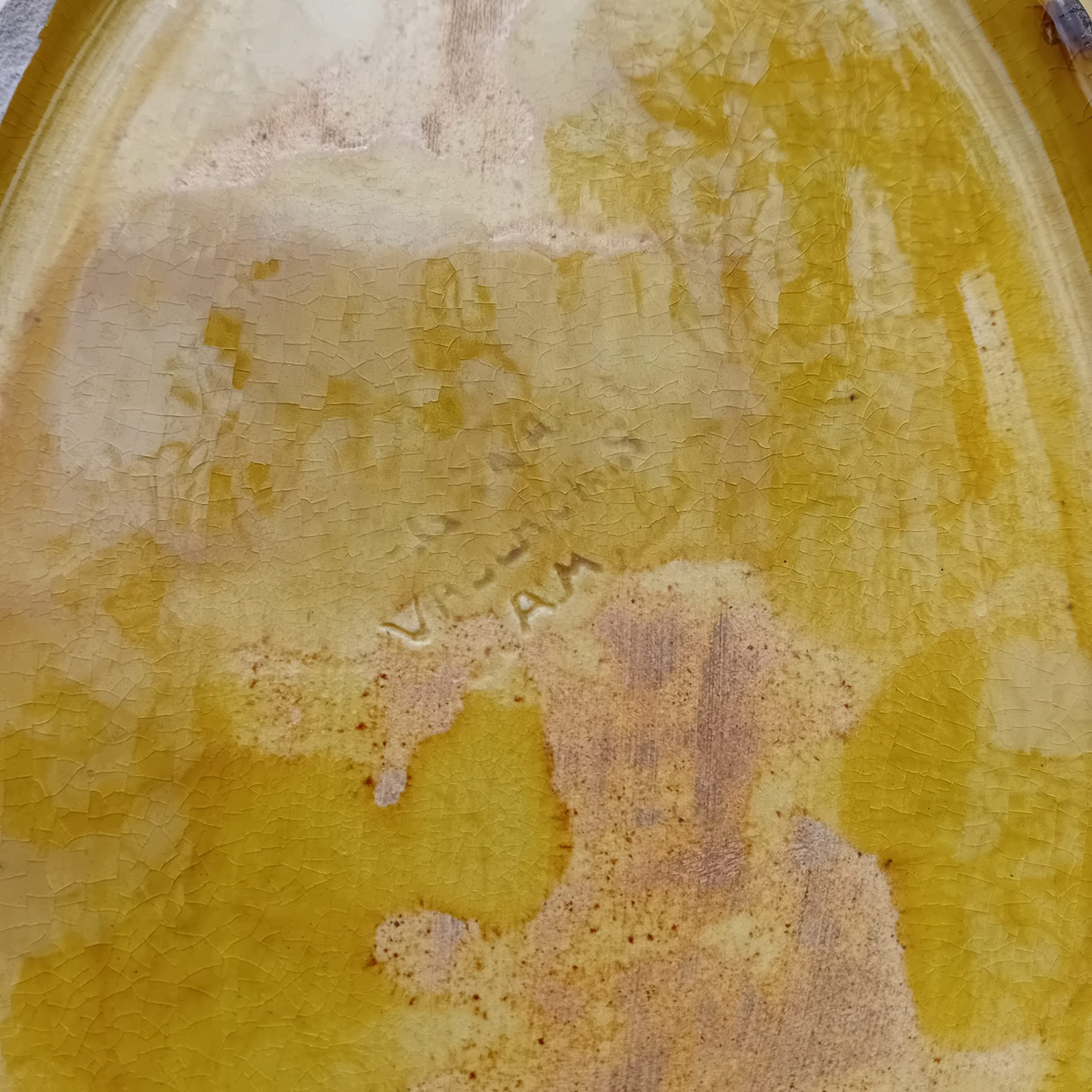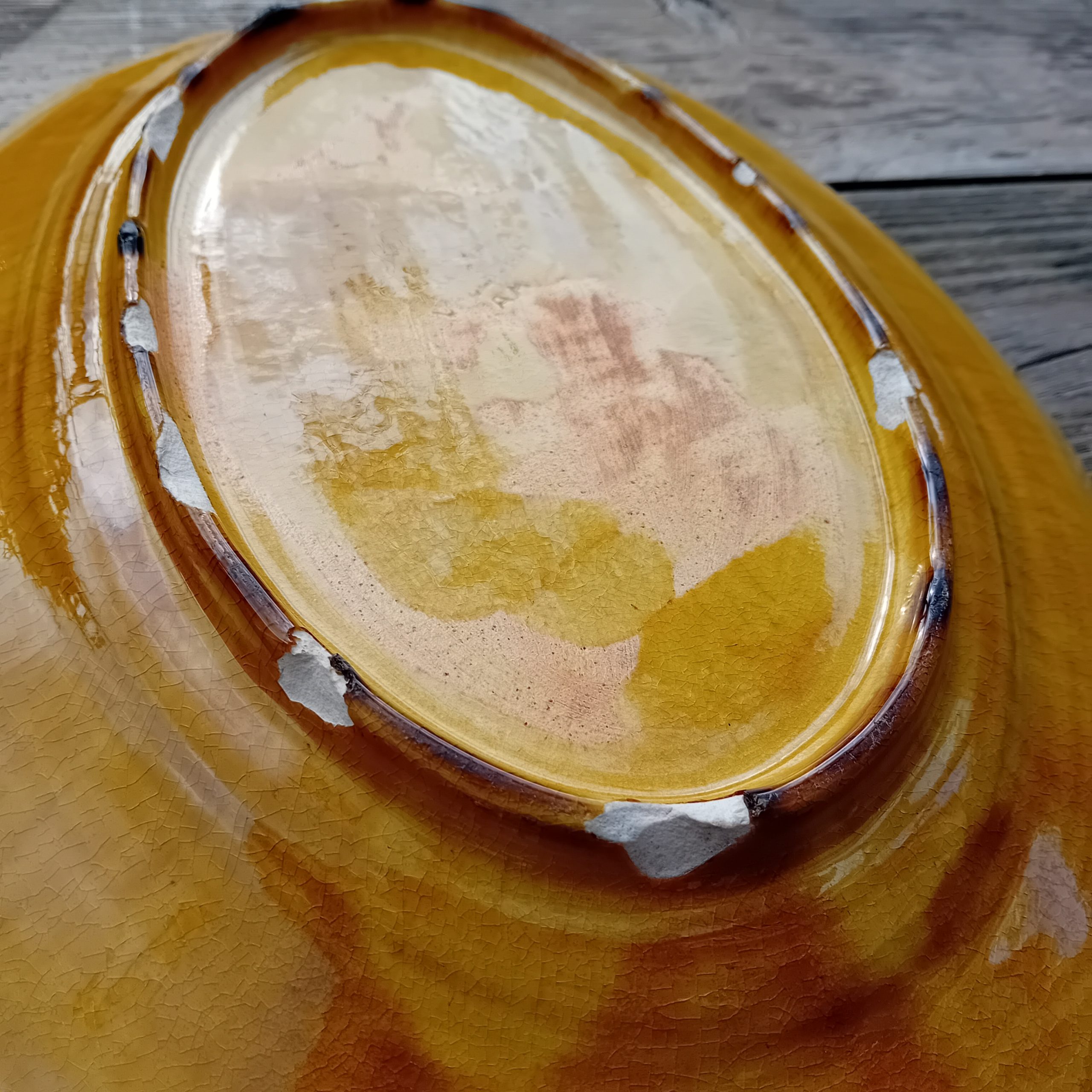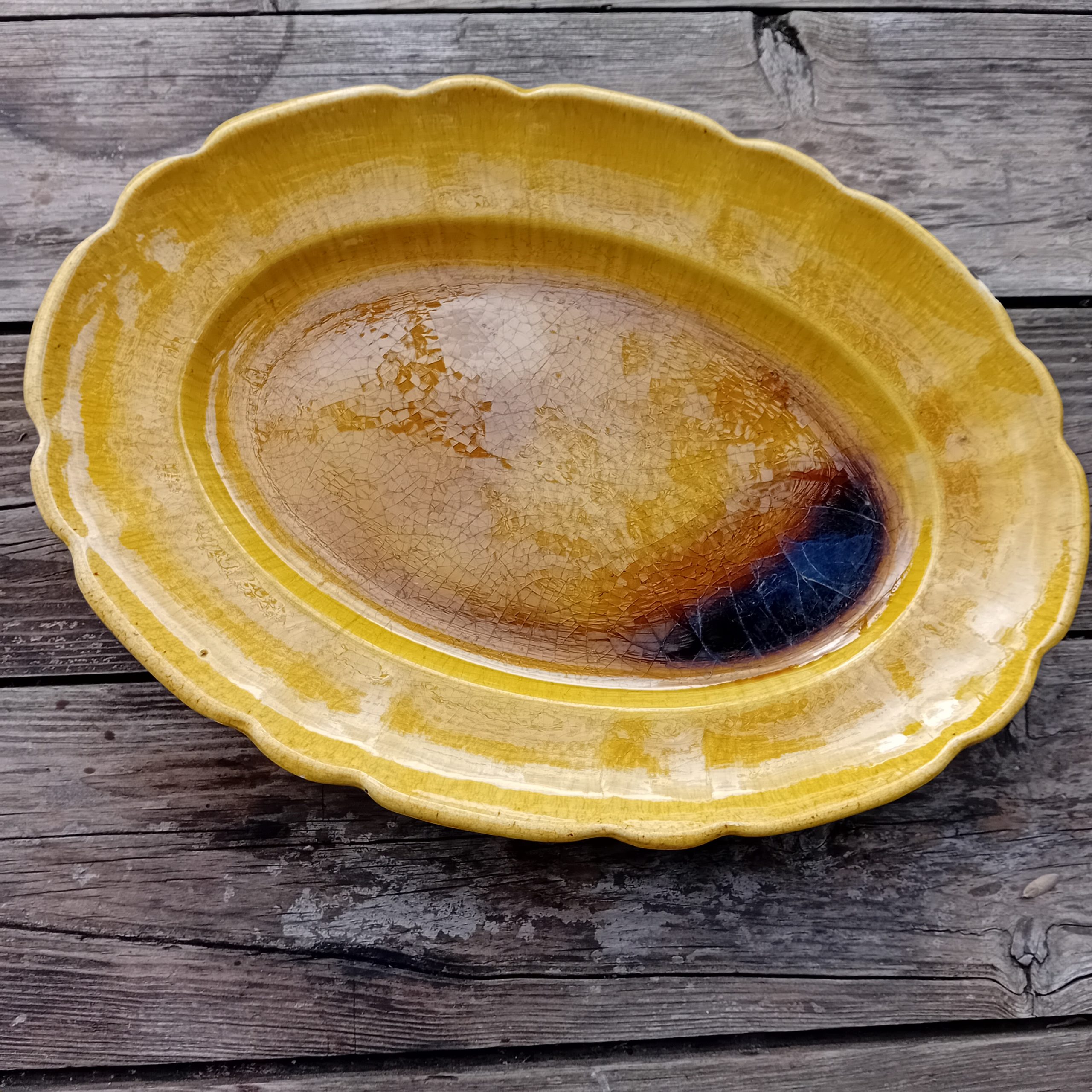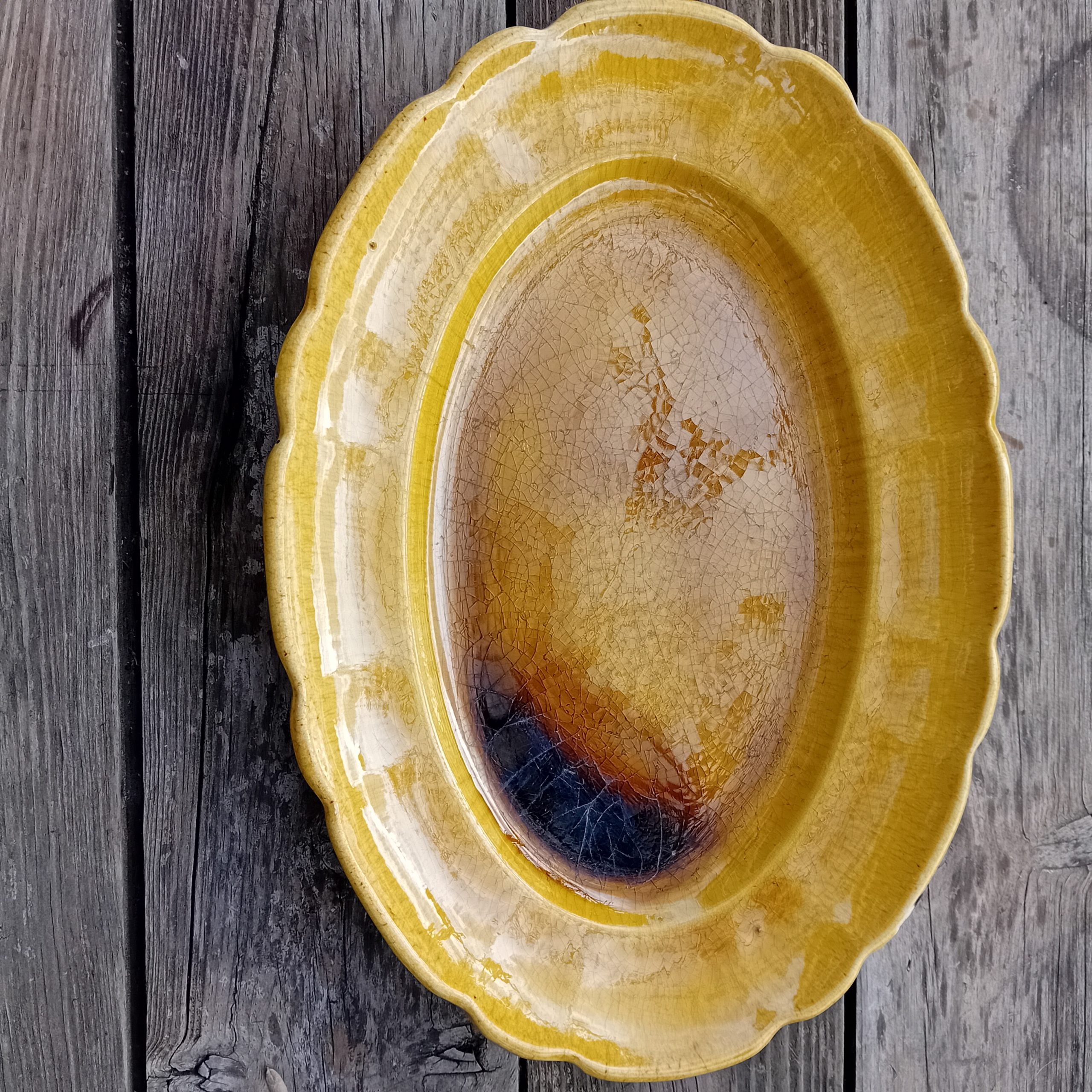 Le plat présente une glaçure couleur miel / pain brûlé, caractéristique des ateliers de Vallauris. La craquelure, fine et régulière, apporte une profondeur visuelle très décorative. Les nuances de cuisson varient subtilement, rendant chaque pièce unique. De plus, le bord chantourné souligne élégamment la forme ovale et renforce son équilibre visuel.