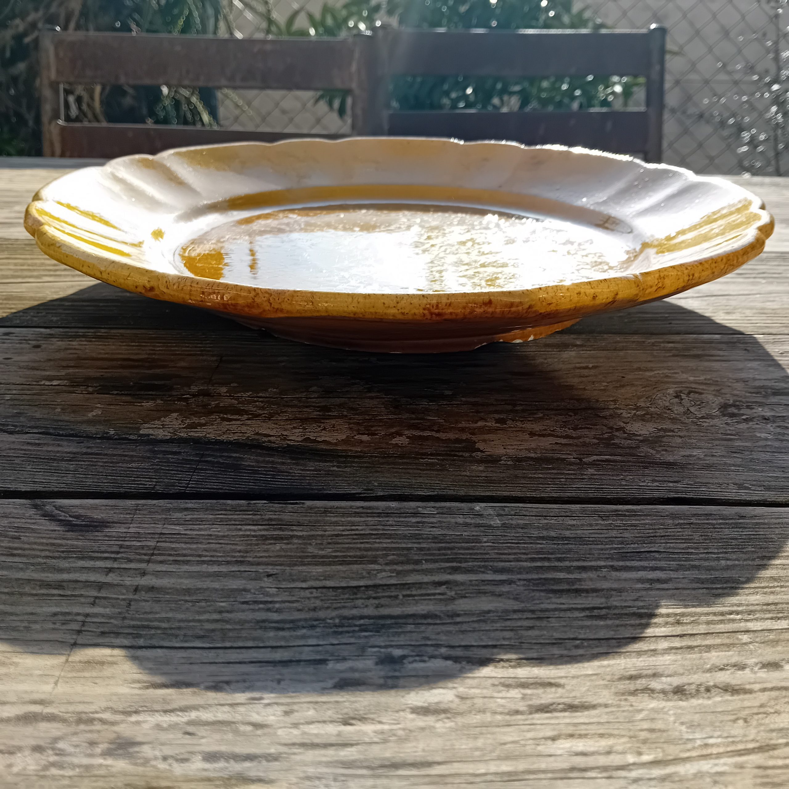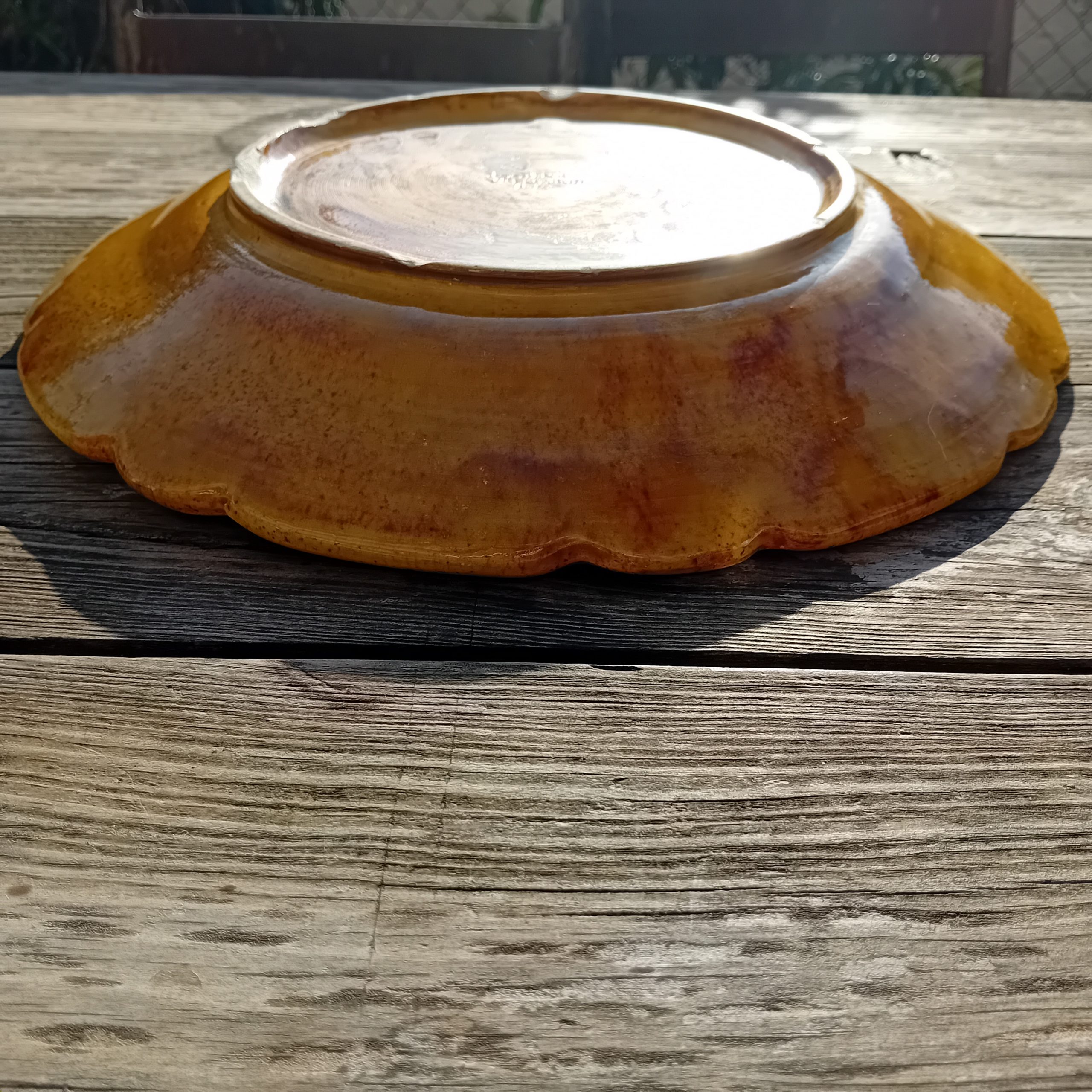 Par ailleurs, le plat se trouve en bon état général. Il présente uniquement quelques petits éclats sous le talon, visibles sur les photos. Cependant, ces marques n’affectent ni la solidité ni l’esthétique en présentation. Au contraire, elles témoignent de l’usage ancien et participent à l’authenticité de la pièce.