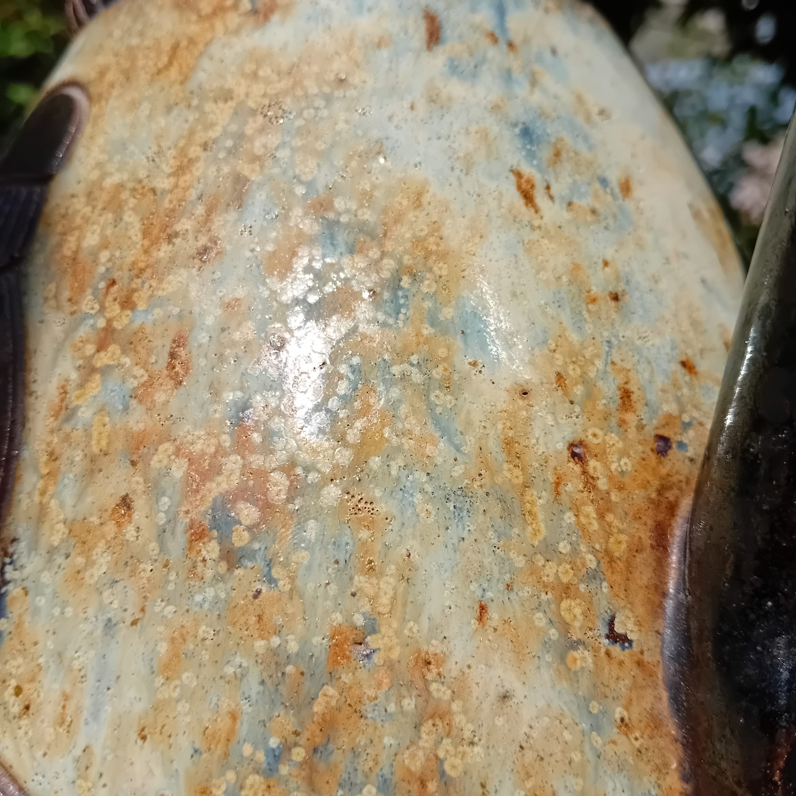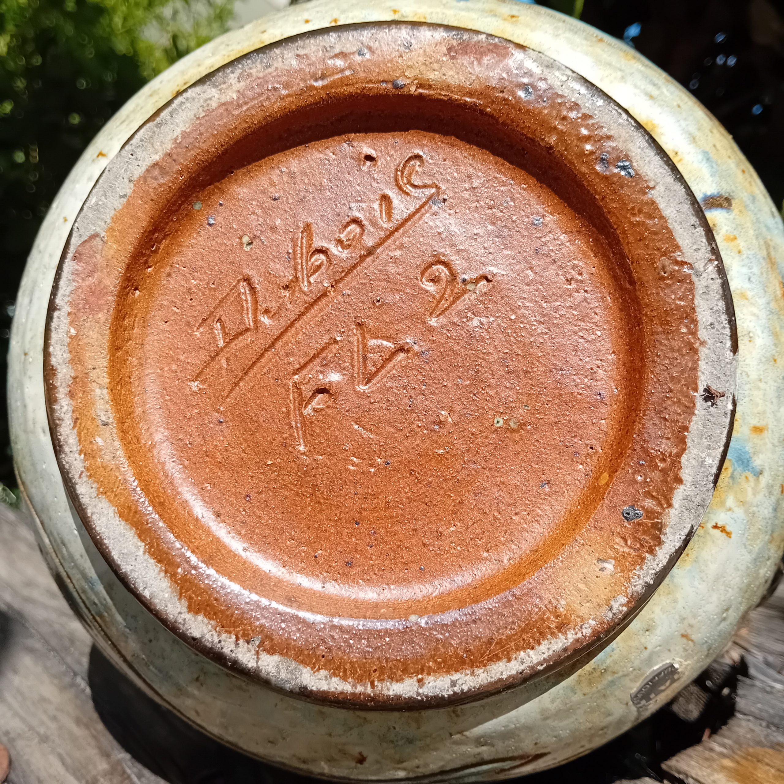 Très bon état général, belles couleurs profondes, légères craquelures de cuisson typiques du grès.