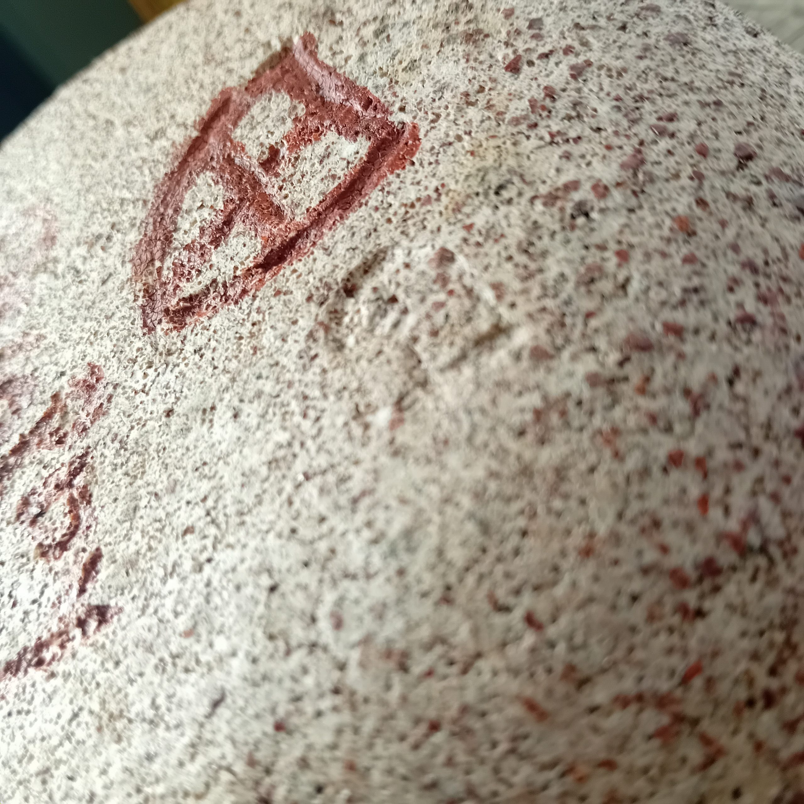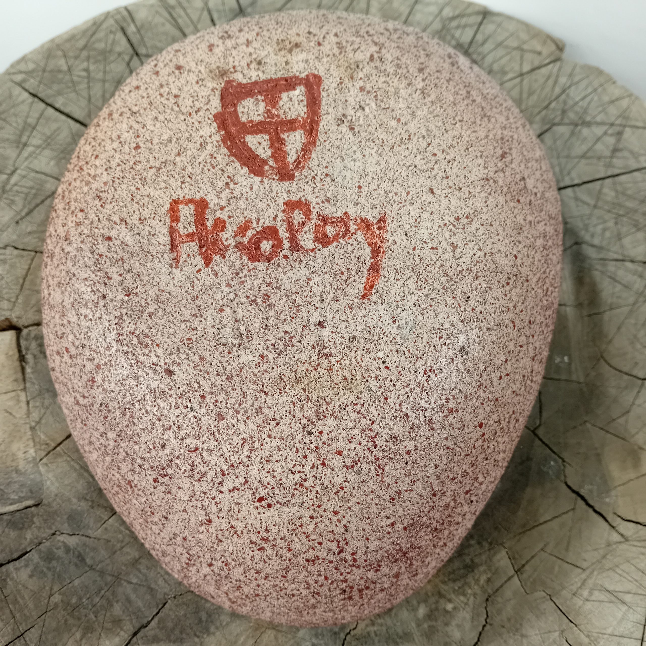 Incisé Accolay ainsi que le sigle la crois dans un blason et couvert de peinture brun rouge la date 67 également incisée.