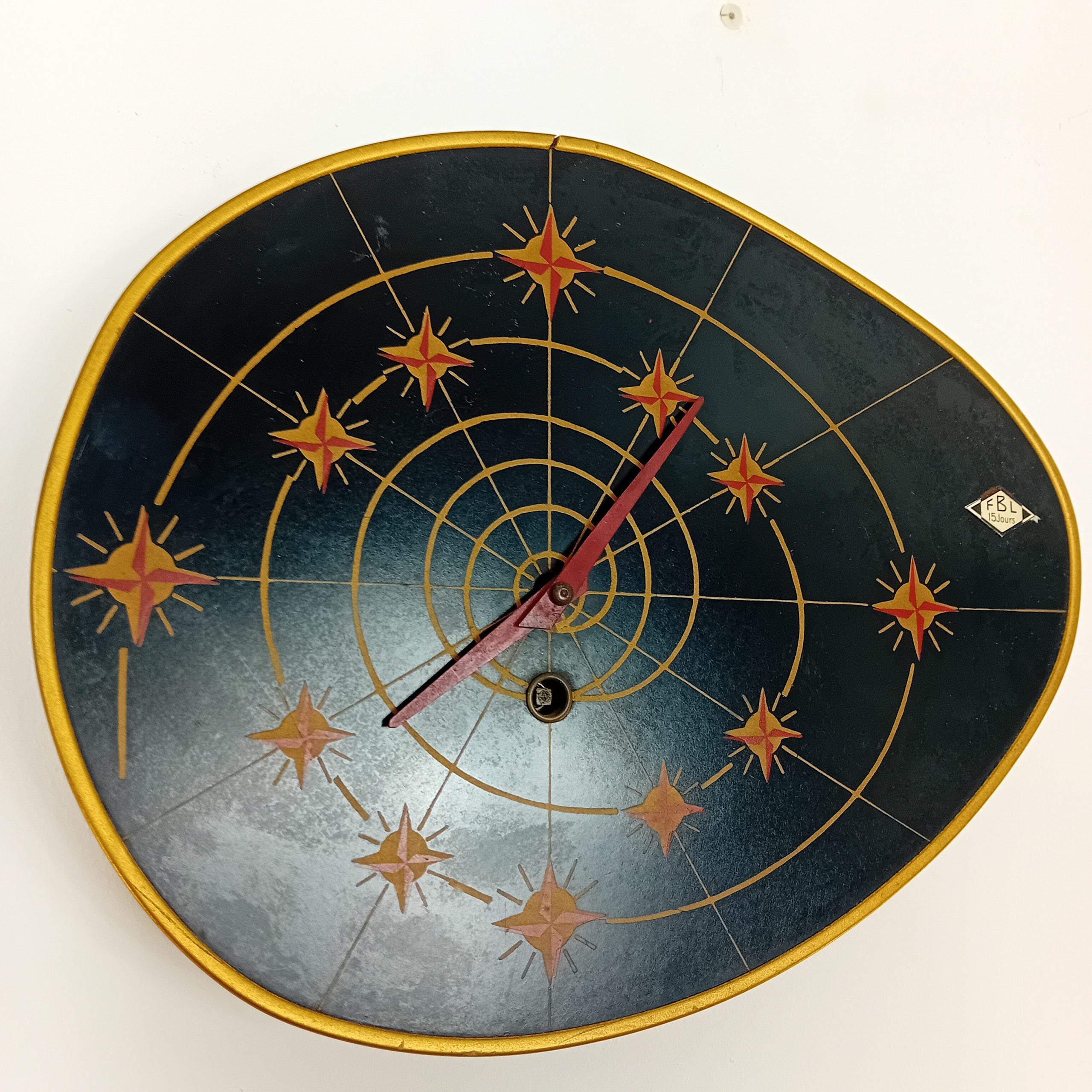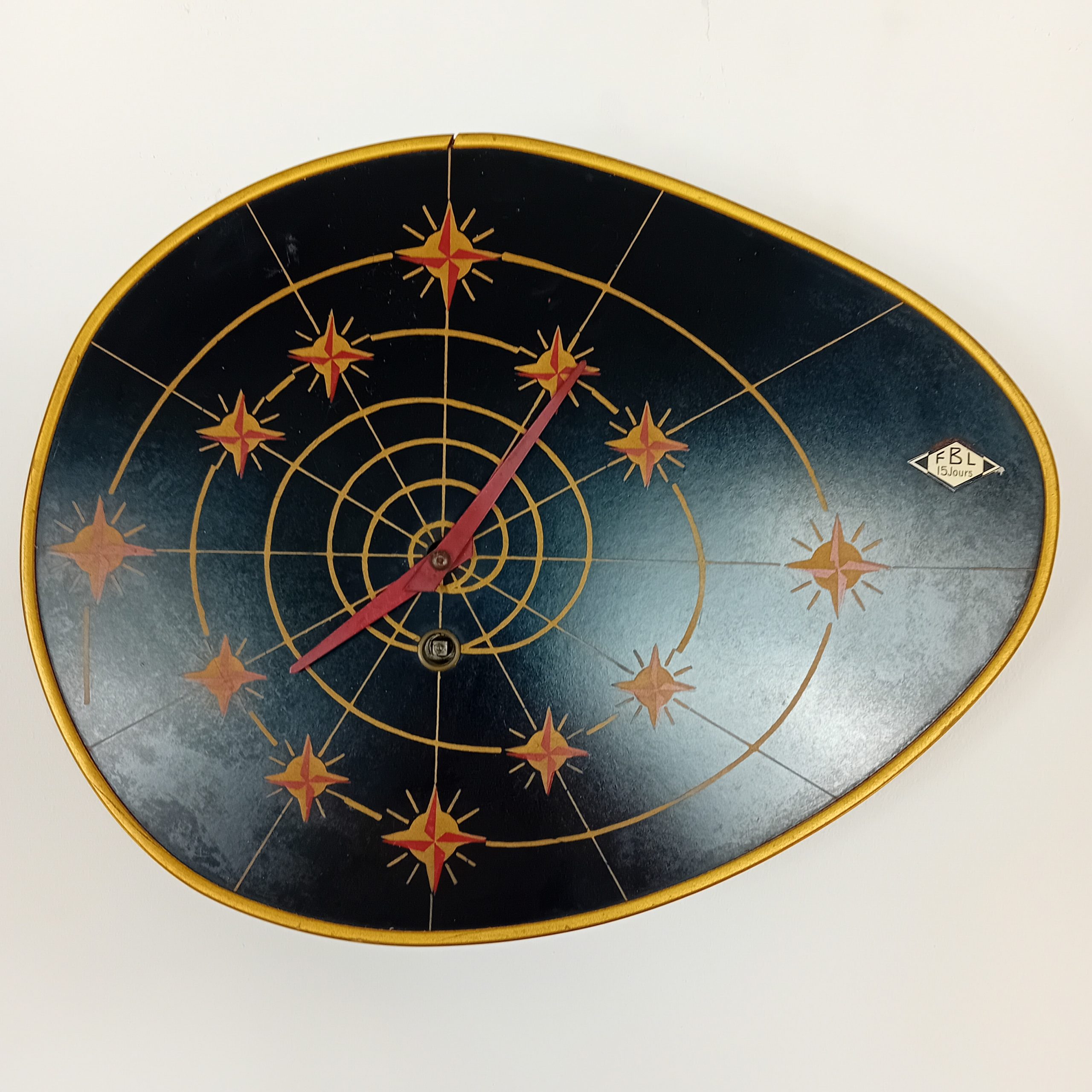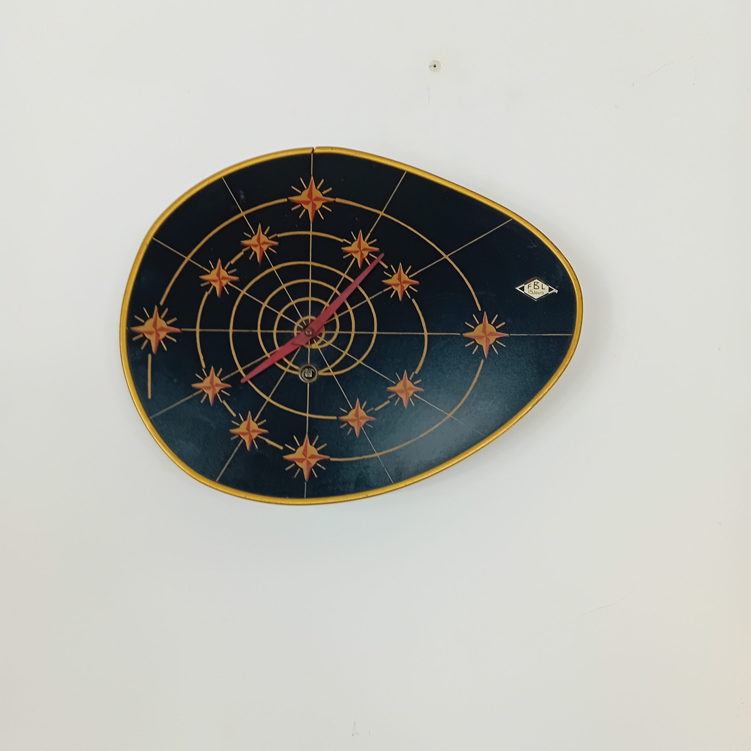Une rare et fonctionnelle horloge FBL 15 jours au décor typique de l’Age Atomic années 50-60.