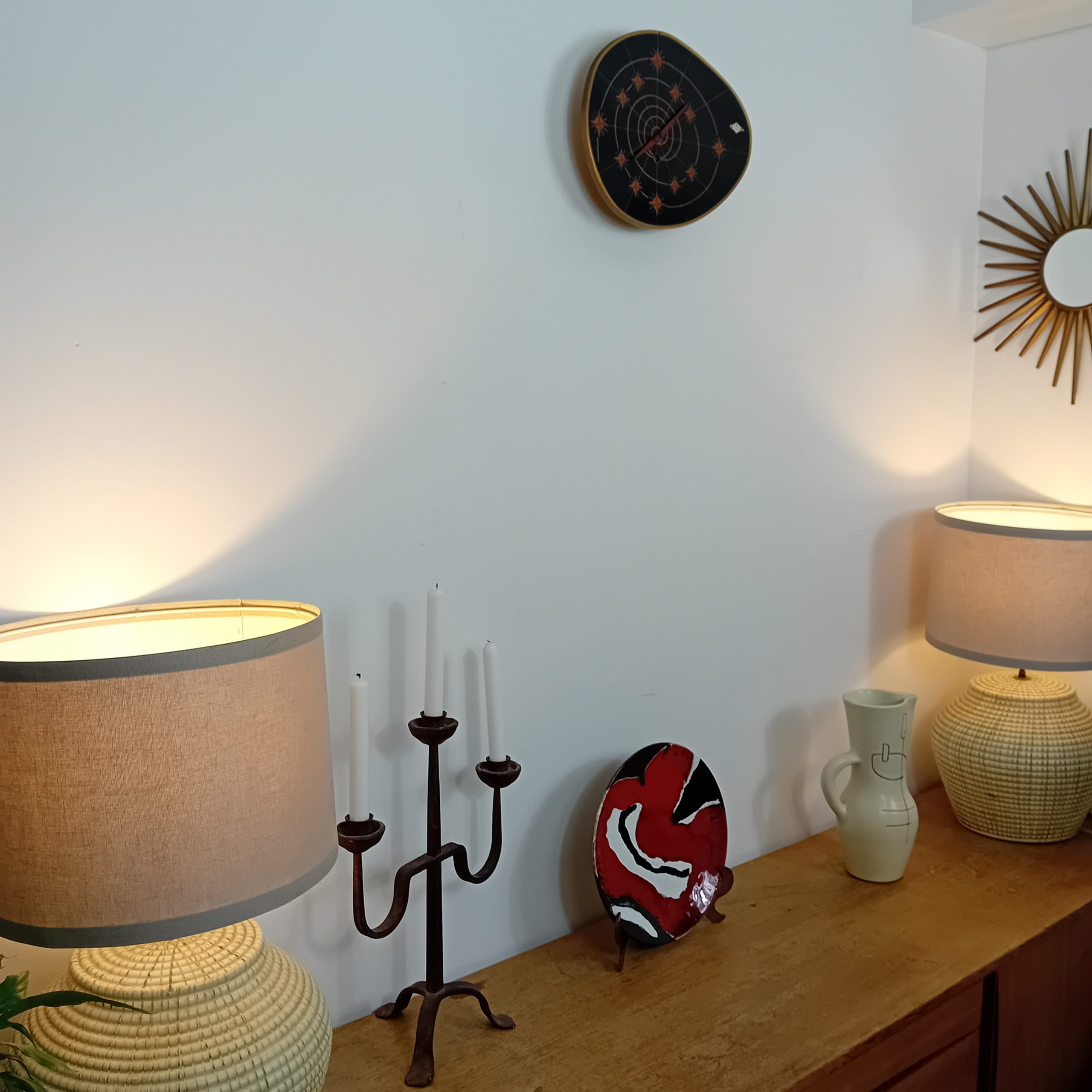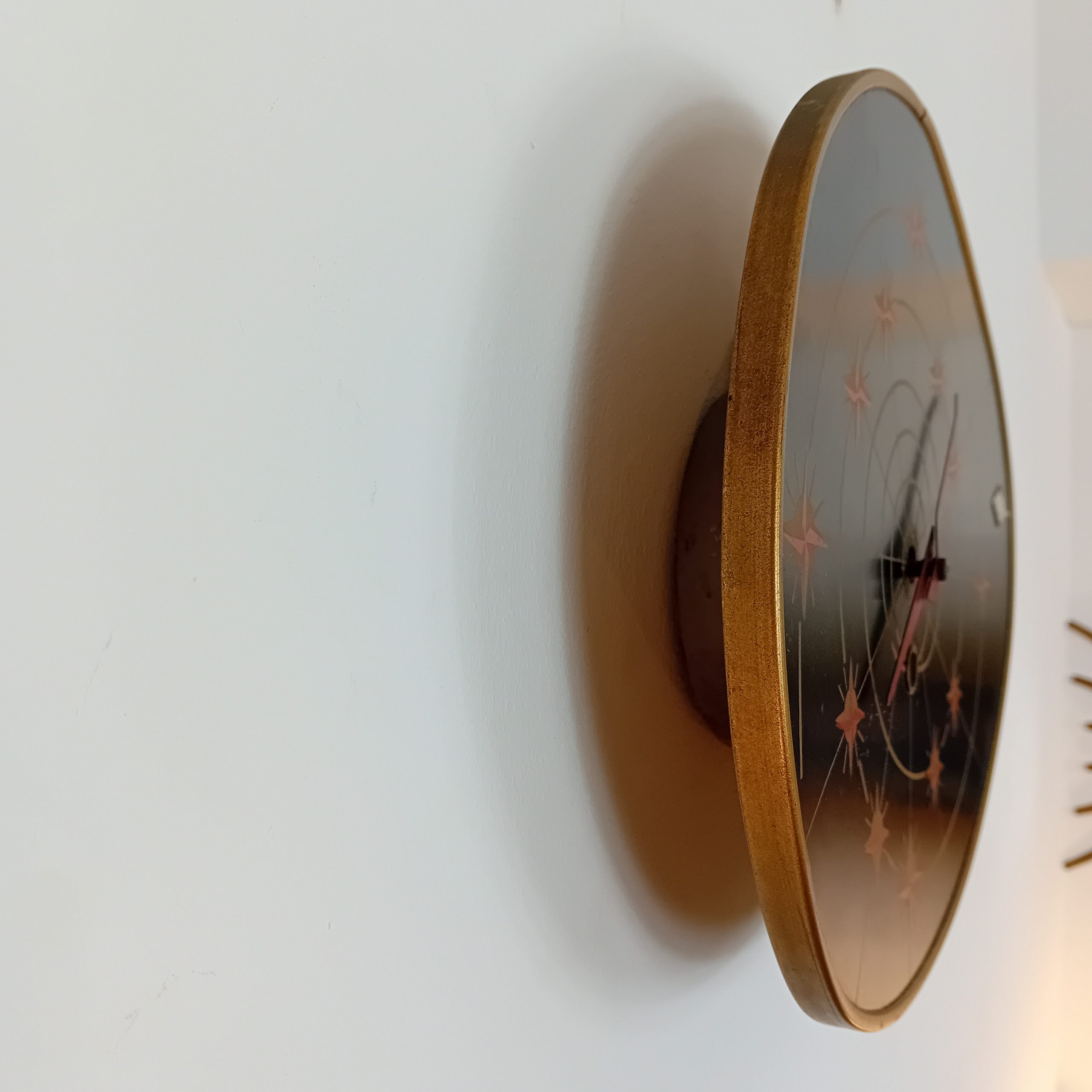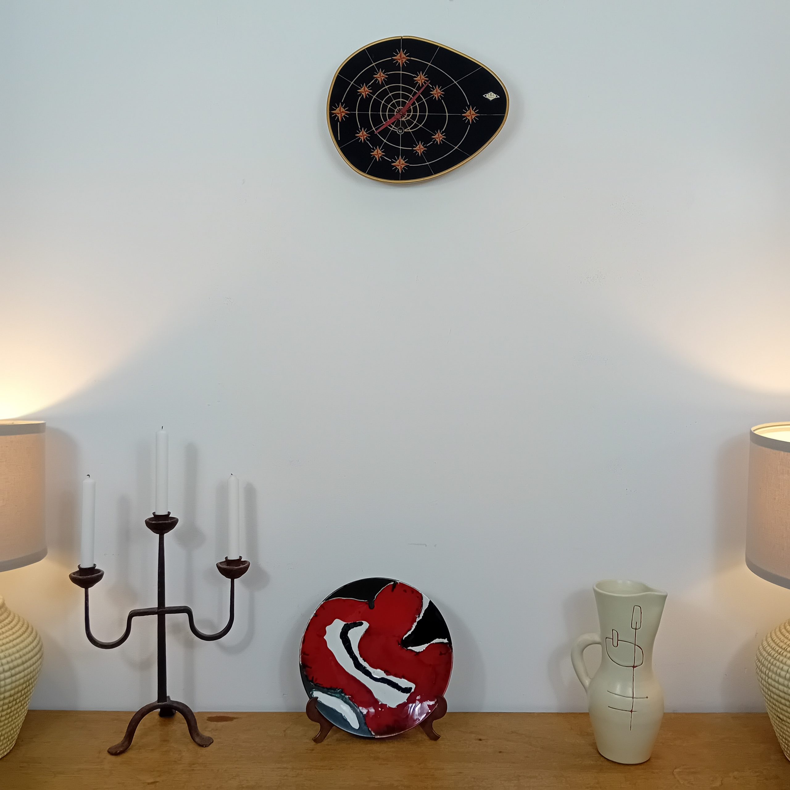 Une rare et fonctionnelle horloge FBL 15 jours au décor typique de l’Age Atomic années 50-60.