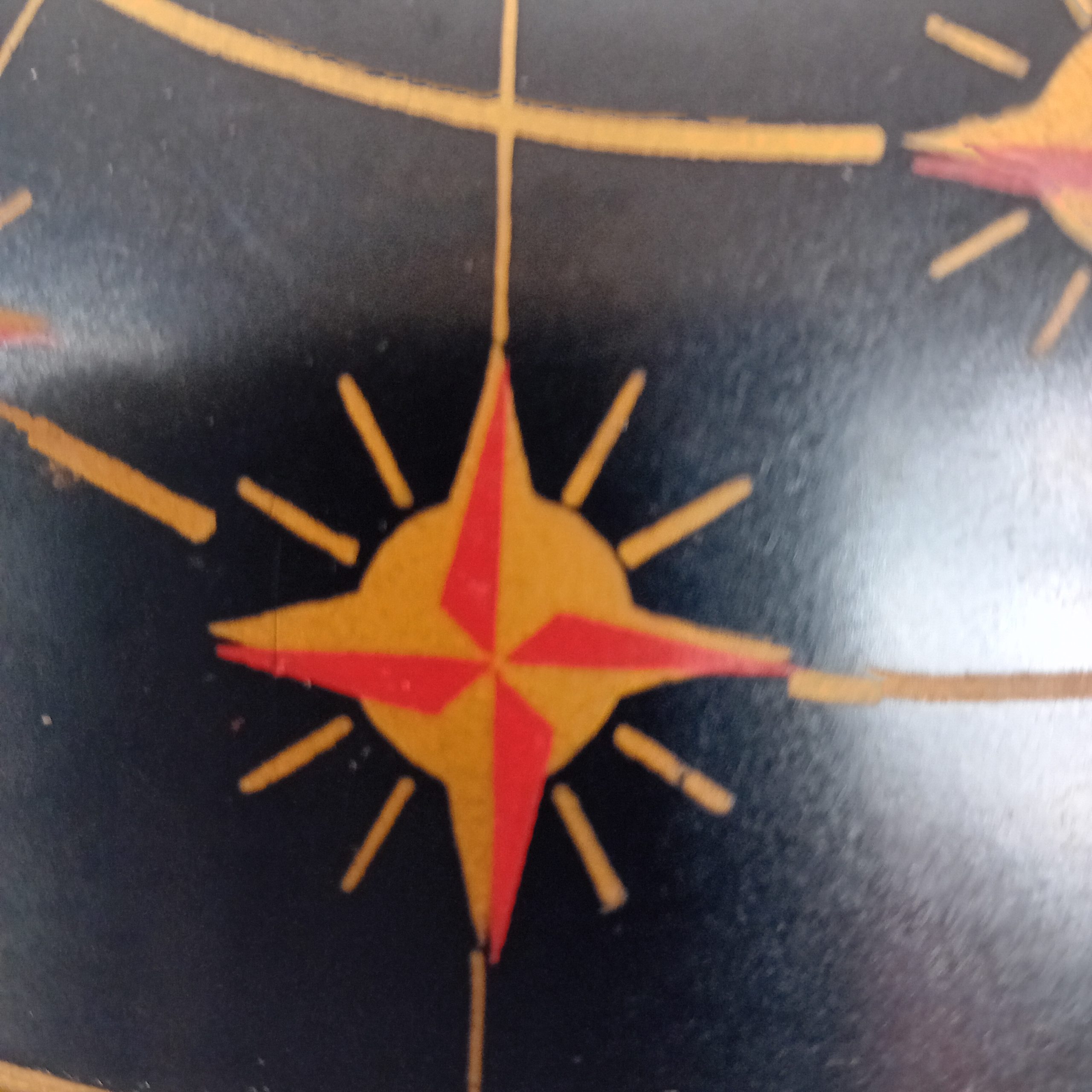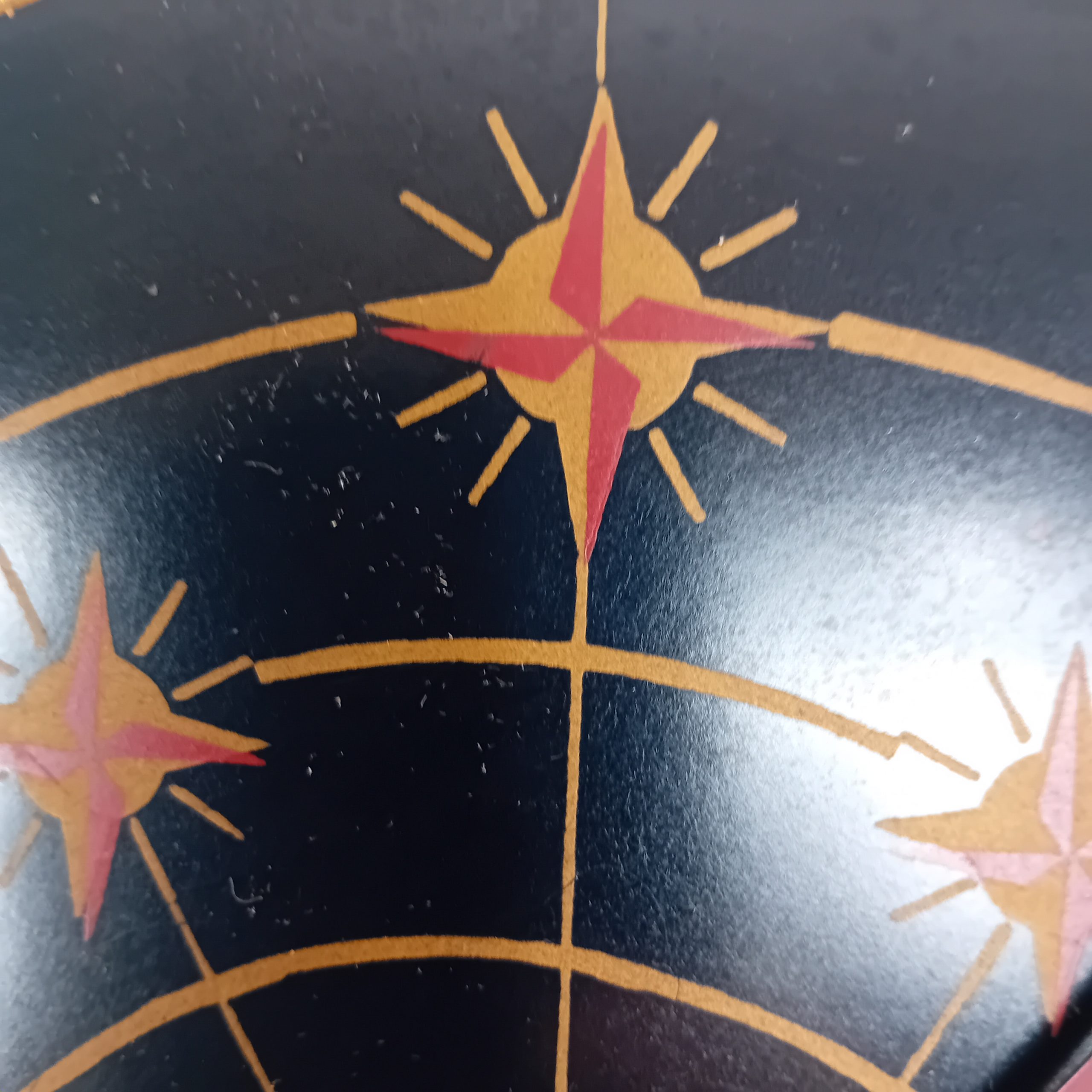 Cerclage en plastique doré, décor sur fond noir je pense sur formica au pochoir.