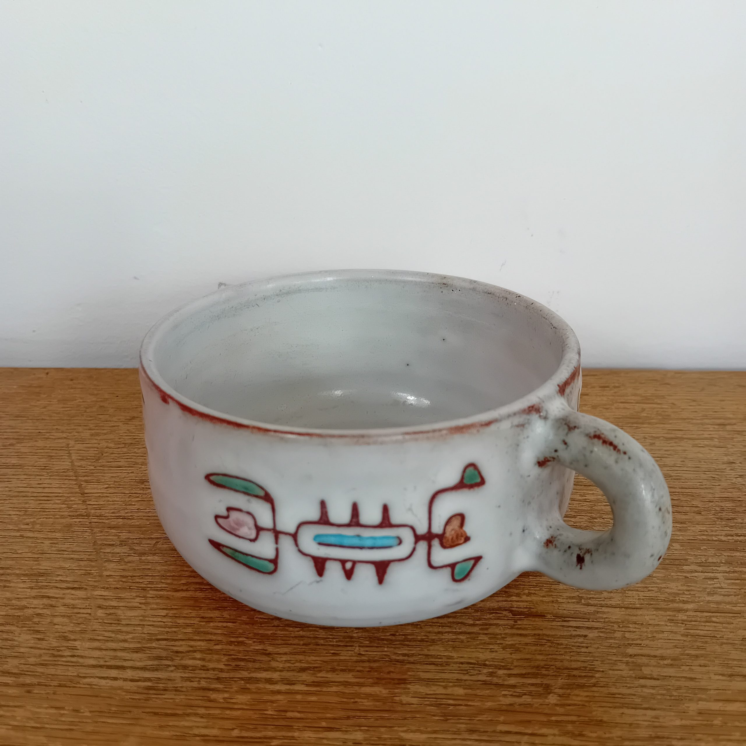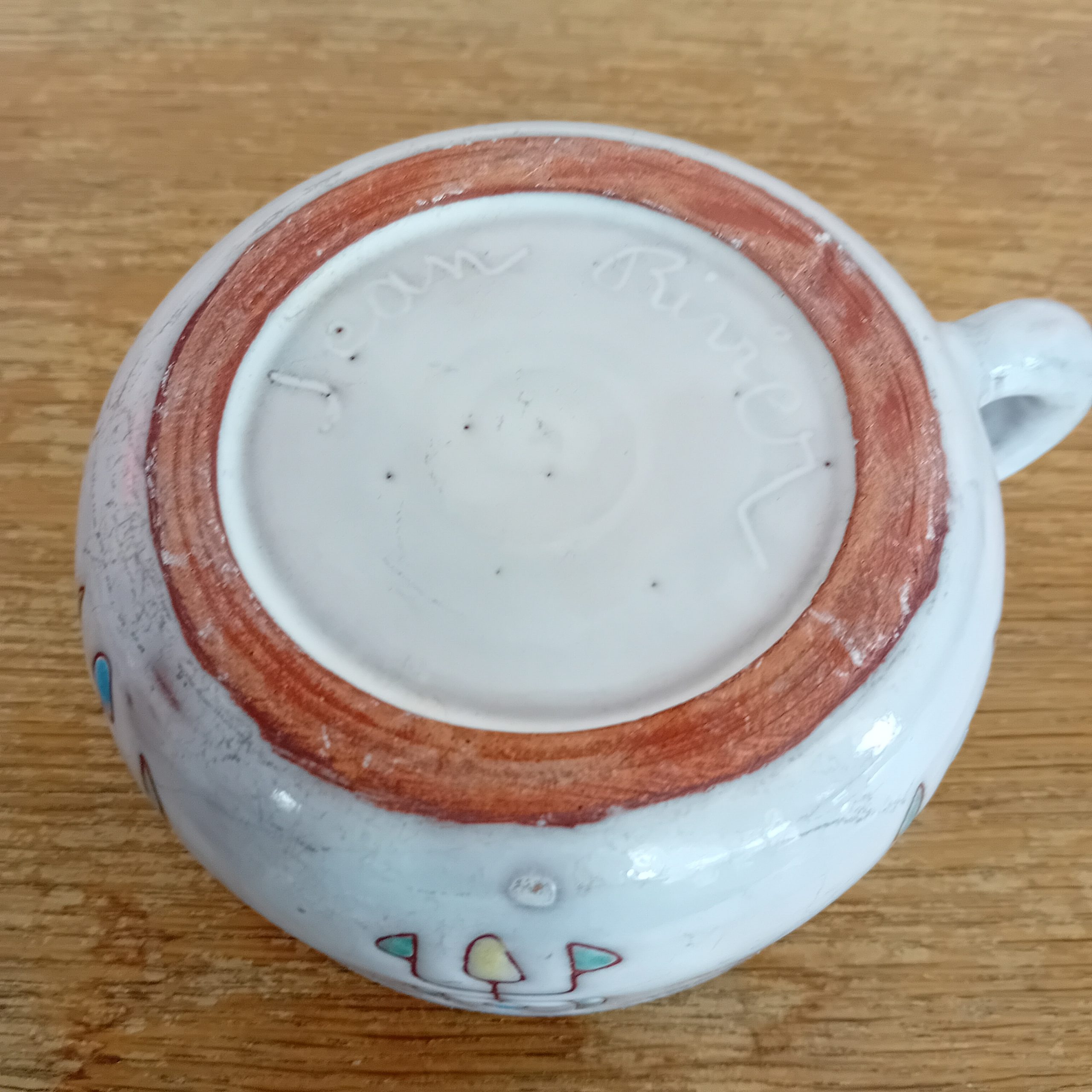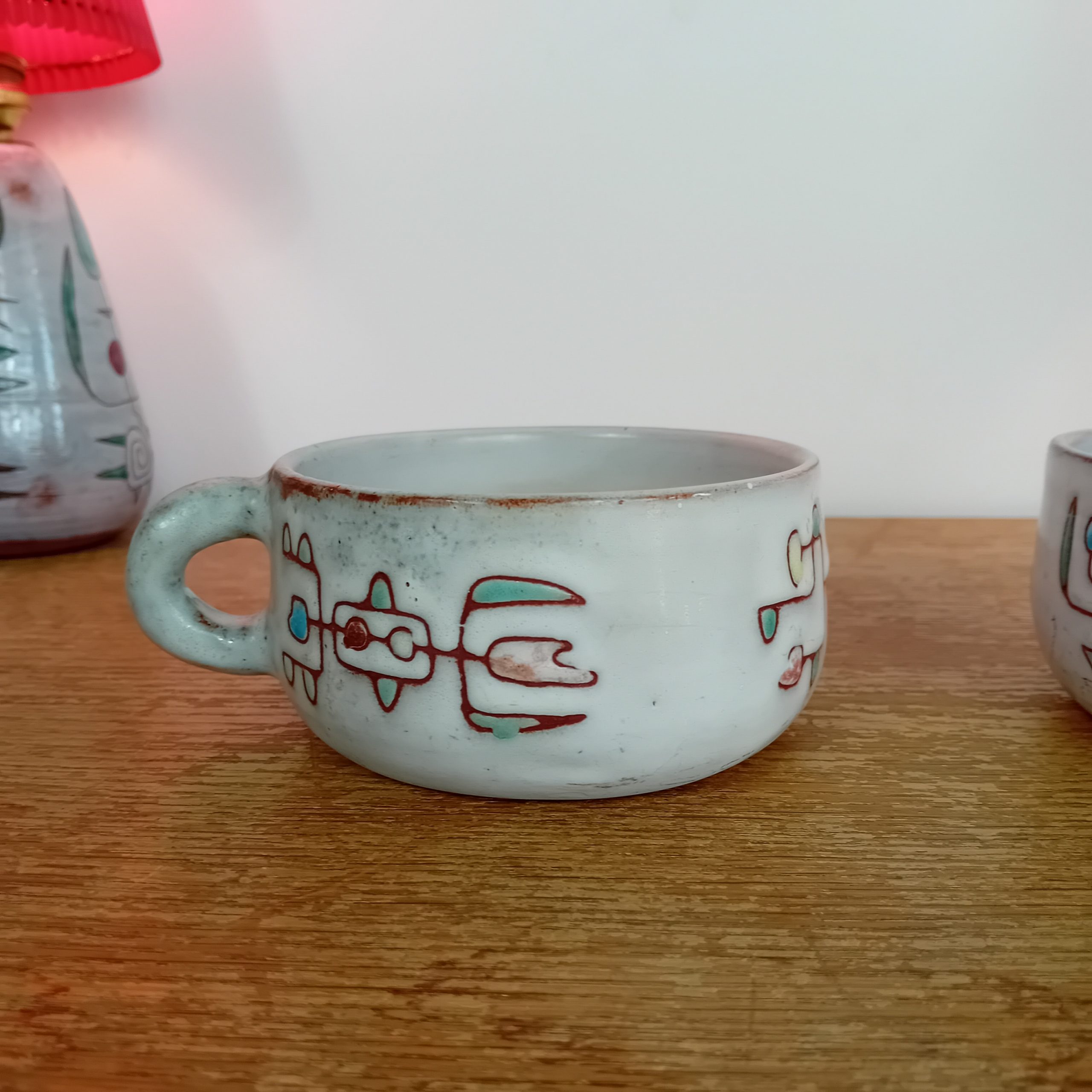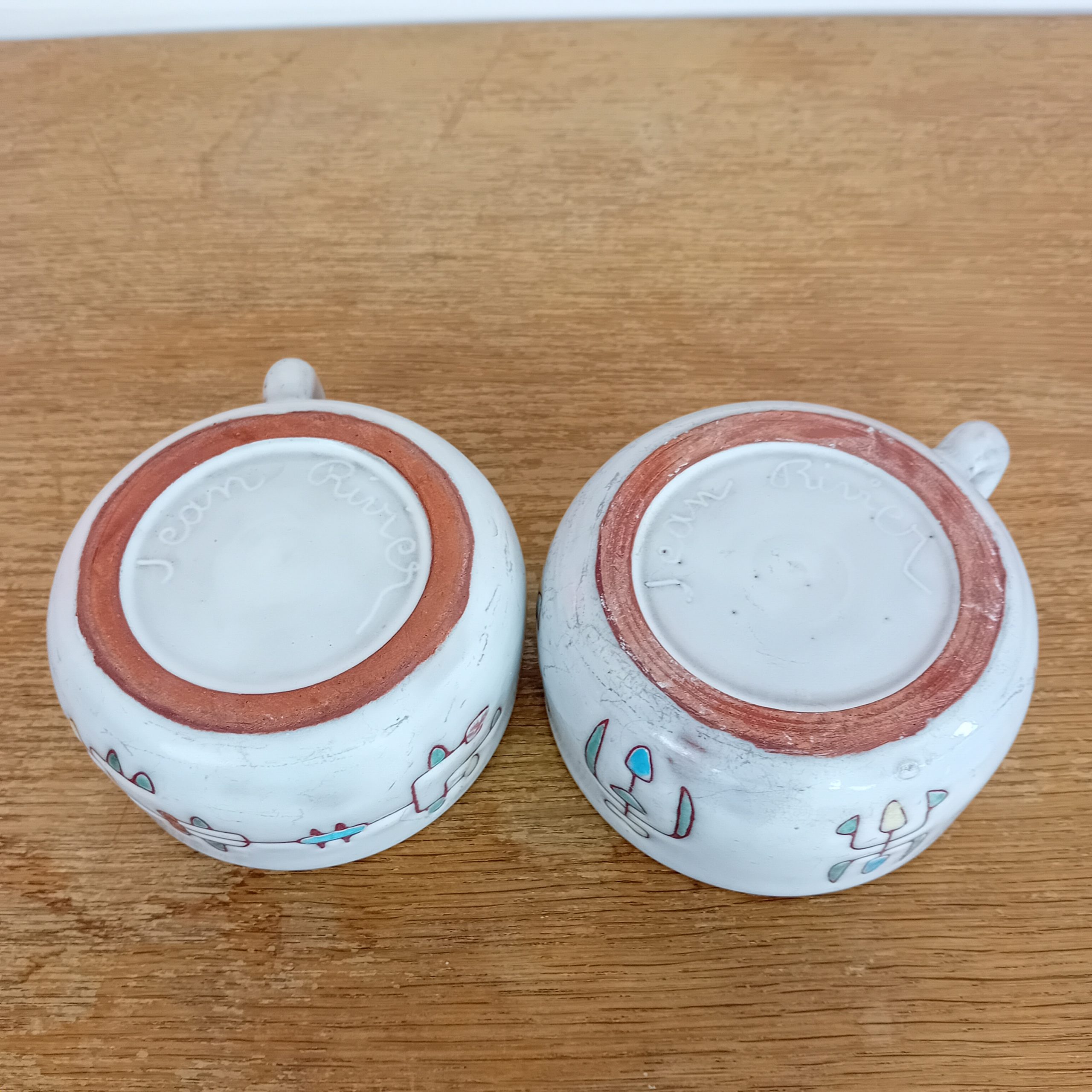 Paire de tasses en céramique signées Jean Rivier, céramiste de Vallauris. Décor abstrait incisé et coloré sur émail blanc, typique des années 1950. Hauteur 5,5 cm, diamètre 11 cm (13,8 cm avec anse). Bon état général avec de petites traces d’usage.