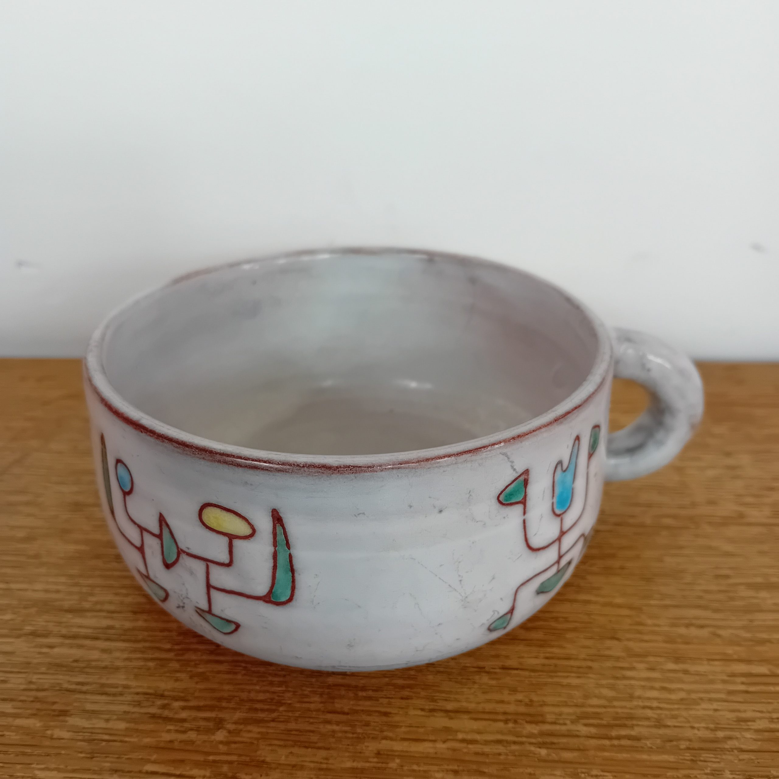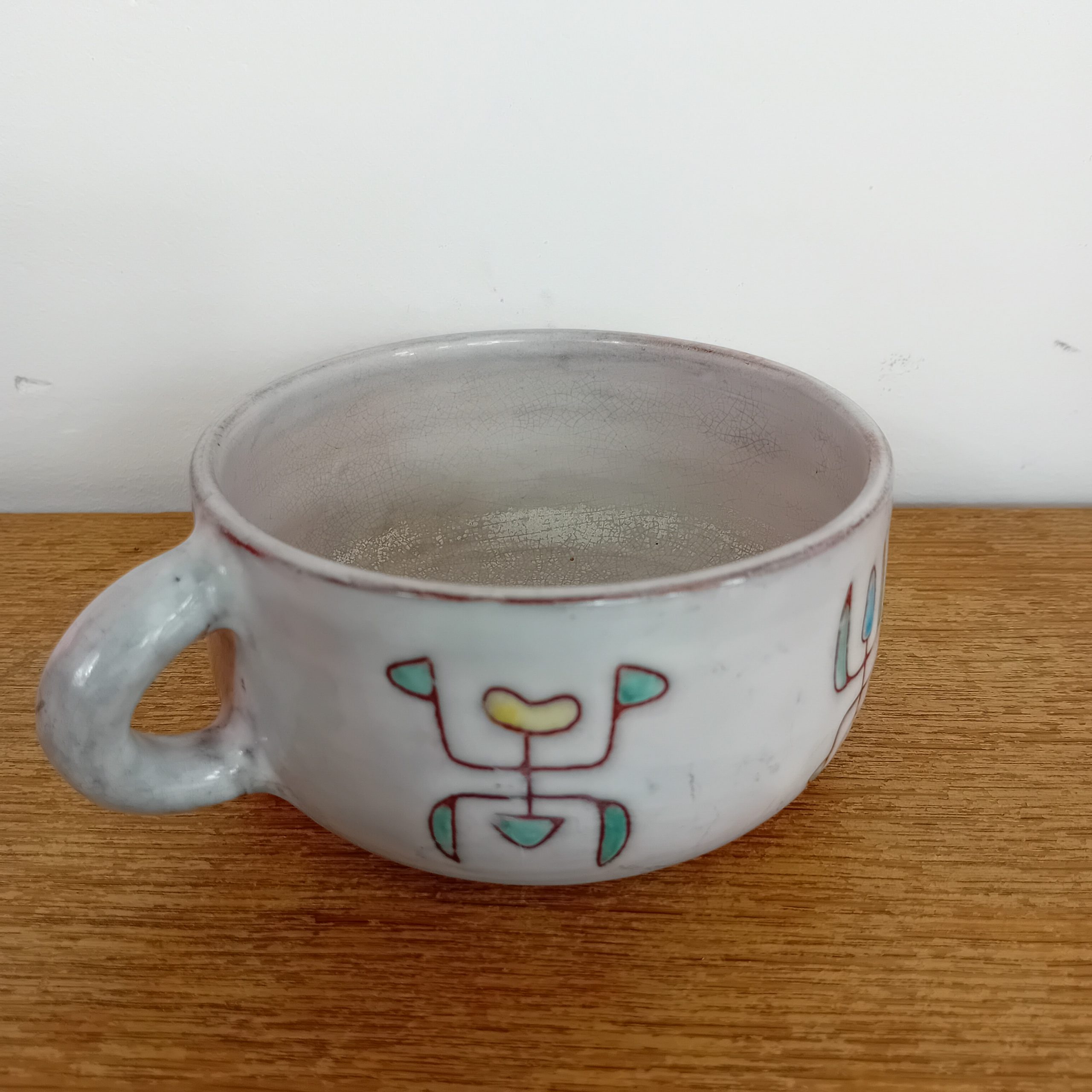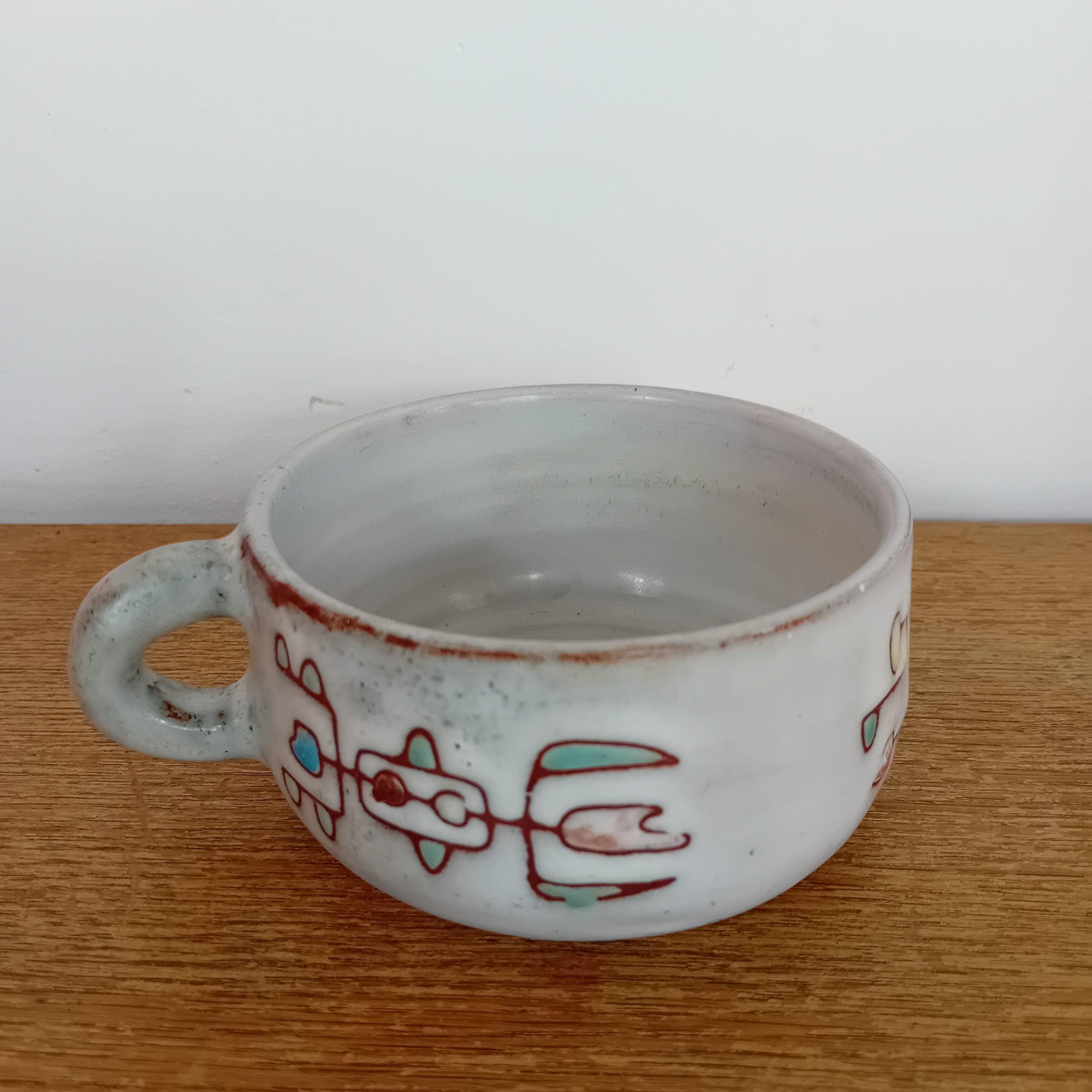 Paire de tasses en céramique signées Jean Rivier, céramiste de Vallauris. Décor abstrait incisé et coloré sur émail blanc, typique des années 1950. Hauteur 5,5 cm, diamètre 11 cm (13,8 cm avec anse). Bon état général avec de petites traces d’usage.