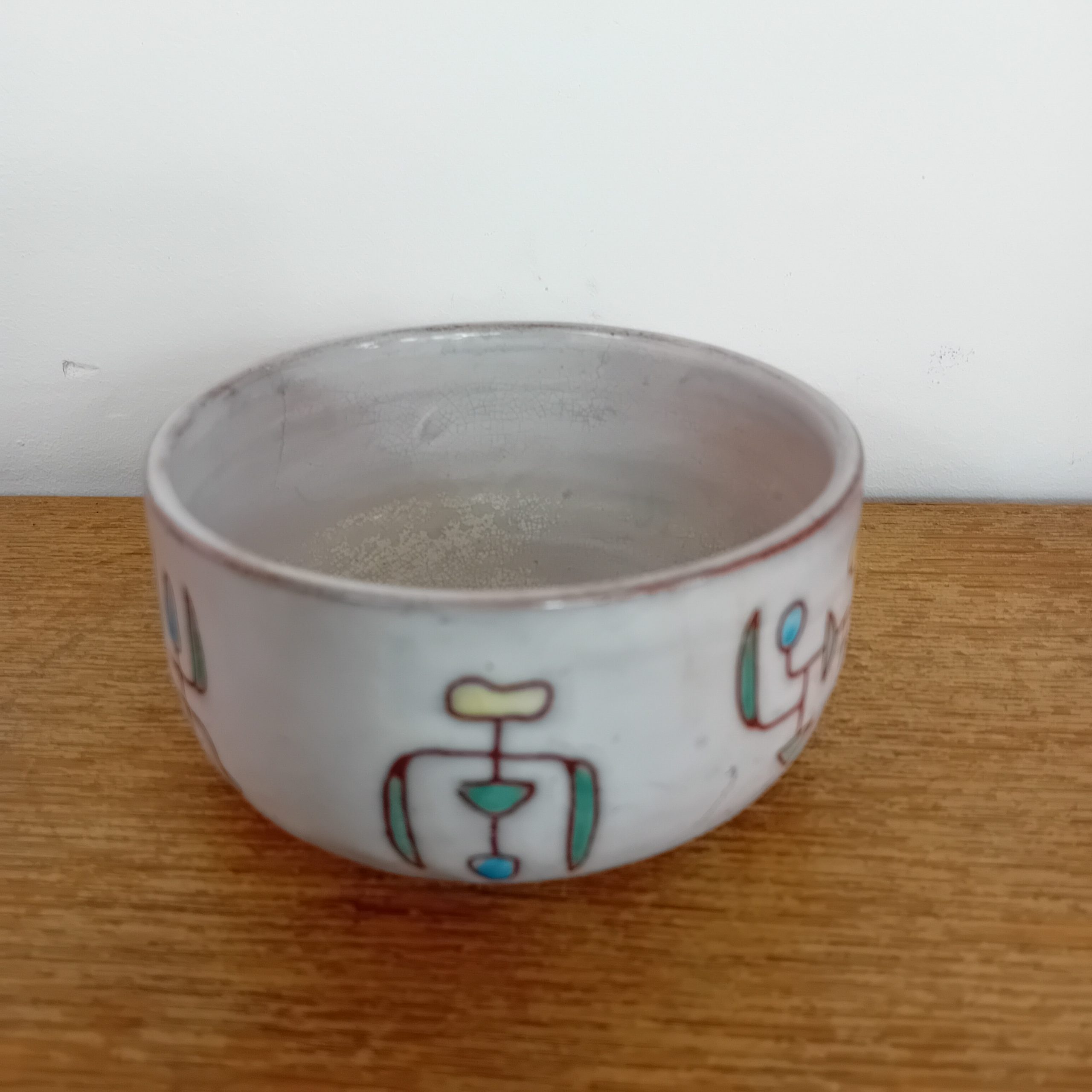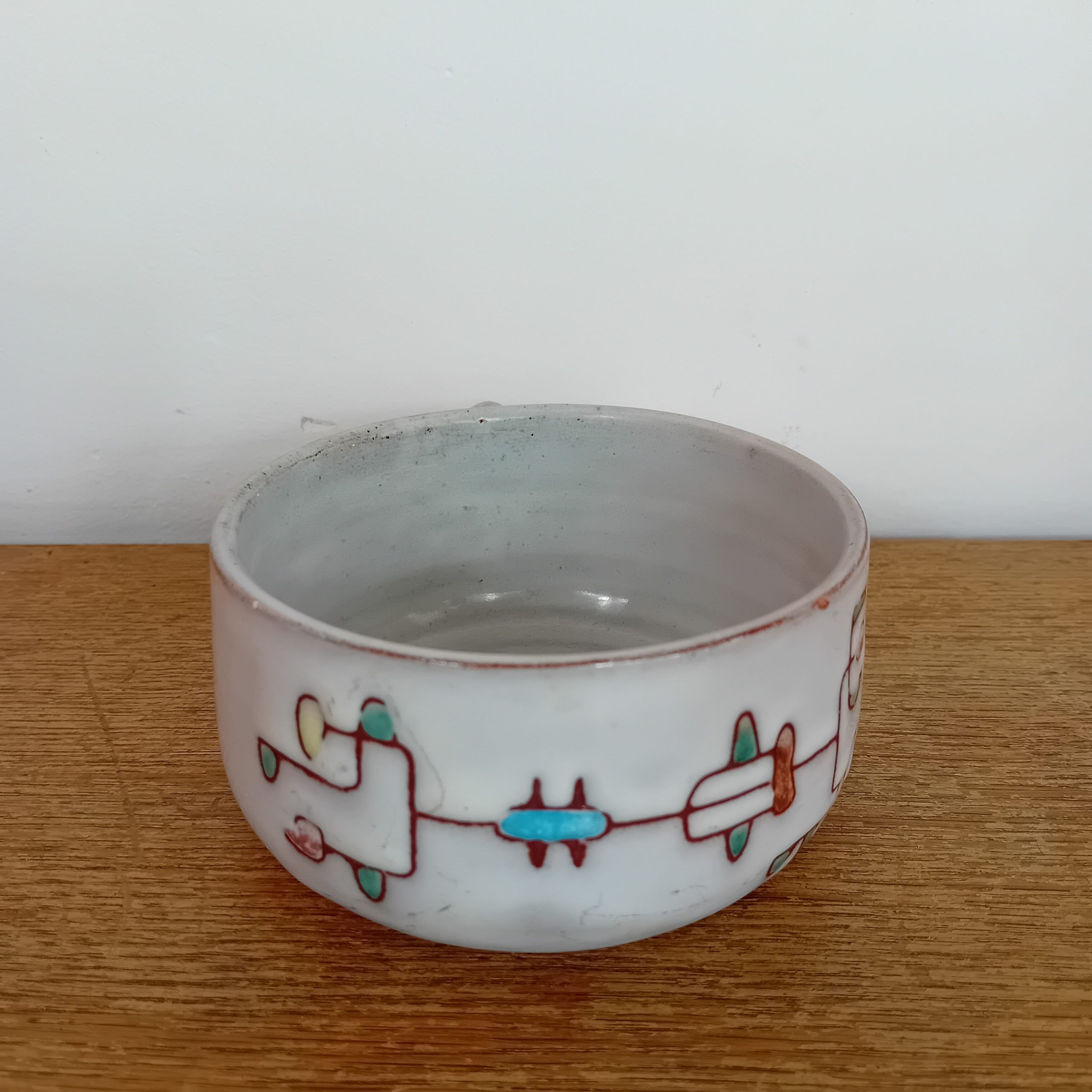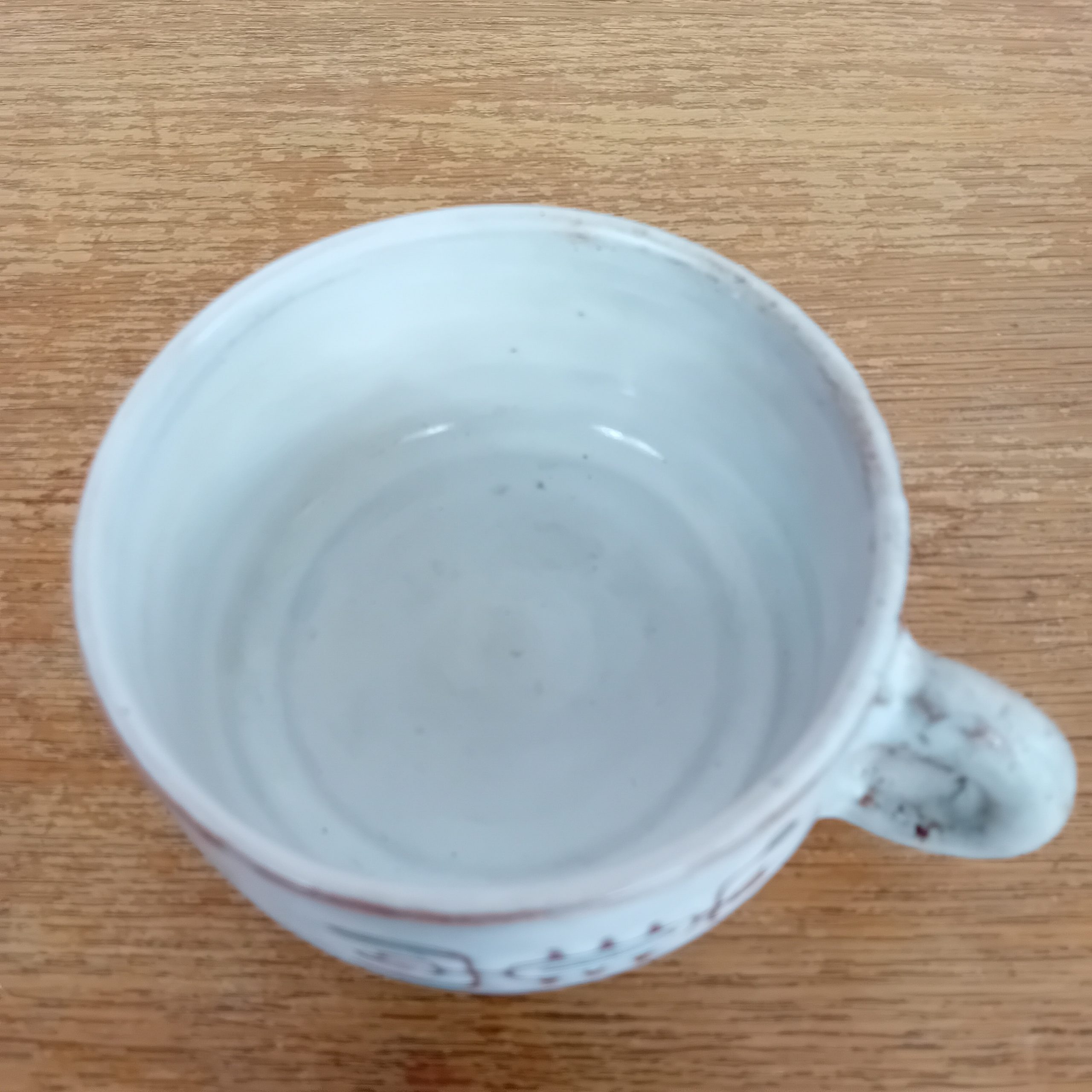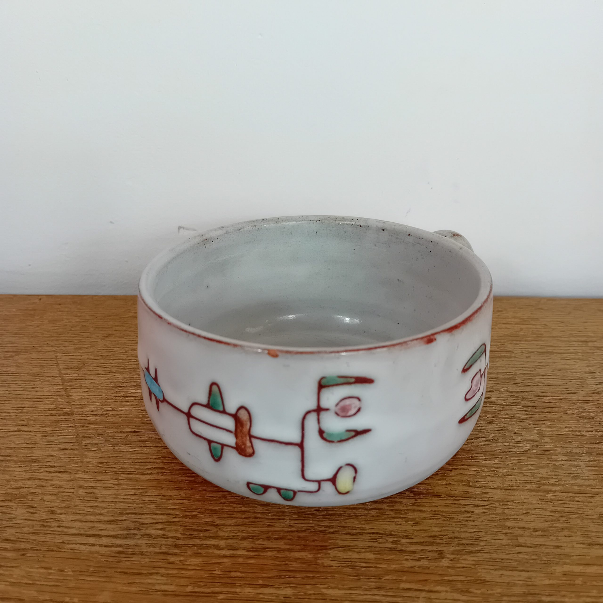 Paire de tasses en céramique signées Jean Rivier, céramiste de Vallauris. Décor abstrait incisé et coloré sur émail blanc, typique des années 1950. Hauteur 5,5 cm, diamètre 11 cm (13,8 cm avec anse). Bon état général avec de petites traces d’usage.