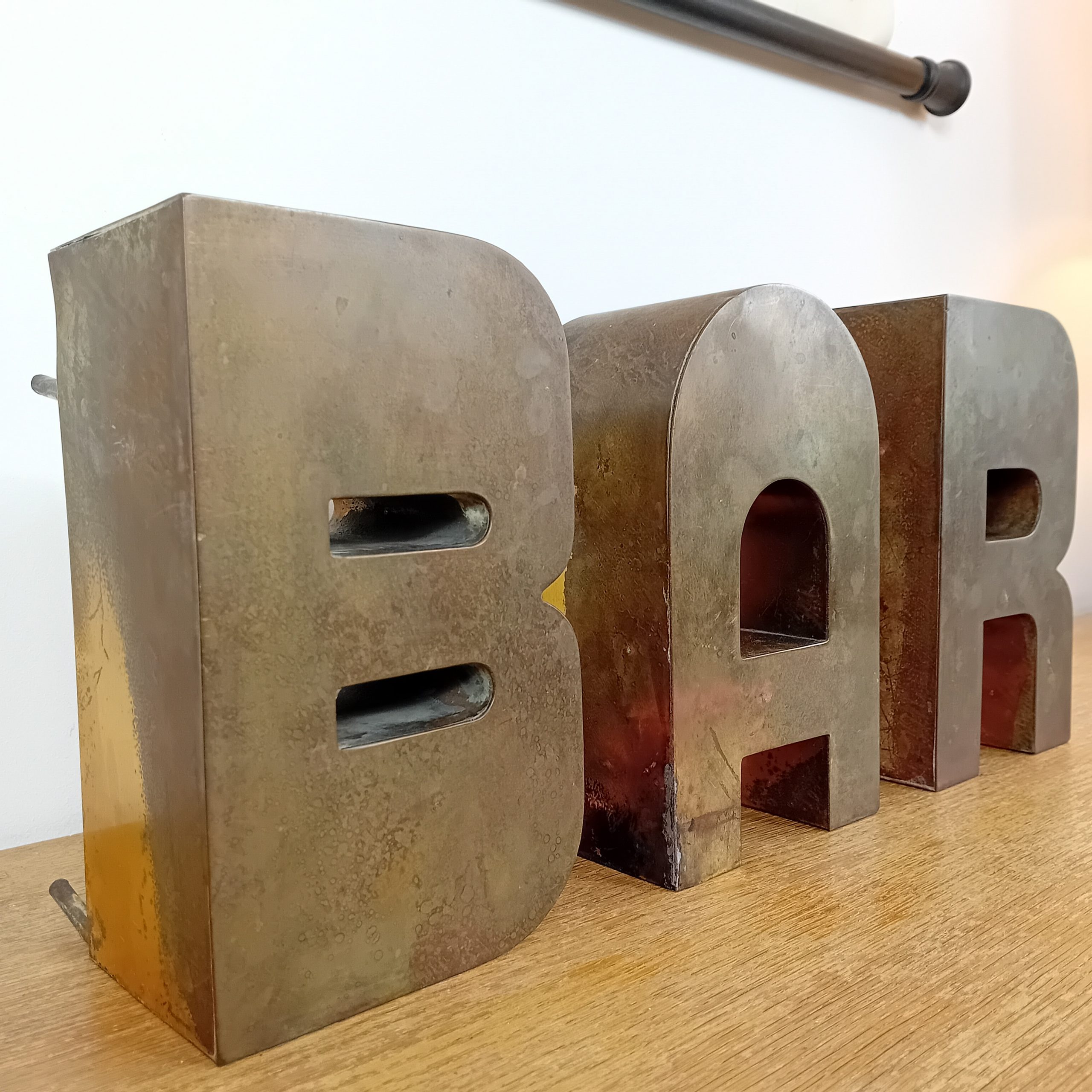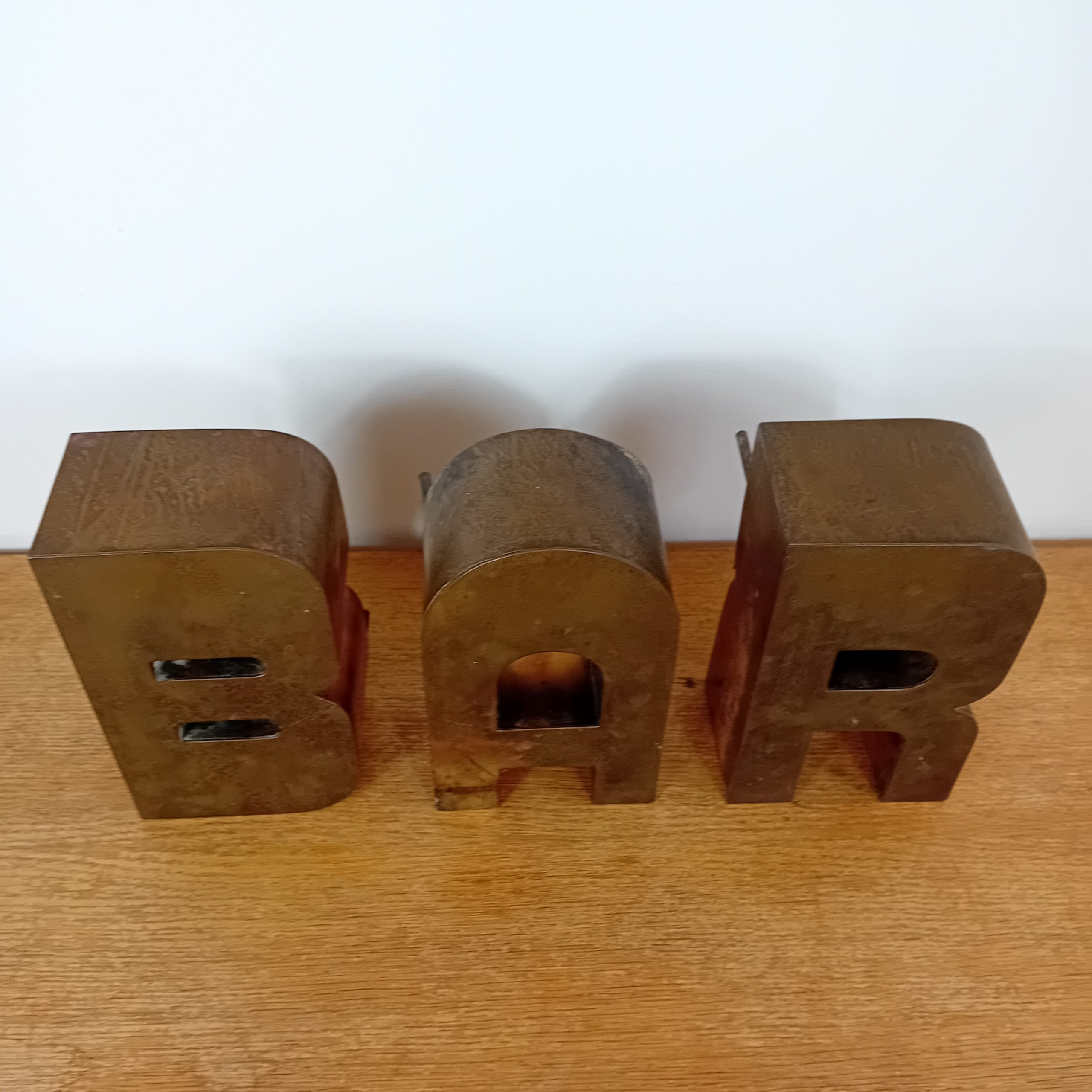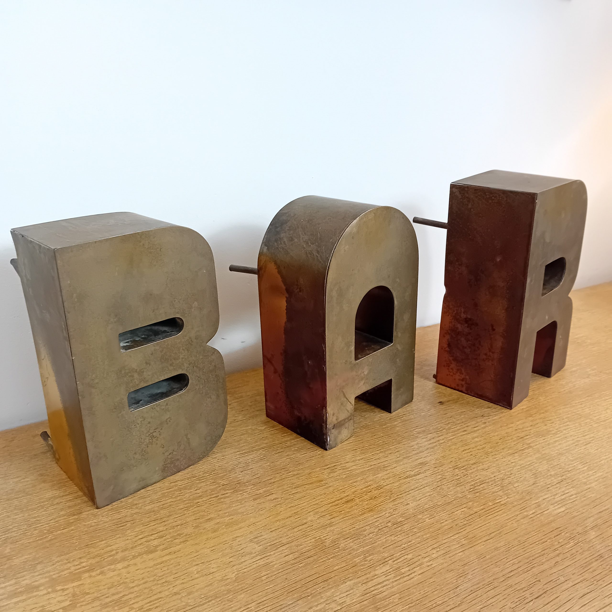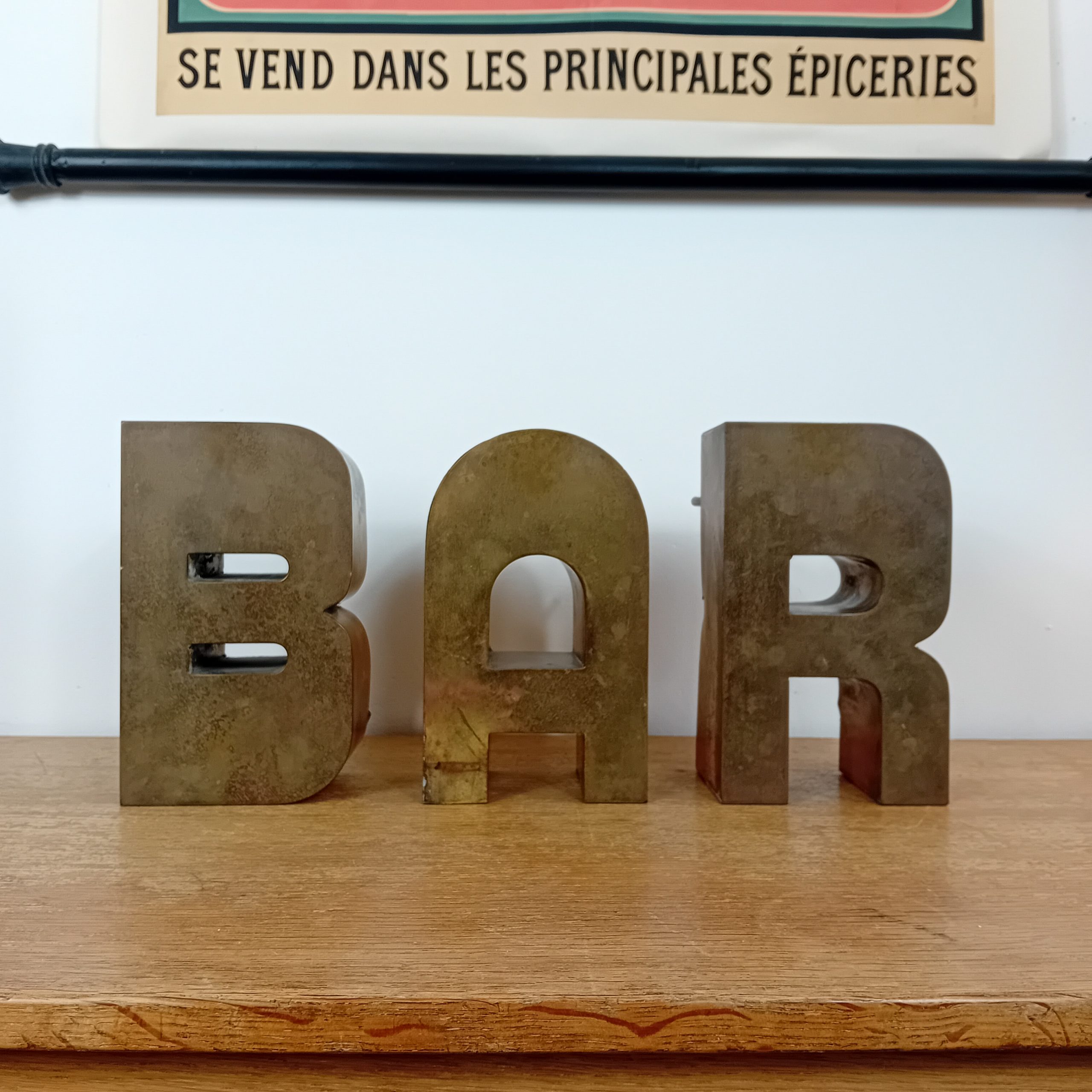 Un bel ensemble de 3 lettres BAR en laiton, laissé dans sa patine.