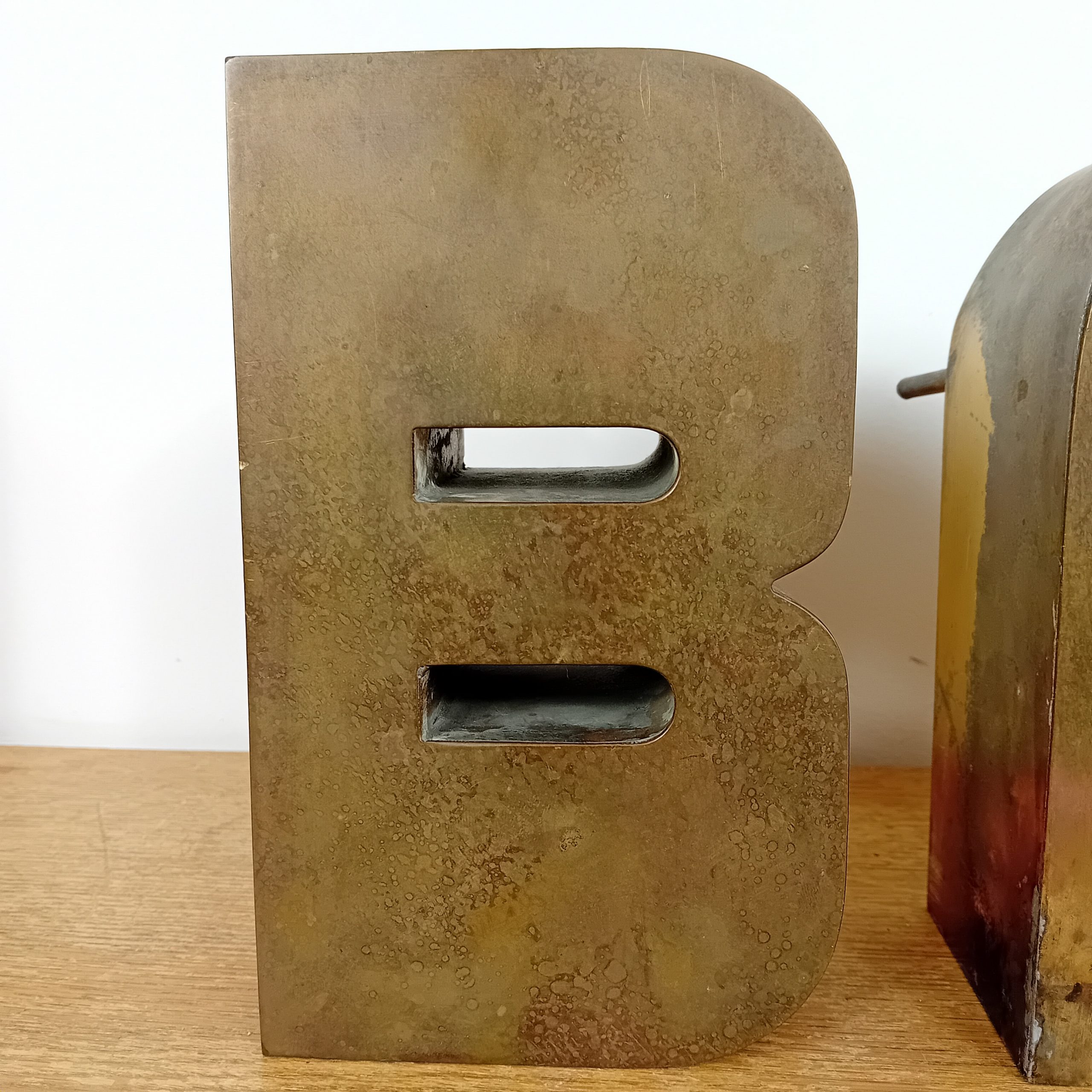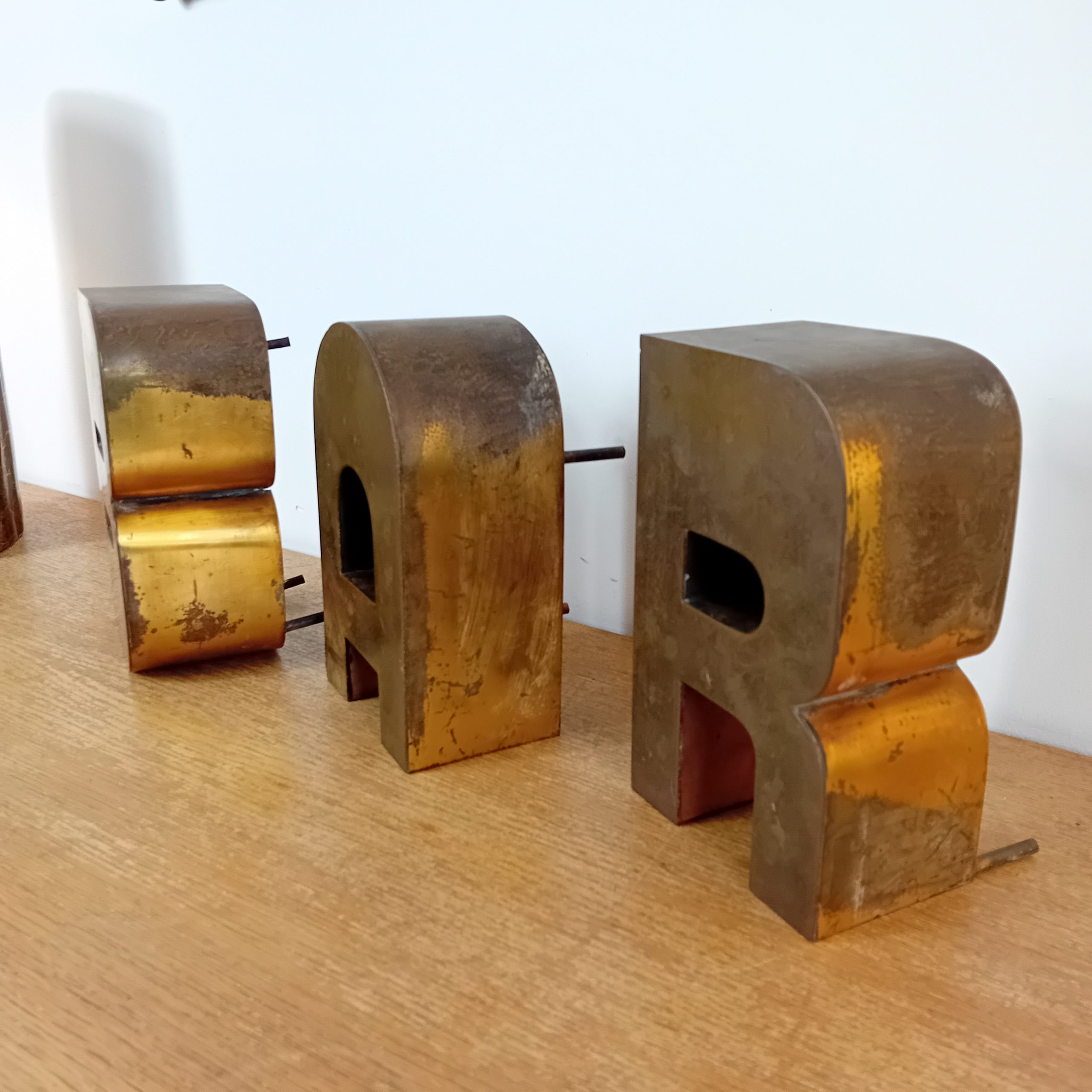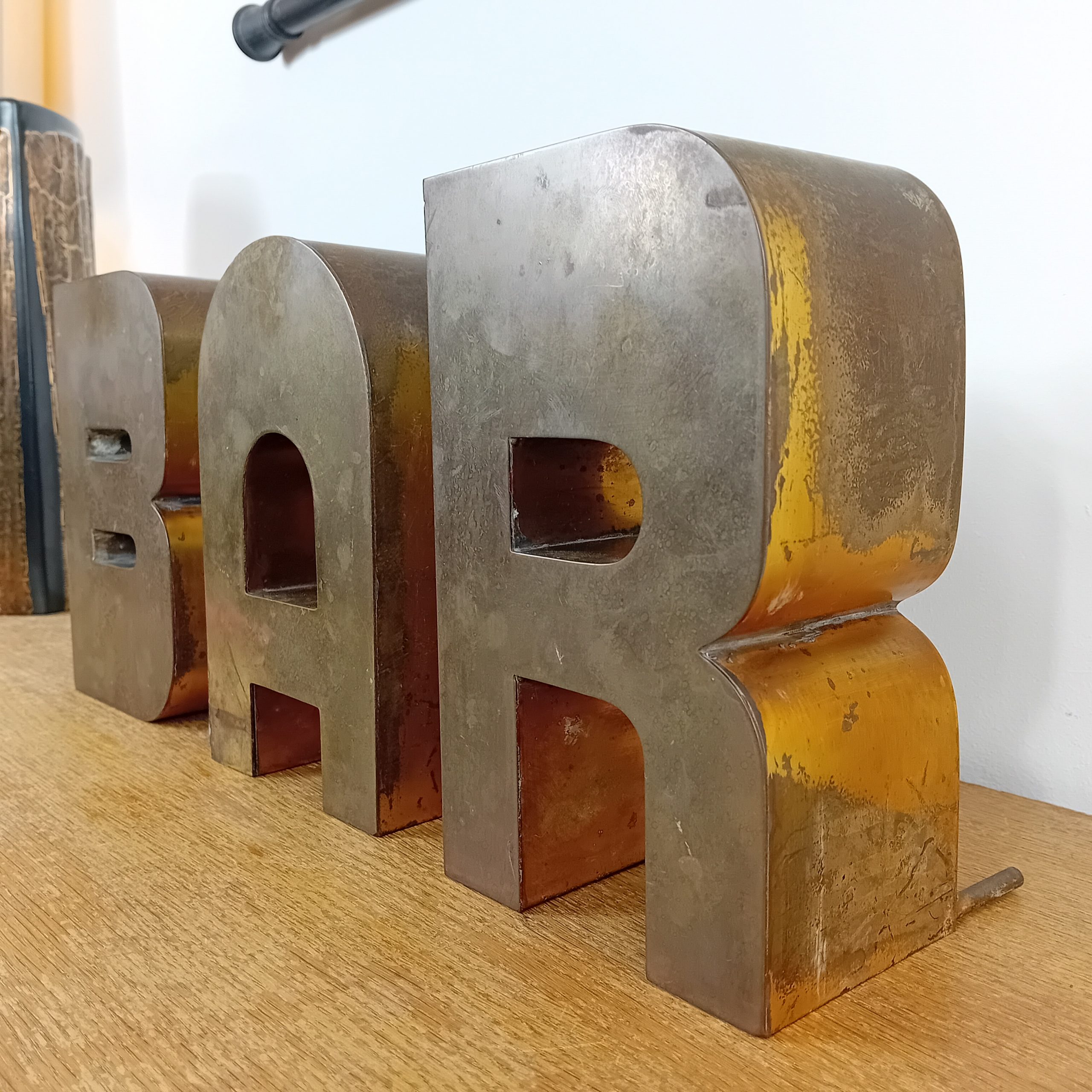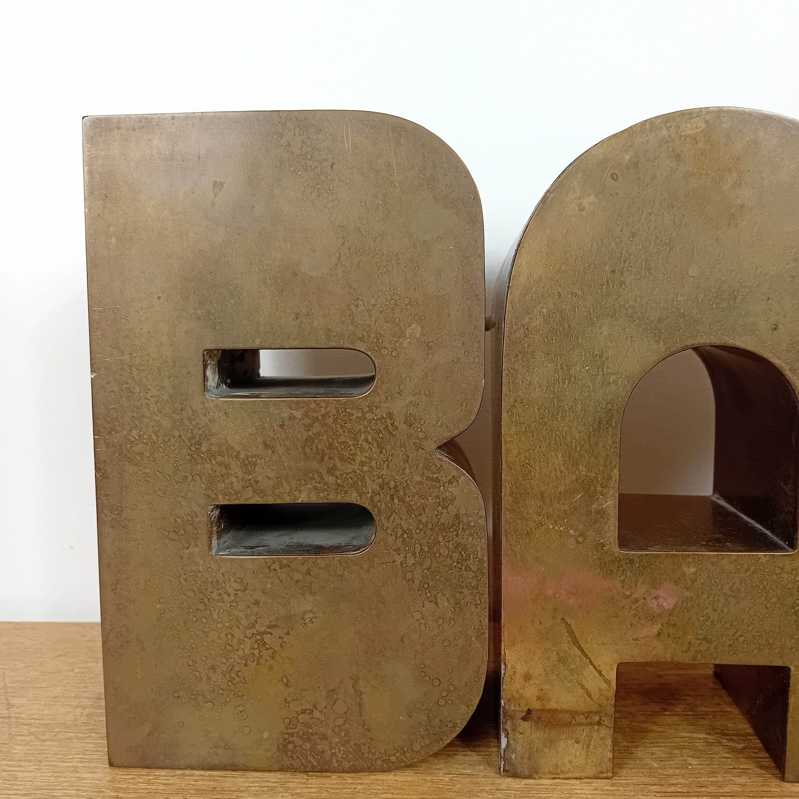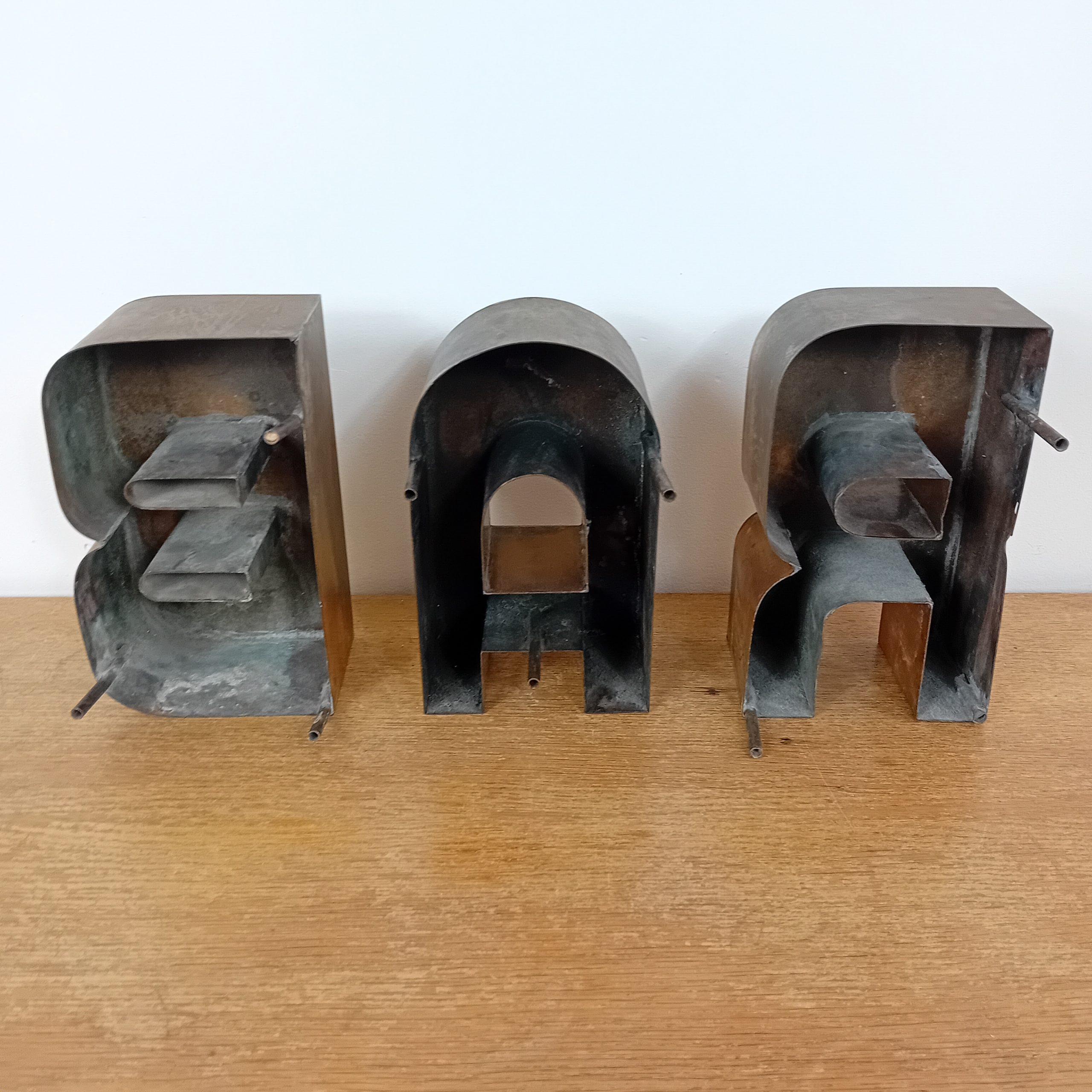 Un bel ensemble de 3 lettres BAR en laiton, laissé dans sa patine.