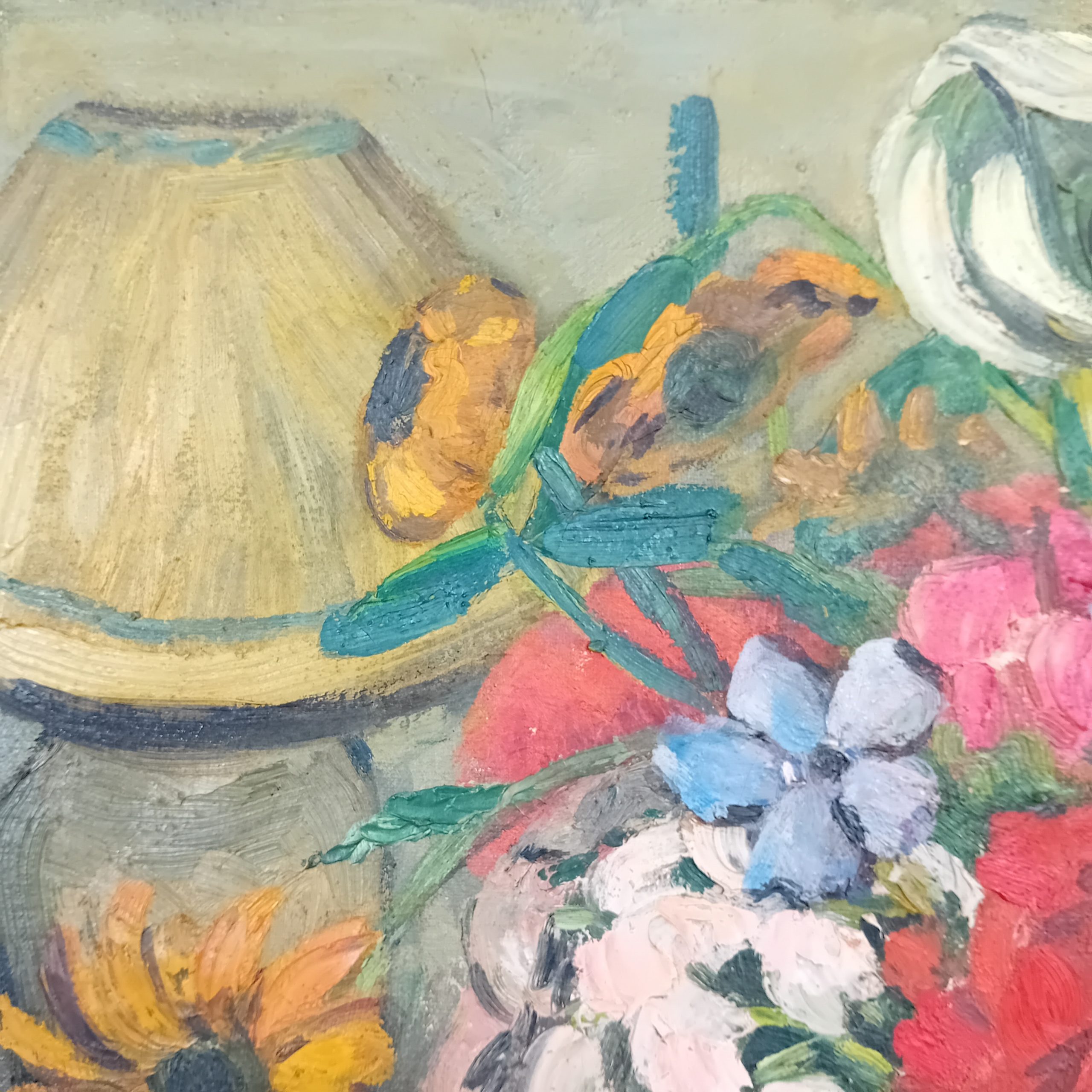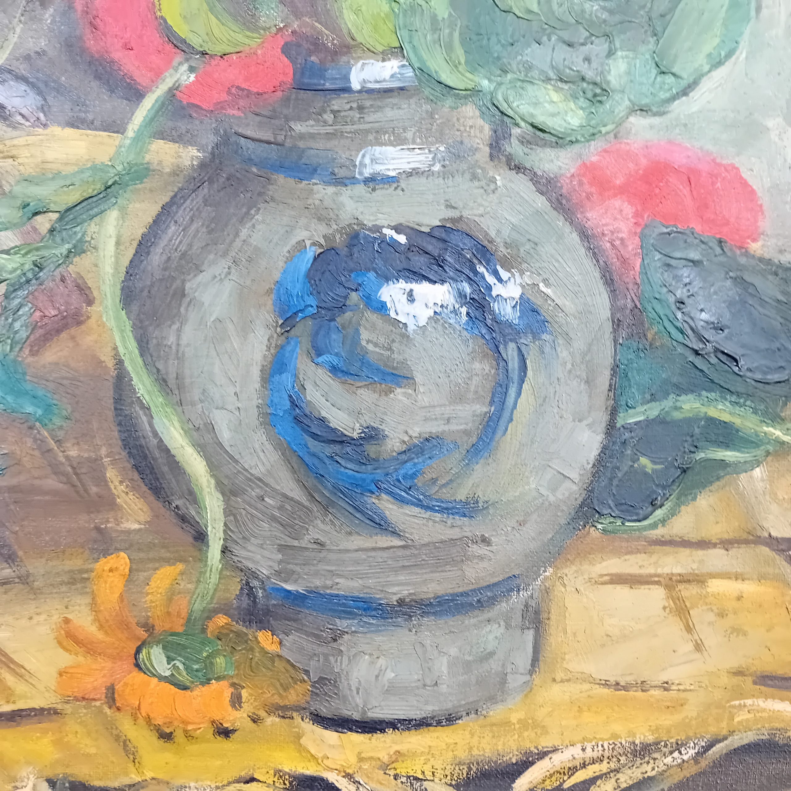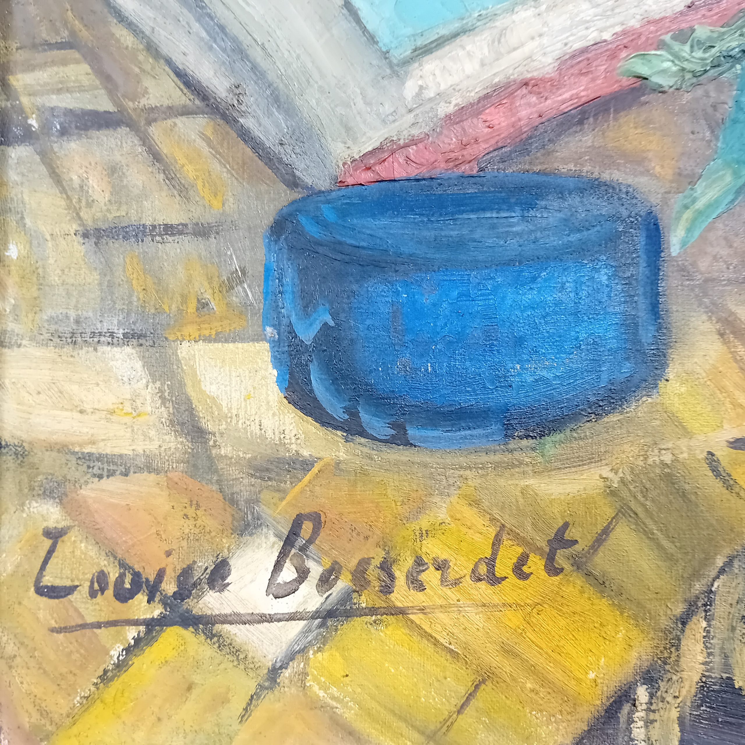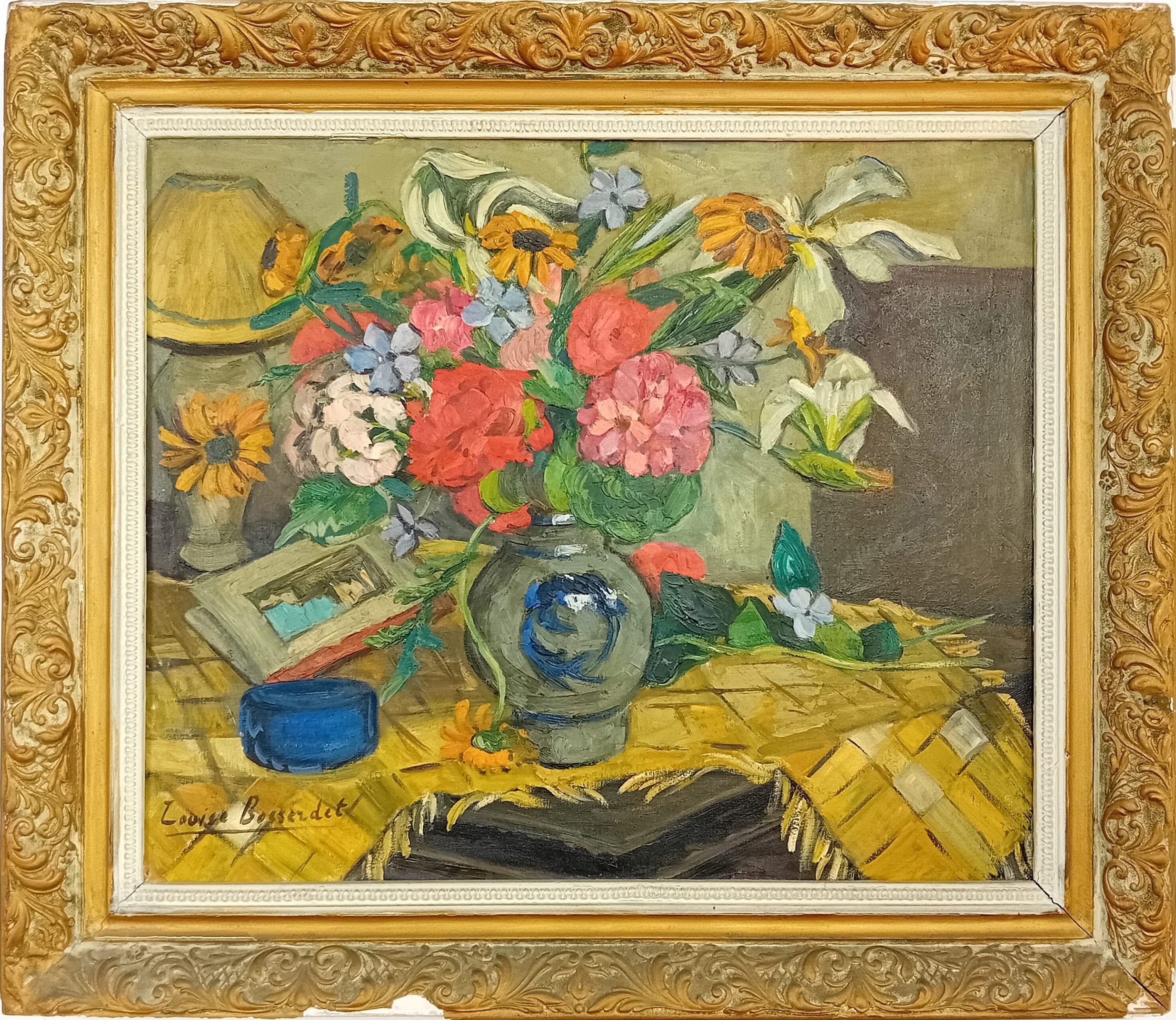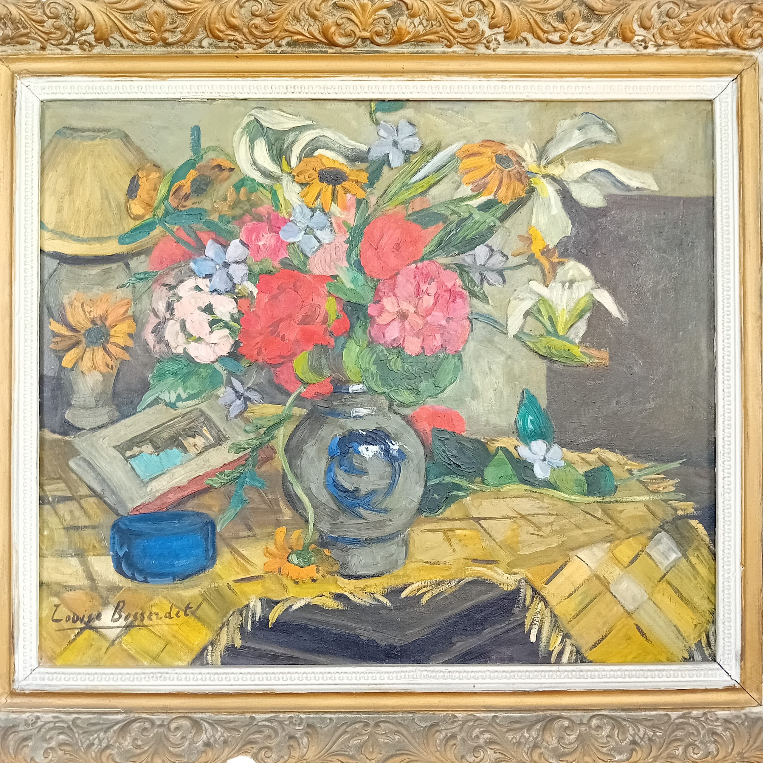 Belle nature morte peinte par Louise Bosserdet (1887–1981), artiste de l’École d’Alger. La composition met en valeur un bouquet coloré dans un vase décoré, posé sur une table avec divers objets. La lumière et la richesse des couleurs traduisent l’influence orientale et méditerranéenne chère à l’artiste.
