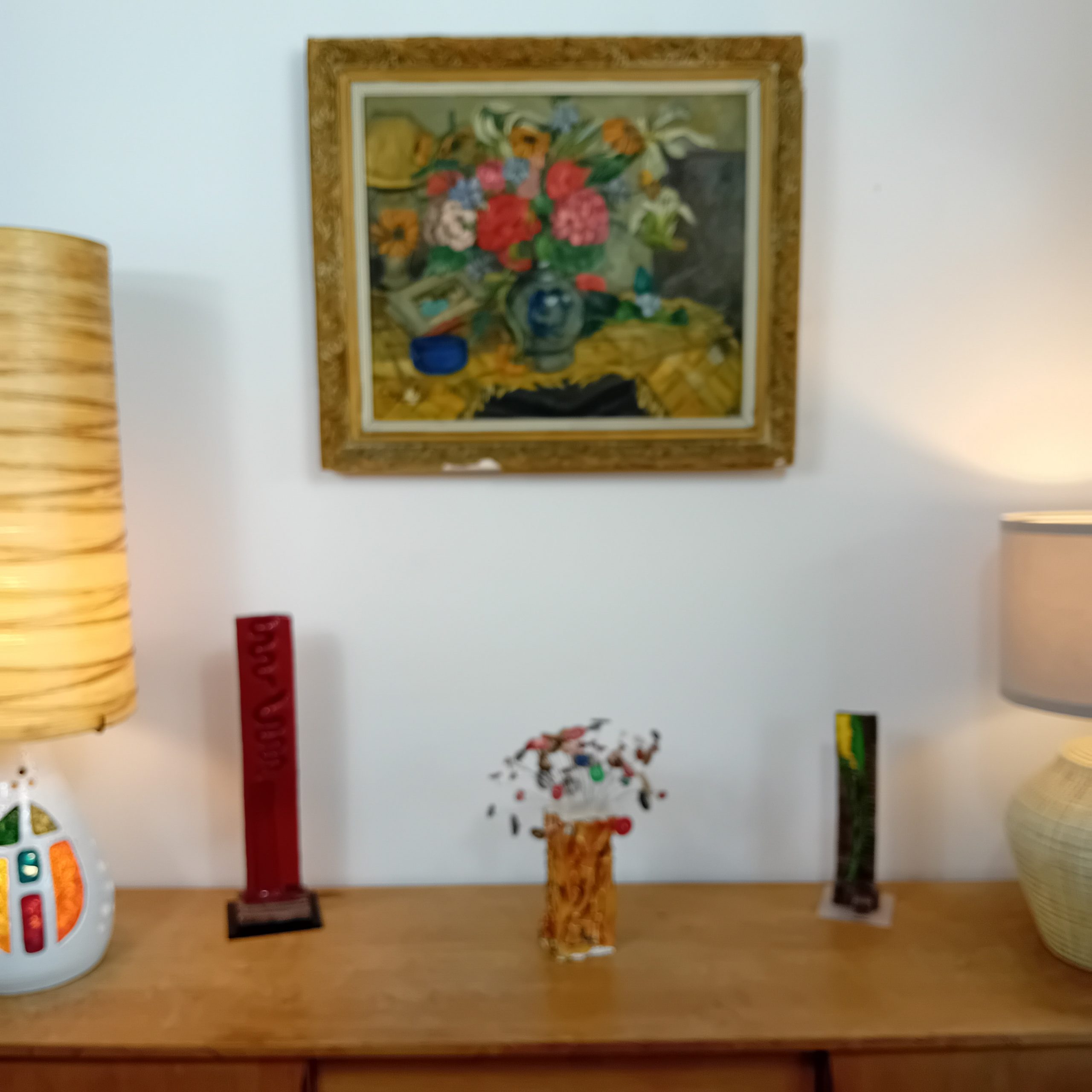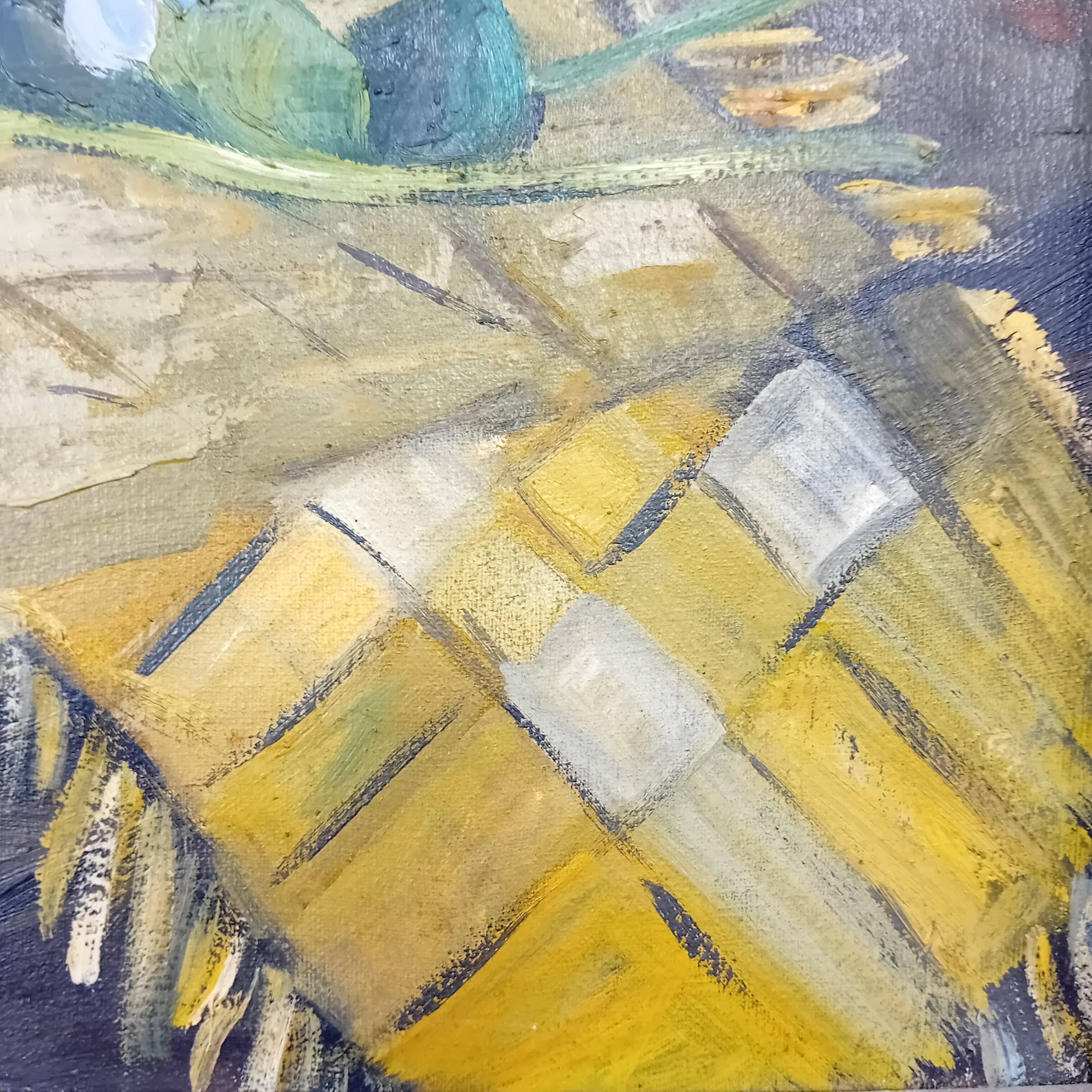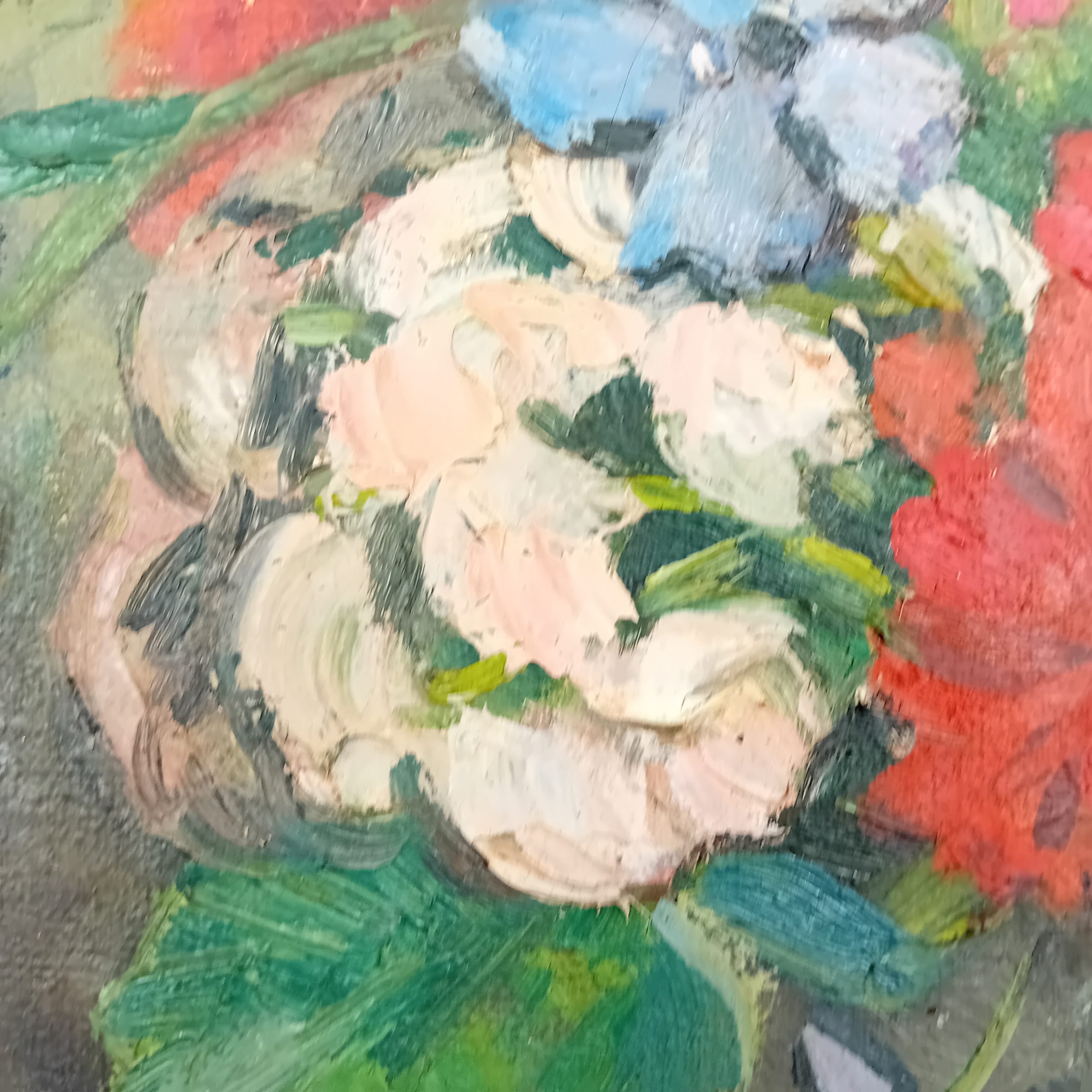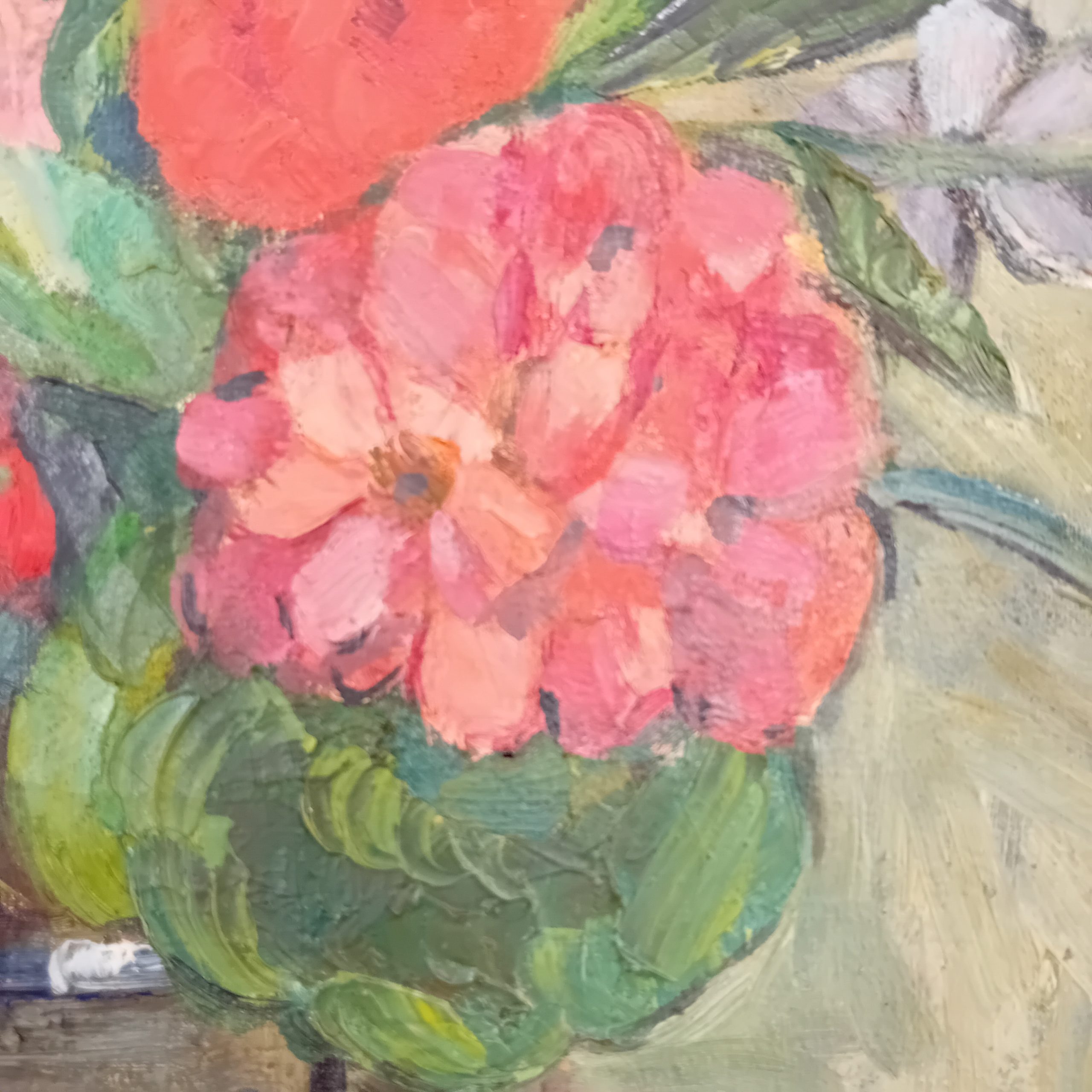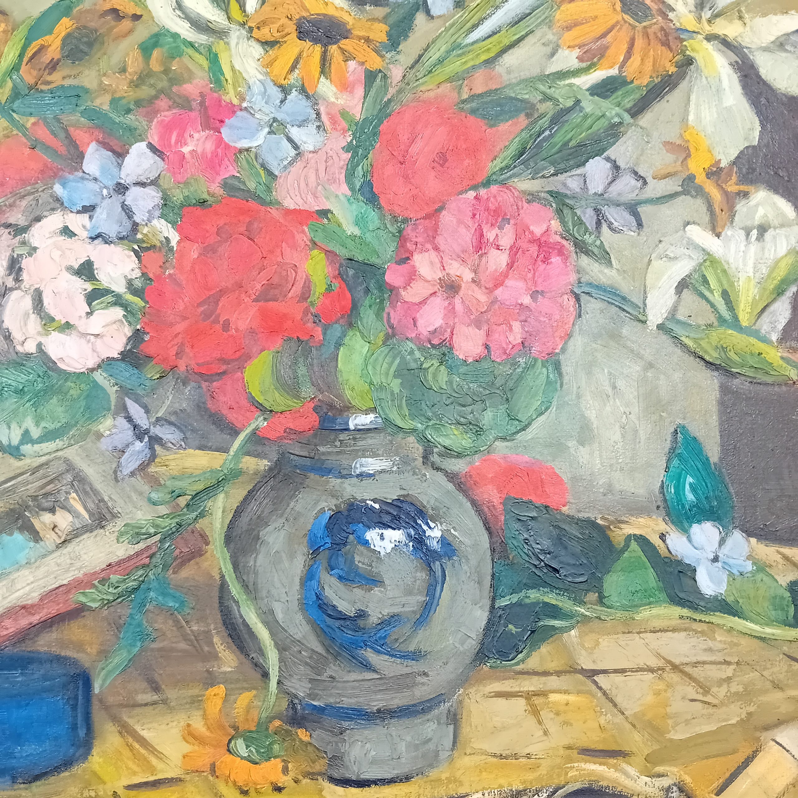 Belle nature morte peinte par Louise Bosserdet (1887–1981), artiste de l’École d’Alger. La composition met en valeur un bouquet coloré dans un vase décoré, posé sur une table avec divers objets. La lumière et la richesse des couleurs traduisent l’influence orientale et méditerranéenne chère à l’artiste.