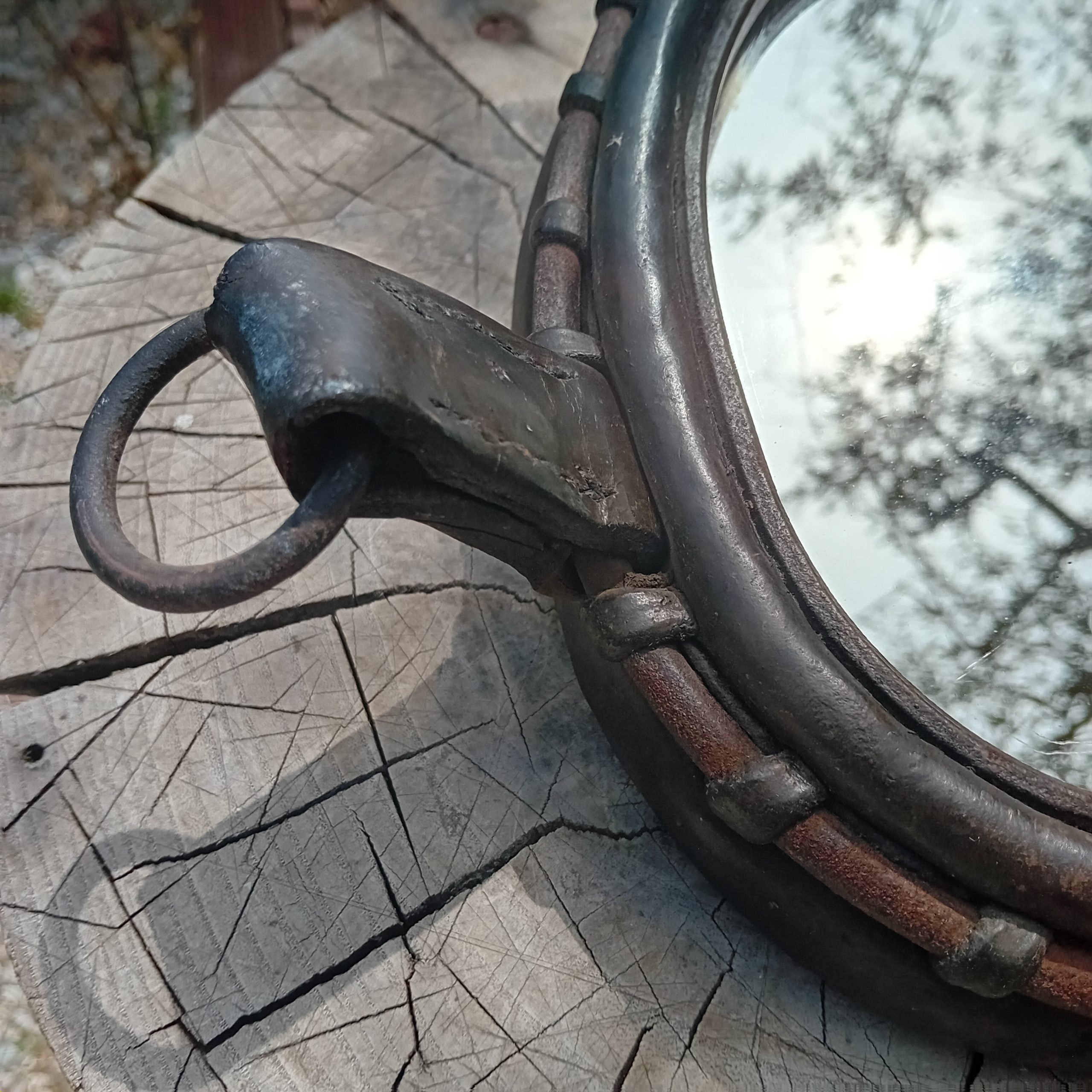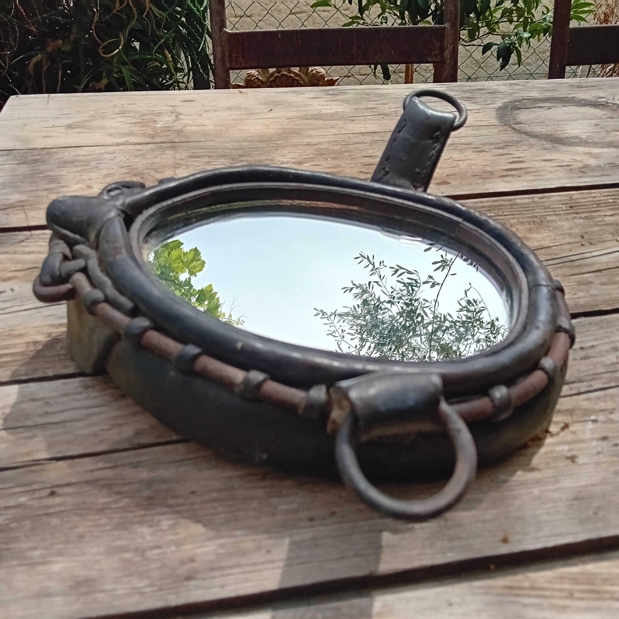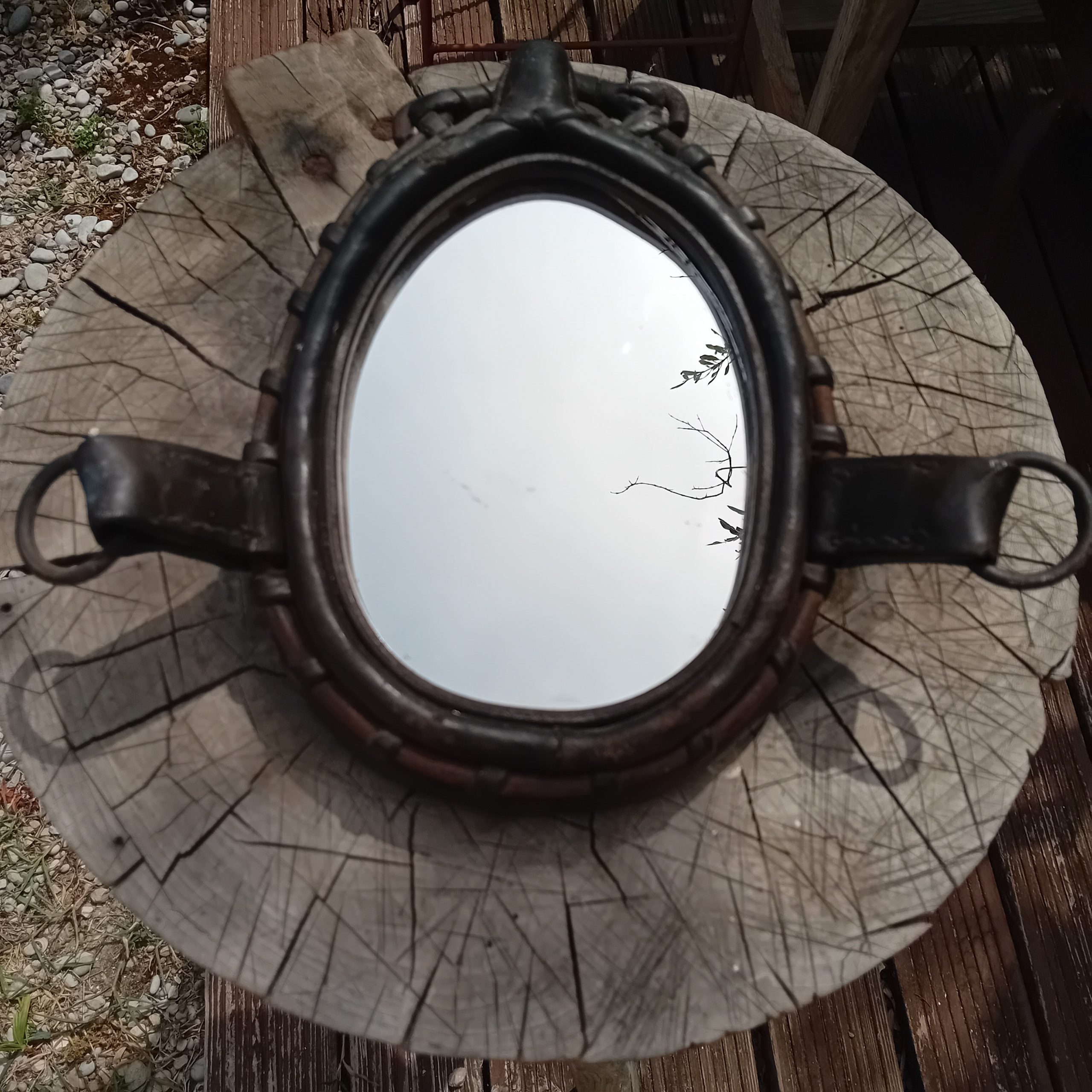Objet insolite et singulier, ce petit miroir ovale est inséré dans un ancien collier animalier en cuir et métal, probablement destiné à un chien de garde ou une chèvre de ferme.