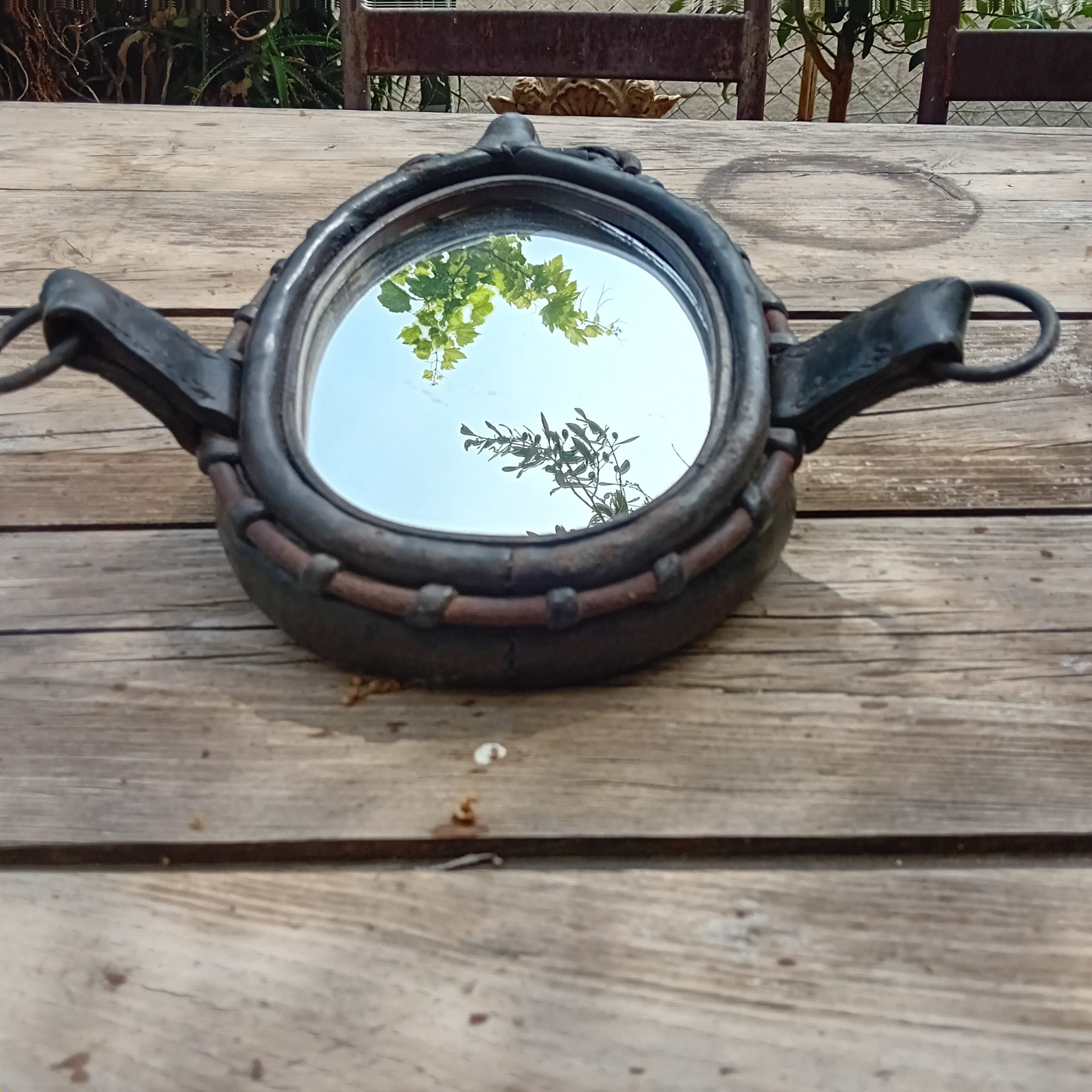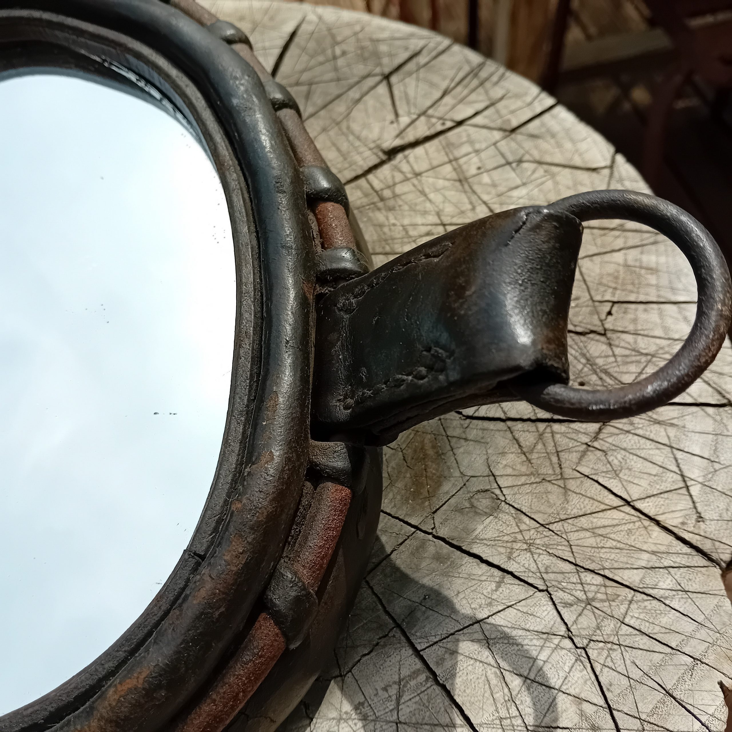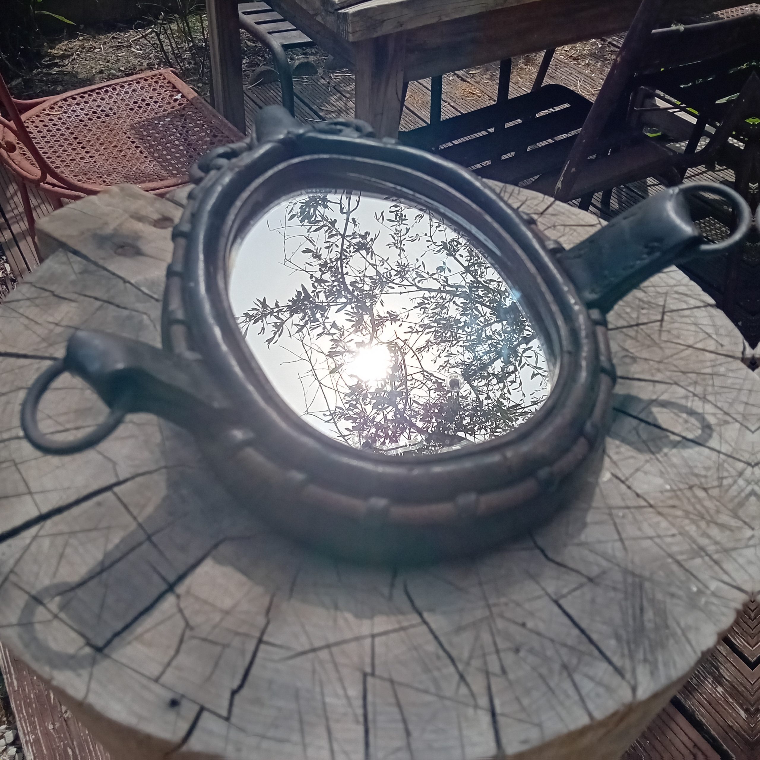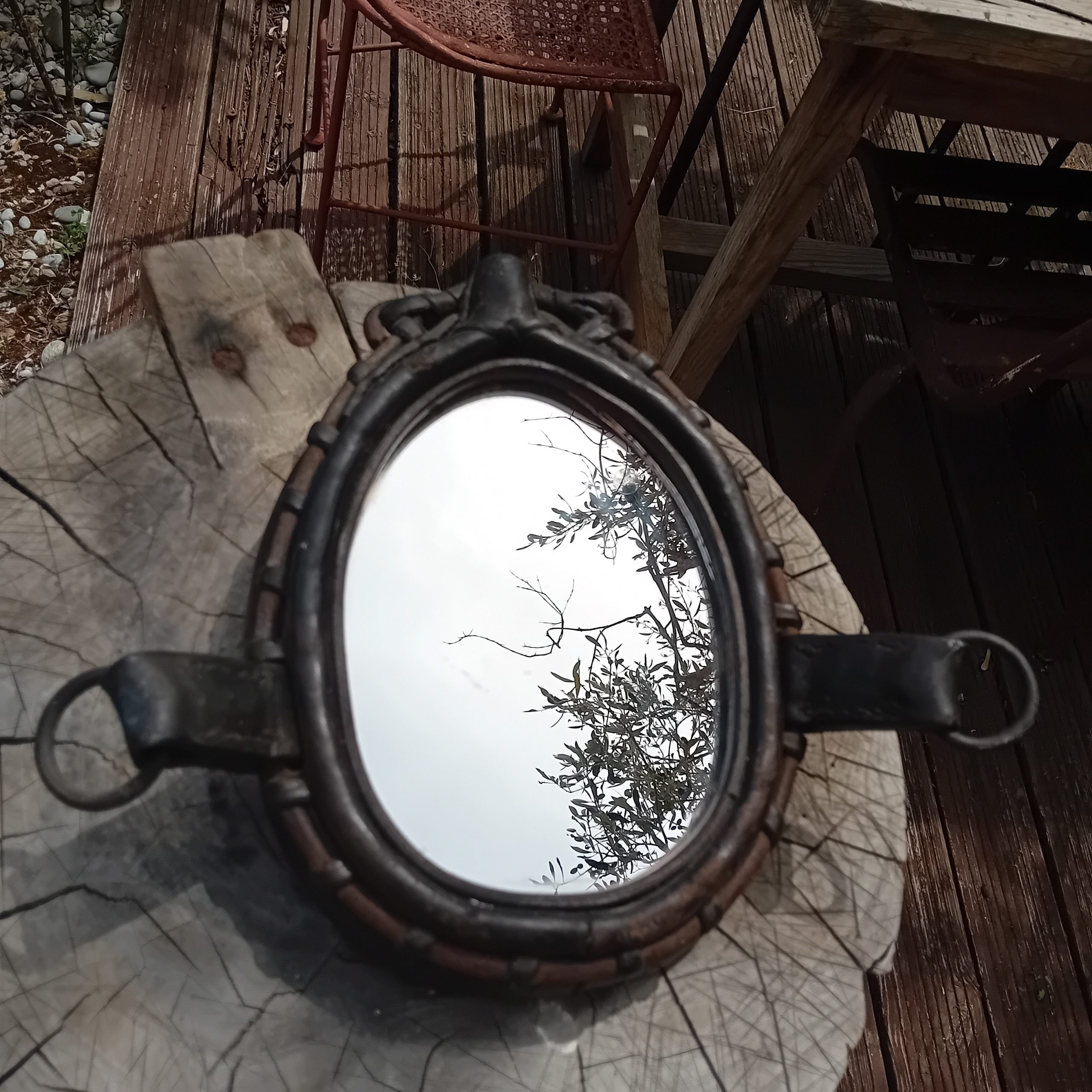Objet insolite et singulier, ce petit miroir ovale est inséré dans un ancien collier animalier en cuir et métal, probablement destiné à un chien de garde ou une chèvre de ferme.