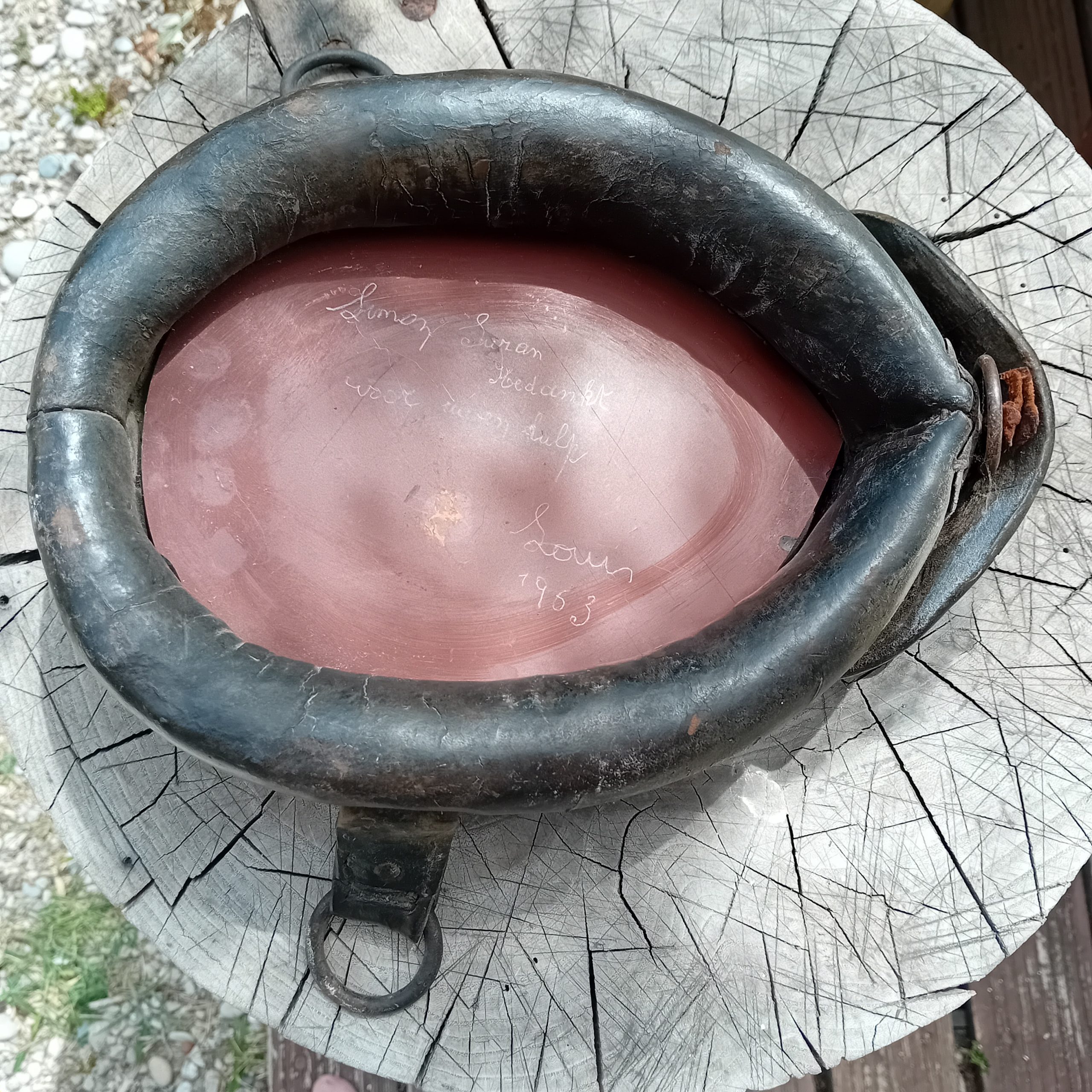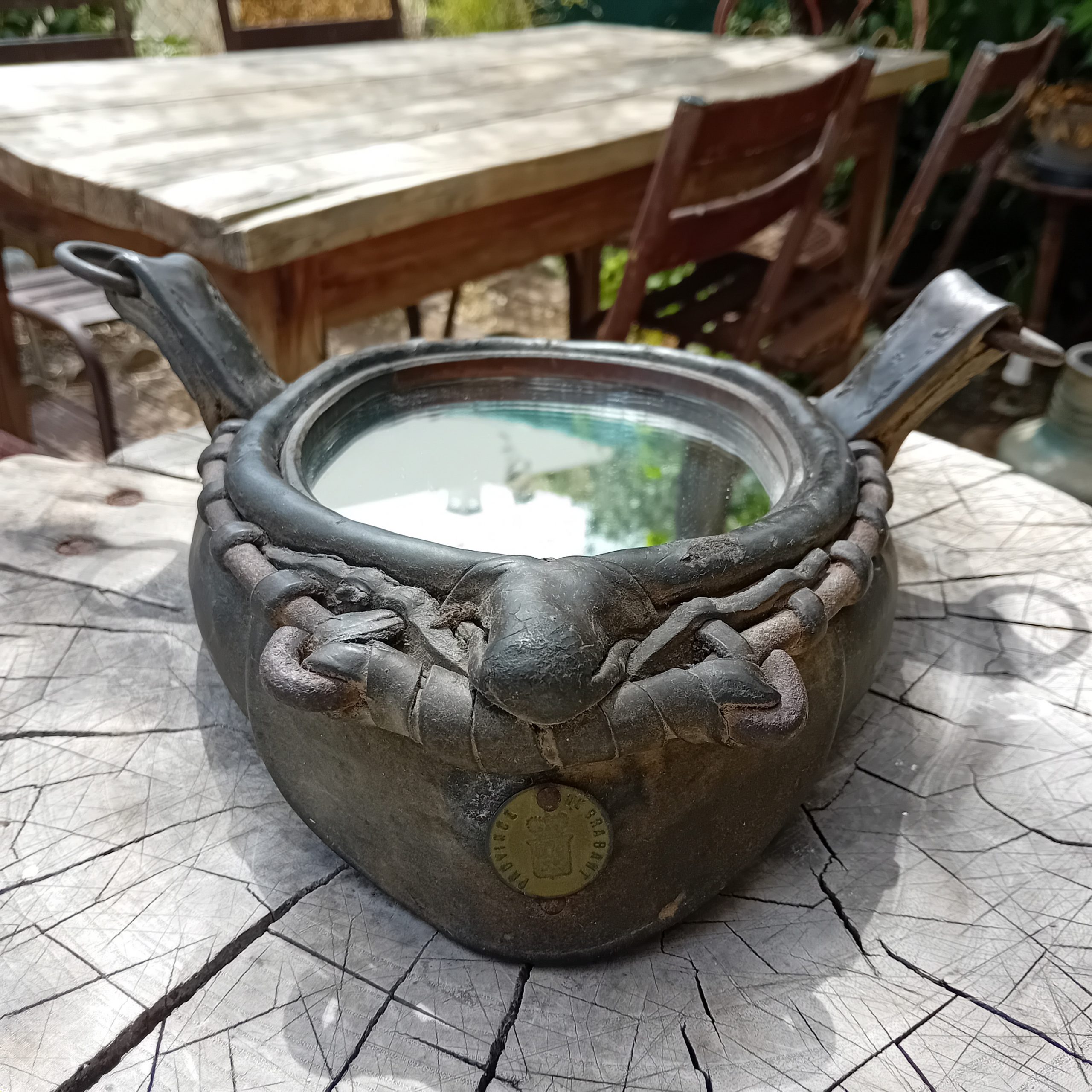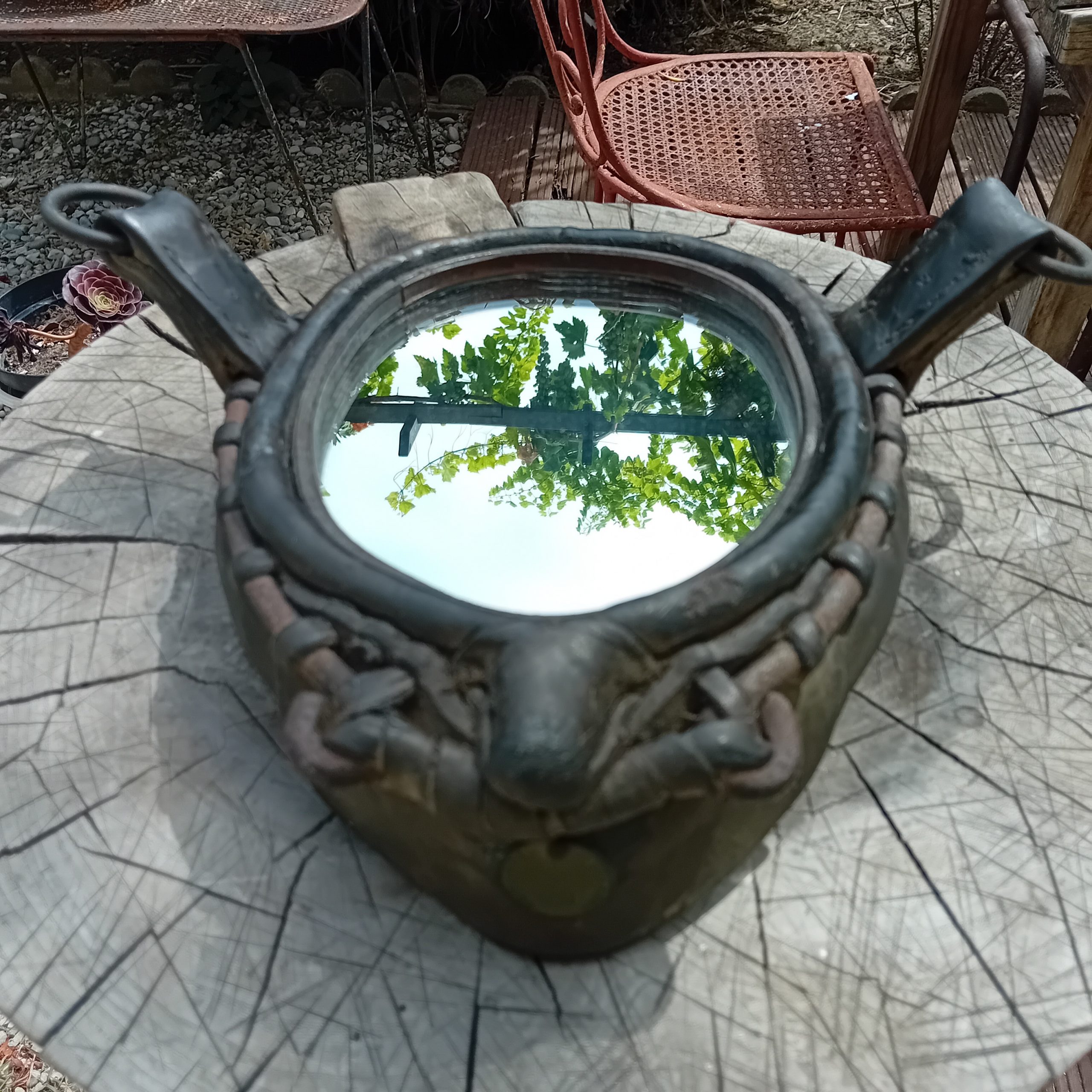 Un objet unique, détourné de sa fonction utilitaire pour devenir un miroir symbolique, peut-être un cadeau de remerciement, ou un hommage silencieux. Entre art populaire, mémoire rurale et forme presque totémique.