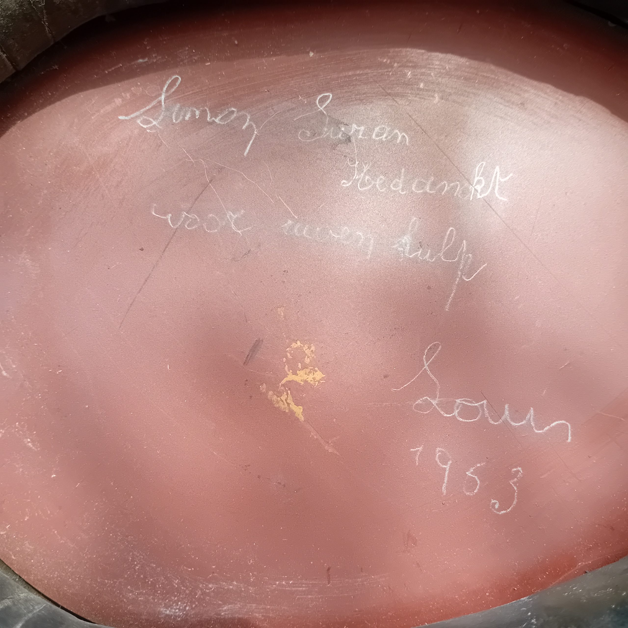 Sur le coté, une plaque en laiton estampillée « Province Brabant » atteste de son origine officielle belge. Et sous la base, une dédicace manuscrite en flamand dit :