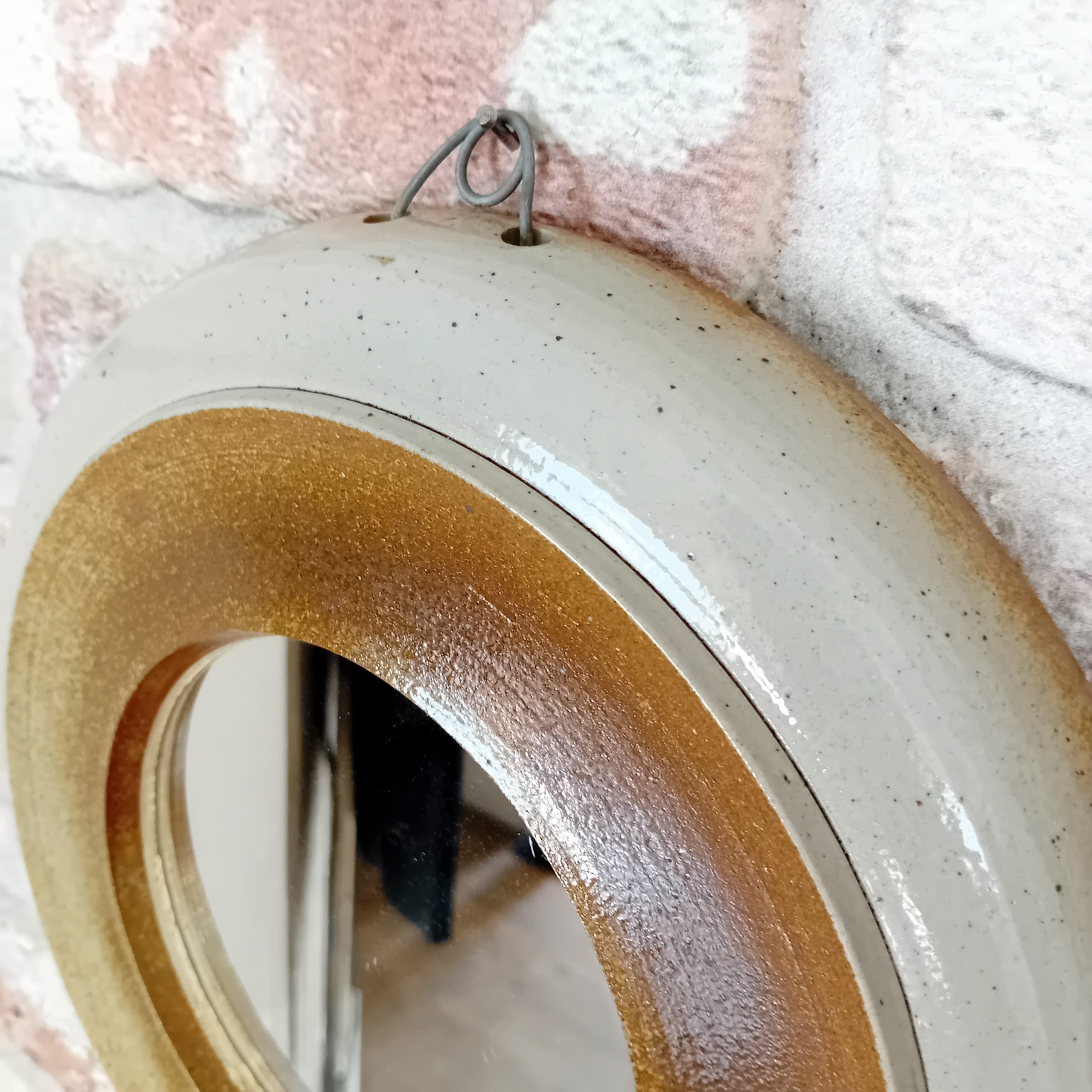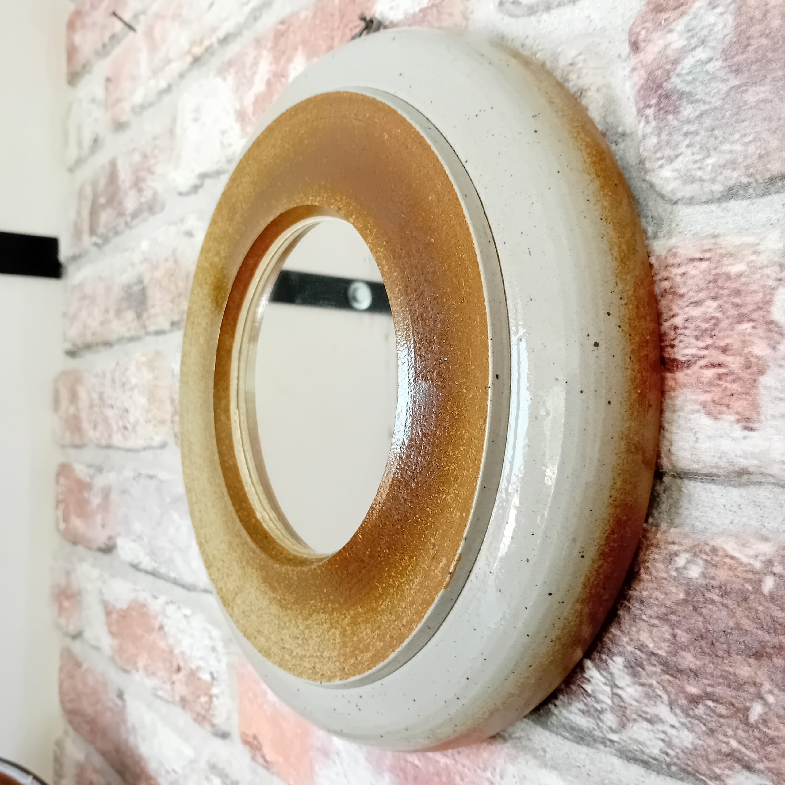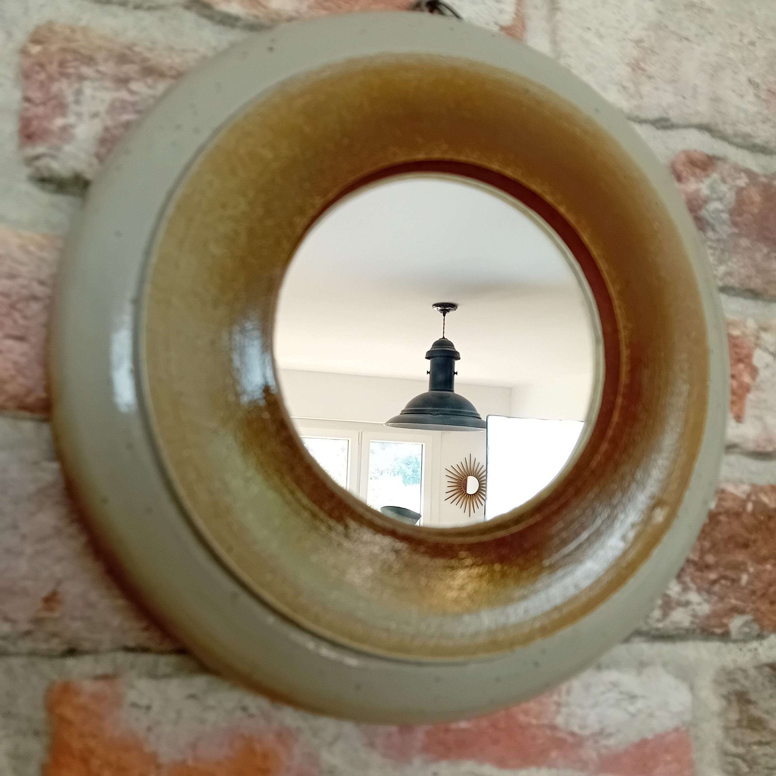 Un superbe petit miroir rond en grès émaillé.