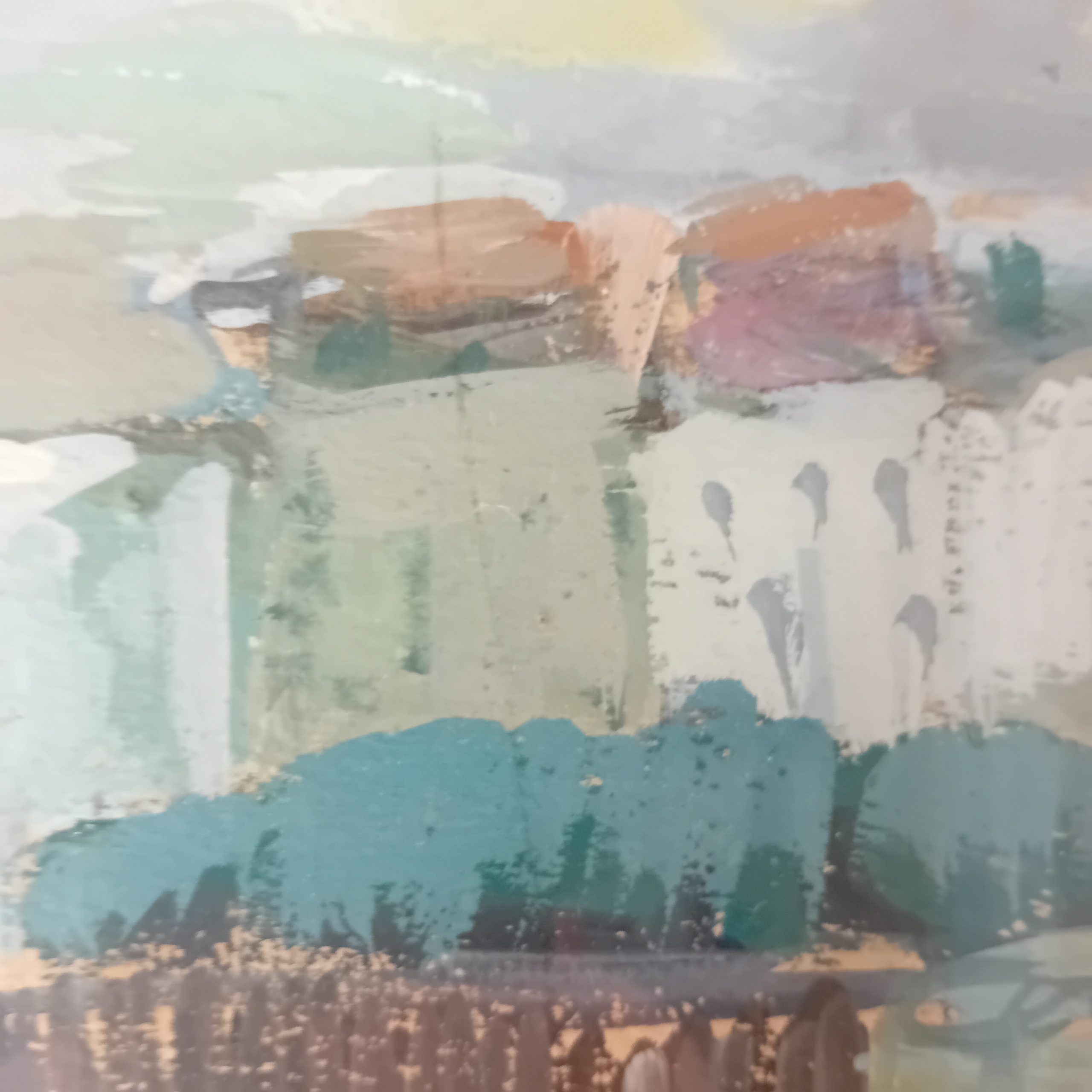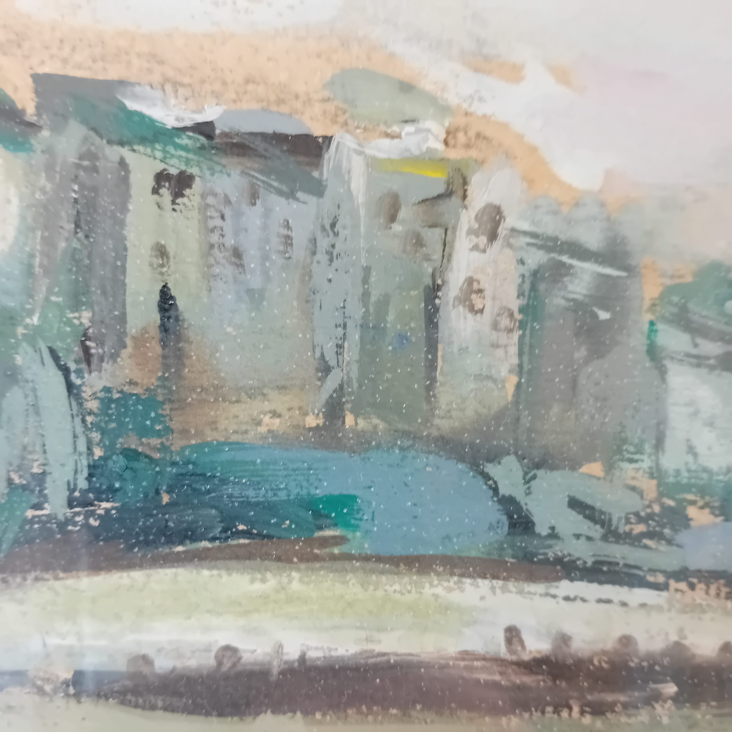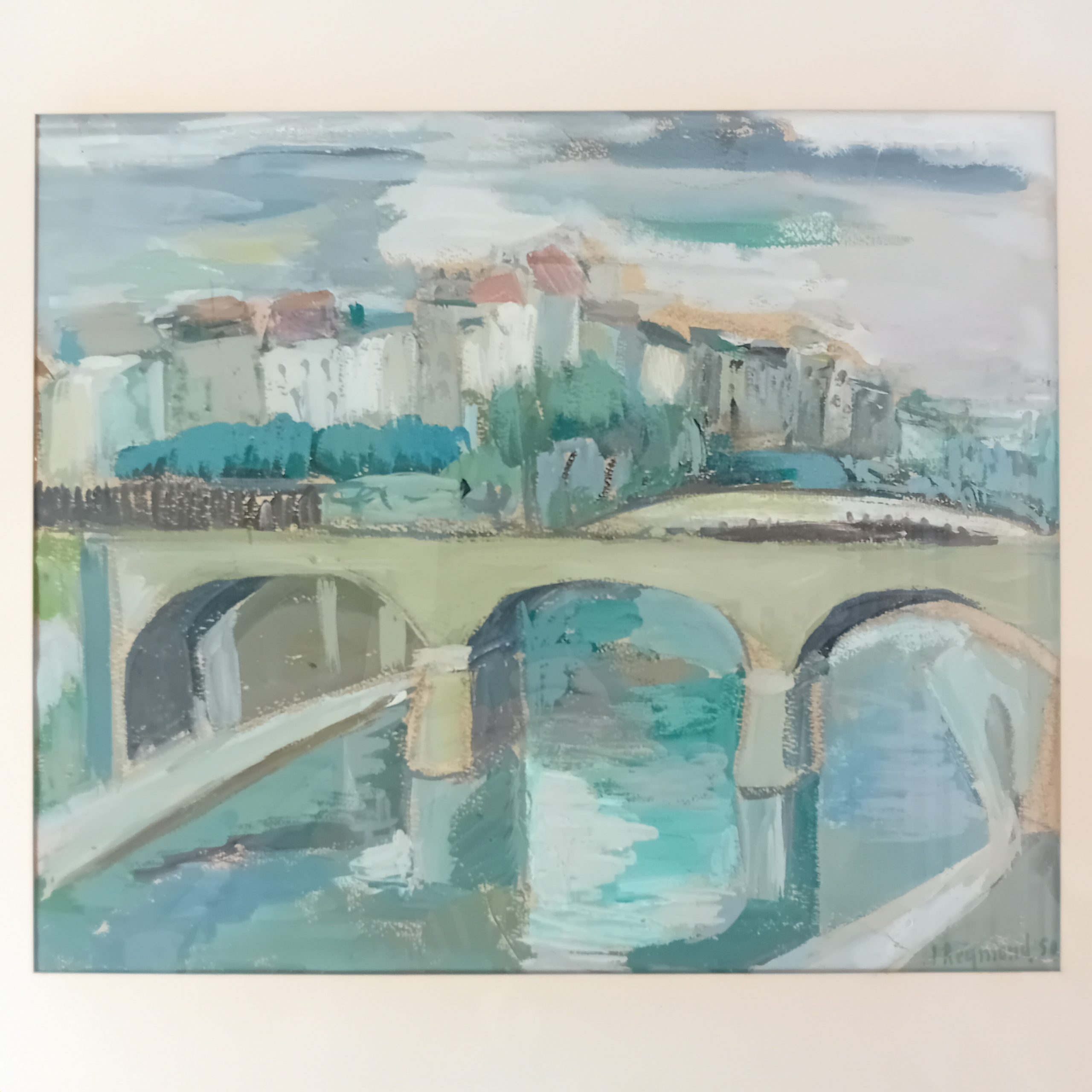 Peinture sur papier Vue d’un pont signée I.Reymond et datée 1950
