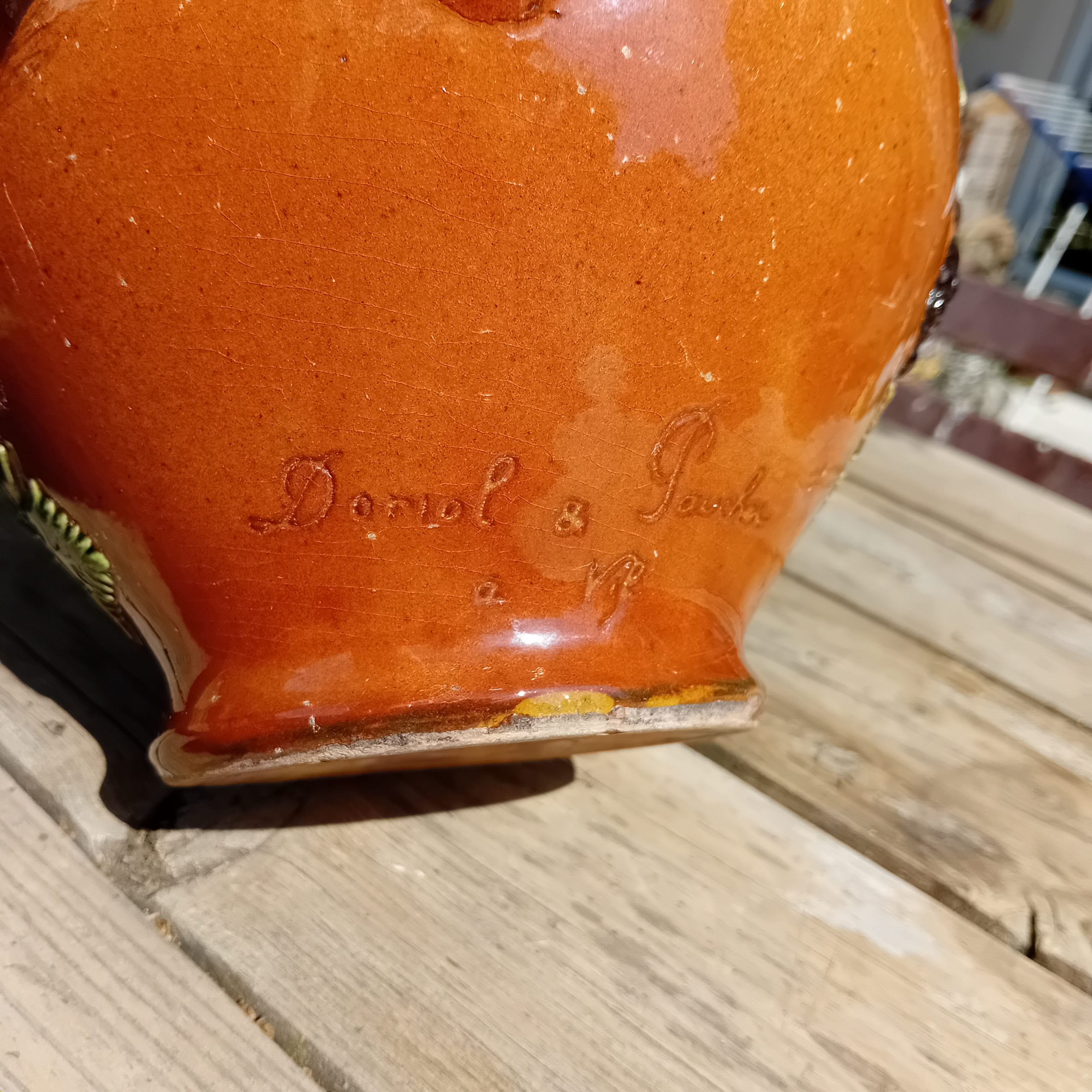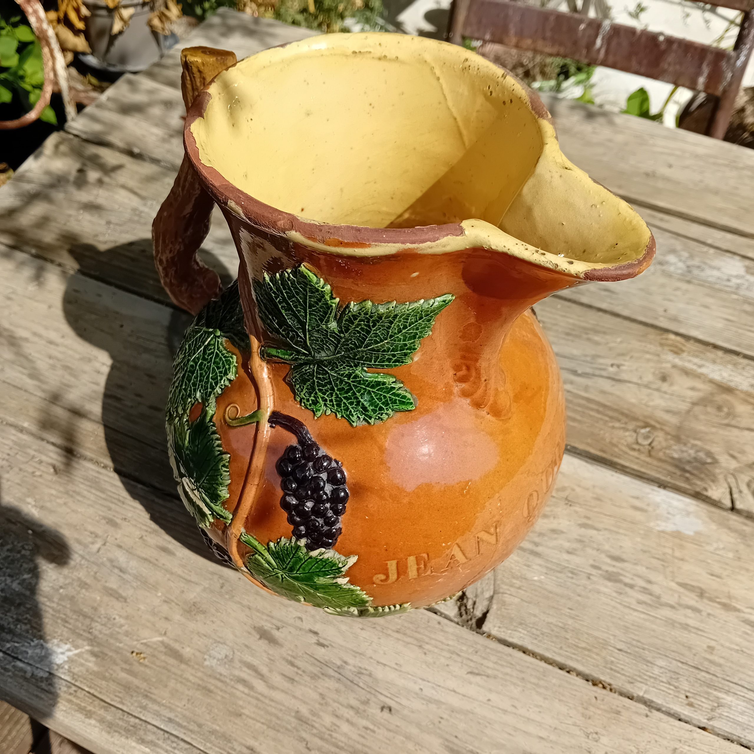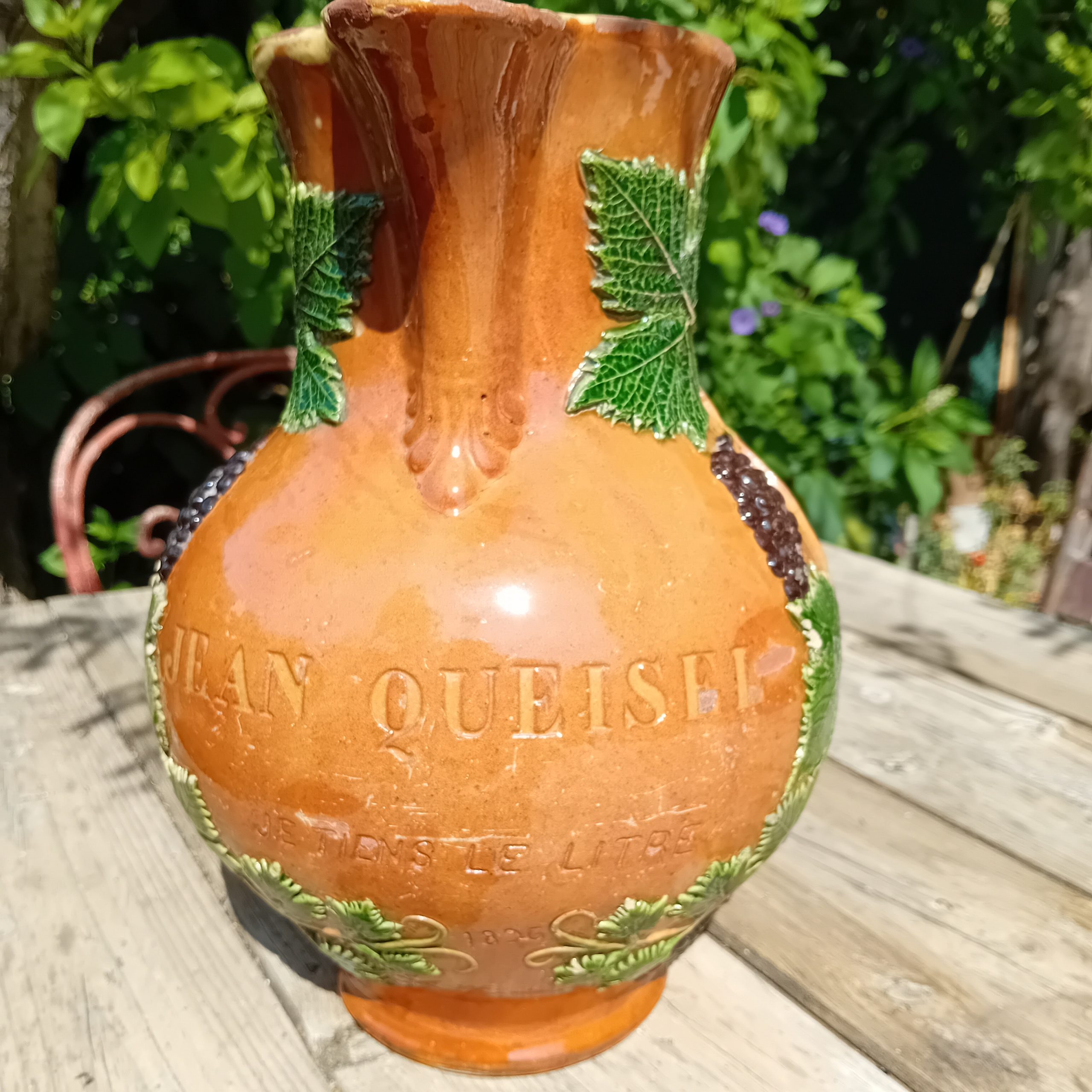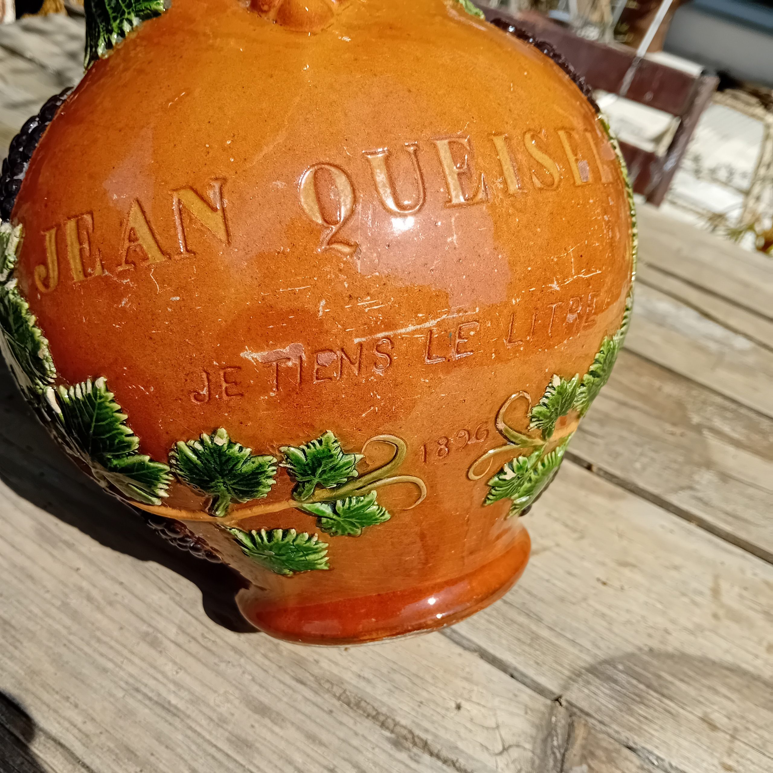 Rare pichet à vin en faïence vernissée, daté de 1896, portant l’inscription en relief :