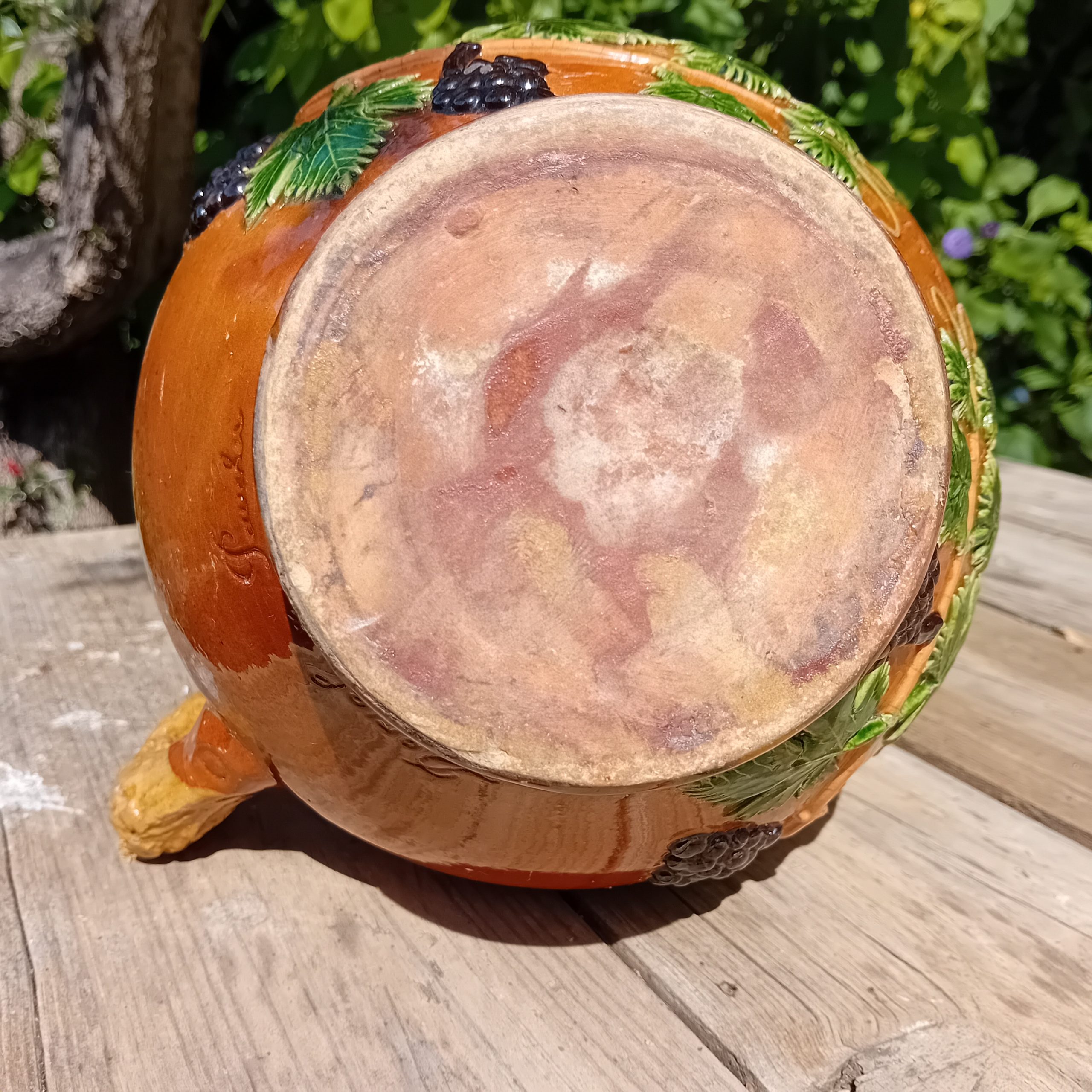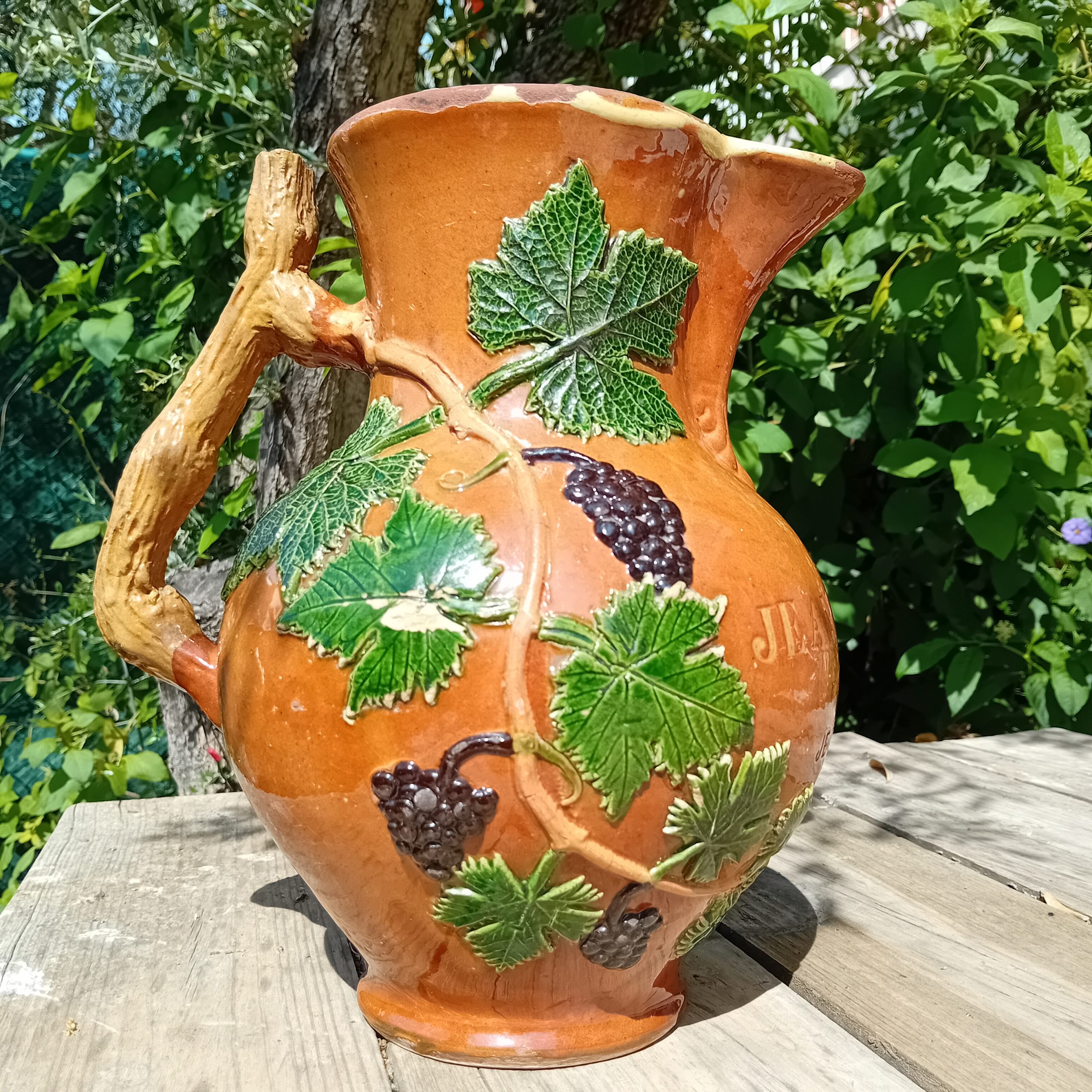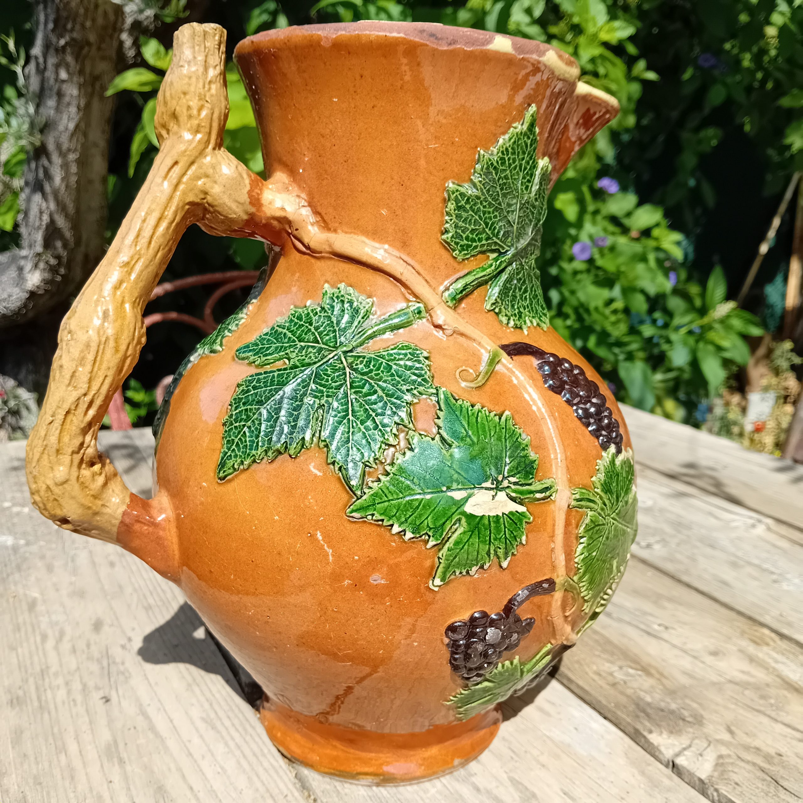 Ce modèle présente un décor naturaliste en relief de grappes de raisin et feuilles de vigne, émaillé dans des tons verts et violets, sur fond brun orangé. La panse est généreuse, avec un bec verseur évasé et une anse sculptée en forme de branche.