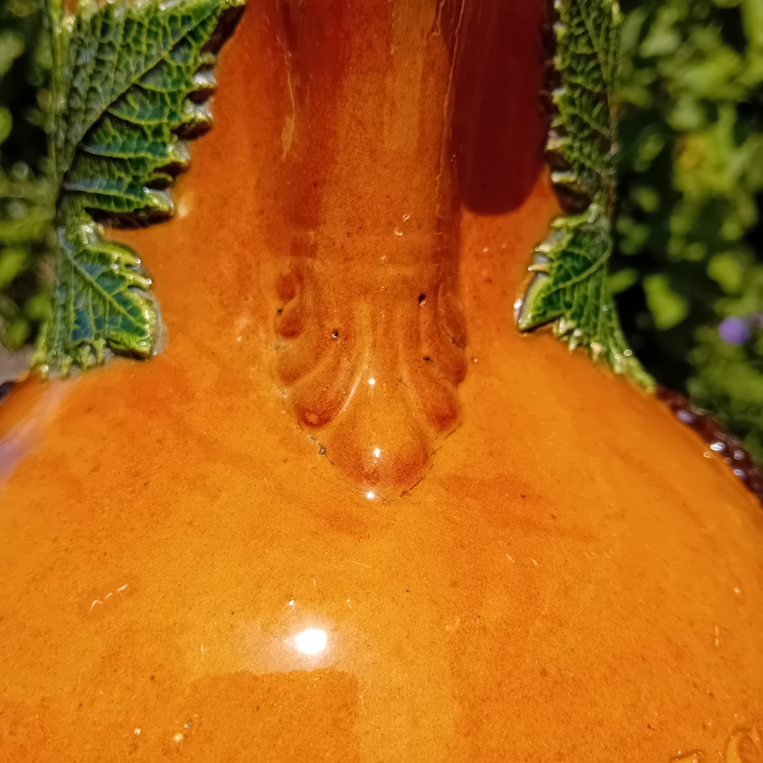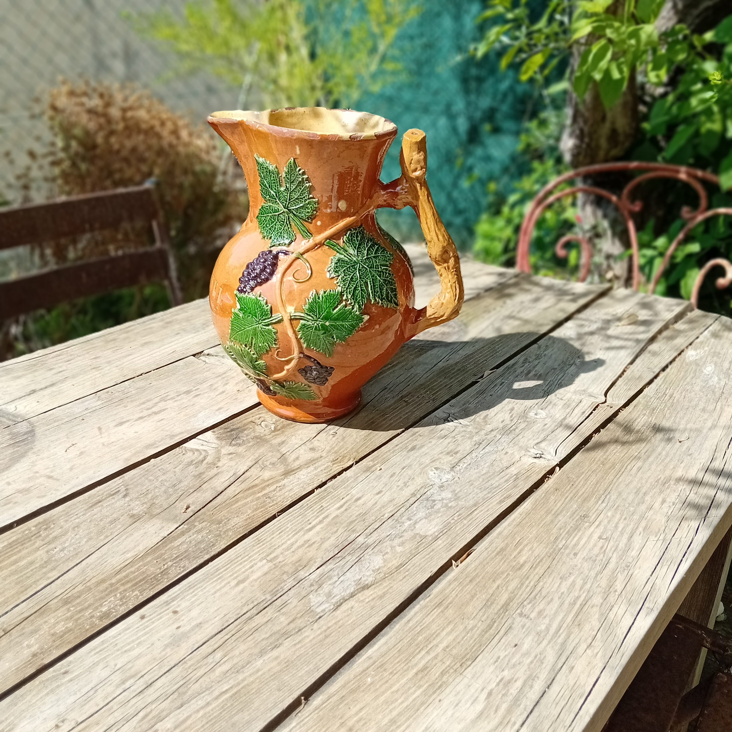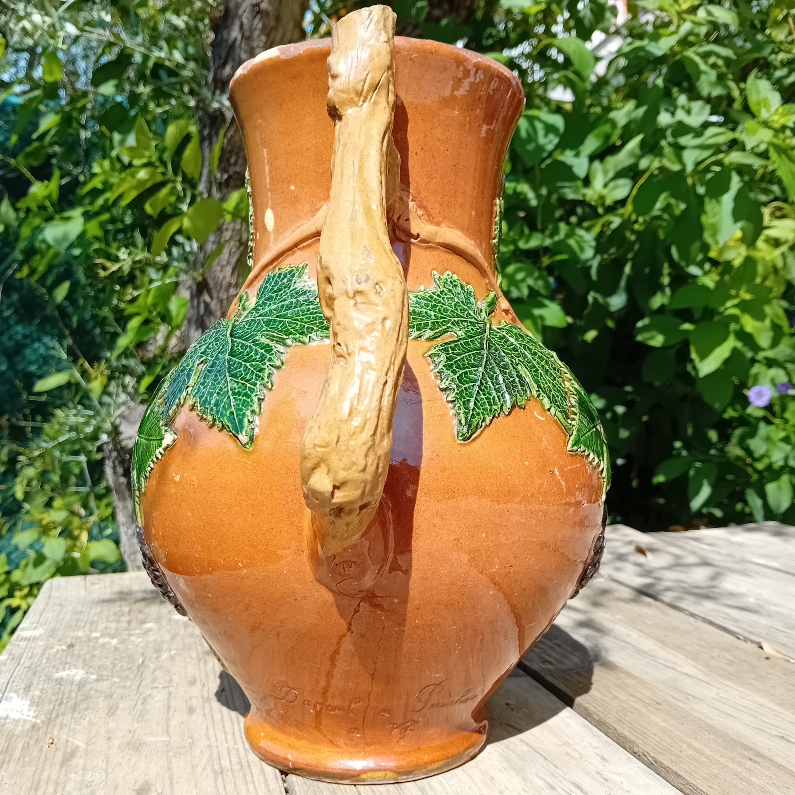 Ce modèle présente un décor naturaliste en relief de grappes de raisin et feuilles de vigne, émaillé dans des tons verts et violets, sur fond brun orangé. La panse est généreuse, avec un bec verseur évasé et une anse sculptée en forme de branche.