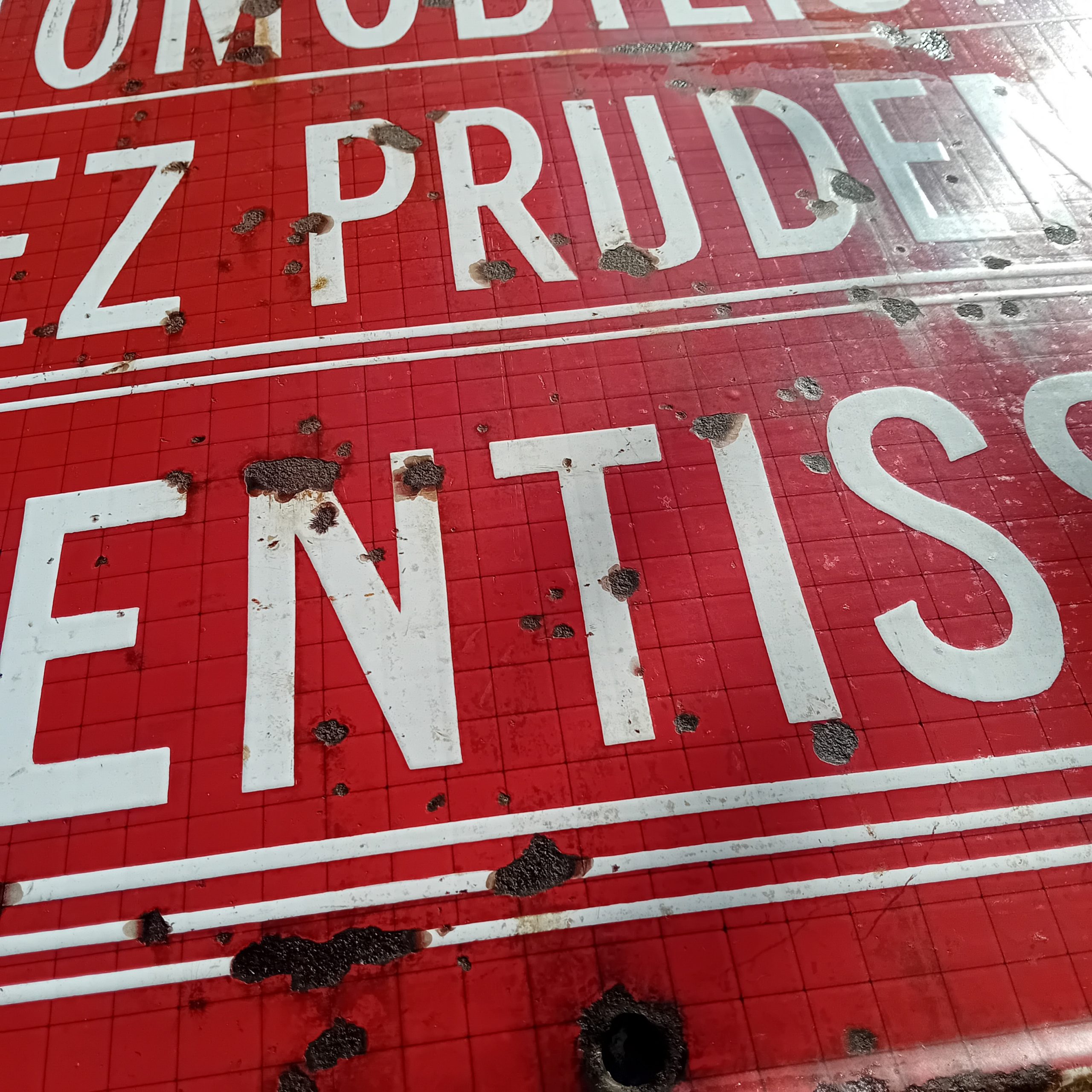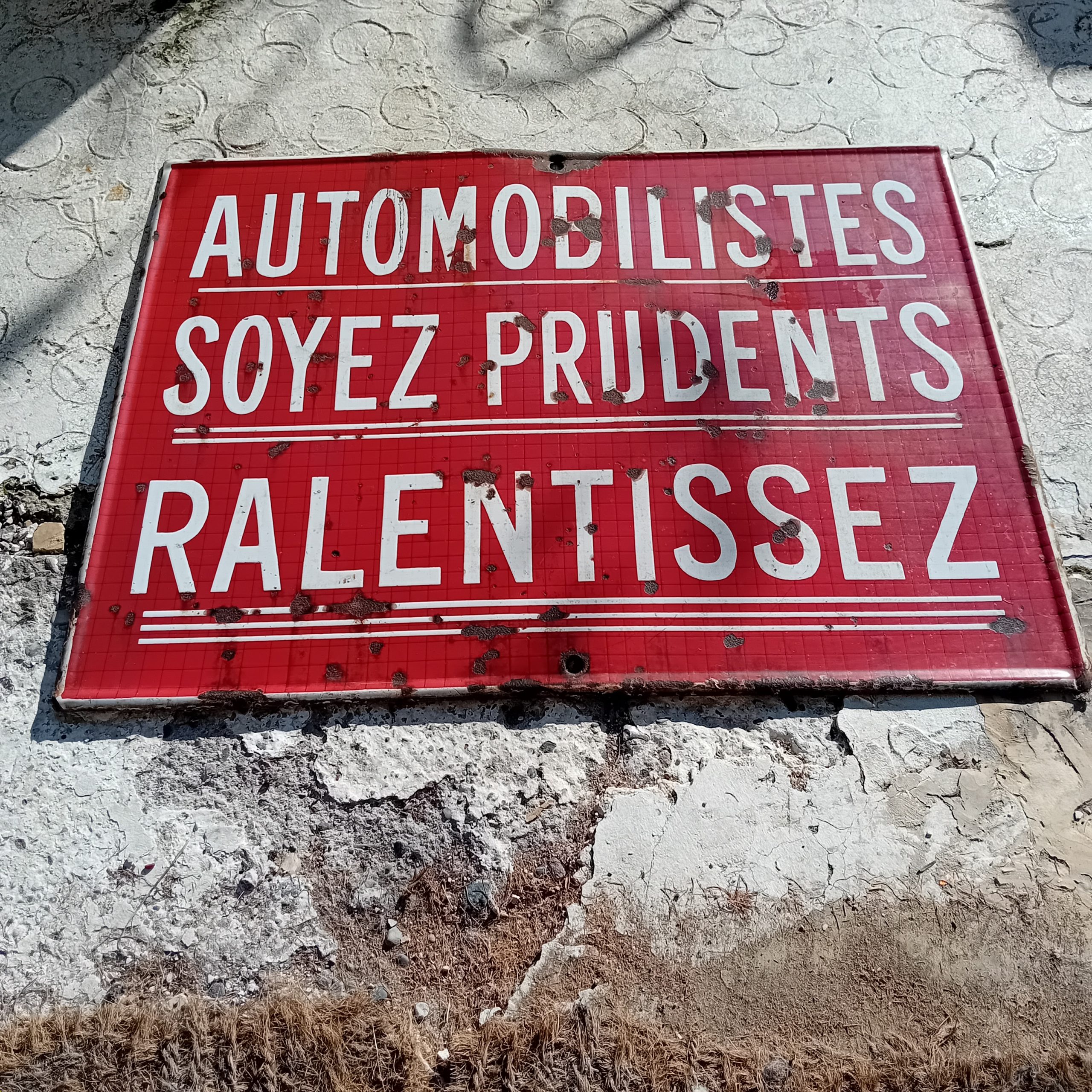 Cette plaque émaillée routière ancienne provient de la signalisation française du milieu du XXᵉ siècle. Dès son installation en bord de route, elle invitait les automobilistes à ralentir et à adopter une conduite prudente.