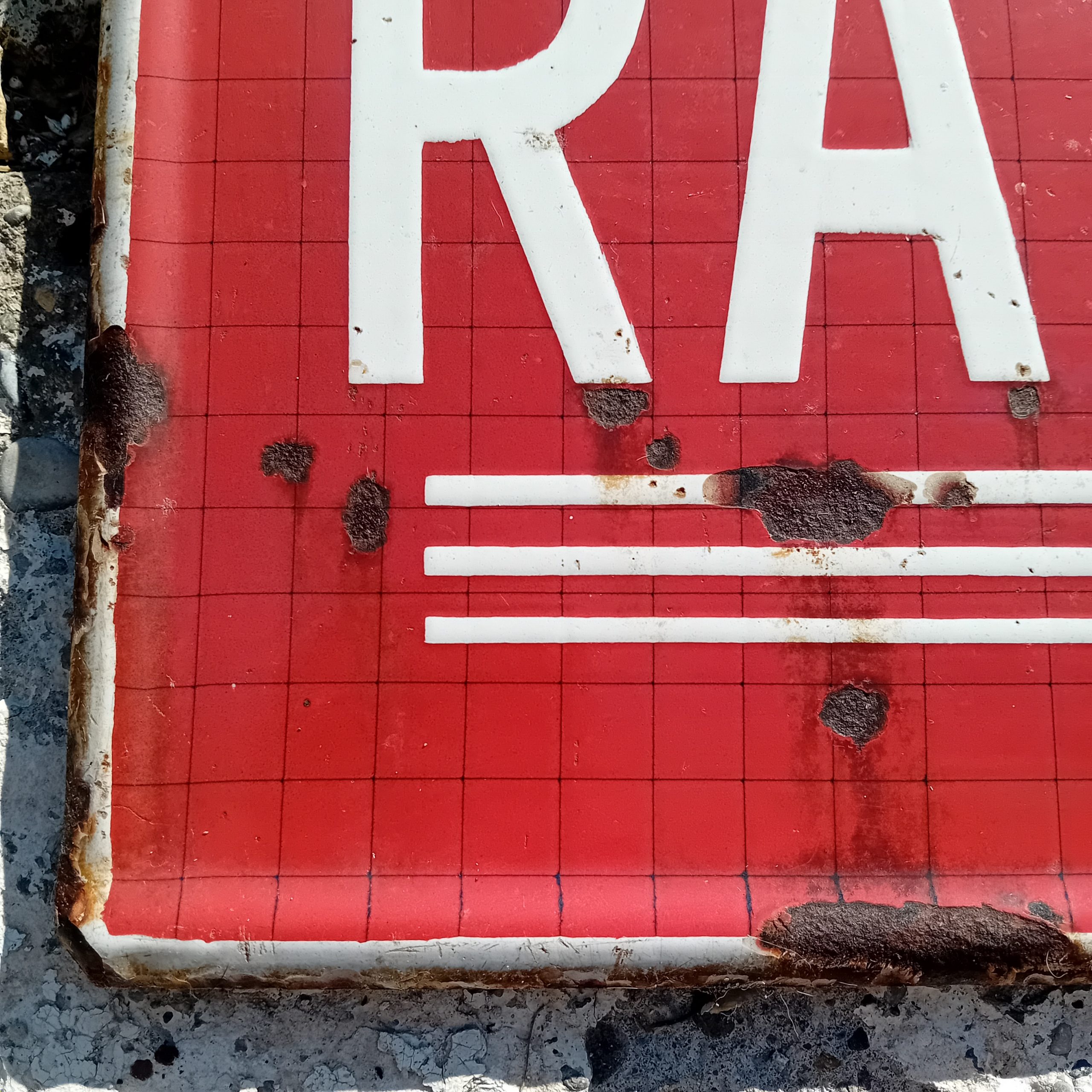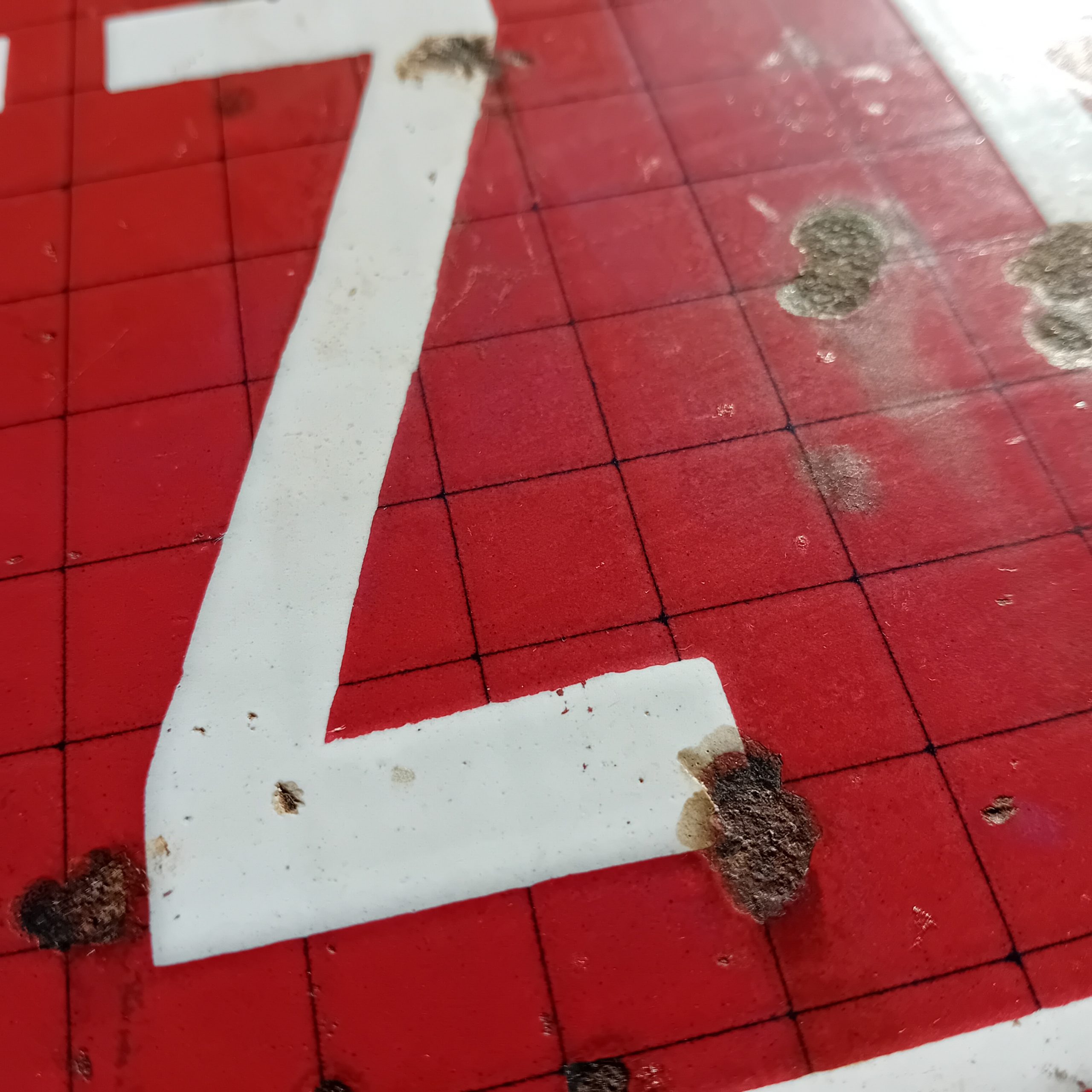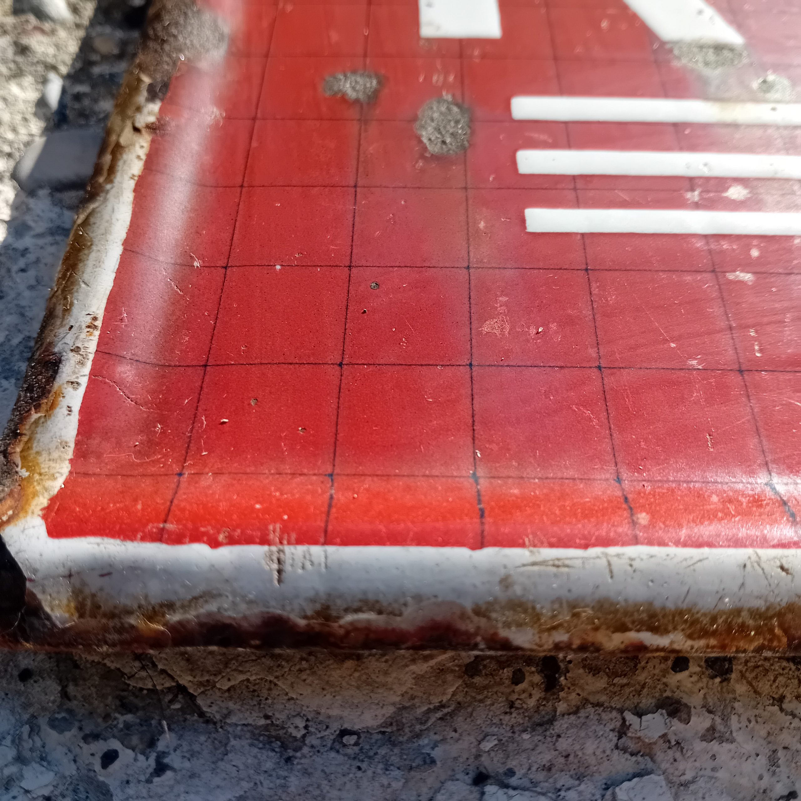 Au fil des décennies, le soleil, la pluie et la pollution ont marqué la surface de cette plaque. Progressivement, les éclats d’émail, les zones oxydées et les impacts se sont formés.
