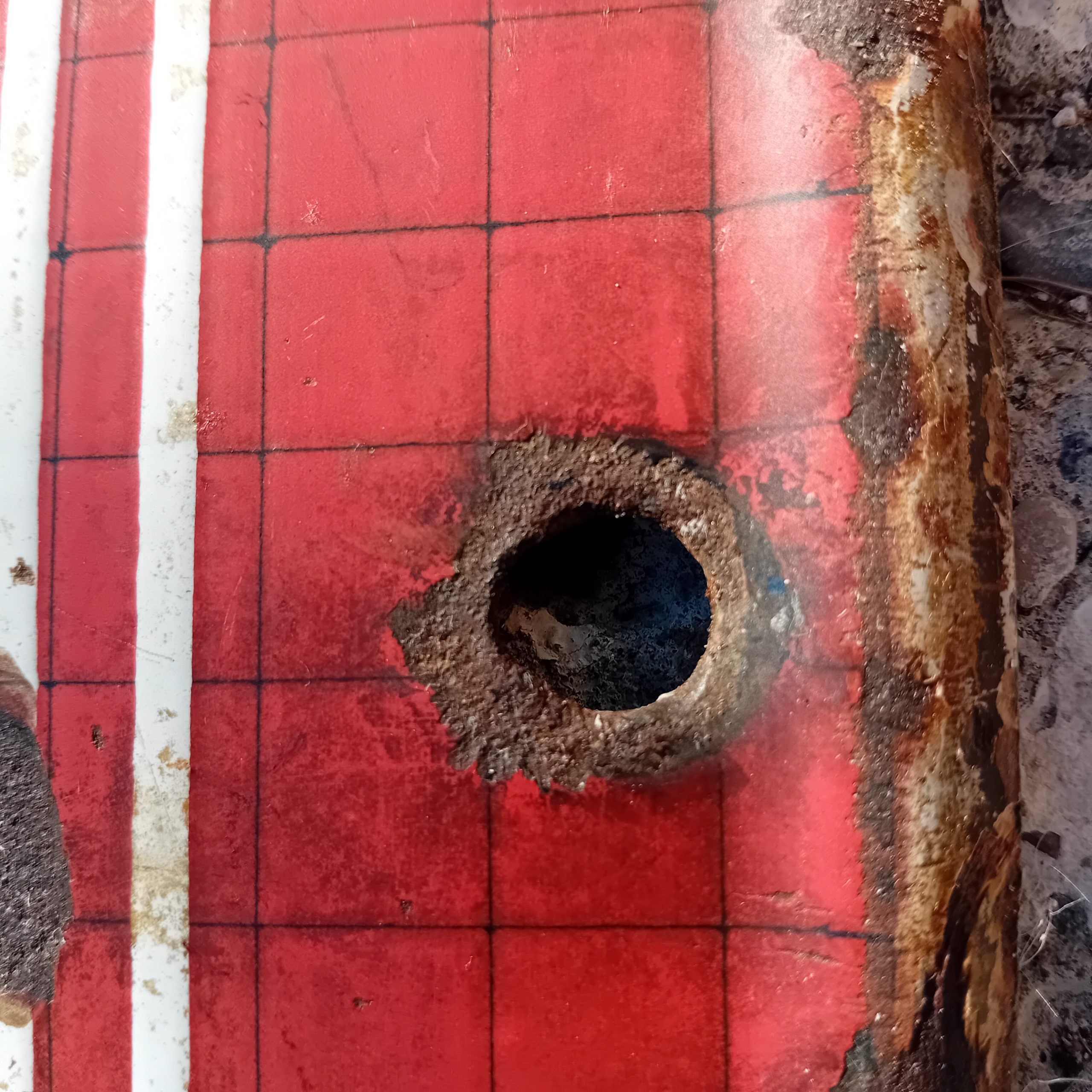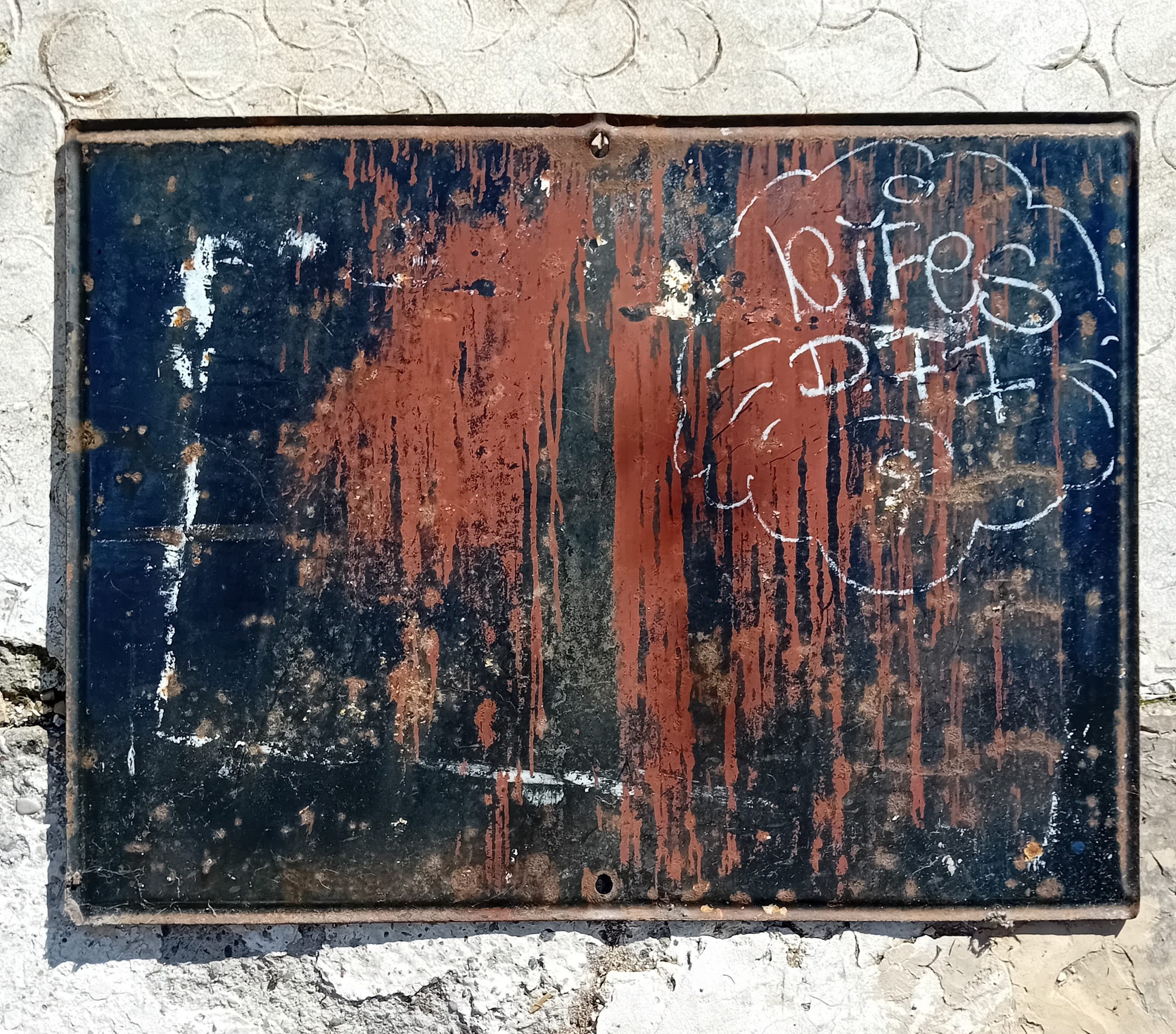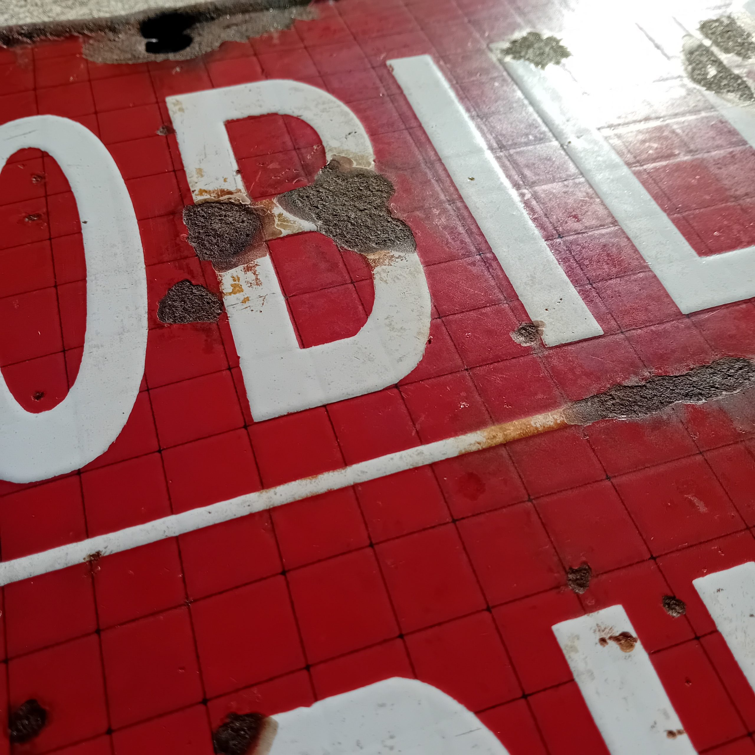 Au fil des décennies, le soleil, la pluie et la pollution ont marqué la surface de cette plaque. Progressivement, les éclats d’émail, les zones oxydées et les impacts se sont formés.
