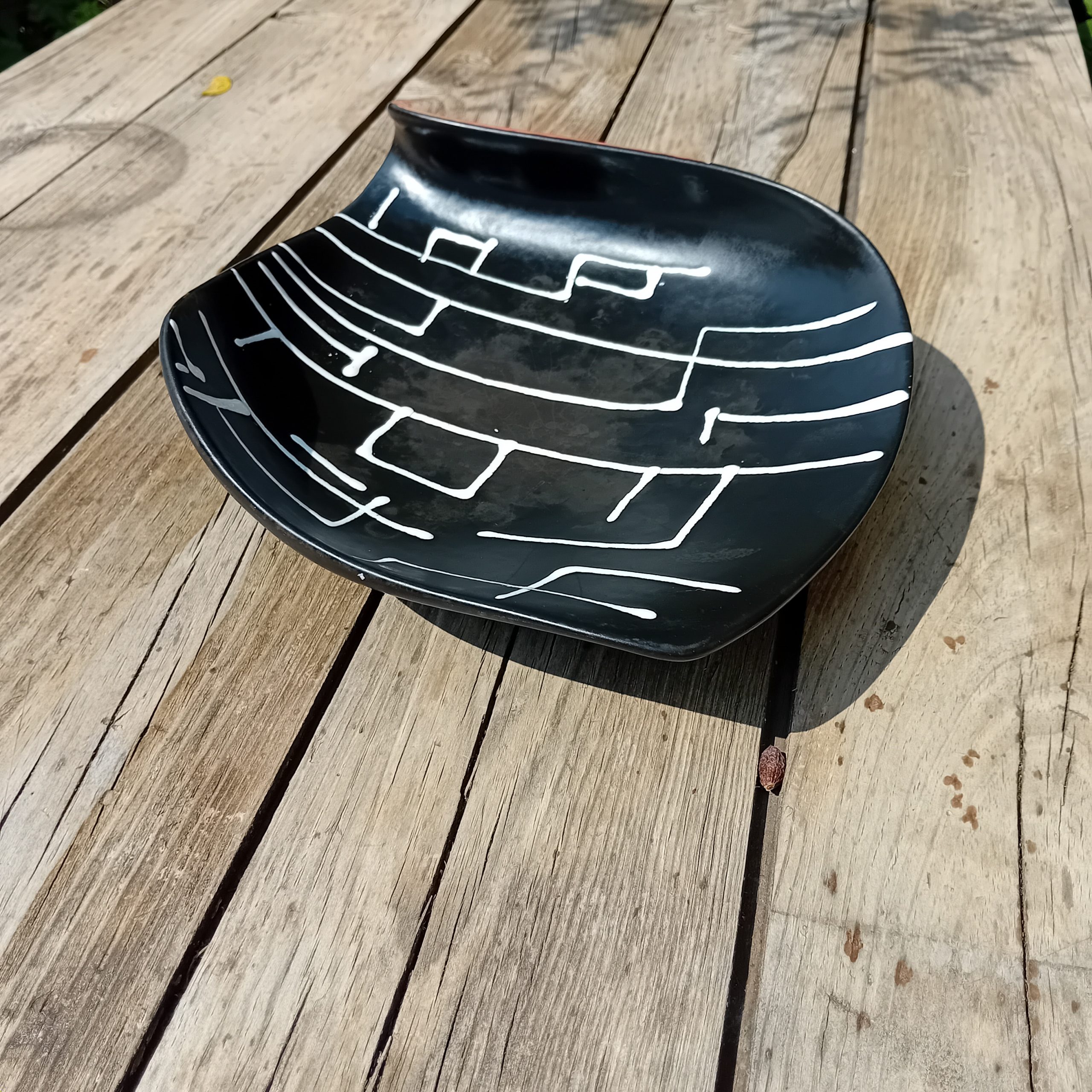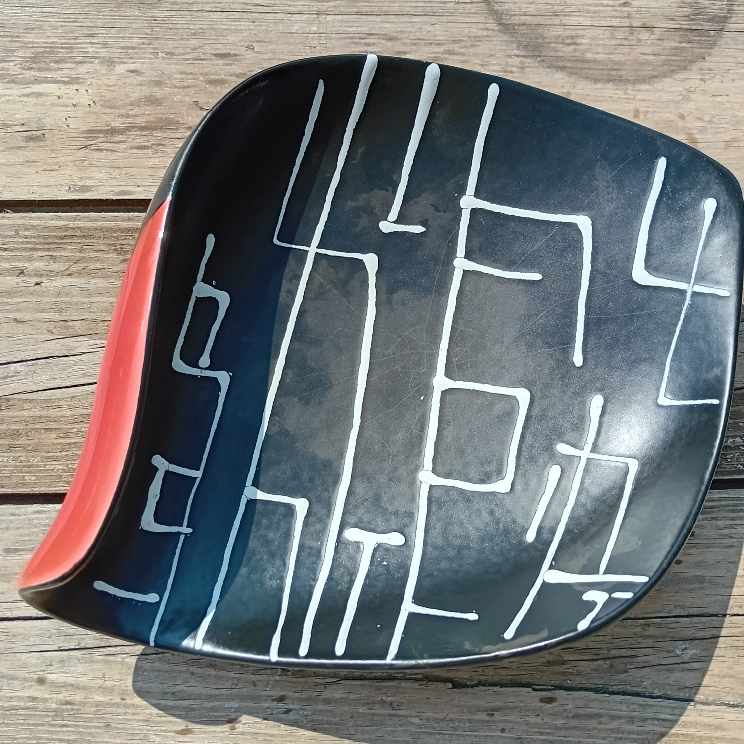 Plat décoratif en céramique noire rouge et motifs abstraits blancs – numéroté 4221 – design abstrait – années 50/60